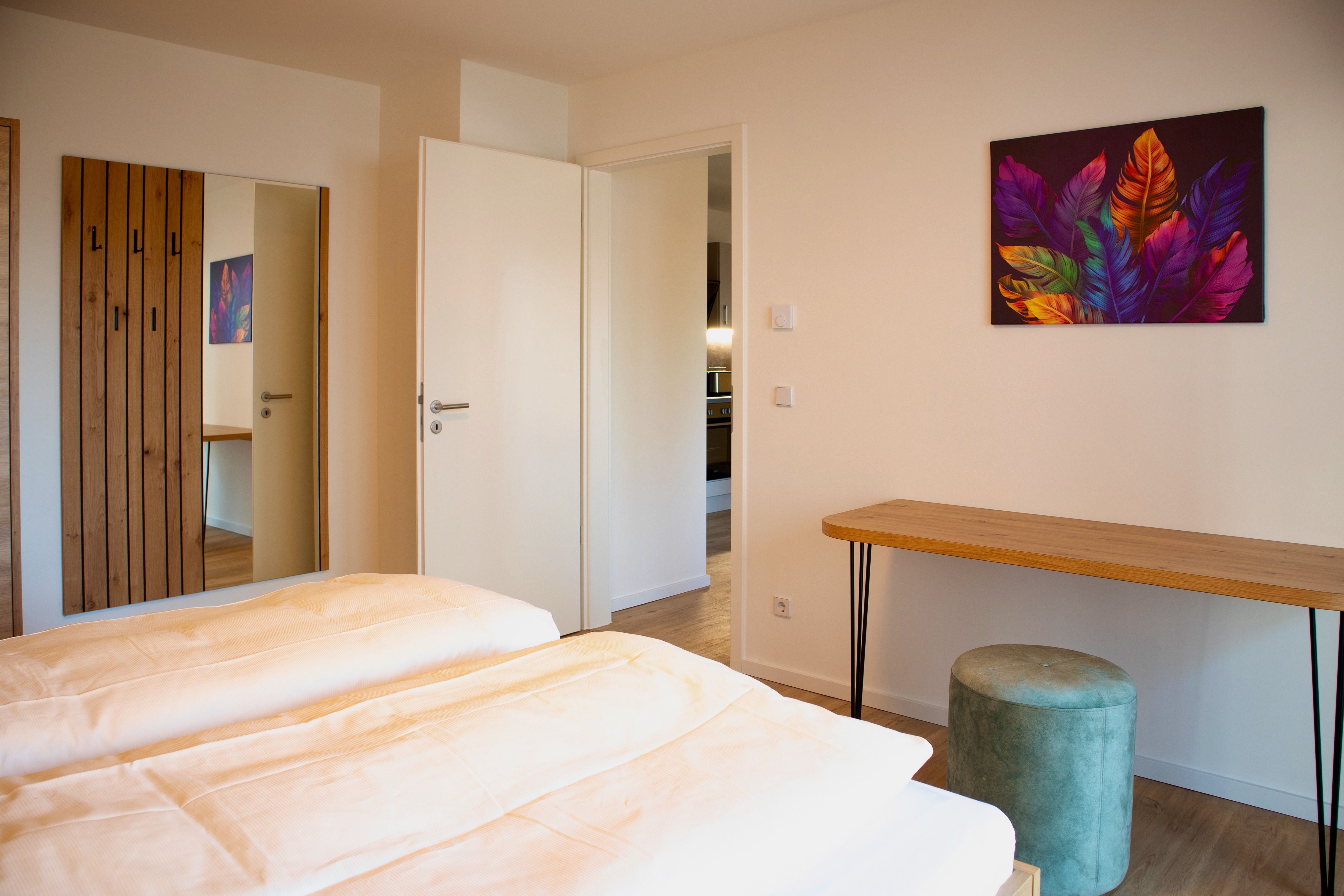 Neuwertige & hochwertig ausgestattete Ferienwohnung mit absoluter Wohlfühl-Atmosphäre. Die Wohnung verfügt über ein Schlafzimmer mit Doppelbett (200 × 180) sowie ein Badezimmer mit Dusche & WC, Fön.
