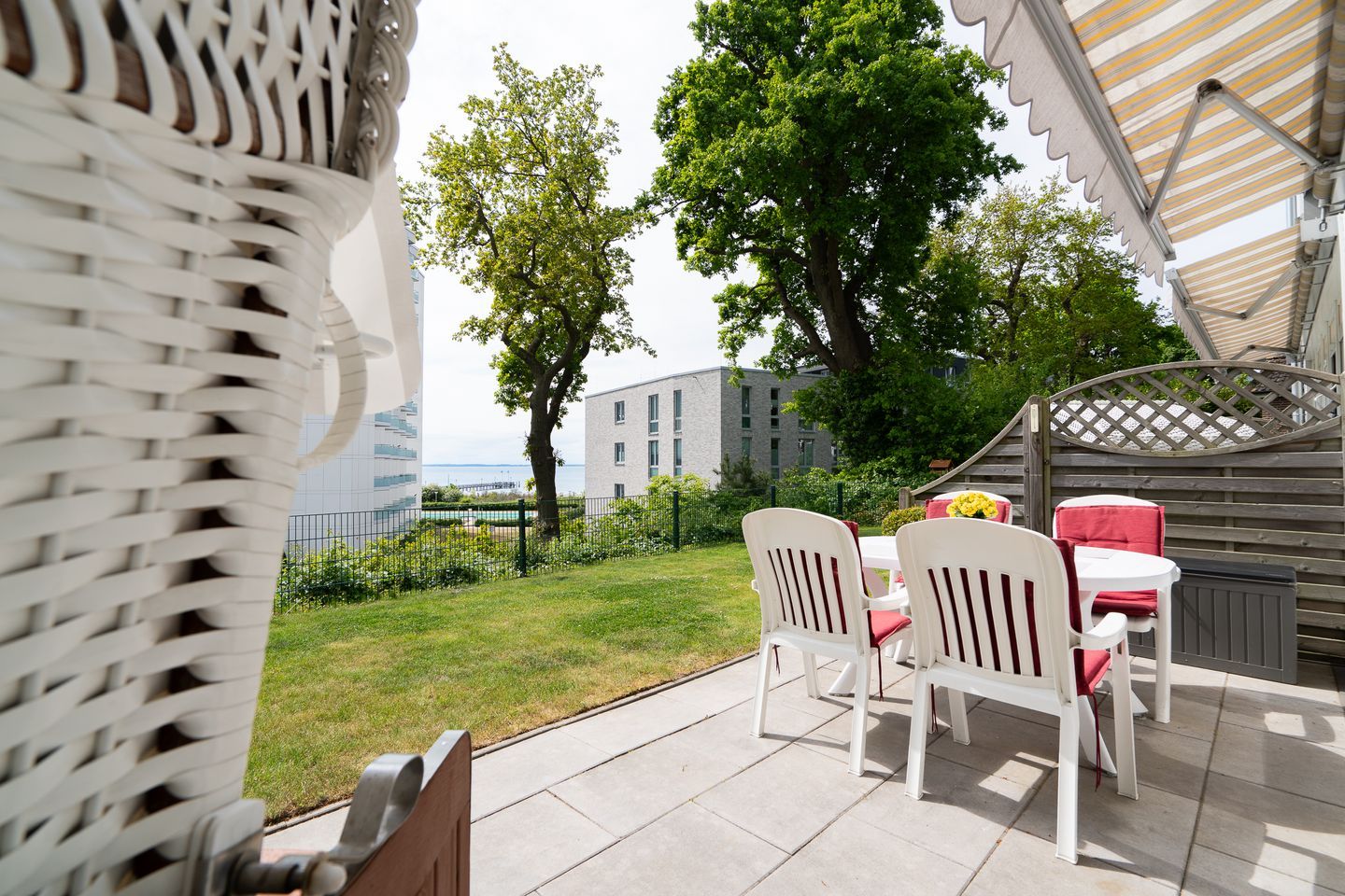 Die Wohnungen 1-3 liegen im Erdgeschoss und verfügen über eine eigene Terrasse mit Meerblick. Vor den Terrassen ist eine Rasenfläche angelegt, die zum Teil auch gemeinschaftlich genutzt werden kann. Alle Terrassen besitzen einen eigenen Strandkorb.
