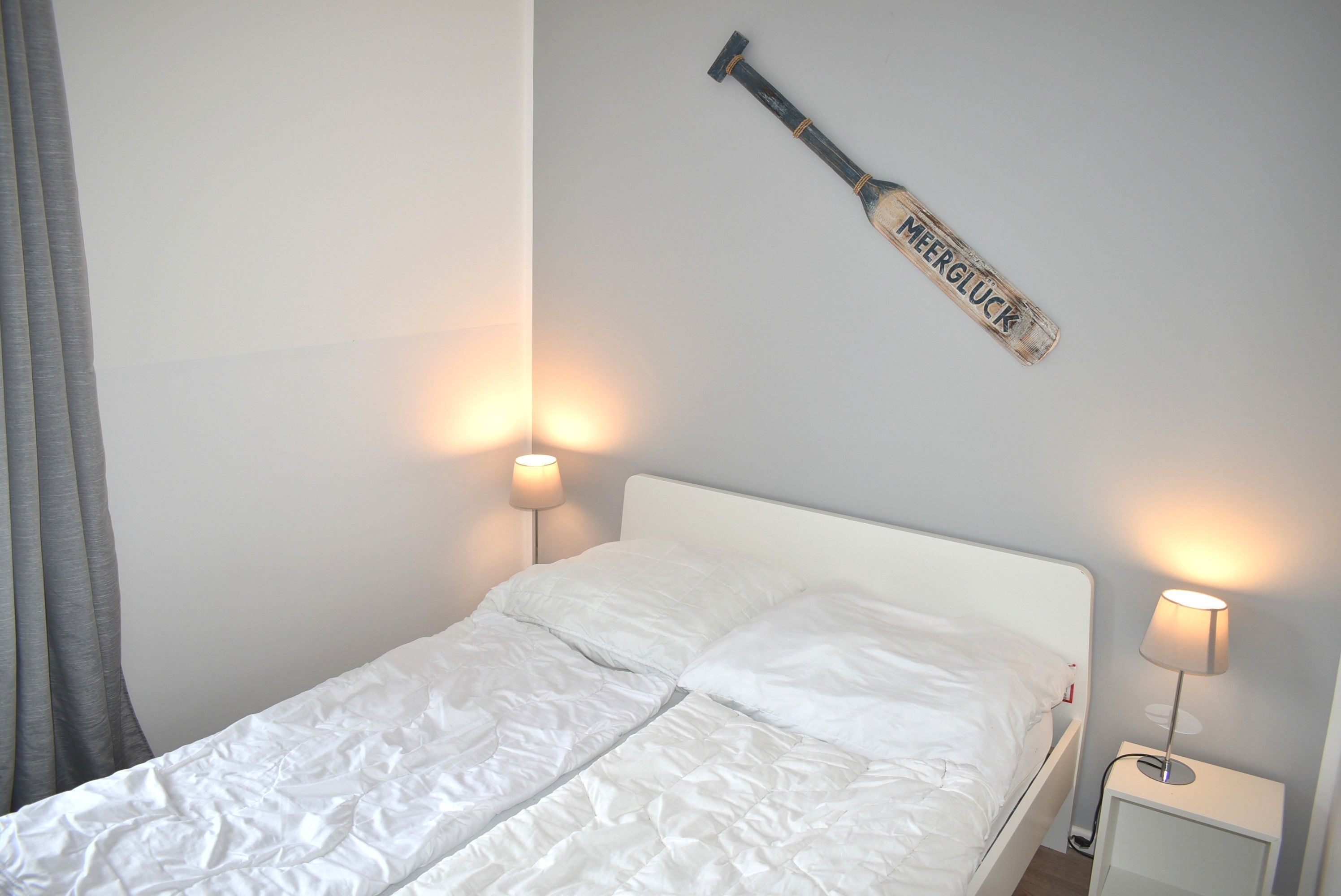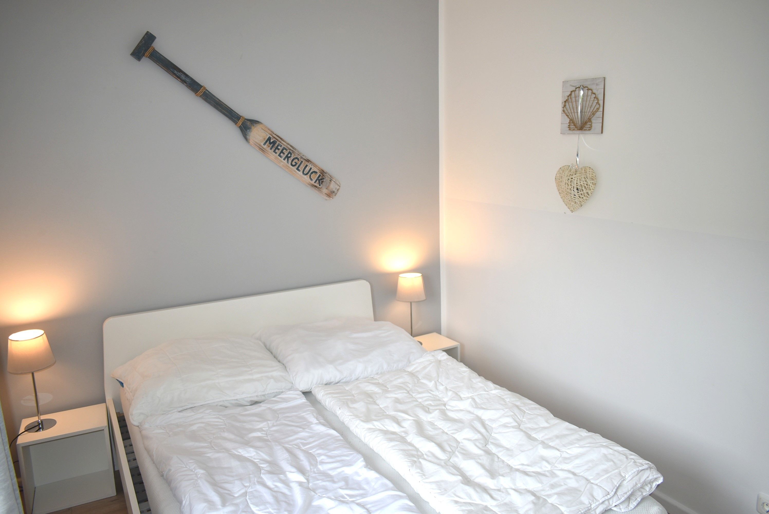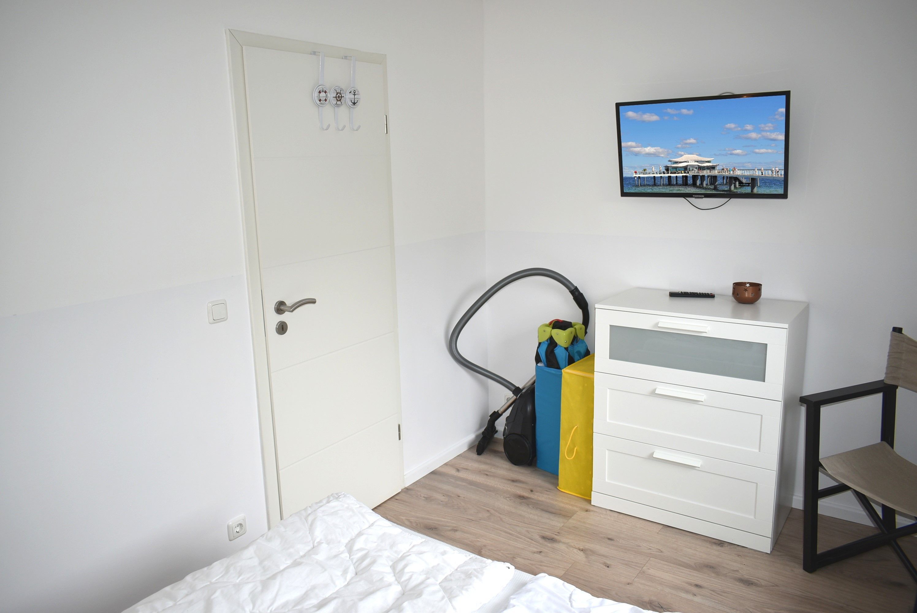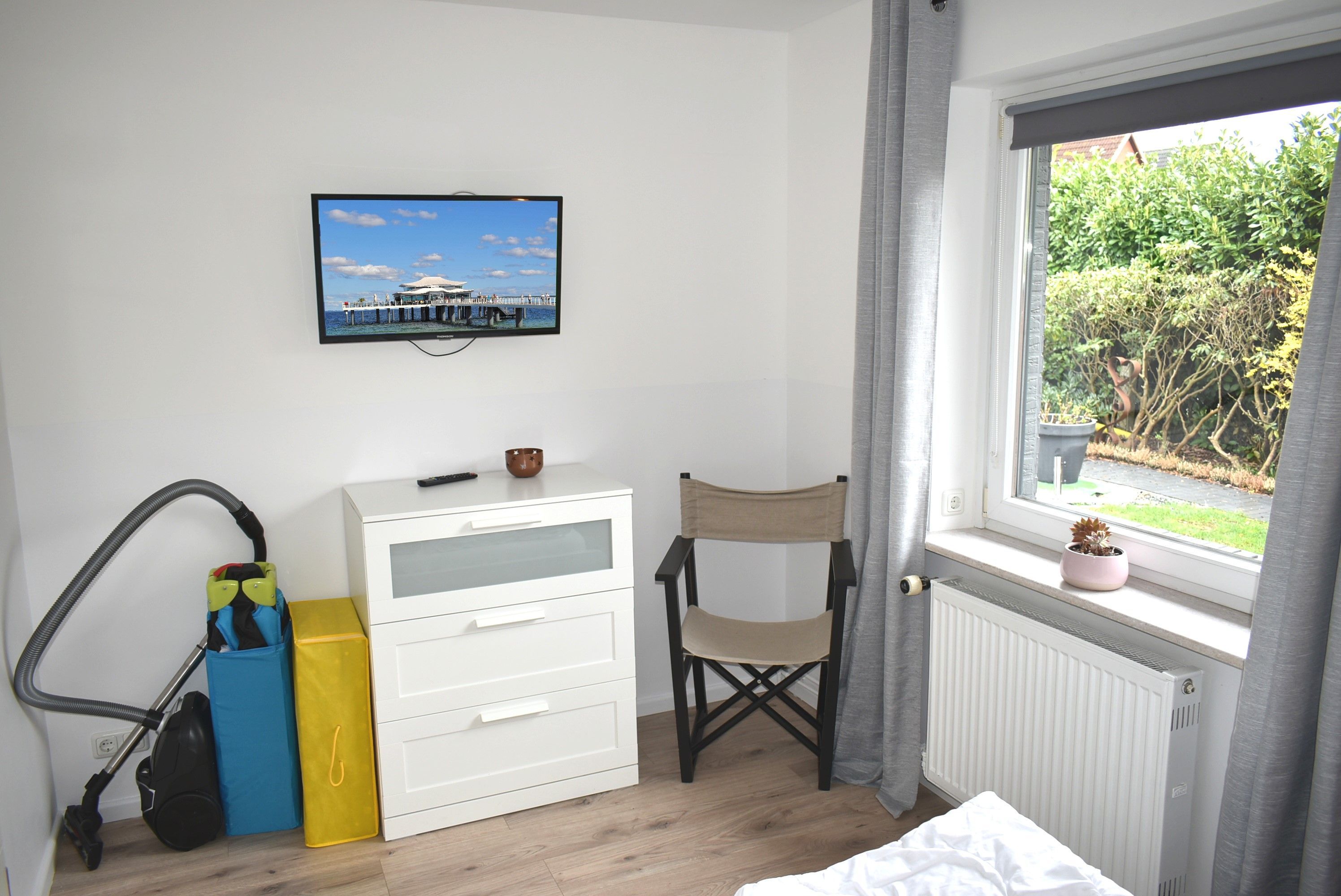 Schlafzimmer 2: 1 Matratze, 2 Nachttische, 2 Nachttischlampen, Besen, Doppelbett 2,00 x 1,40 m, ein Kinderbett mit Matratze und ein Kinderhochstuhl inkl., Kommode, Staubsauger, Stuhl, Verdunklungsplissee, wandhängender Sat-TV Flachbildschirm