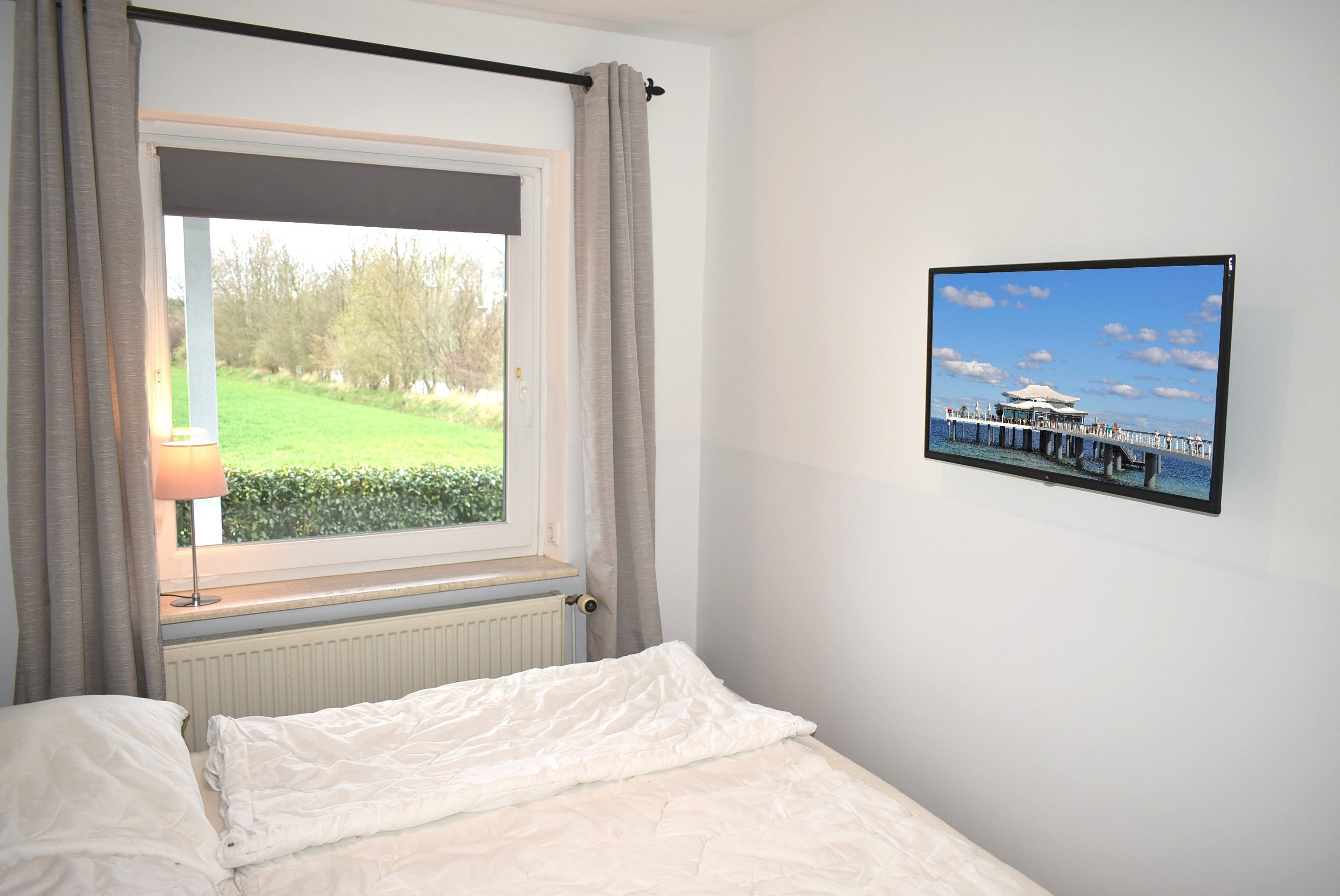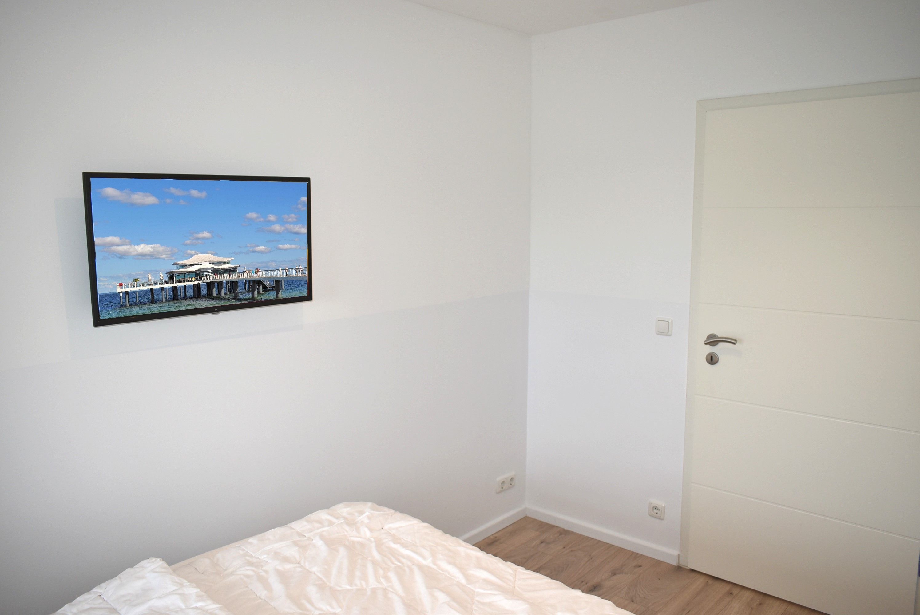Schlafzimmer 1: 1 Matratze, Boxspringbett 2,00 x 1,40 m, Kleiderschrank, Nachttisch, Nachttischlampe, Verdunklungsplissee, wandhängender Sat-TV Flachbildschirm