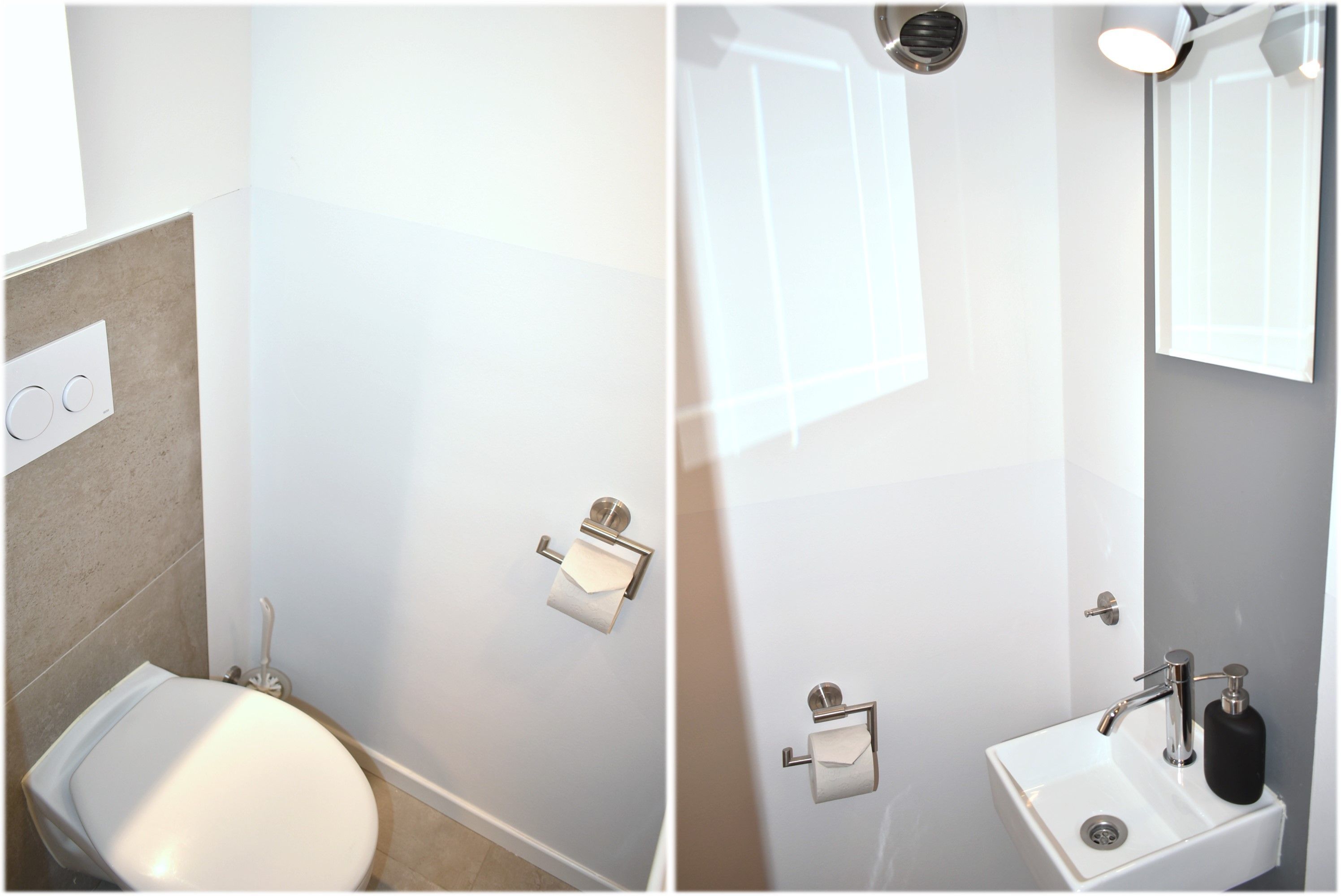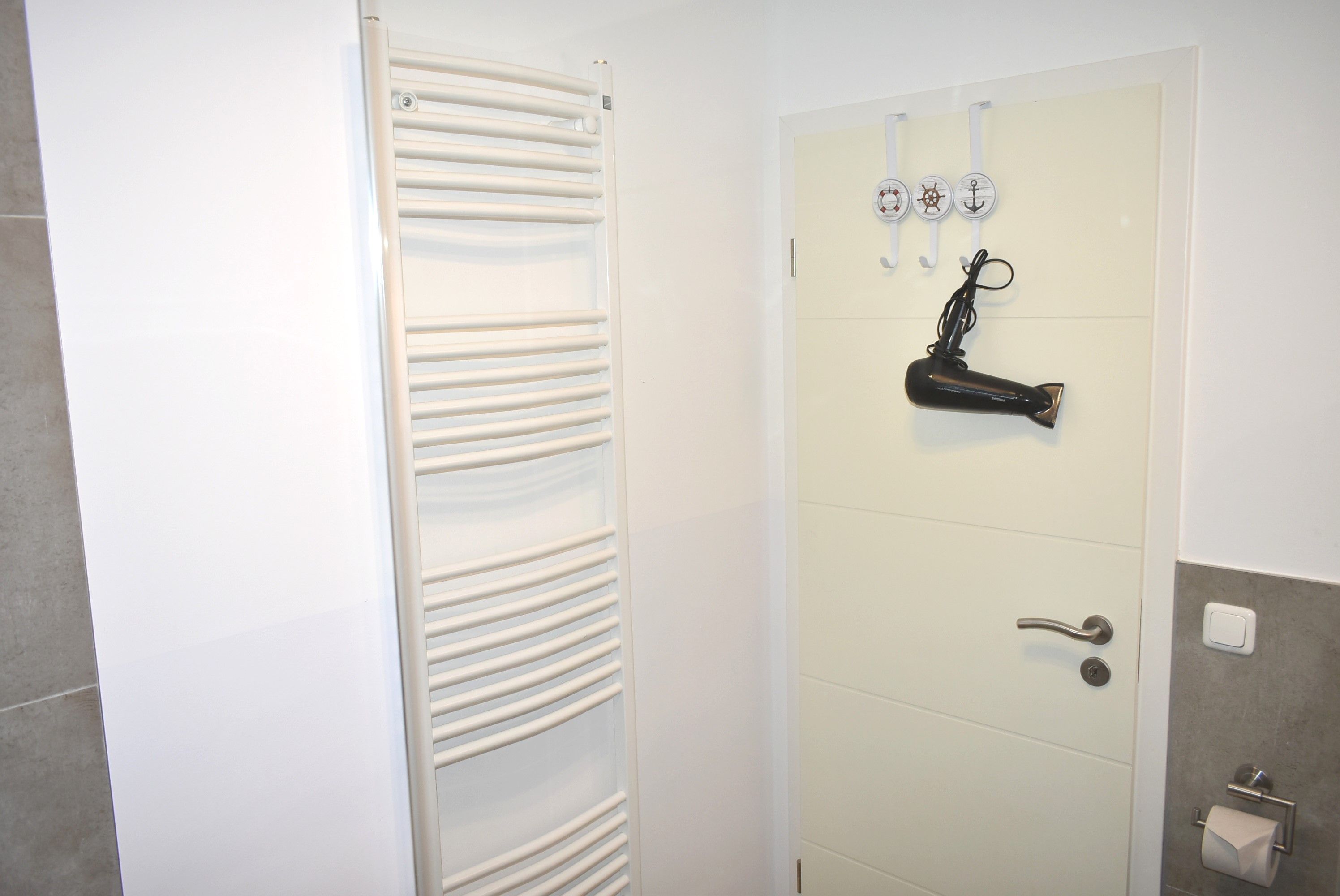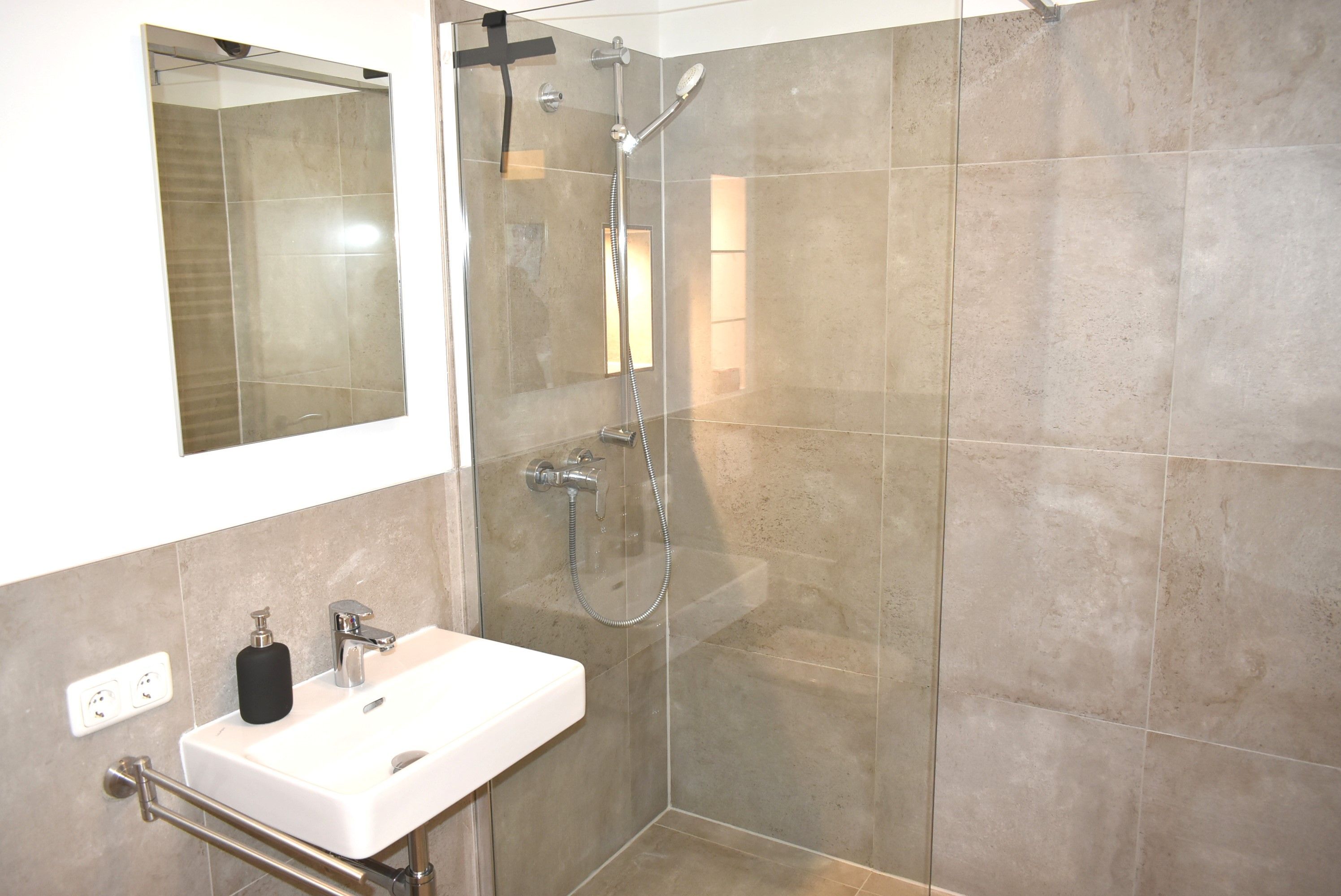Bad 1: Dusche bodengleich, Einbauregal, Glastrennwand, Handtuchhalter, Handtuchheizung, Spiegel, Waschbecken, WC