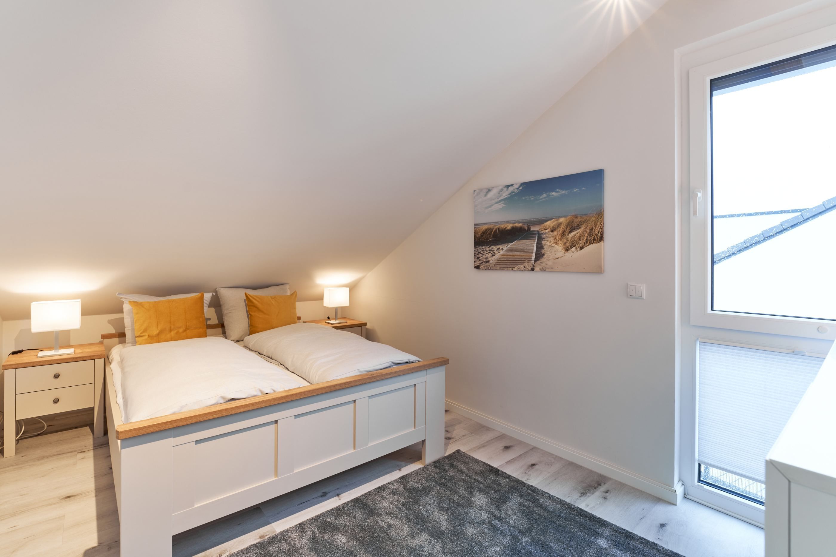 Das zweite Schlafzimmer hat ebenfalls ein Doppelbett mit Einzelmatratzen und verstellbarem Kopf- und Fußteil. Ein Smart-TV ist auch hier vorhanden. Das zweite Tageslichtbad ist mit einer bodengleichen Dusche ausgestattet.