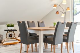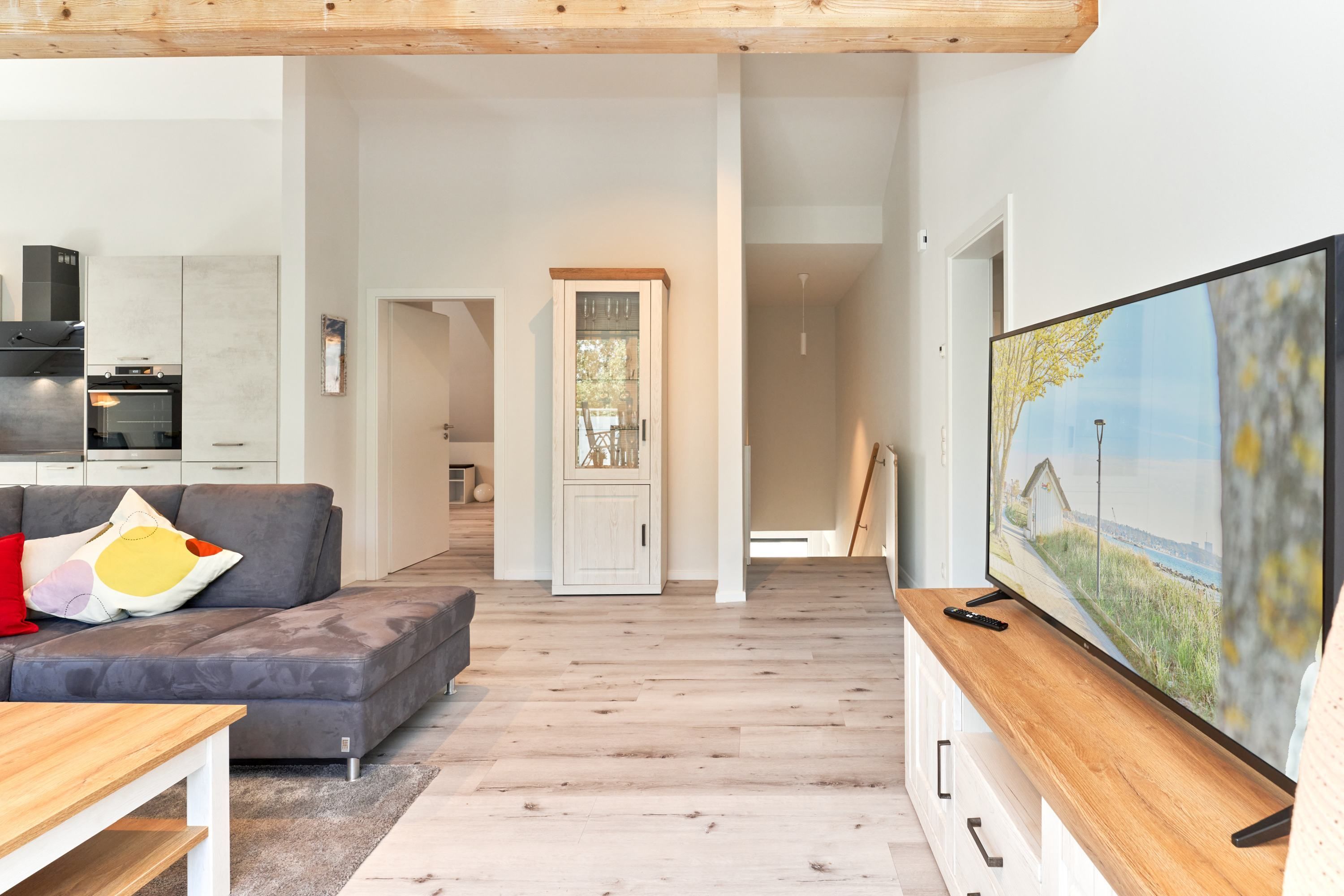 Helles, großes Wohnzimmer mit einer Einbauküche, einem Essbereich mit Tisch und 6 Stühlen. Der Wohnbereich ist mit einem gemütlichen Sofa und einem Smart-TV ausgestattet. Vom Wohnzimmer aus gelangen Sie in das erste Schlafzimmer mit einem Doppelbett mit verstellbarem Kopf- und Fußteil, 2 Nachttischen, Kleiderschrank und einem Smart-TV. Angrenzend das Duschbad mit separatem WC.