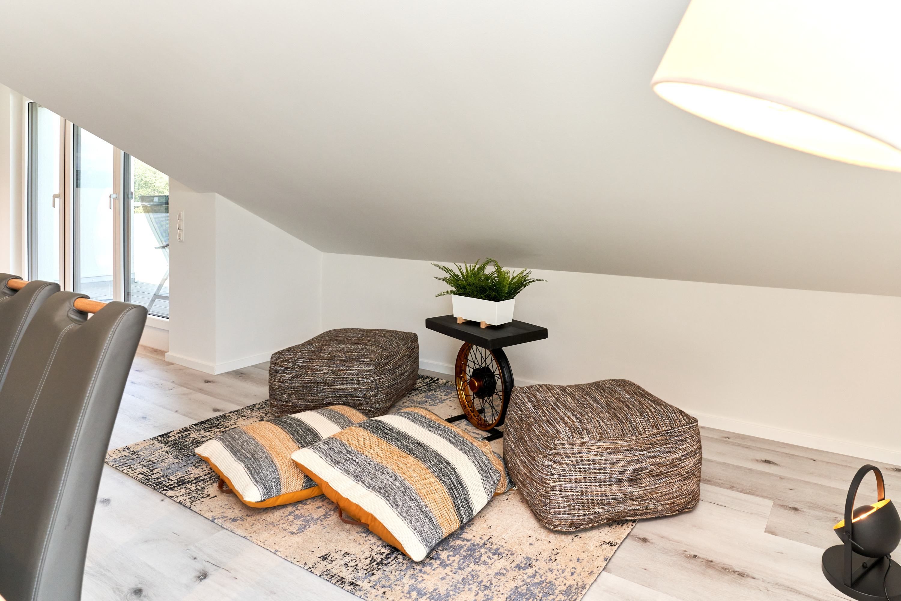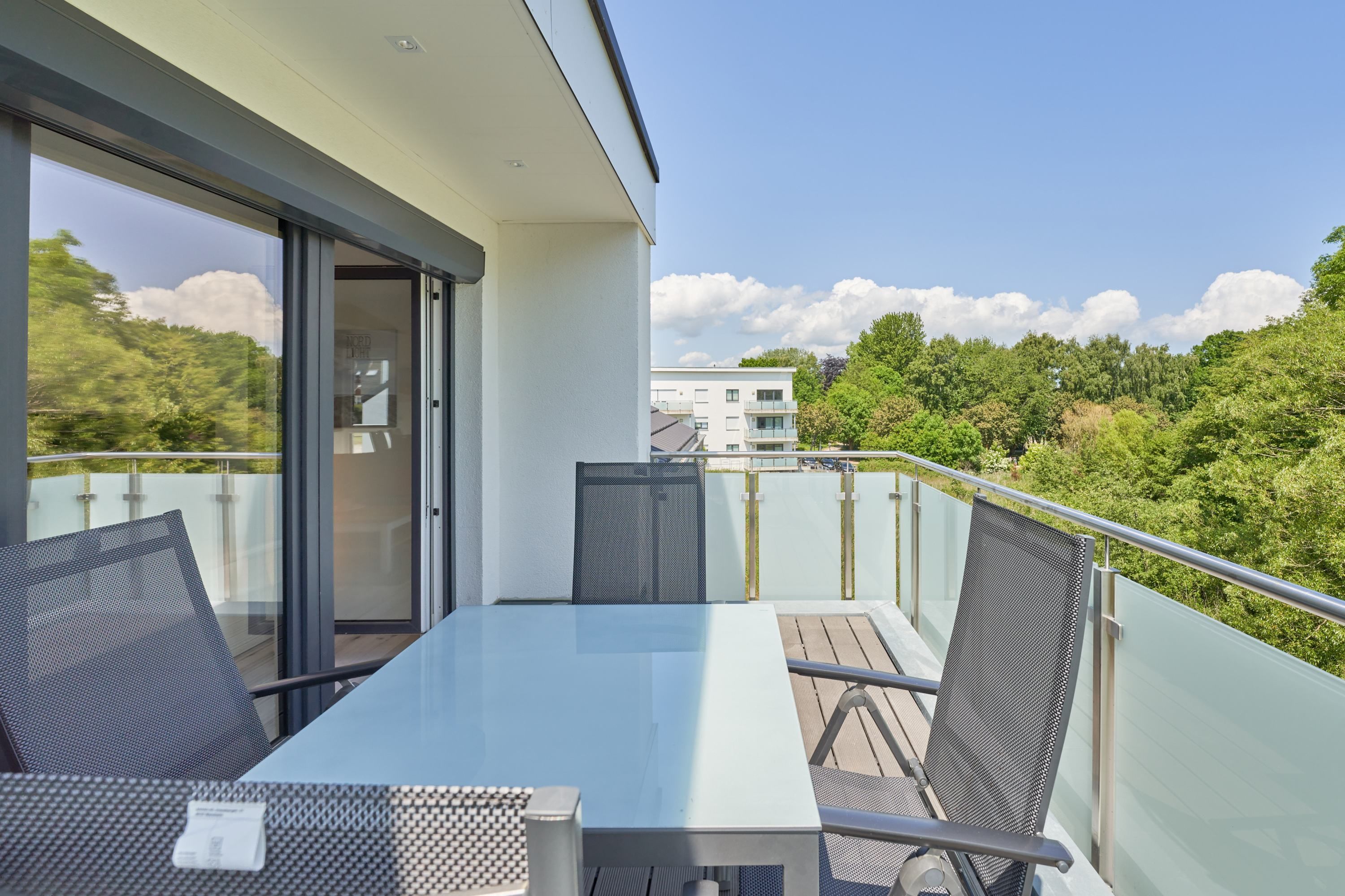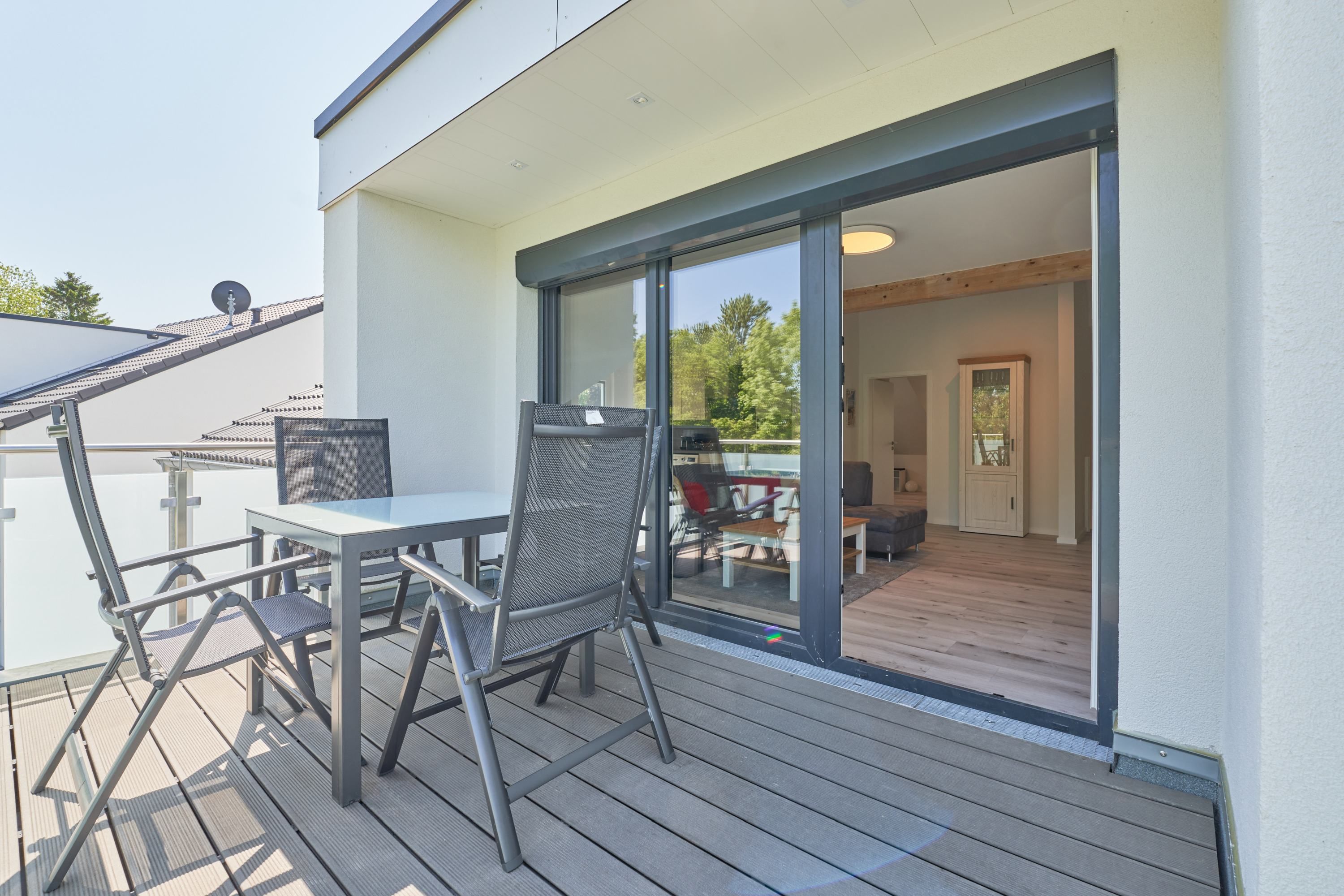 Auf dem großen Balkon stehen Ihnen Tisch und Stühle zur Verfügung. Weiter Blick ins Grüne.
