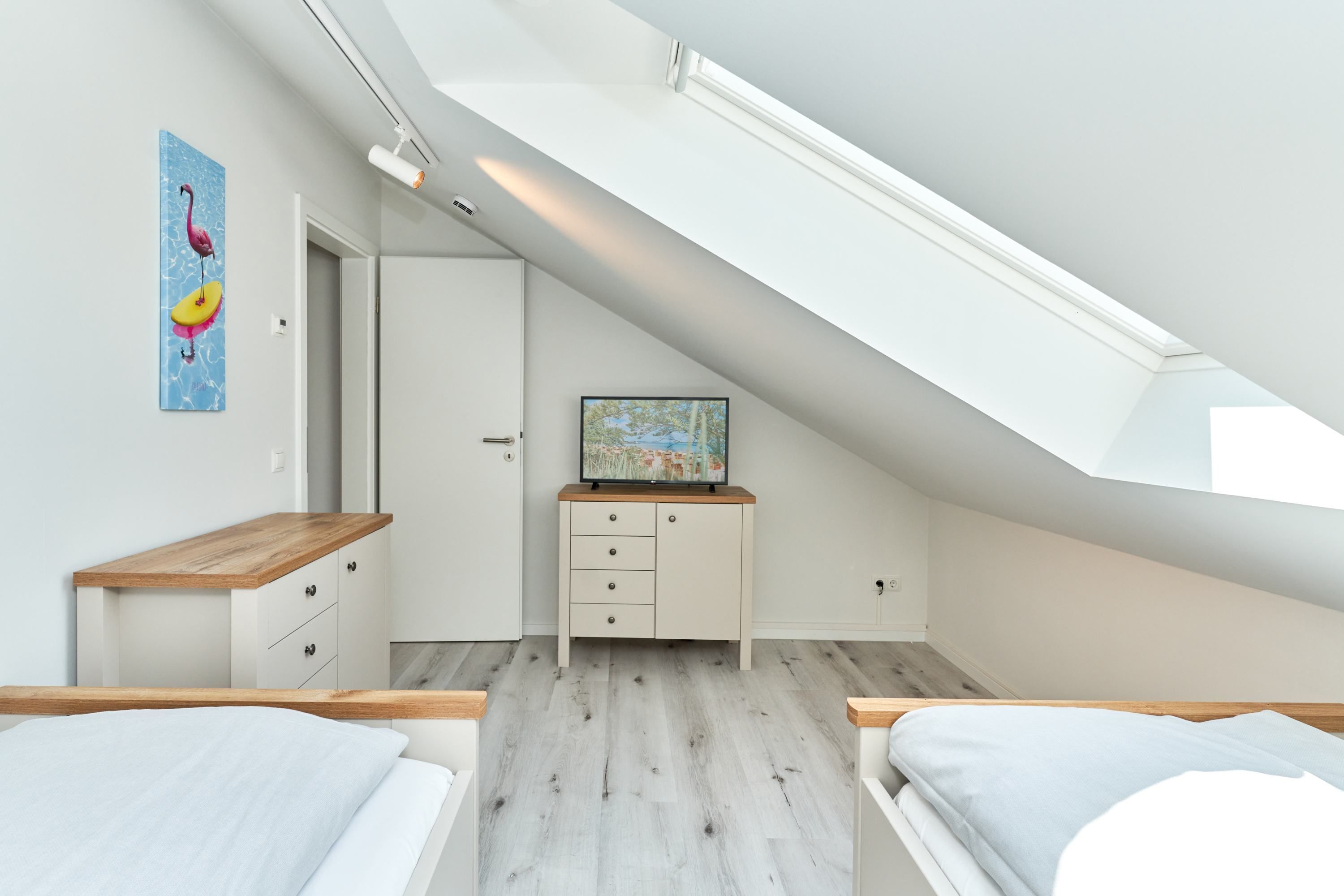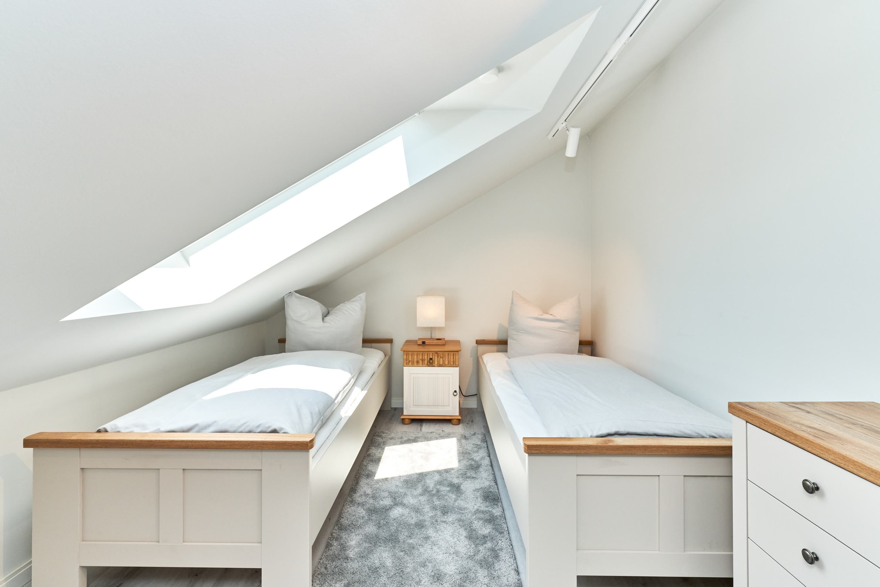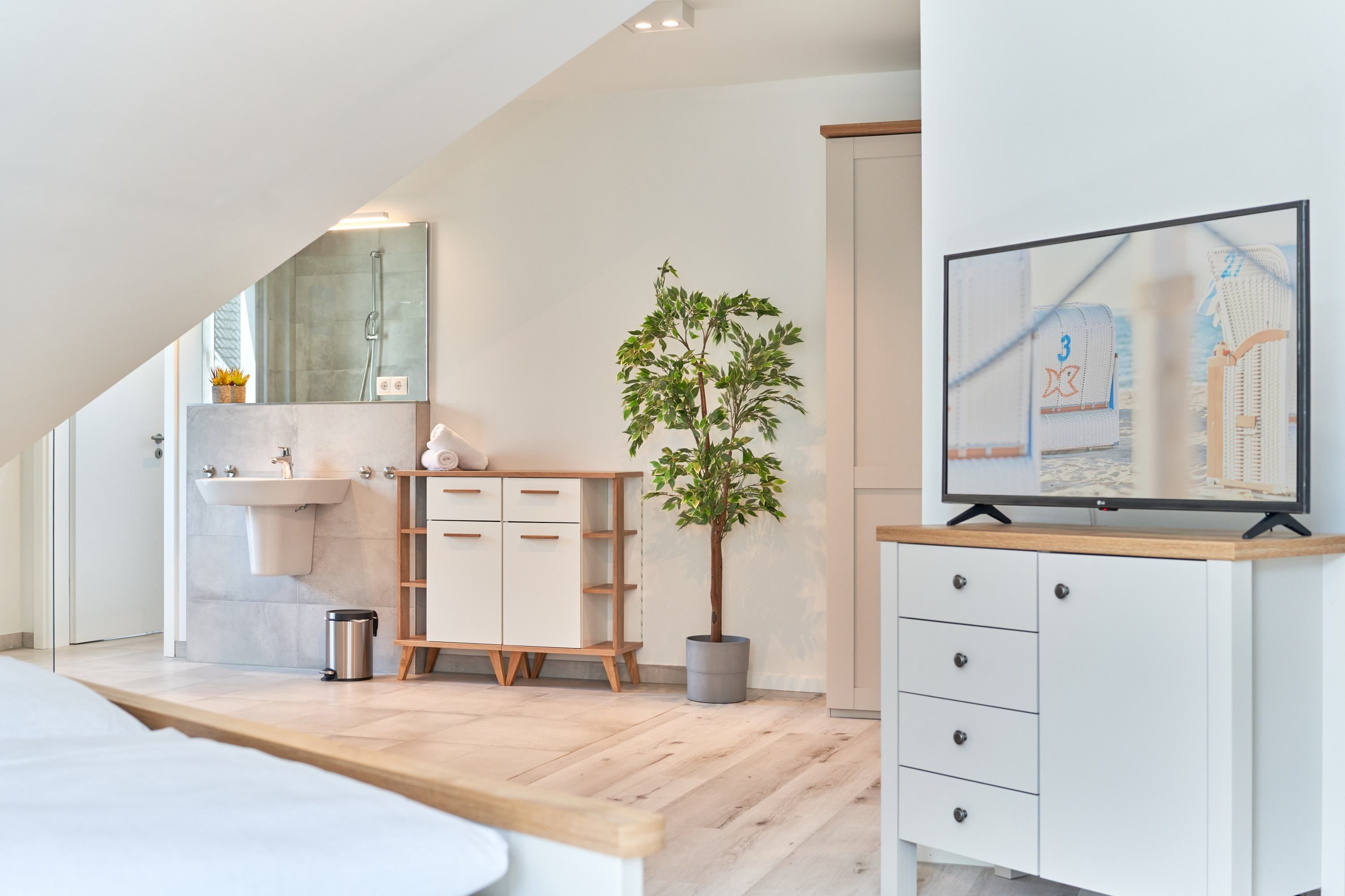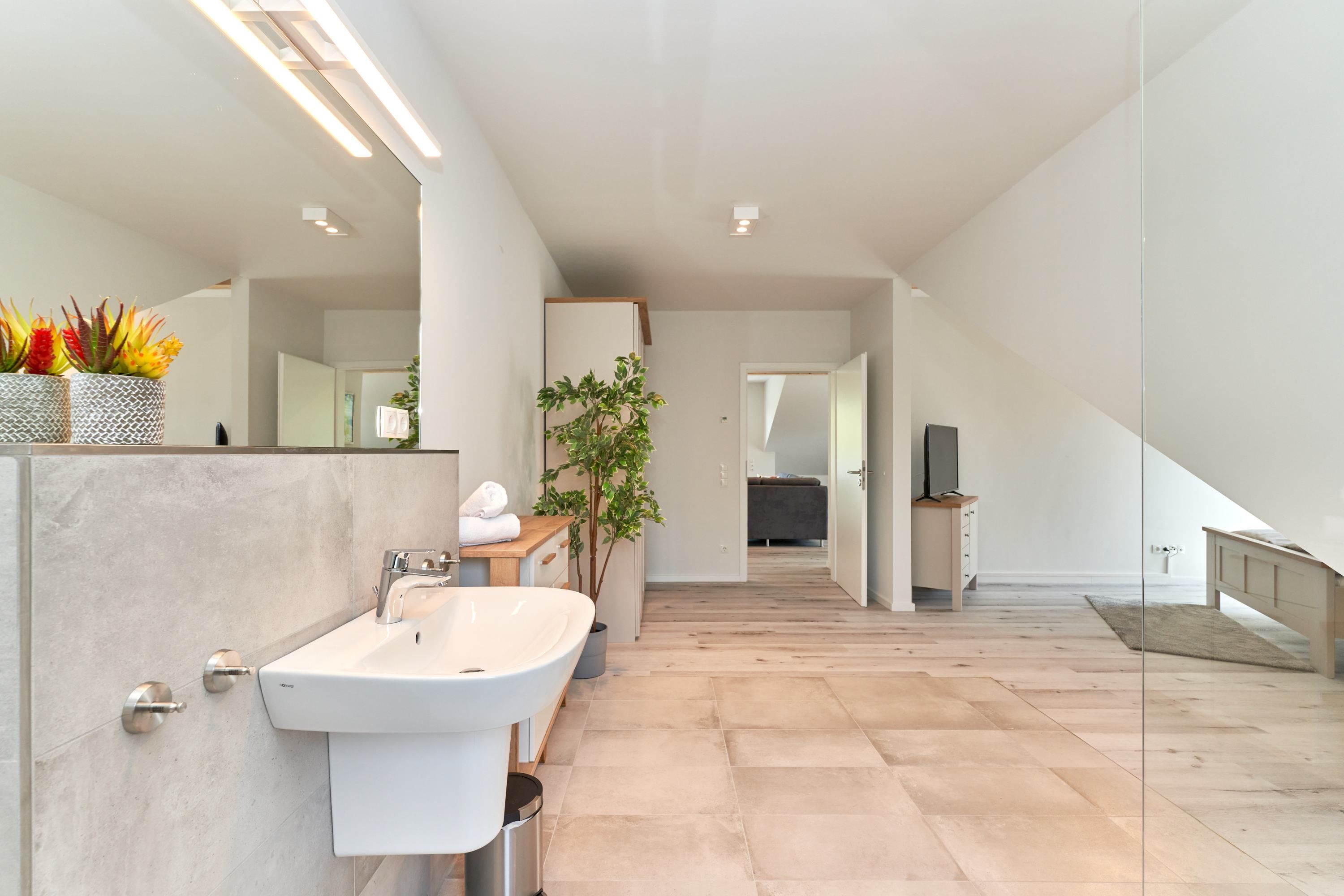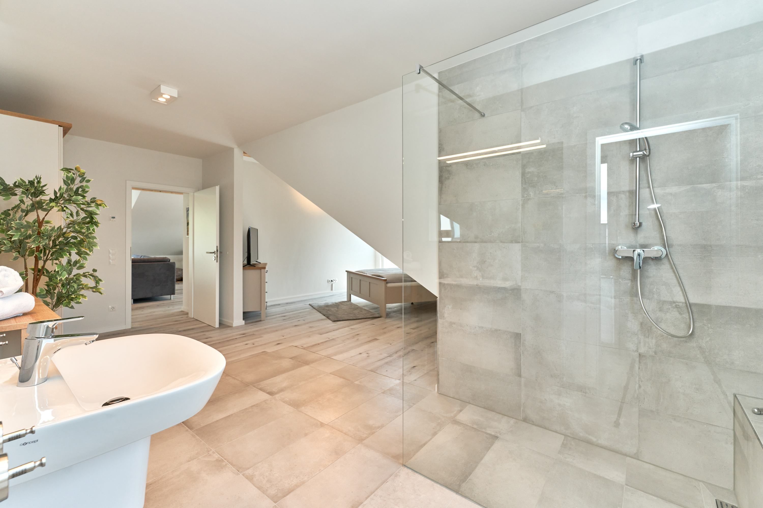 Das zweite Schlafzimmer hat ebenfalls ein Doppelbett mit Einzelmatratzen und verstellbarem Kopf- und Fußteil. Ein Smart-TV ist auch hier vorhanden. Das zweite Tageslichtbad ist mit einer bodengleichen Dusche ausgestattet. Das dritte Schlafzimmer ist mit zwei Einzelbetten und einem Smart-TV ausgestattet.