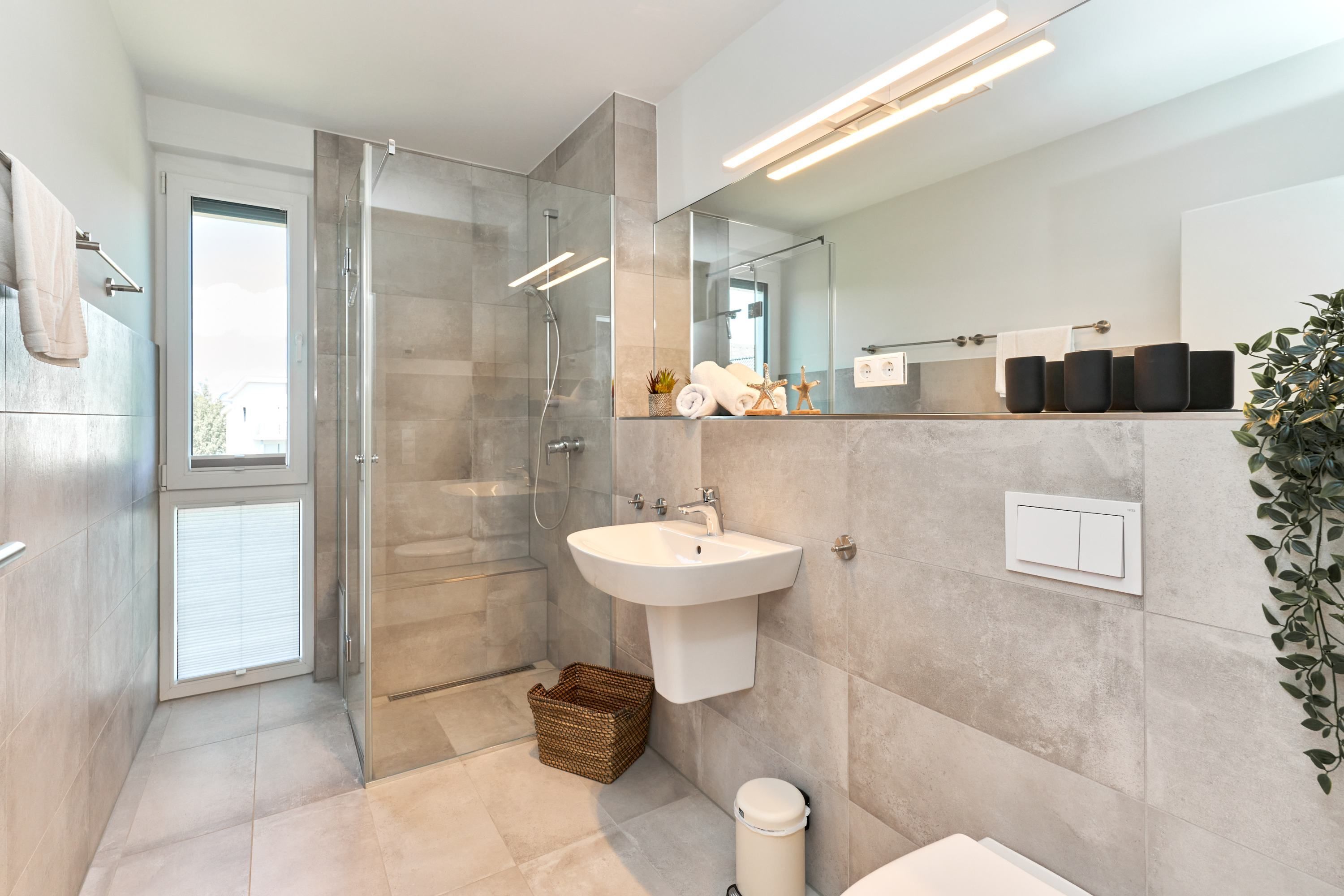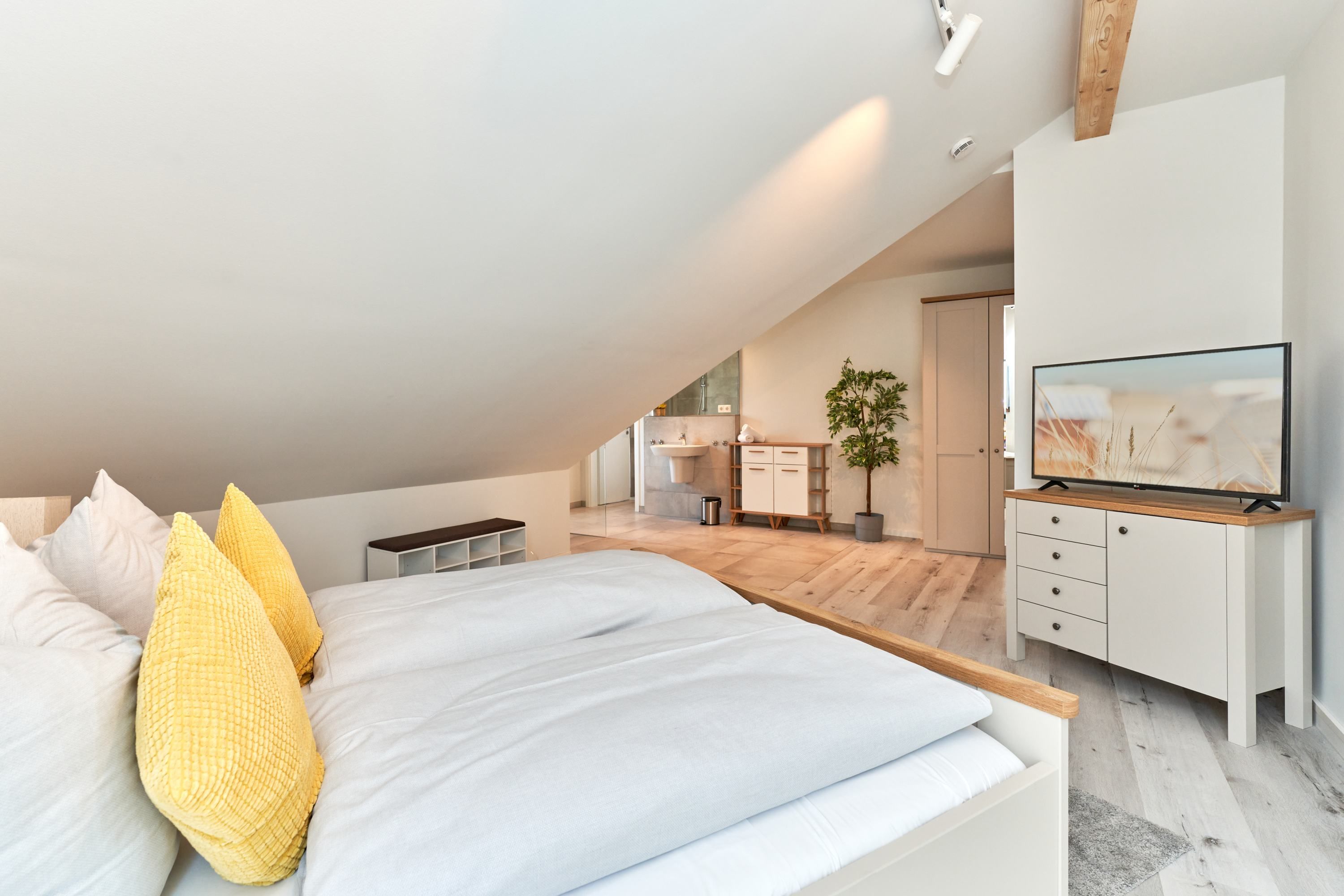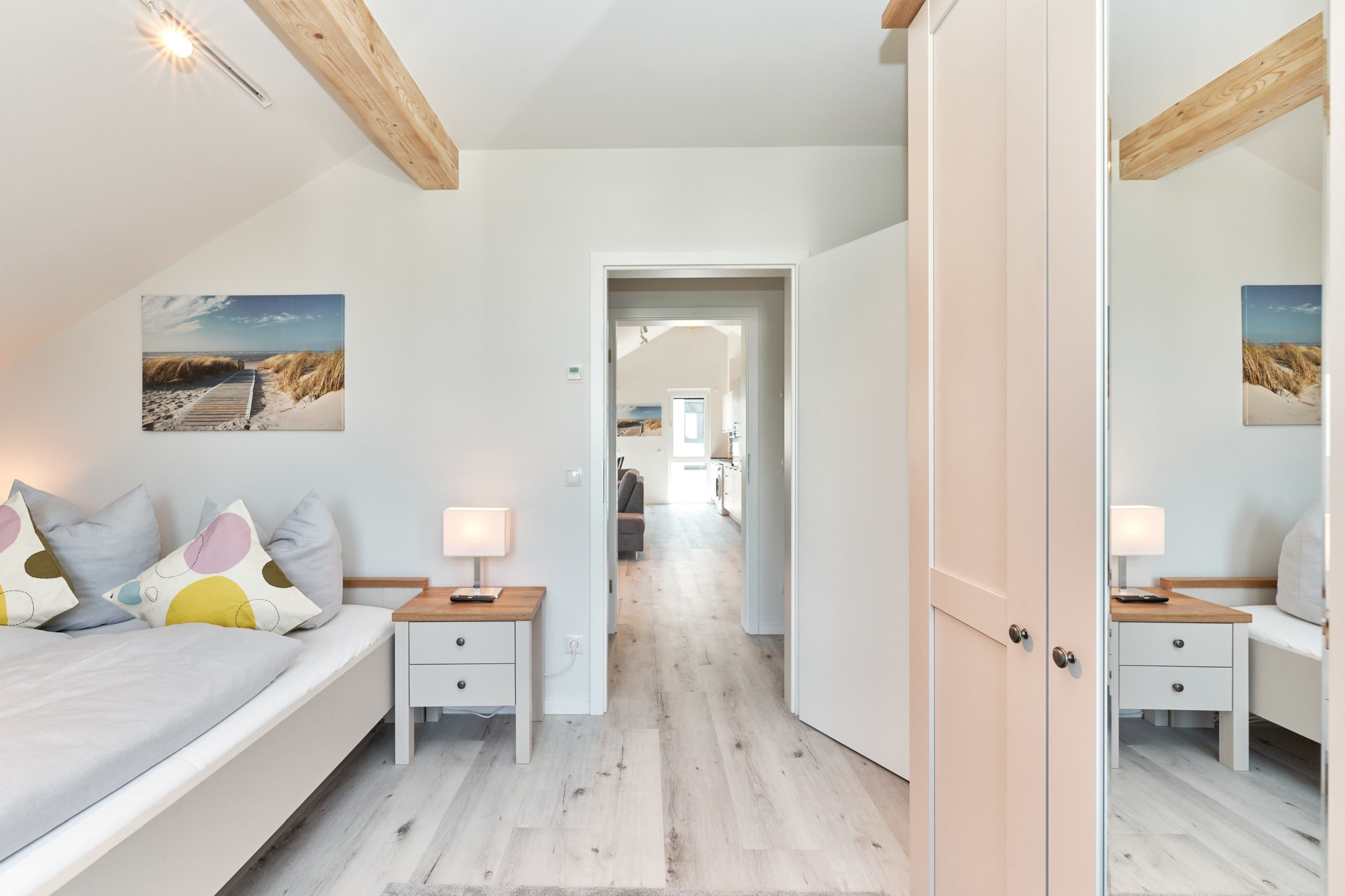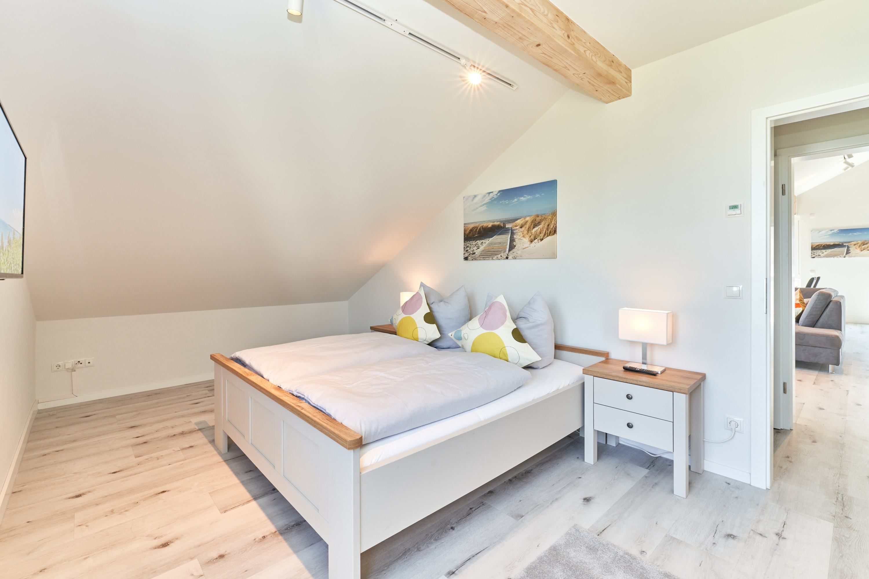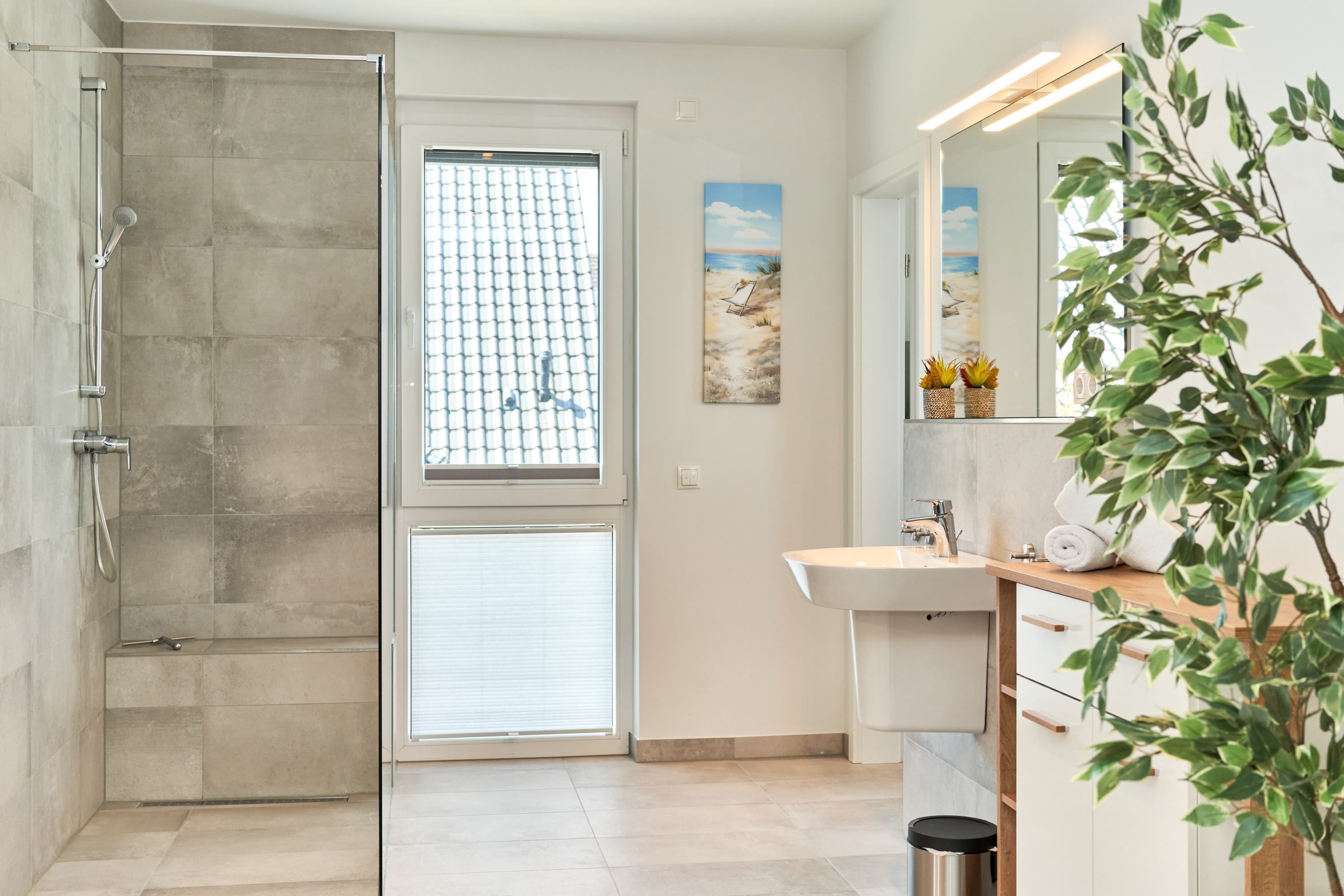 Das zweite Schlafzimmer hat ebenfalls ein Doppelbett mit Einzelmatratzen und verstellbarem Kopf- und Fußteil. Ein Smart-TV ist auch hier vorhanden. Das zweite Tageslichtbad ist mit einer bodengleichen Dusche ausgestattet. Das dritte Schlafzimmer ist mit zwei Einzelbetten und einem Smart-TV ausgestattet.