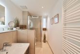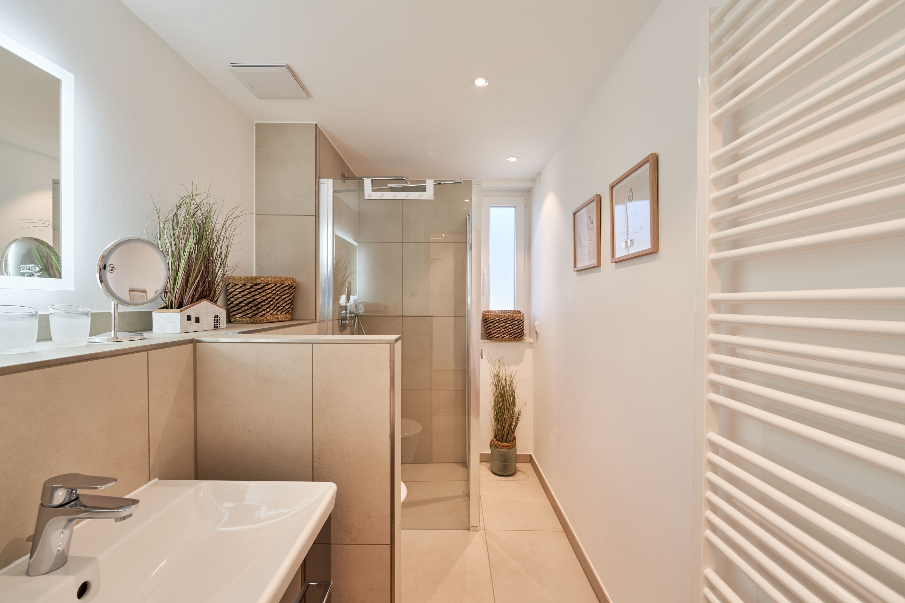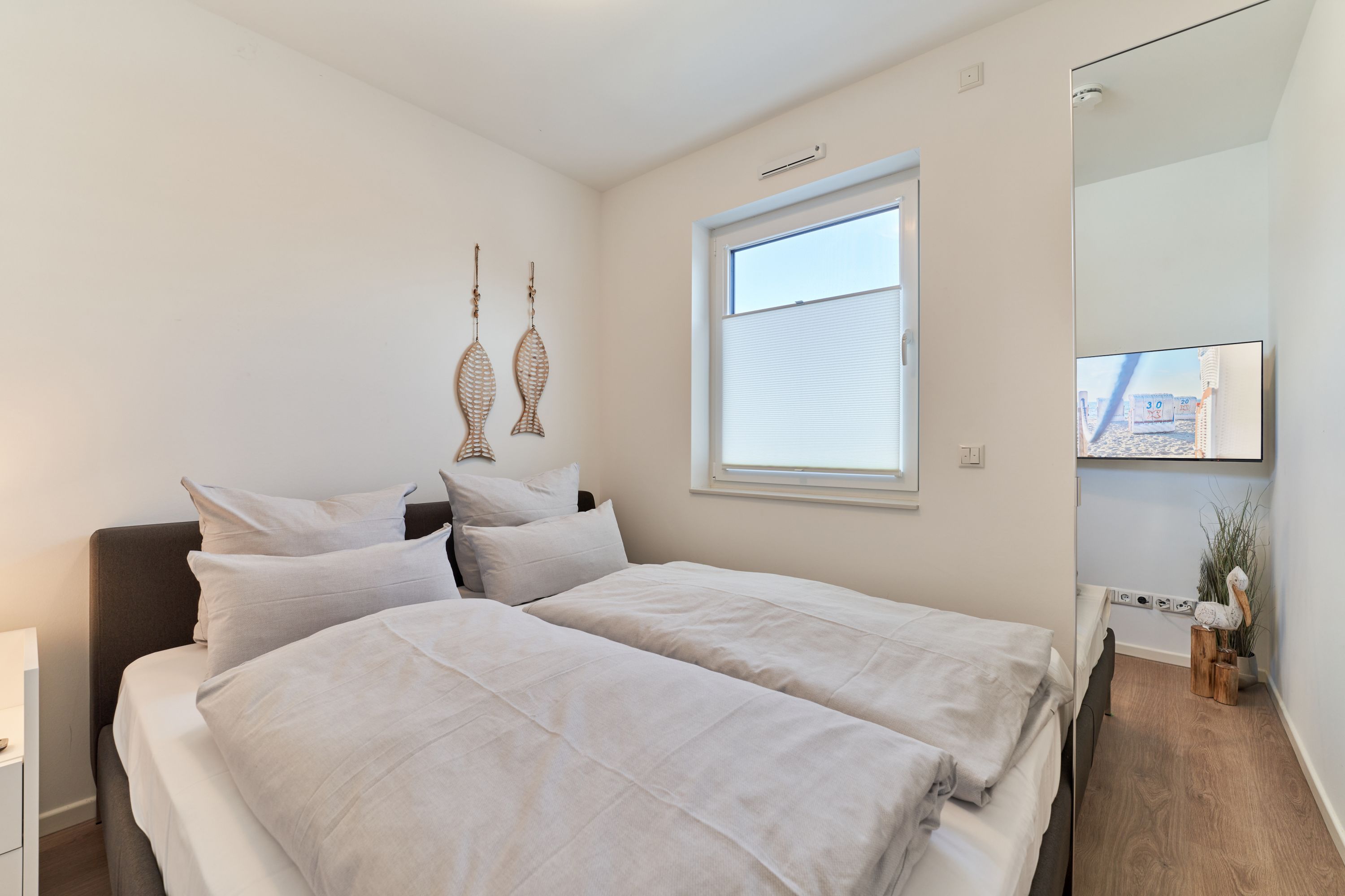Im Wohnzimmer stehen Ihnen ein OLED-TV-Gerät, ein TechniSat-Digitradio und eine SONOS-Soundbox zur Verfügung. Weiterhin wartet auf Sie ein anspruchsvoller Wohn-Essbereich.  Vom Sofa aus haben Sie einen weiteren Teil-Ostseeblick. Großer runder Esstisch, der sich auch für fröhliche Spielabende eignet. Das erste Schlafzimmer ist mit einem sehr bequemen Doppelbett (1,80m x 2,00m), einem OLED-TV-Gerät, einem Kleiderschrank sowie Nachttischen ausgestattet. Im 2. Schlafzimmer stehen ein ebenso hochwertiges Doppelbett (1,80mx2,00m), ein OLED-TV-Gerät und ein kleiner Kleiderschrank für Sie bereit.   Das Tageslicht-Duschbad ist mit einem Handtuchheizkörper sowie einer bodengleichen Dusche ausgestattet. Kosmetikspiegel sowie ein Haartrockner sind hier selbstverständlich vorhanden.