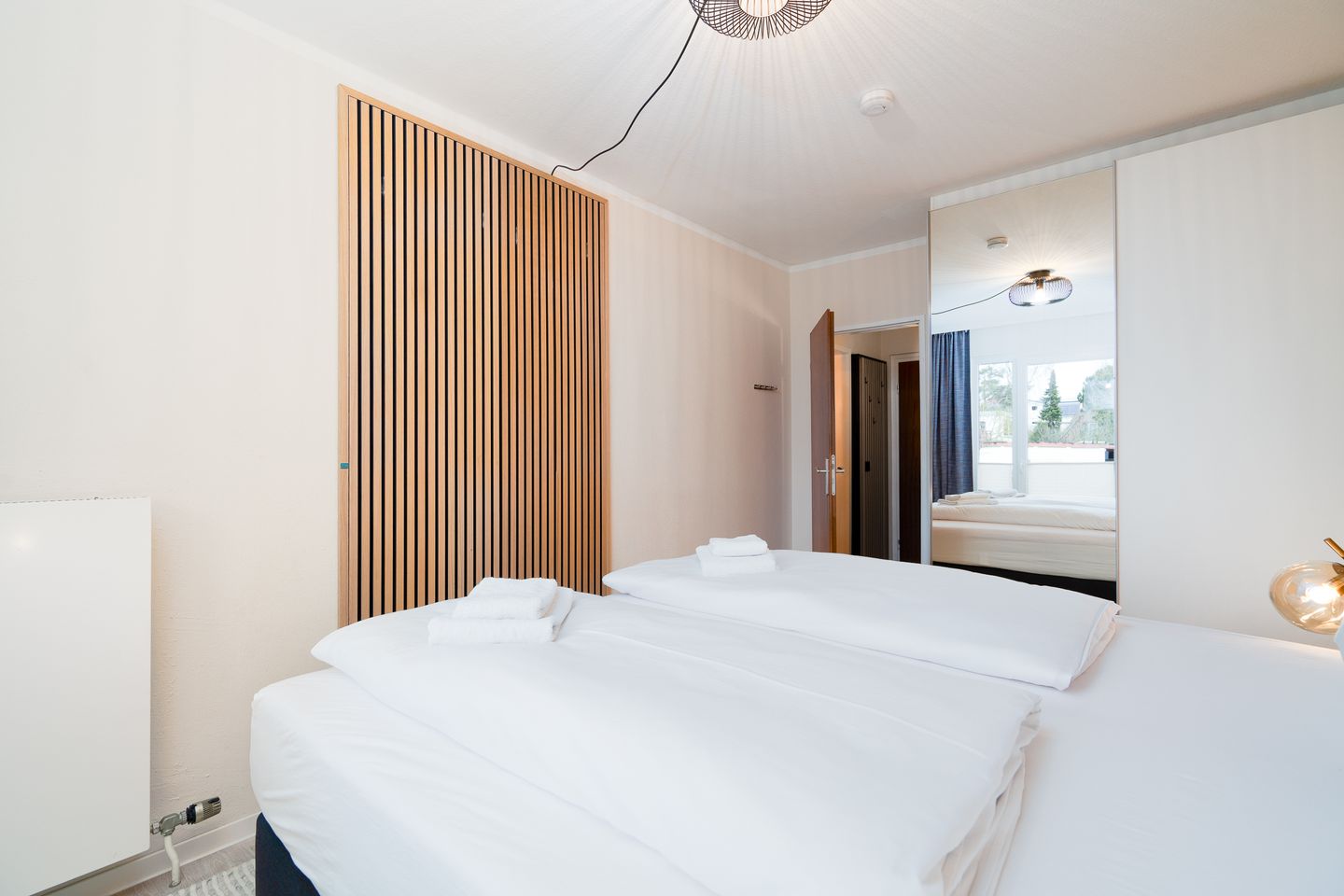 Genießen Sie Ihren Aufenthalt in dieser strandnahen Ferienwohnung, die auf 43 m² Platz für bis zu 4 Personen bietet. Das gemütliche Schlafzimmer mit Doppelbett sorgt für eine erholsame Nachtruhe, während der Wohnbereich mit einer komfortablen Schlafcouch für zwei weitere Personen ausgestattet ist. Beide Räume lassen sich vollständig abdunkeln, sodass Sie jederzeit Ruhe und Entspannung finden. Auf Wunsch stellen wir Ihnen gerne ein Kinderbett sowie einen Hochstuhl zur Verfügung – ideal für einen Familienaufenthalt. Das Badezimmer verfügt über eine praktische Dusche, die für angenehmen Komfort sorgt.