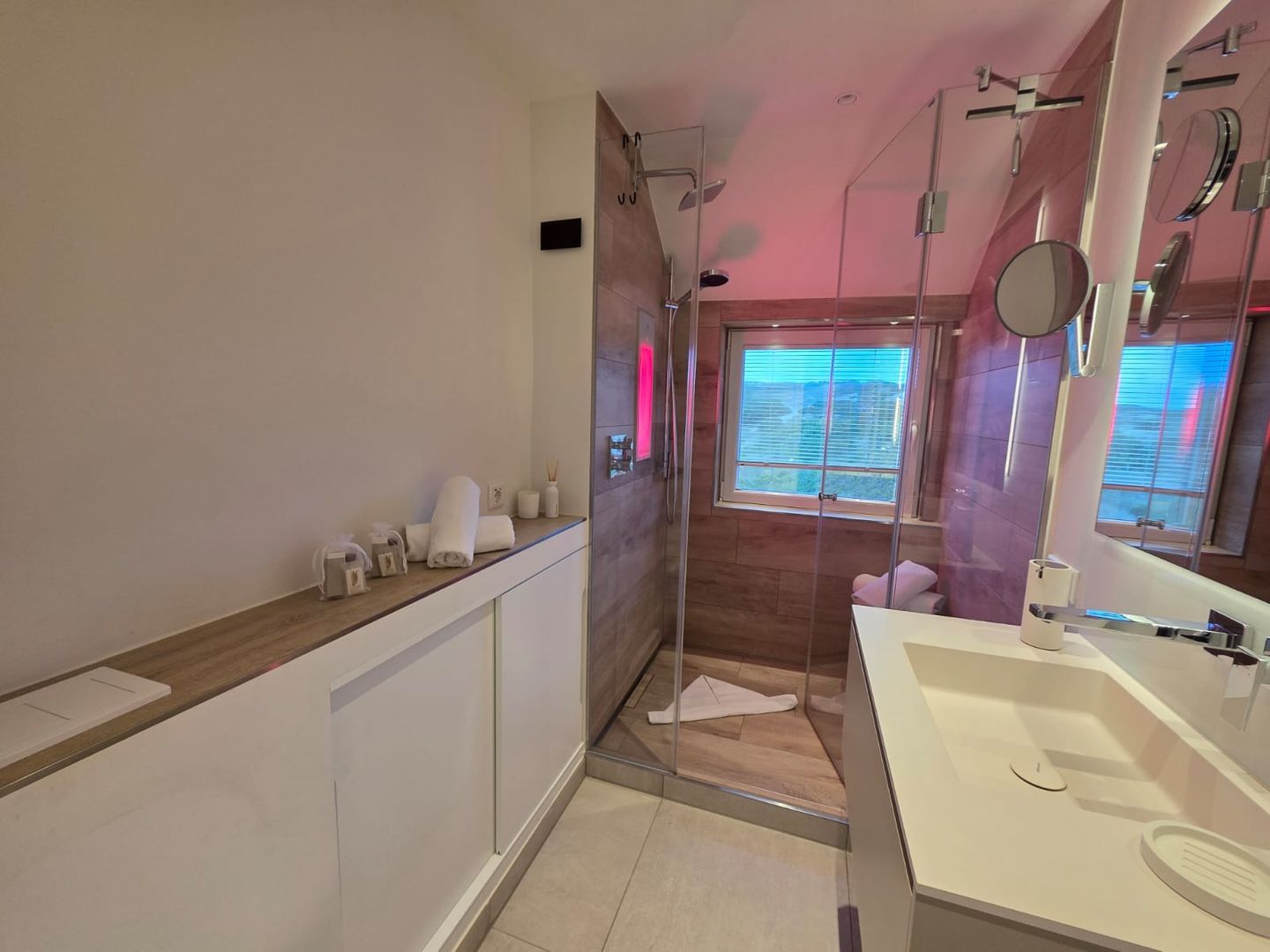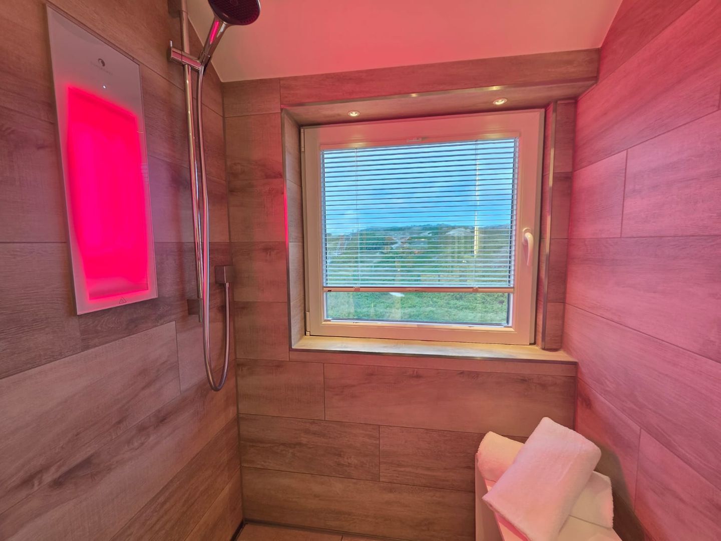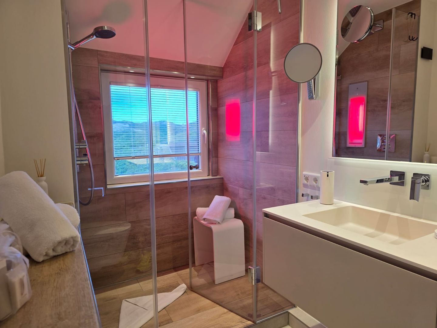 Das Duschbad ist hell und freundlich gestaltet, Regendusche, Highlight hier ist die Sunshower (Infrarot-Panel) in der Dusche. Hier durch erhalten Sie ein Feeling wie in der Sauna.