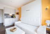 Nur wenige Gehminuten vom Strand entfernt befindet sich diese schöne 18 m² Ferienwohnung im 1. Stock, die Platz für 1-2 Personen bietet – auch Ihr Hund ist willkommen. Die Wohnung verfügt über einen hellen Wohnbereich mit einem Sofa-Schrankbett für 2 Personen. Das Badezimmer ist mit einer Dusche ausgestattet. Die Wohnung wird durch eine kleine Küchenzeile mit einem Essplatz sowie einen möblierten Balkon abgerundet.