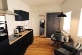 - offene Küche ausgestattet mit Geschirrspüler, Backofen, Kochfeld, Kühlschrank, Kaffeemaschine, Wasserkocher, Geschirr, Besteck, Gläser uvm.