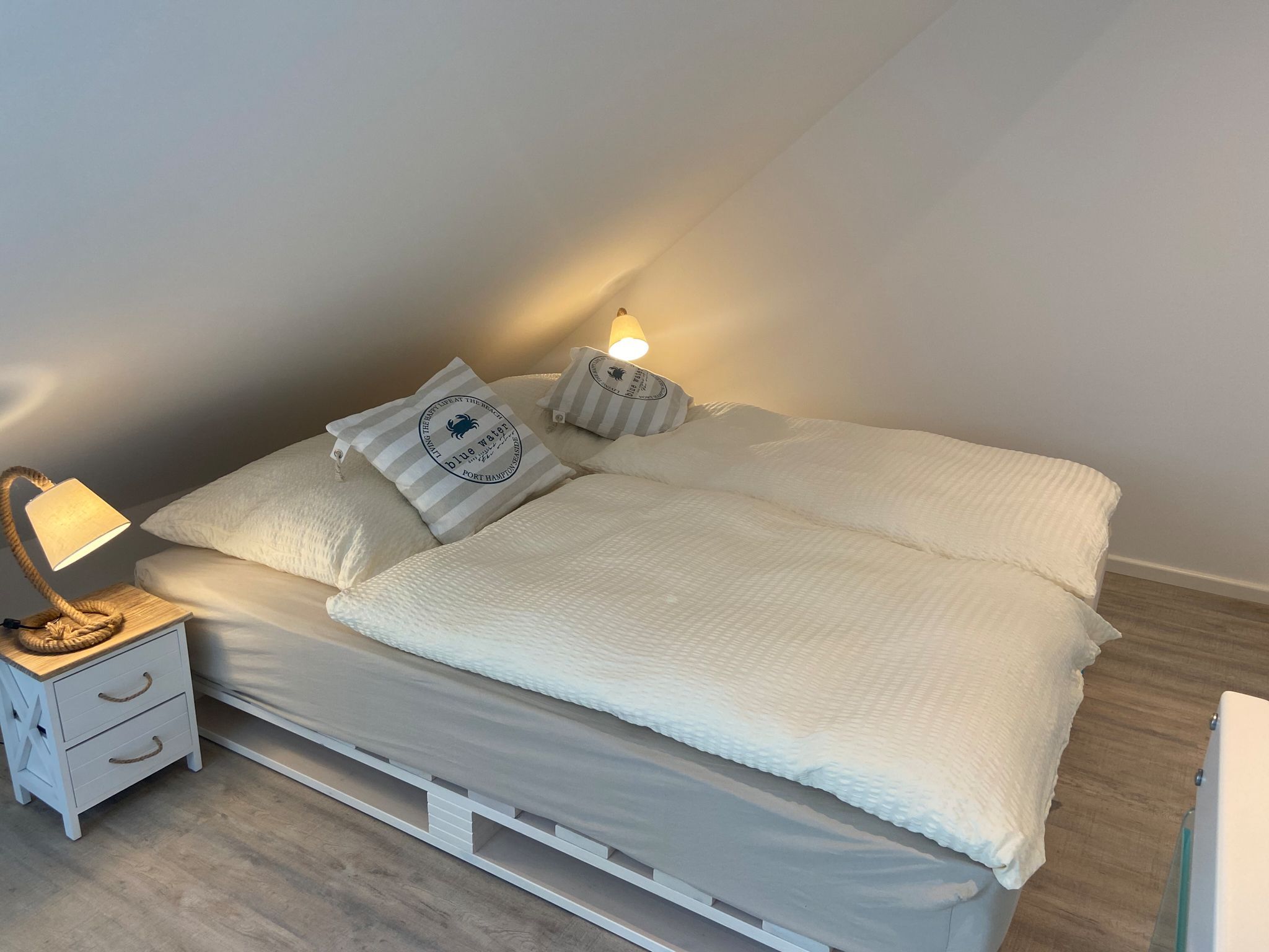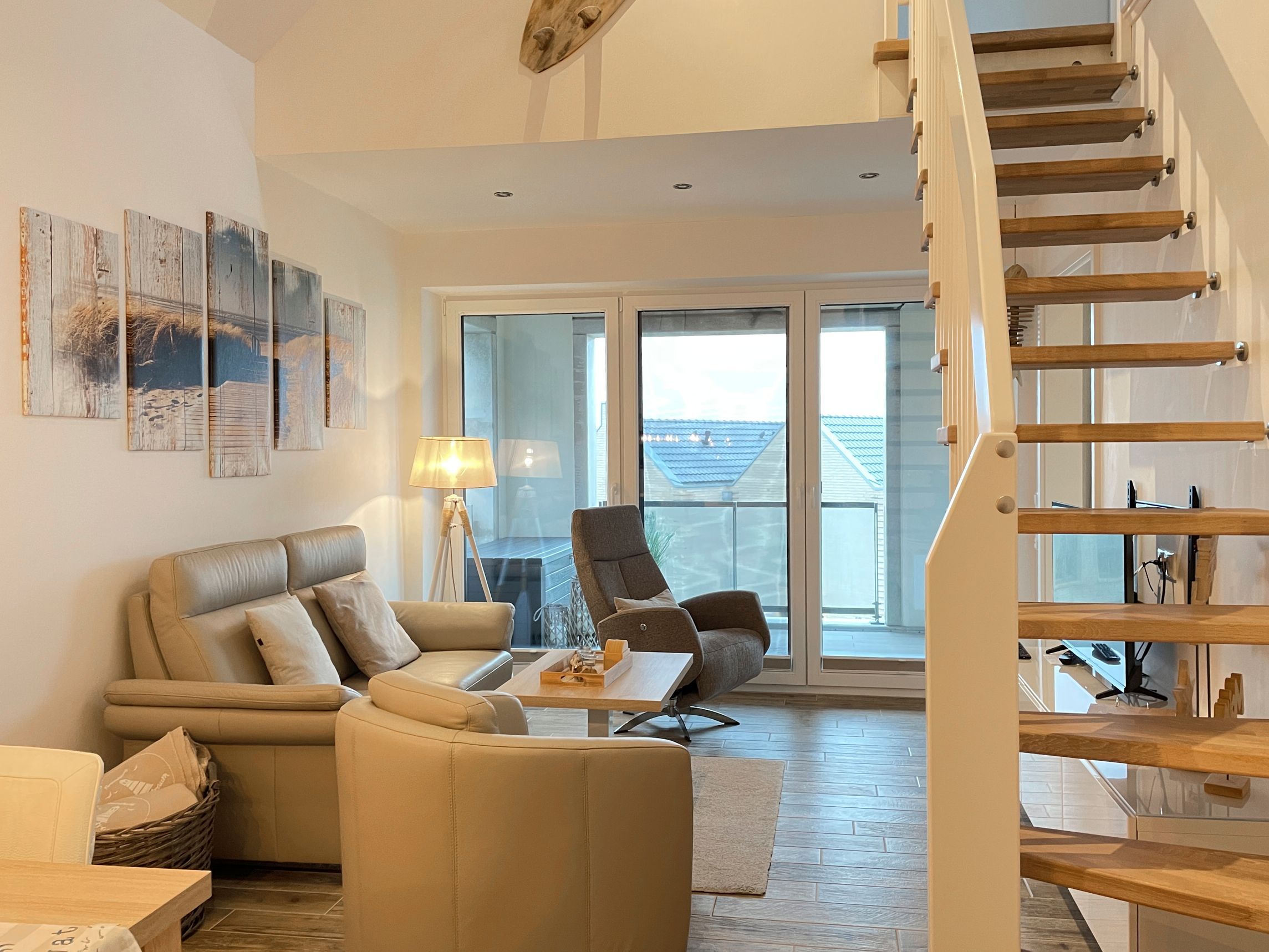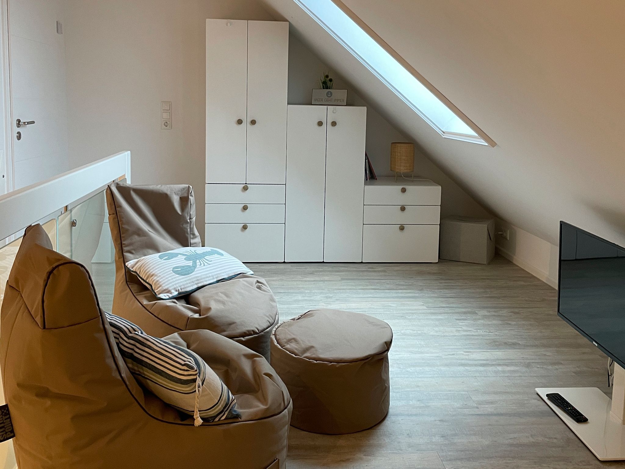 In dieser schönen Wohnung finden Sie einen offenen Wohn-/Küchenbereich mit Liebe zum Detail eingerichtet, einen Relax Sessel und diverse Kinderbücher für die Kleinen geben der Wohnung einen weiteren Hauch Gemütlichkeit, im Schlafzimmer mit Boxspringbett (Maße:180x200cm), Flachbildschirm, Kleiderschrank finden Sie eine entspannte Atmosphäre, einen offenen Schlafbereich auf der Empore mit einem Doppelbett(Einzelbetten) Flachbildschirm und 2 Sitzsäcken prägen das Bild. Das schöne moderne Bad - ausgestattet mit Föhn, Radio und mit bodentiefer Sommerregendusche - rundet das Ambiente ab. Auf der großen Loggia mit den Sonnenliegen können Sie Ruhe finden und genießen.