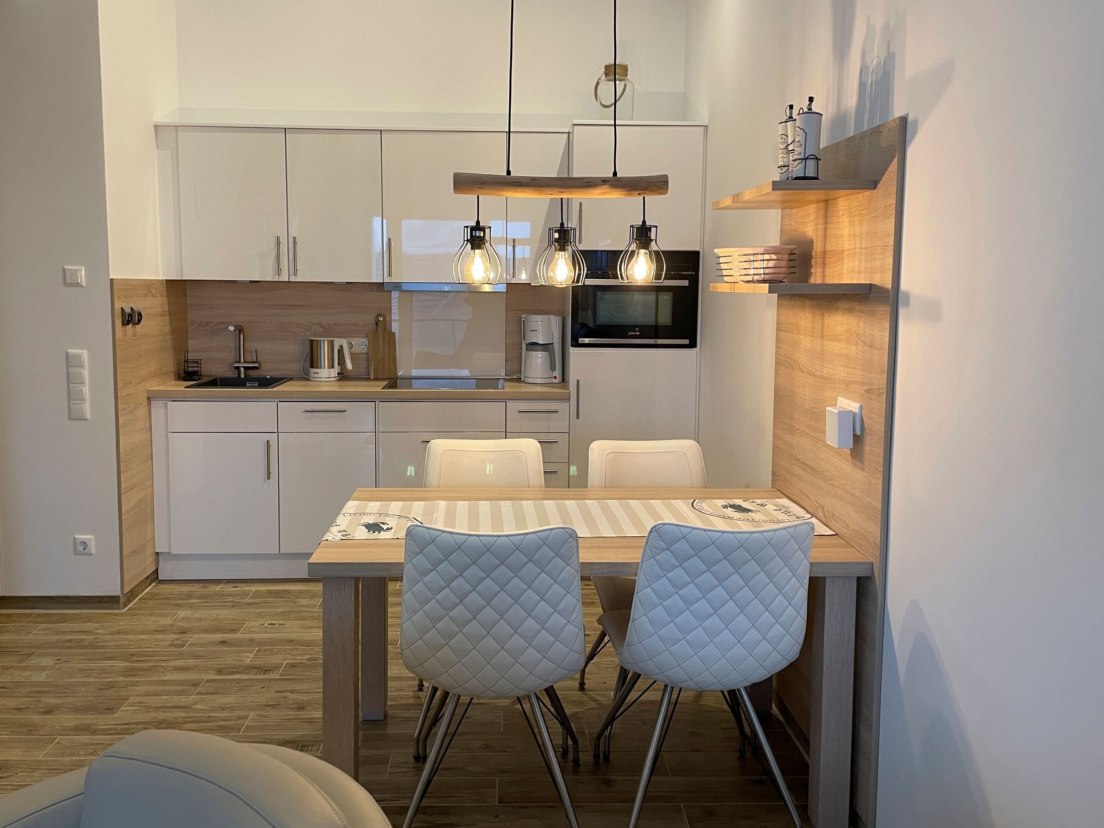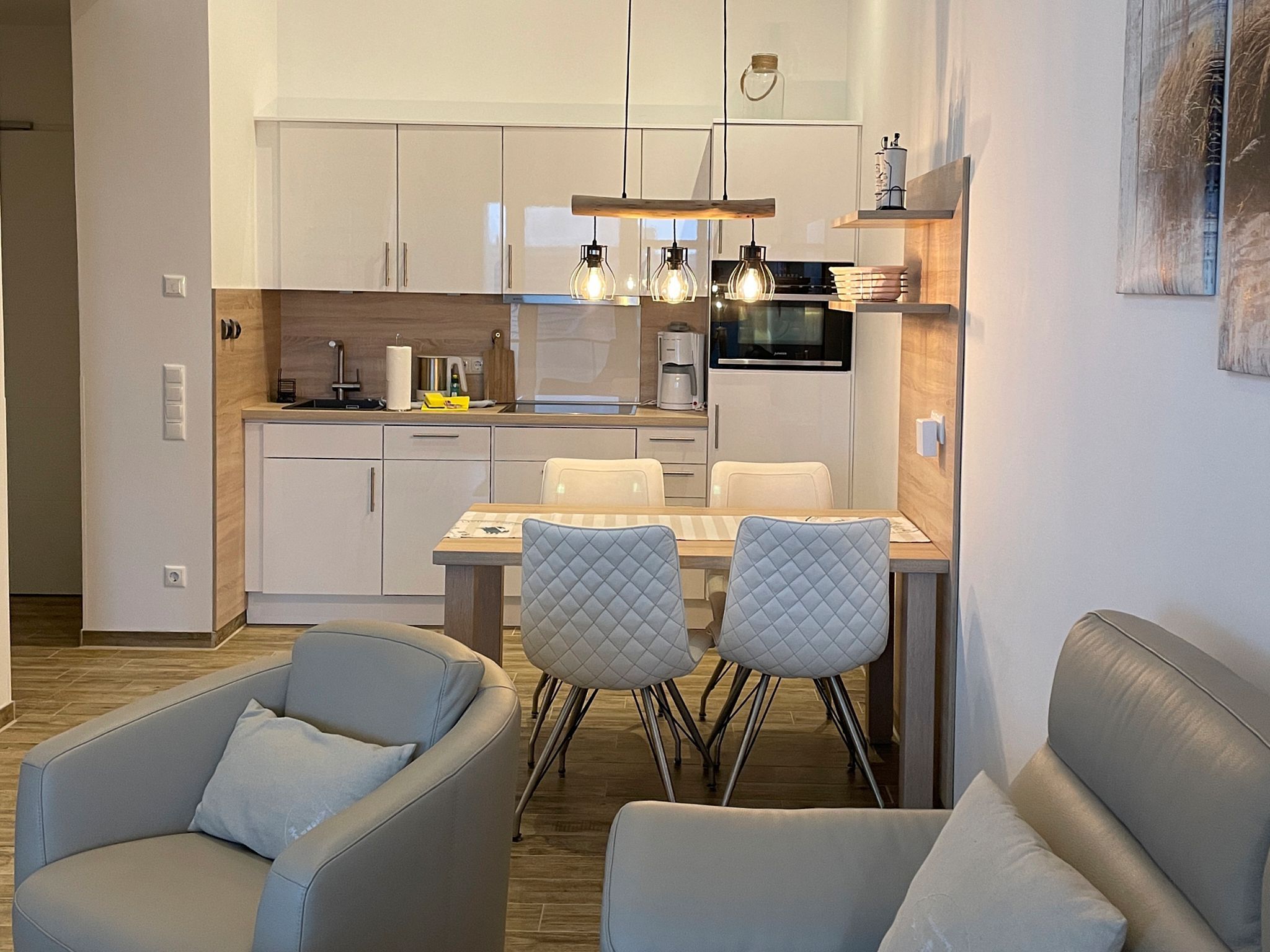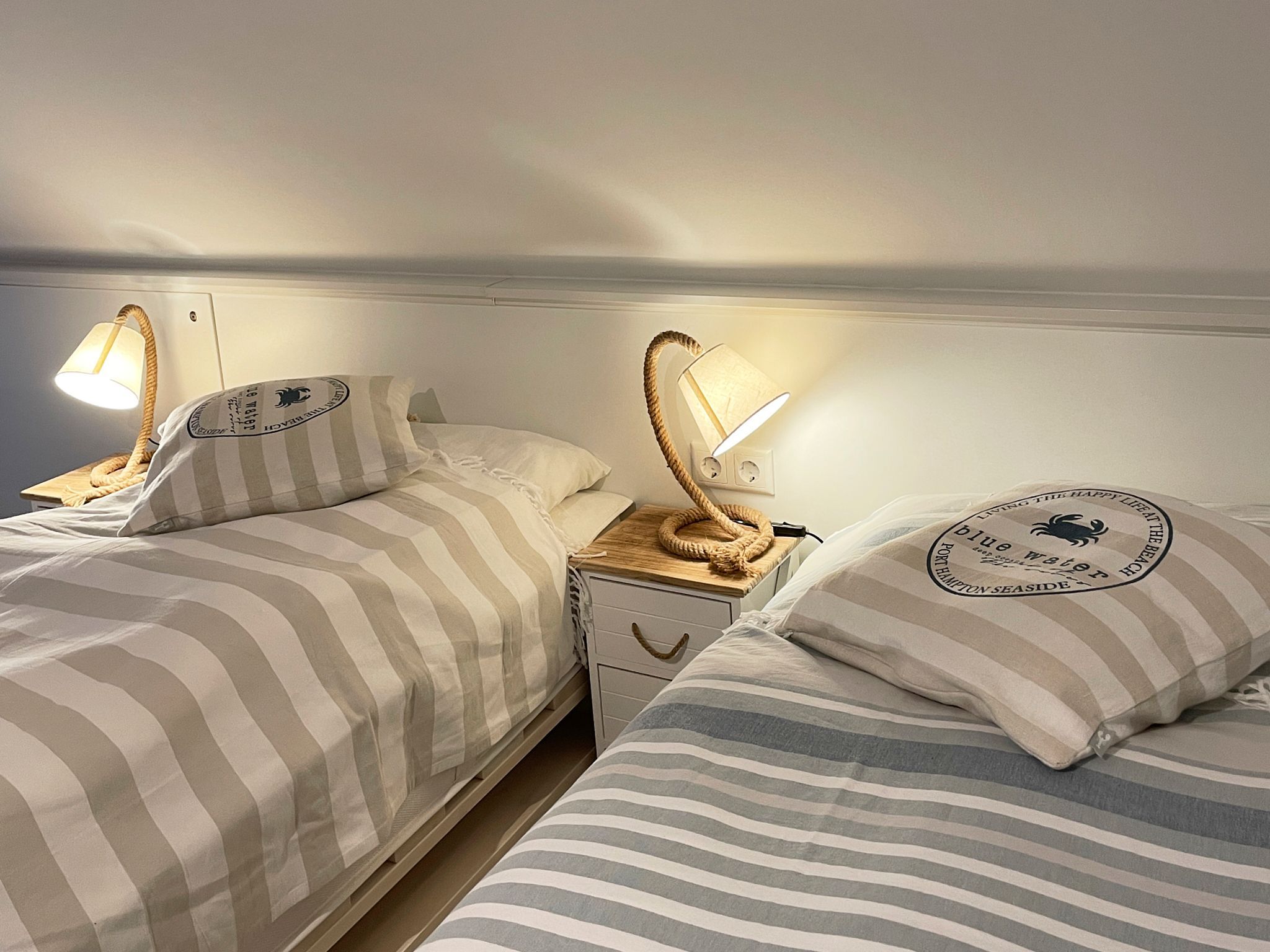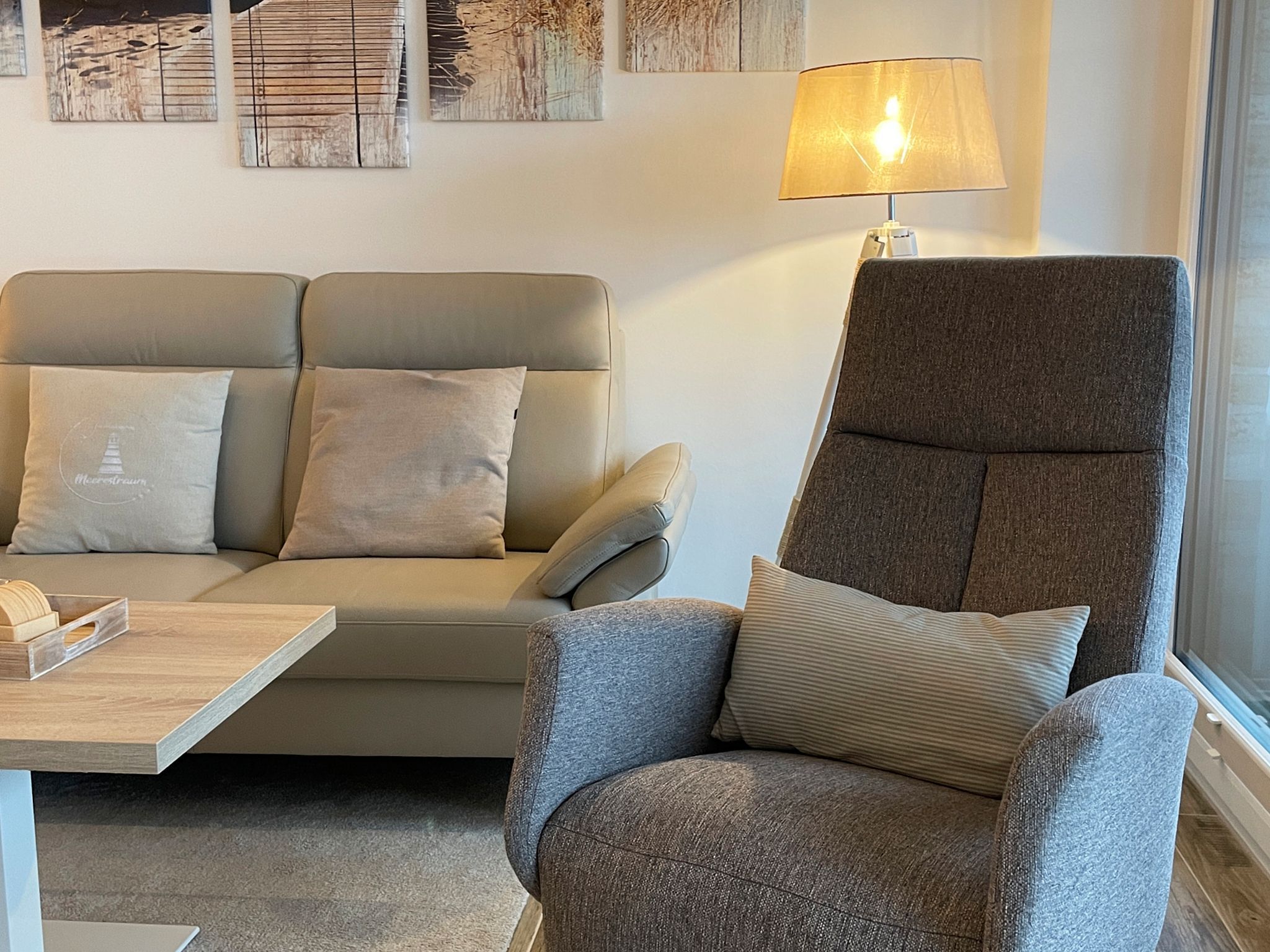 In dieser schönen Wohnung finden Sie einen offenen Wohn-/Küchenbereich mit Liebe zum Detail eingerichtet, einen Relax Sessel und diverse Kinderbücher für die Kleinen geben der Wohnung einen weiteren Hauch Gemütlichkeit, im Schlafzimmer mit Boxspringbett (Maße:180x200cm), Flachbildschirm, Kleiderschrank finden Sie eine entspannte Atmosphäre, einen offenen Schlafbereich auf der Empore mit einem Doppelbett(Einzelbetten) Flachbildschirm und 2 Sitzsäcken prägen das Bild. Das schöne moderne Bad - ausgestattet mit Föhn, Radio und mit bodentiefer Sommerregendusche - rundet das Ambiente ab. Auf der großen Loggia mit den Sonnenliegen können Sie Ruhe finden und genießen.