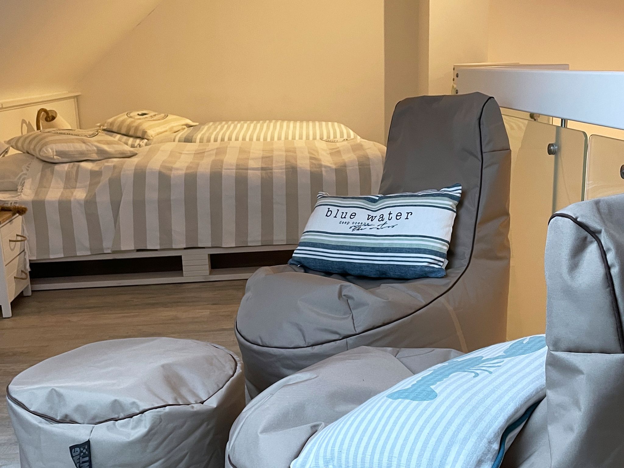 Offener Schlafbereich auf Empore: Doppelbett (2 Einzelbetten), Flachbildfernseher, 2 Sitzsäcke