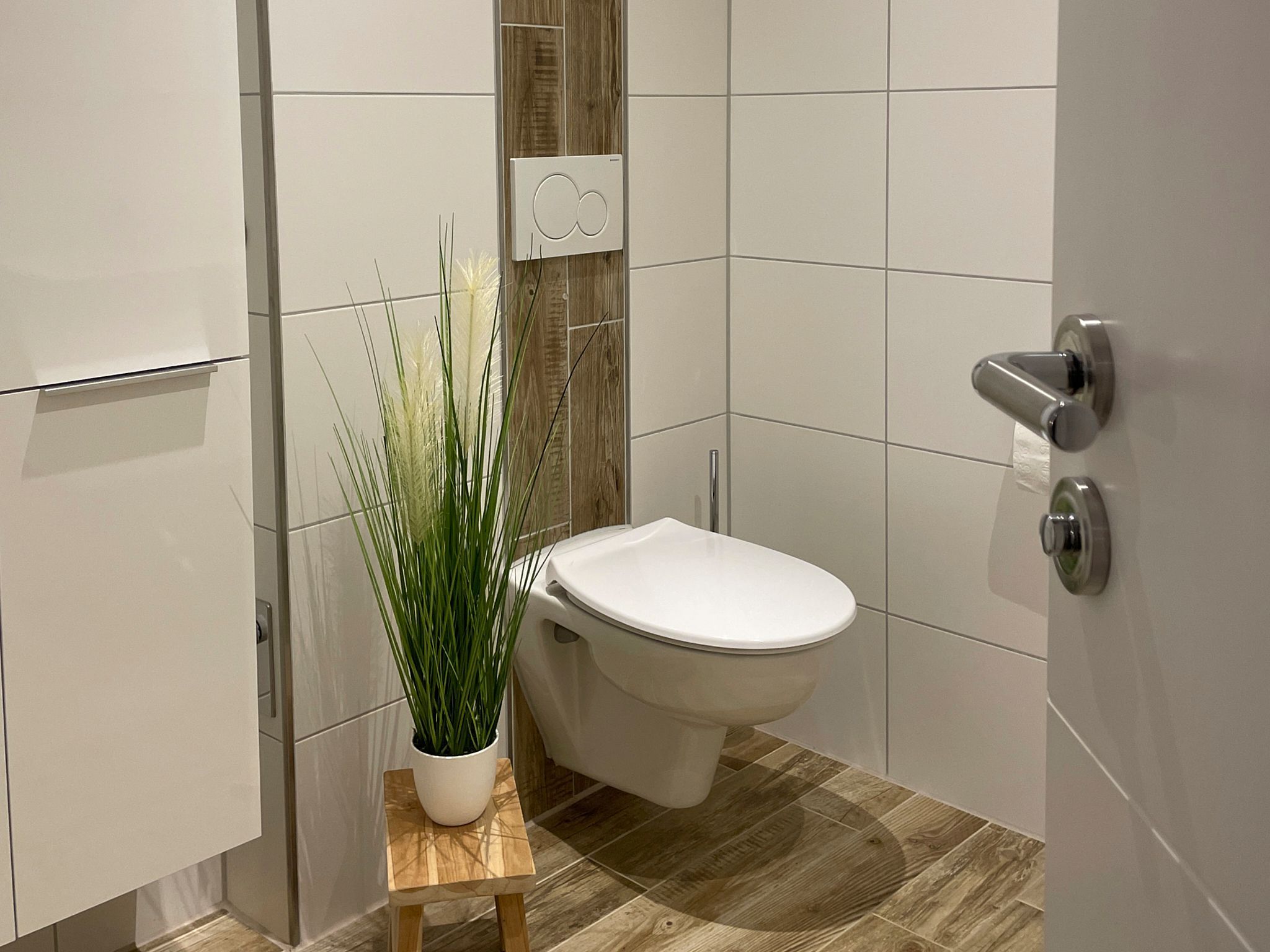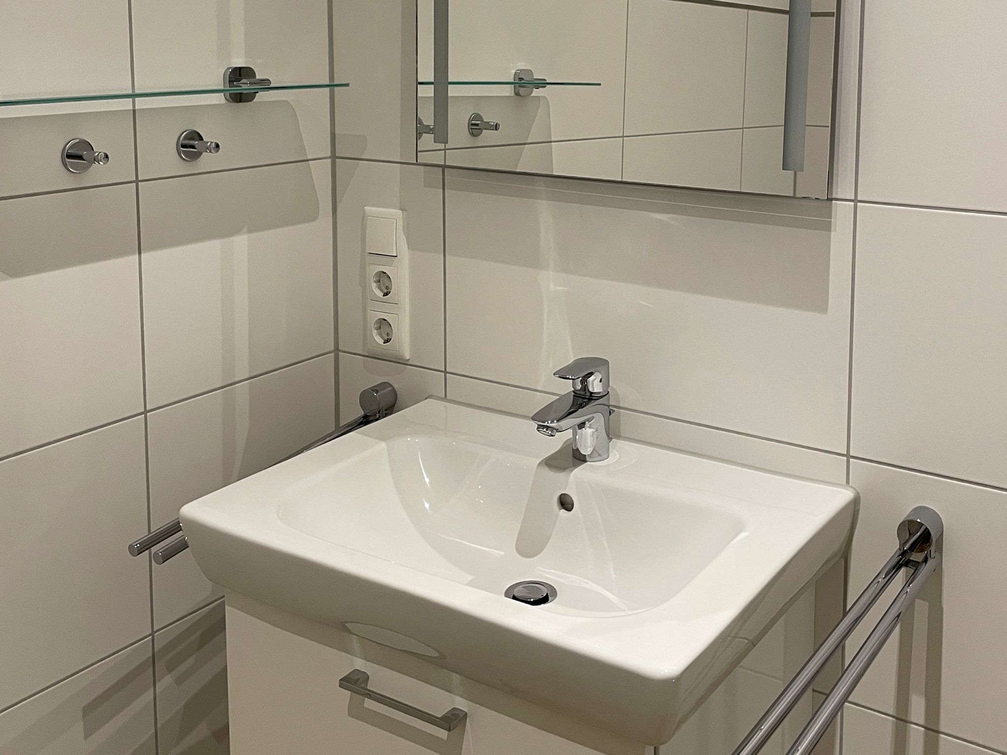 ein helles Bad mit bodentiefer Dusche und viel Platz für Ihre Utensilien