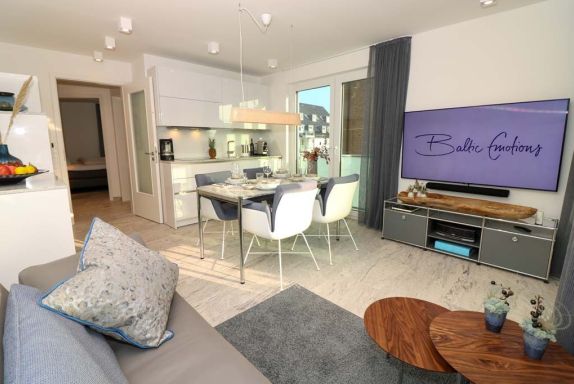 Eine stylische Design-Wohnung, auch perfekt für Ihren Familienurlaub, dank hochwertigem Kinderhochstuhl, Kindergeschirr und -besteck und Steckdosen mit integrierter Kindersicherung. Der sonnige und überdachte Südbalkon, Fußbodenheizung, Außenrollläden, Natursteinfliesen und Biowandfarbe in der gesamten Wohnung bringen echte „Baltic Emotions“. Freuen Sie sich auf Ihr persönliches Willkommensgeschenk, welches alle Ihre Sinne ansprechen wird. Dies alles lässt diese Wohnung auch bei schlechtem Wetter zu einer Ganzjahres-Destination werden. Ihre Fahrräder finden entweder im gemeinschaftlichen Fahrradkeller oder in Ihrem abgeschlossenen Kellerraum Platz.