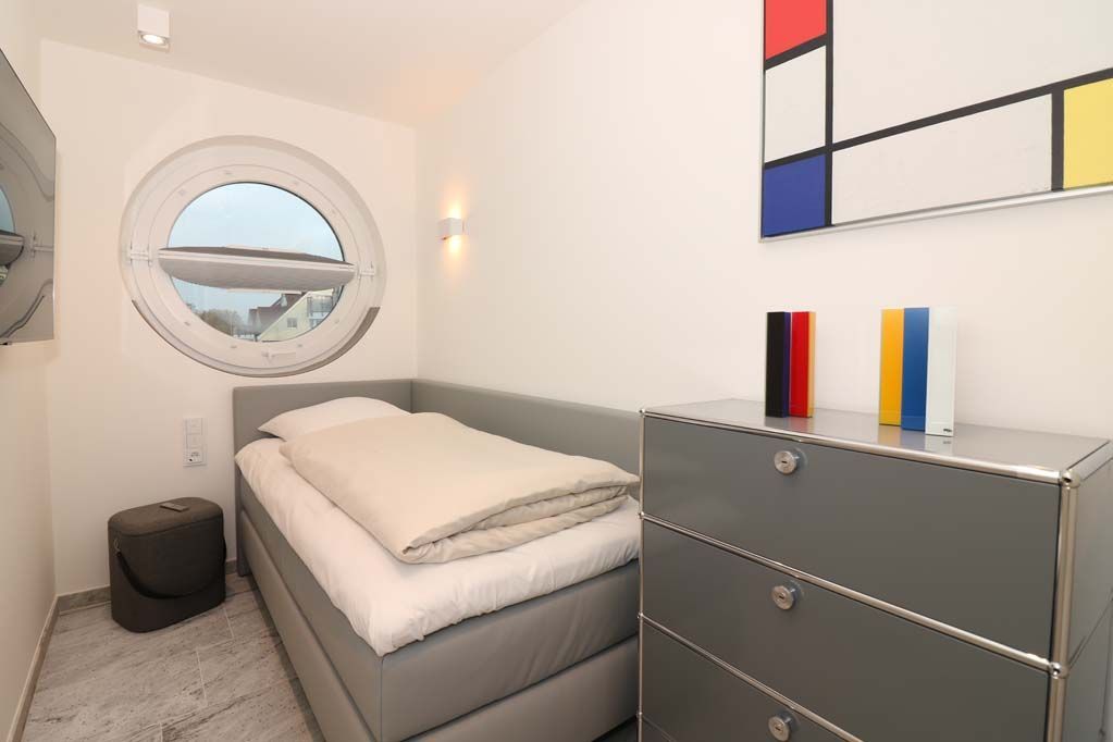 Kinderzimmer: Auch hier erwartet Sie ein hochwertiges Boxspringbett (0,90 x 2,00m) für Ihren erholsamen Schlaf. Ein USM-Schubladenschrank bietet hier zusätzlichen Platz. Zum Lesen oder Spielen liegen diverse Bücher und Spiele bereit. Für bestes Entertainment finden Sie hier einen 49-Samsung-Smart-TV mit LAN-Anschluss.