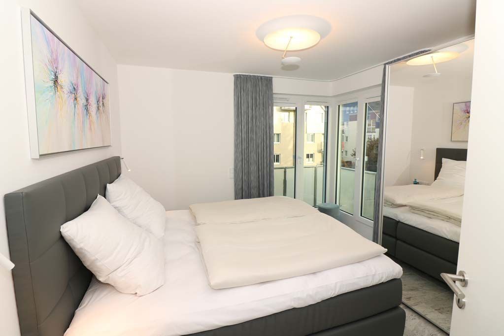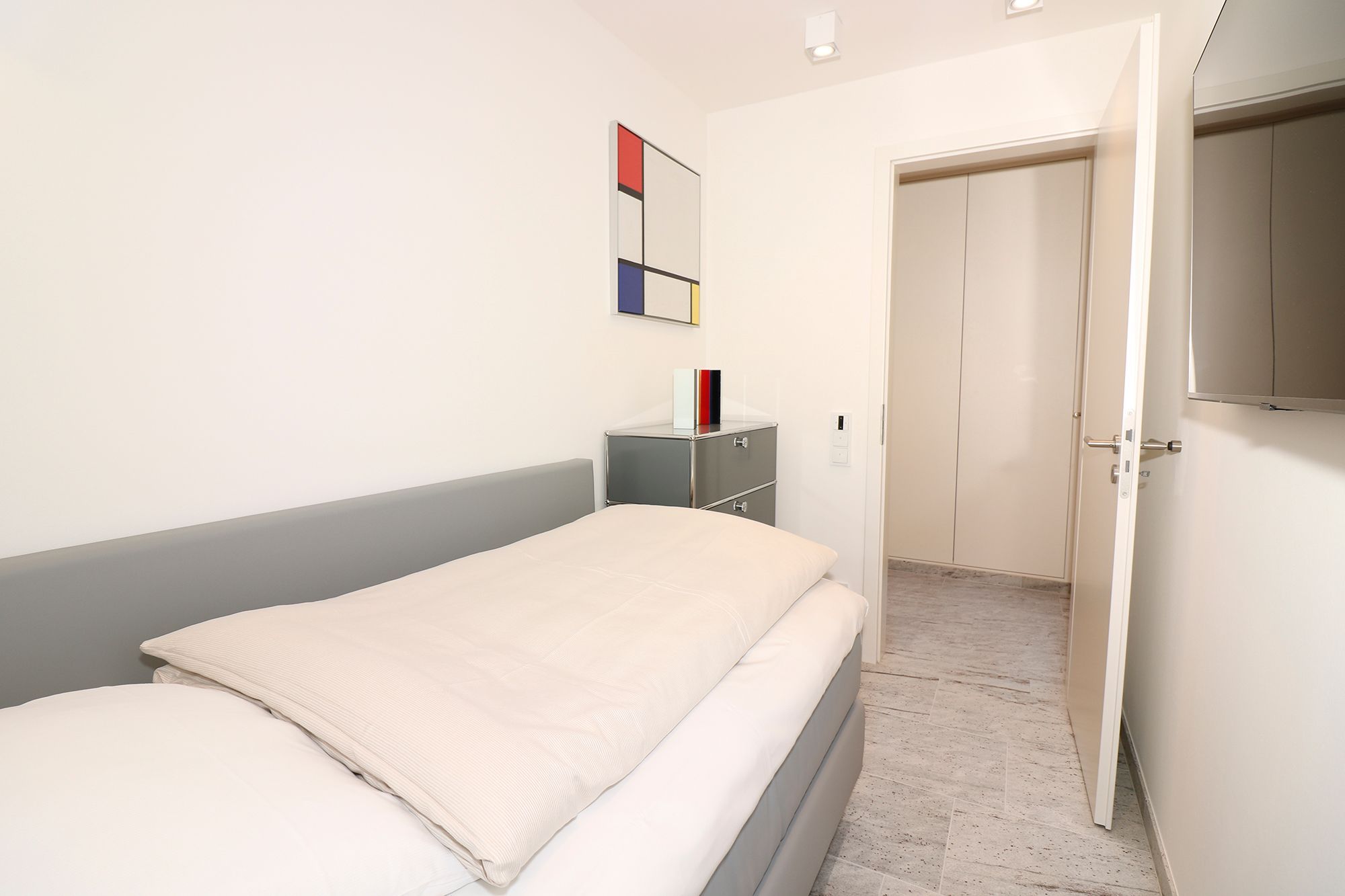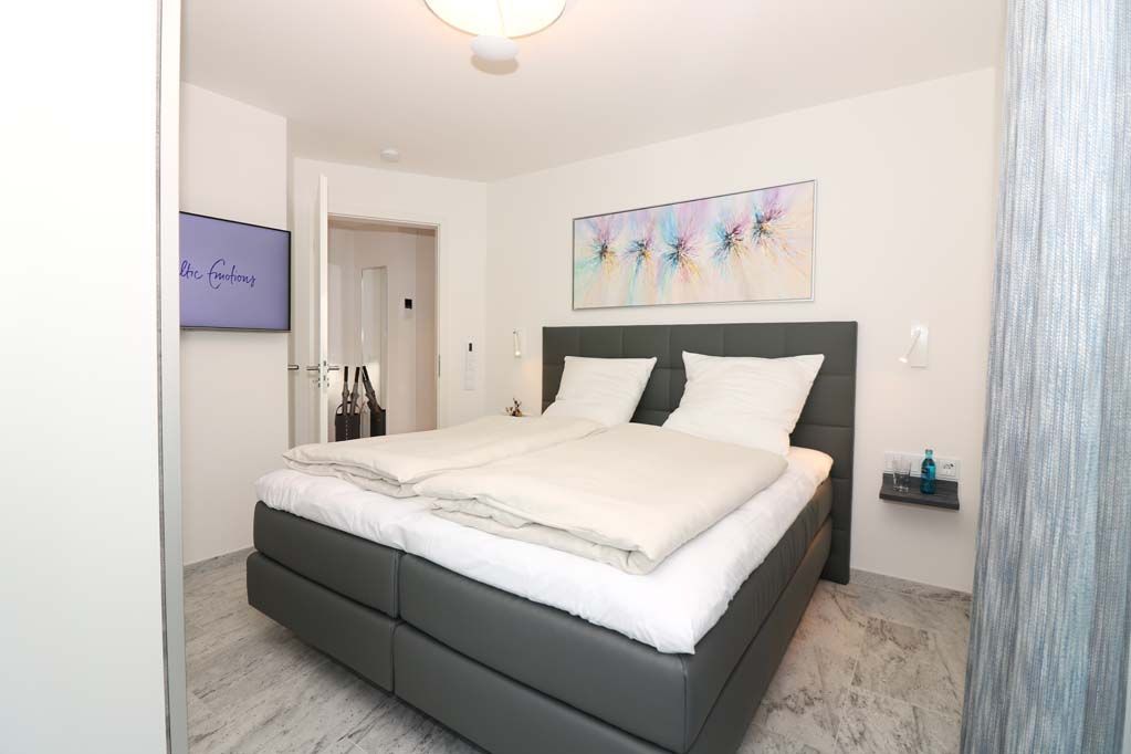 Schlafzimmer: Genießen Sie direkt nach dem Aufwachen einen wunderschönen Blick auf die Ostsee. Für Ihren erholsamen Schlaf erwartet Sie hier ein hochwertiges Boxspringbett (1,80 x 2,00m). Ihre Kleidung findet in dem beleuchteten Schiebetüren-Kleiderschrank mit Spiegel ausreichend Platz. Selbstverständlich steht Ihnen auch im Schlafzimmer ein Samsung 43?-Smart-TV mit LAN-Anschluss und ein WLAN-Radio zur Verfügung.