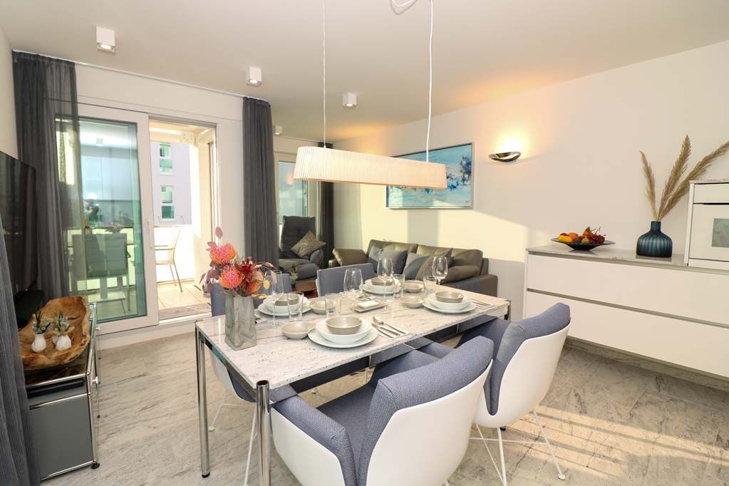 Helle und freundliche 3-Zimmer-Ferienwohnung, ca. 54 m² im 1. OG. Fahrstuhl, überdachter Süd-Balkon, exklusive Designer-Möbel, Wellnessbad mit Regendusche, inkl. Saison-Strandkorb (15.05. 15.09.) und kostenlosem Highspeed-WLAN, großzügiger Tiefgaragen-Stellplatz (TG-Einfahrt Höhe 2,00 m), mit einer E-Ladestation für Ihr Elektroauto, gegen Gebühr