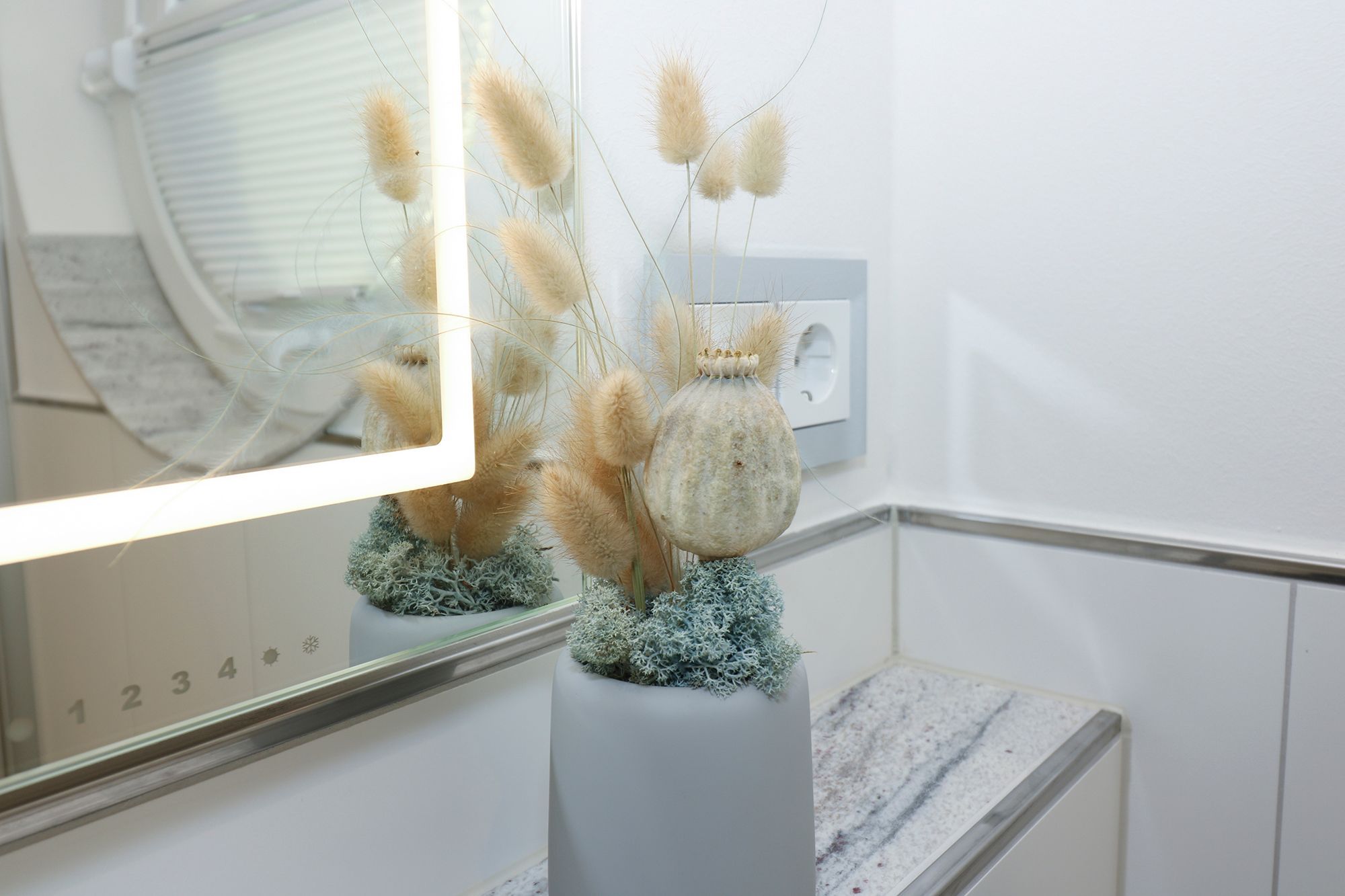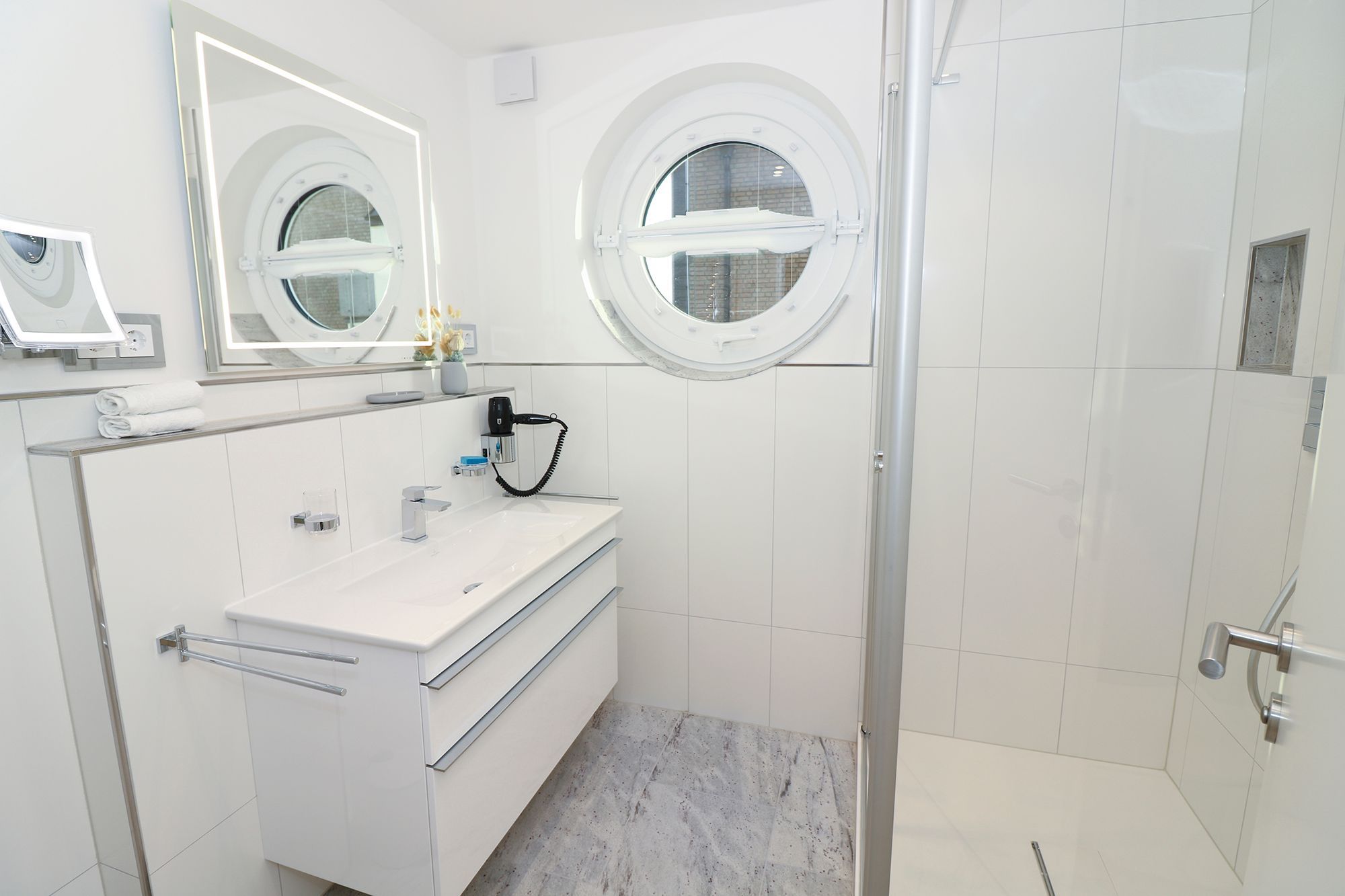 Wellnessbad: In Ihrem mit viel Liebe von Villeroy & Boch gestalteten Wohlfühlbad mit Bullaugen-Fenster lädt Sie eine Regendusche zum Erfrischen ein. Ein großer Waschtisch mit Unterschrank, WLAN-Radio, Handtuchheizkörper; beleuchteter Kosmetikspiegel und Haartrockner runden das Wohlfühlpaket ab. Waschmaschine und Trockner stehen Ihnen im Gemeinschaftskeller zur Verfügung und sind über einen Münzzähler zu bedienen.