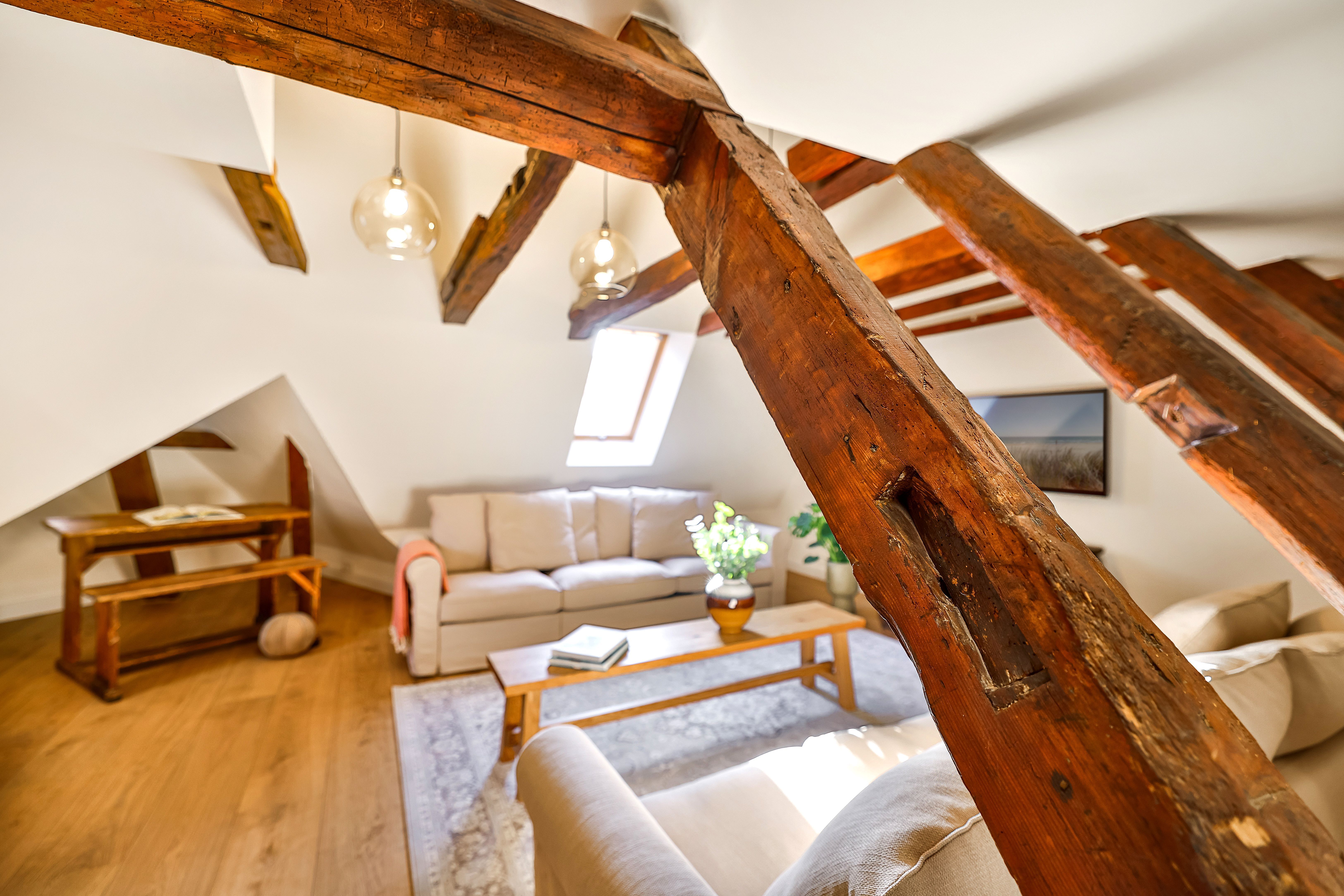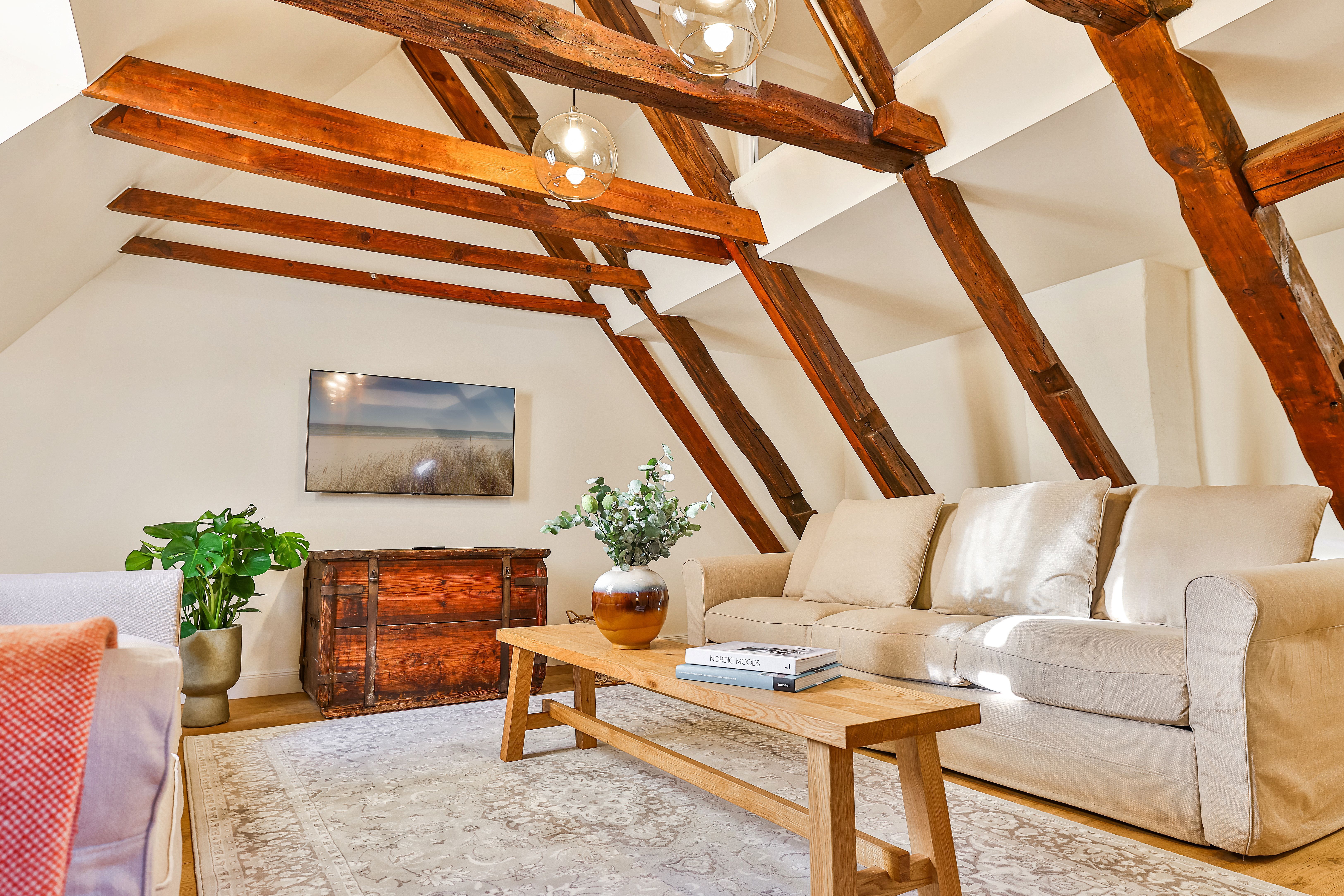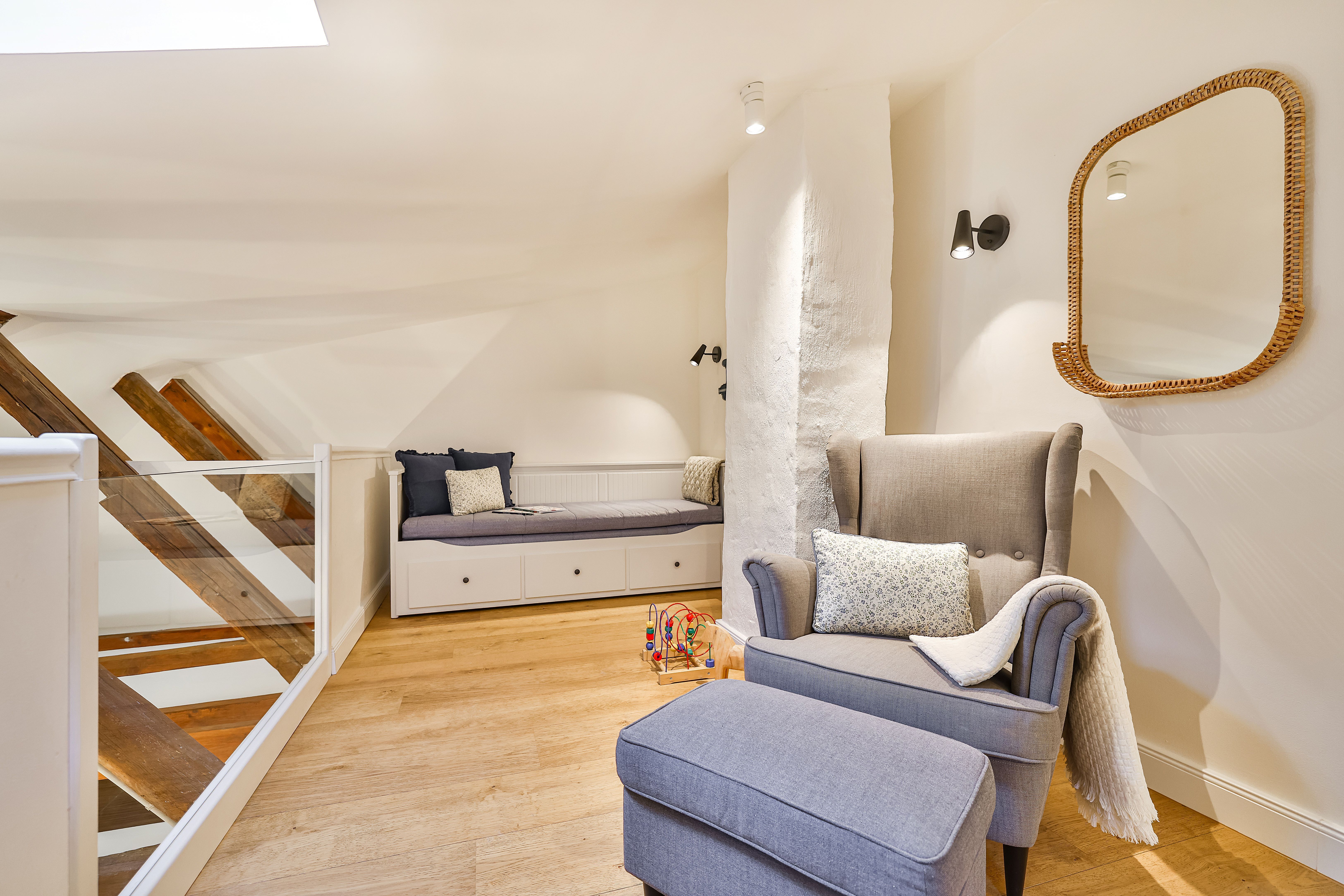 Im 2. OG gibt es das große Wohnzimmer mit 1 Schlafsofas und eine Galerie mit einem weiteren Doppelbett und das kleine Bad.