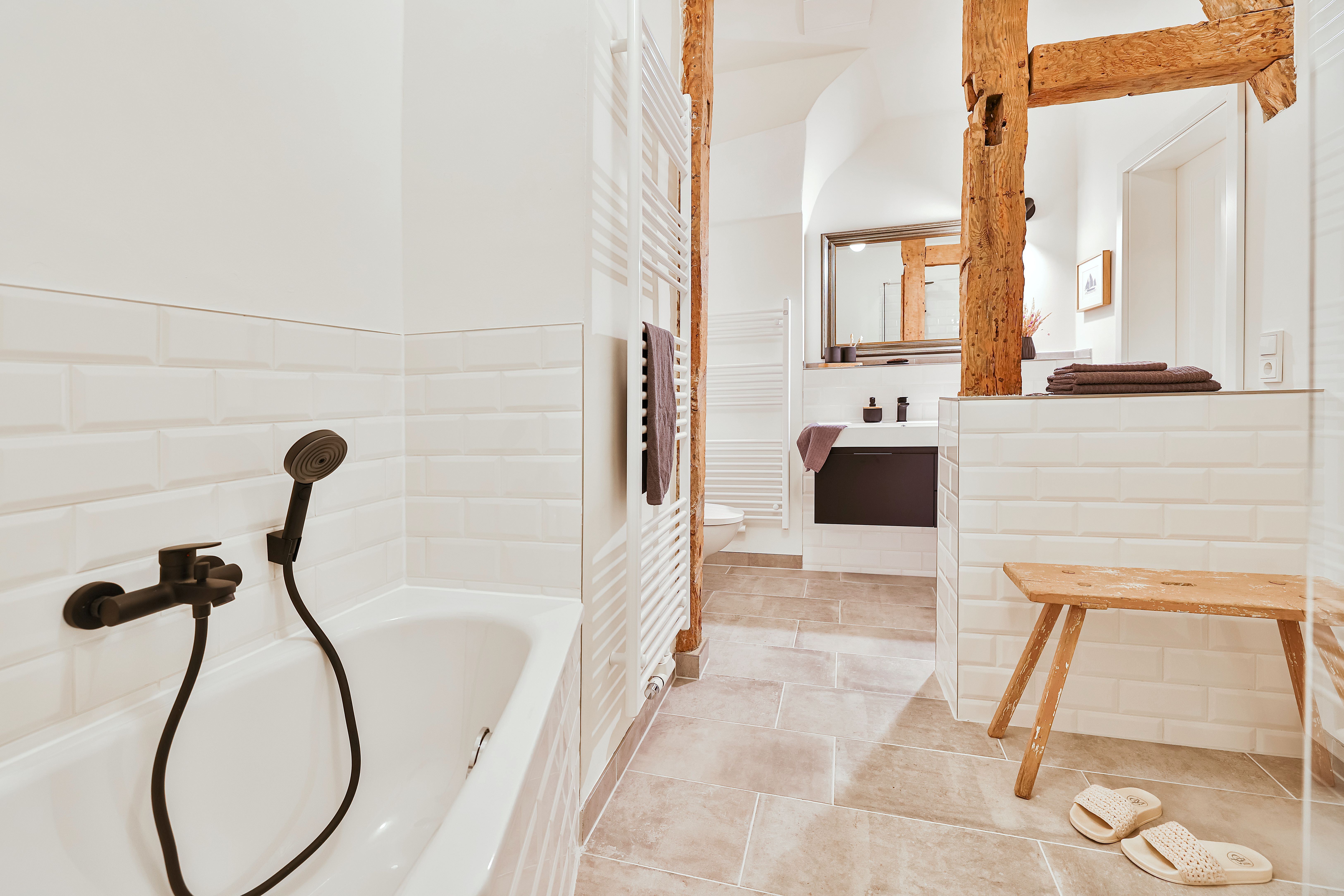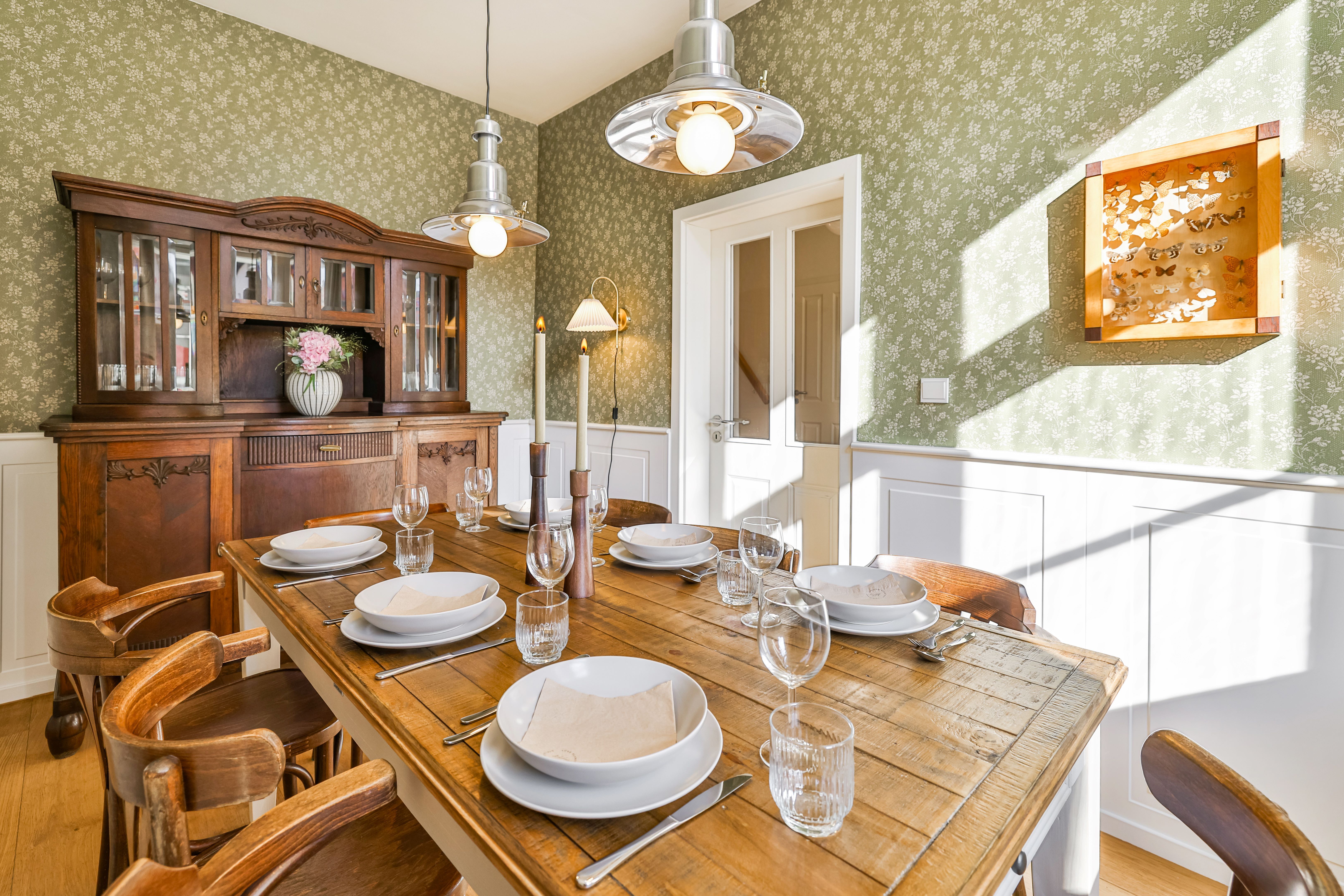 Im EG gibt es eine separate Küche, ein separates Esszimmer und das große Bad mit Dusche und Badewanne.
