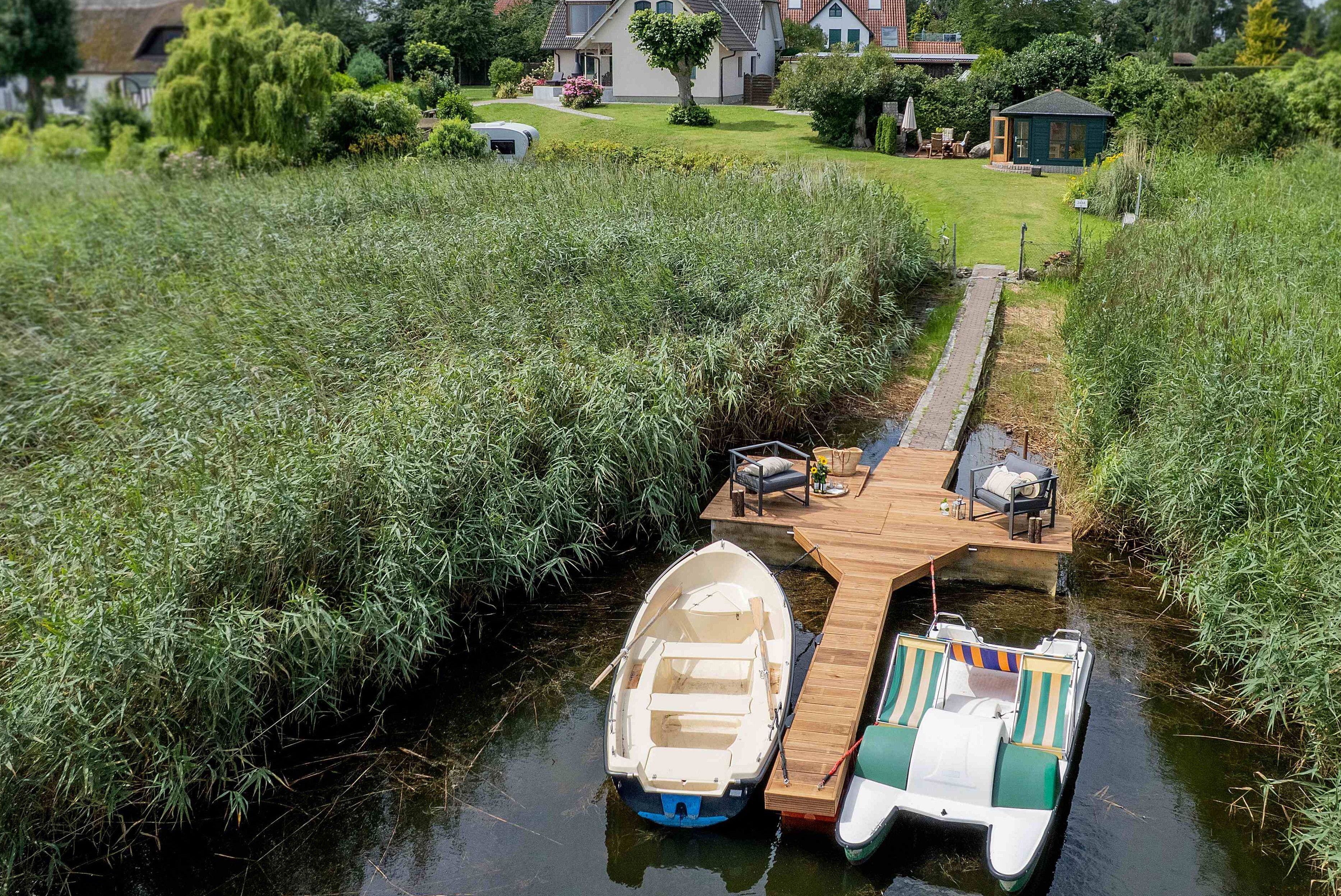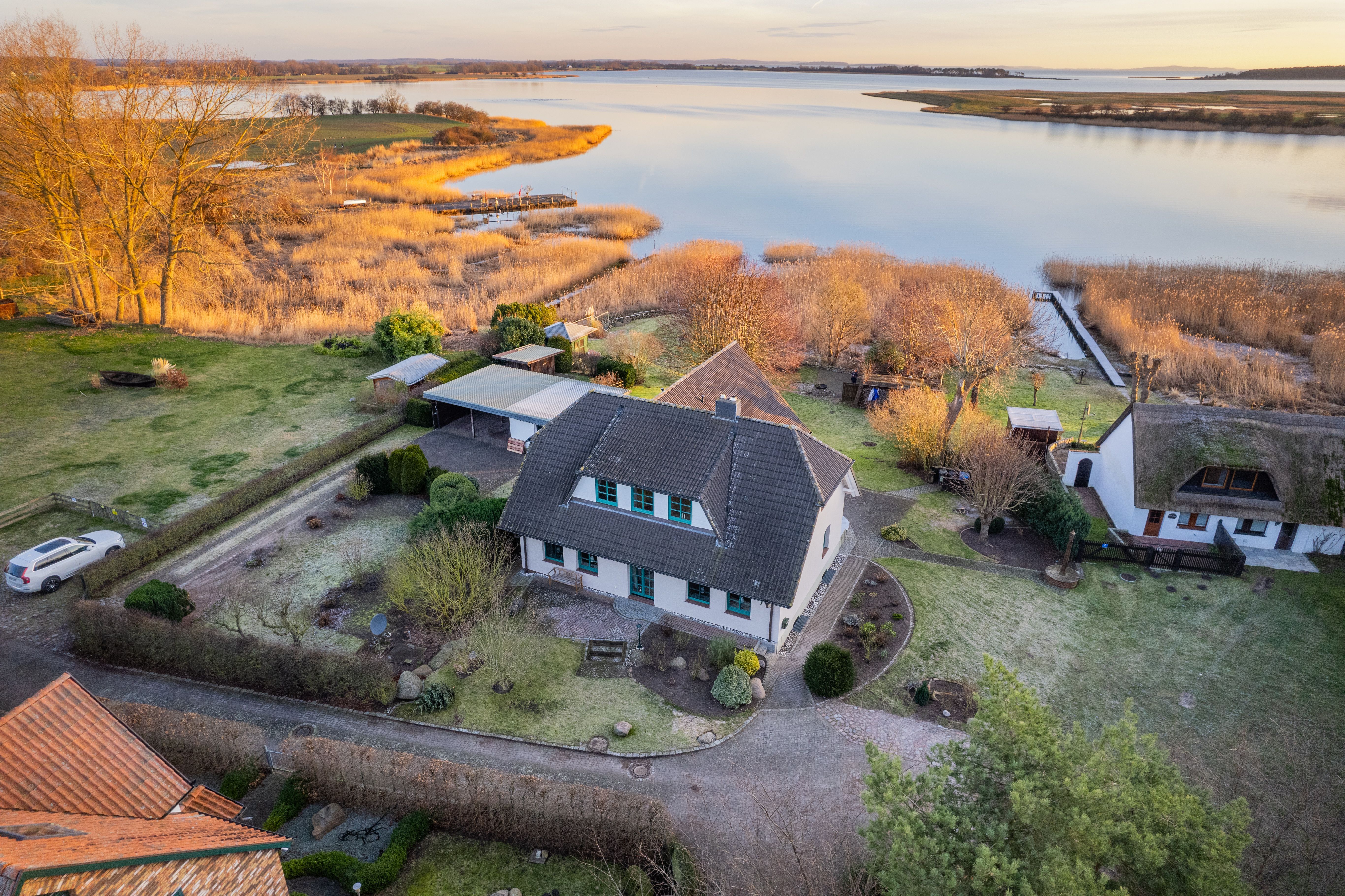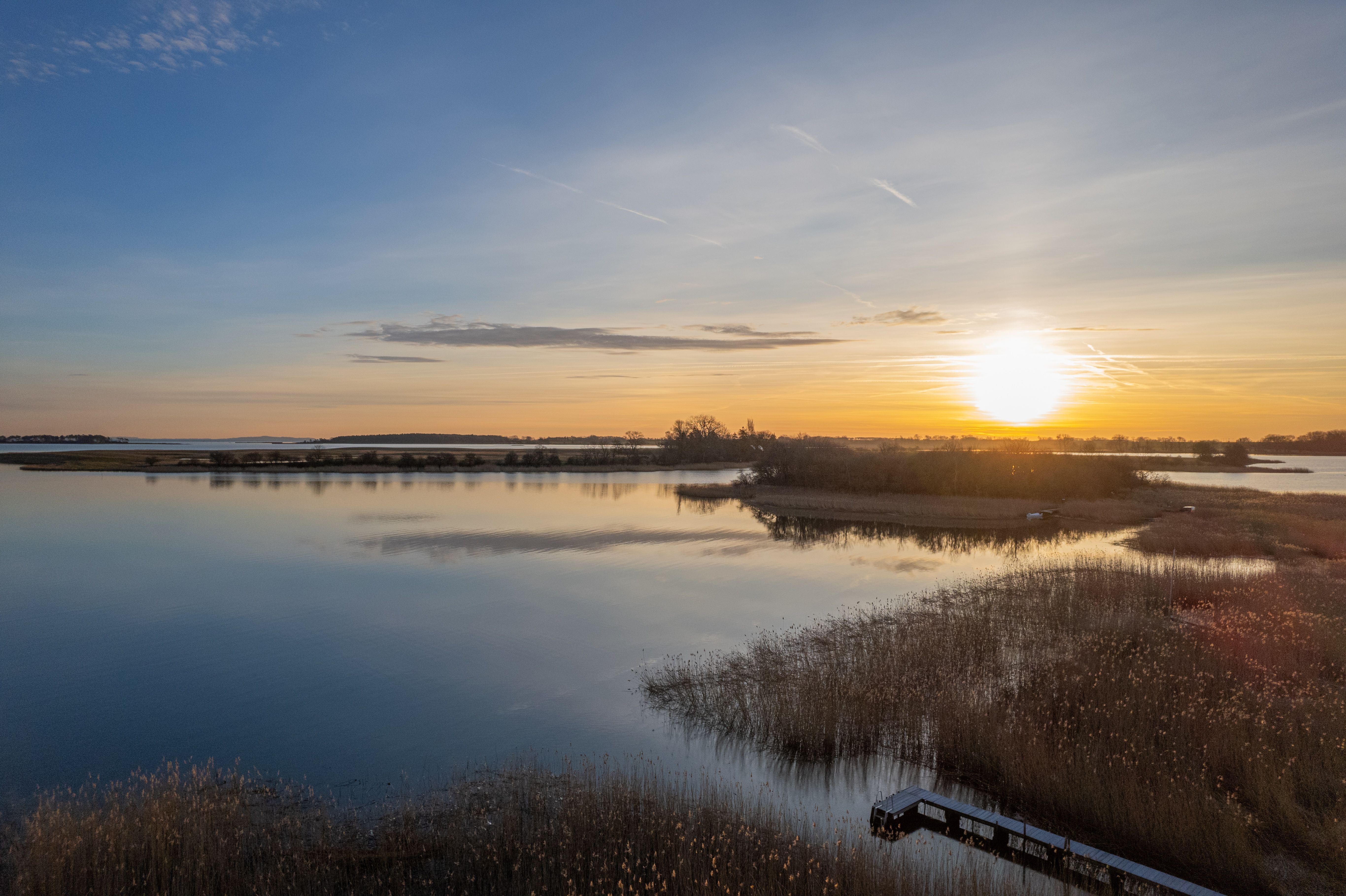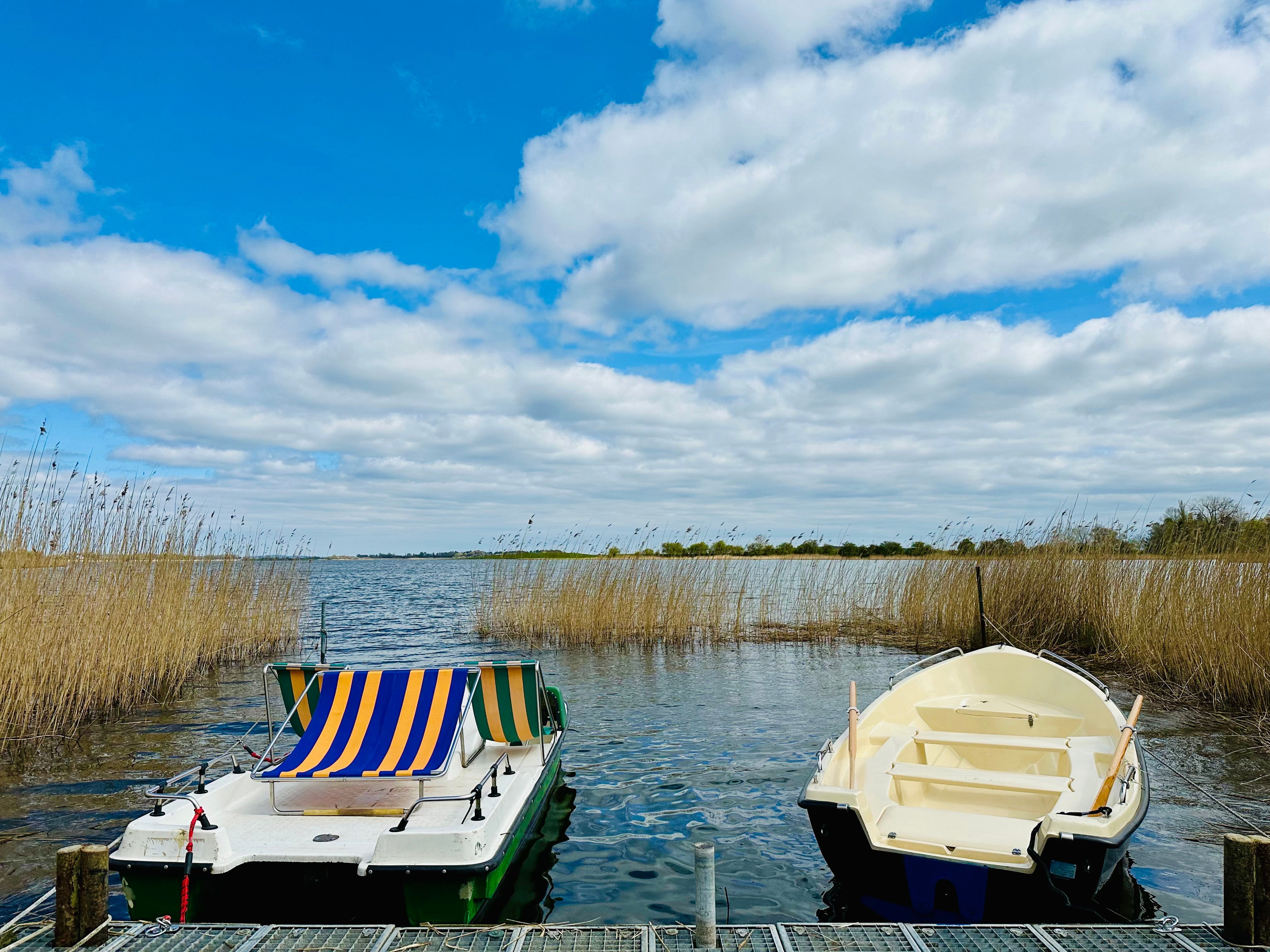 Genießt den atemberaubenden Ausblick auf die Boddenlandschaft von einer der Terrassen, springt vom eigenen Steg ins Wasser, stecht mit dem Tretboot in See oder entspannt am Kamin oder an einer der Feuerstellen.