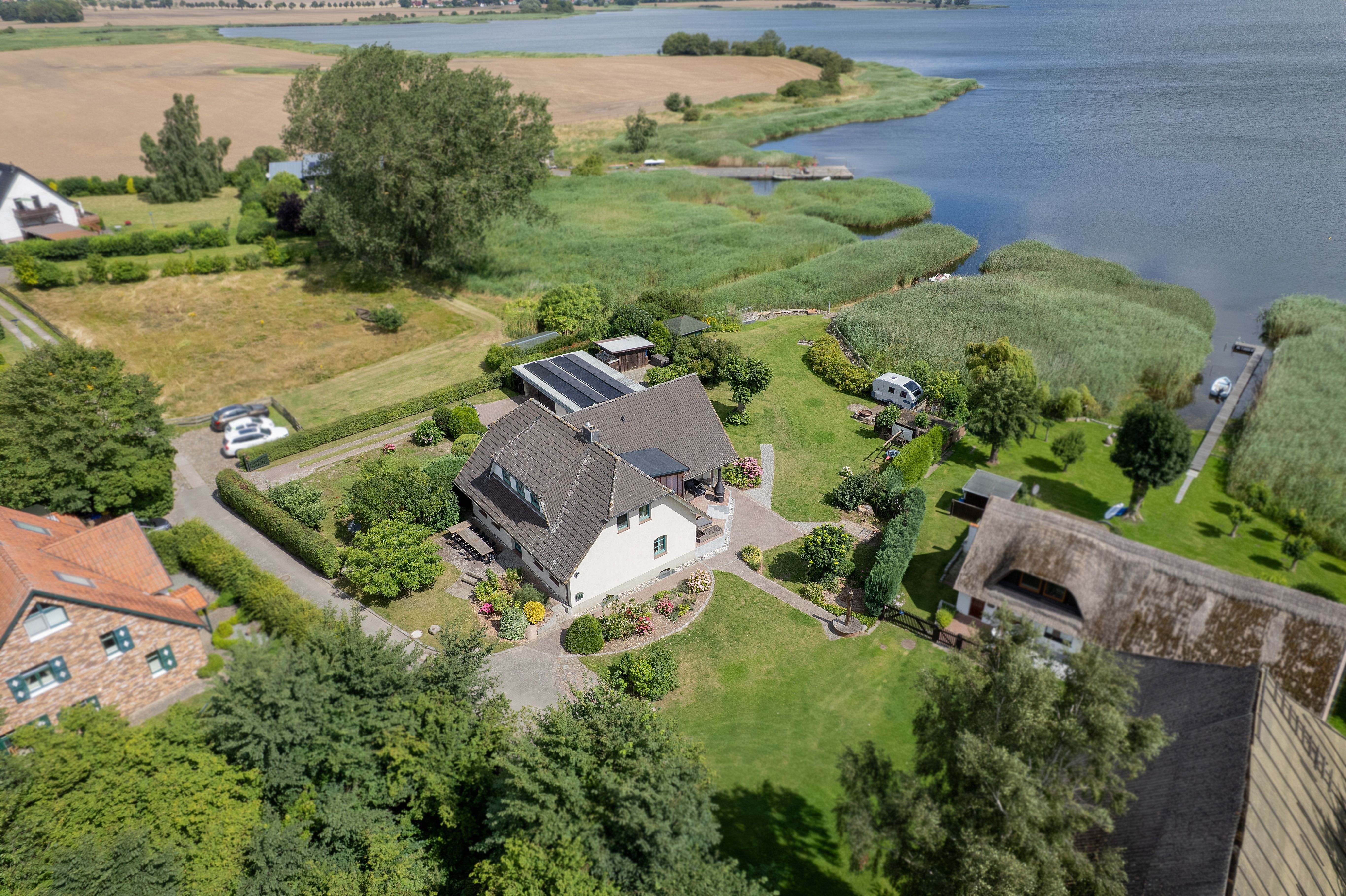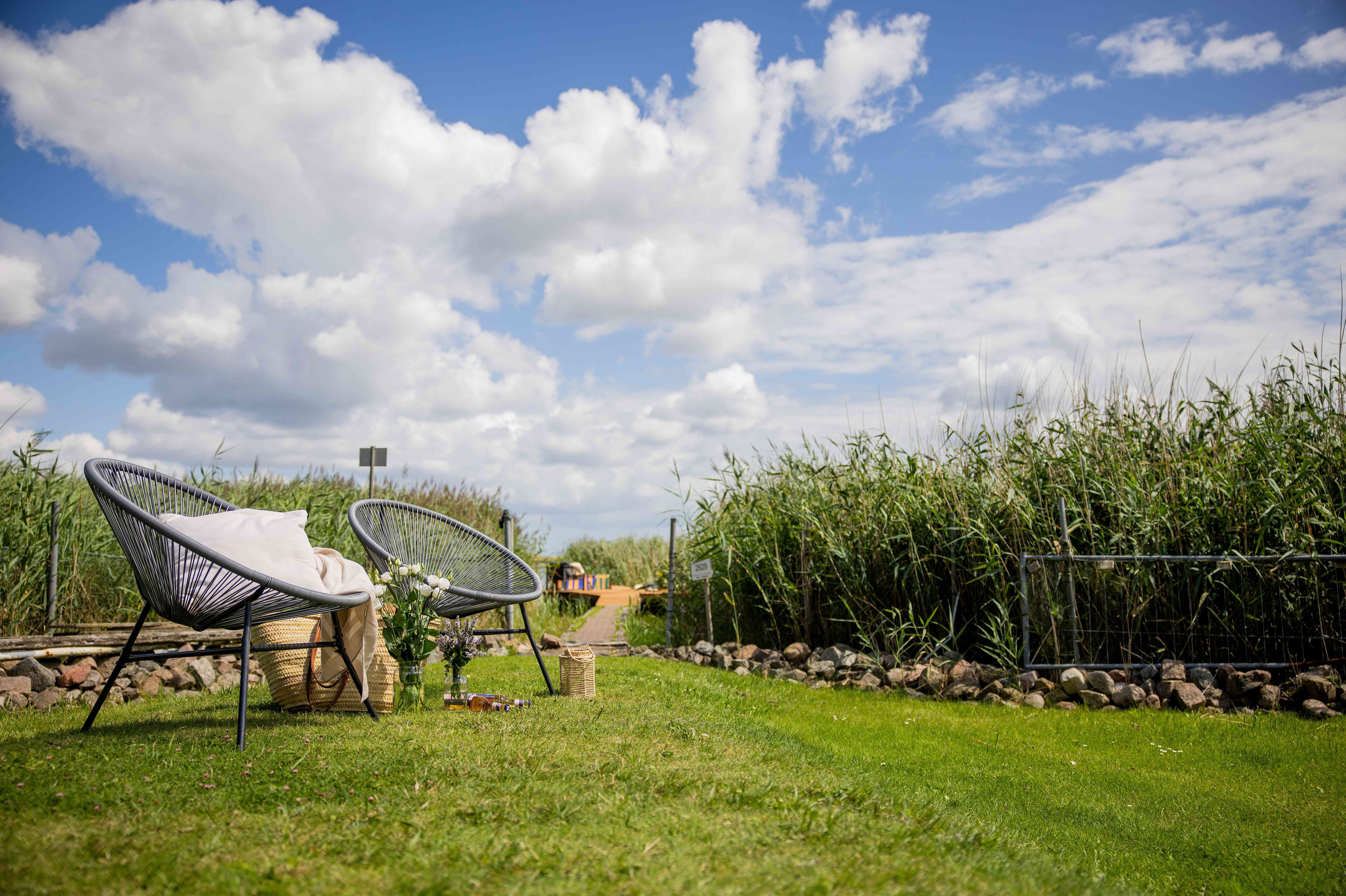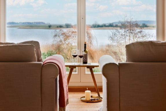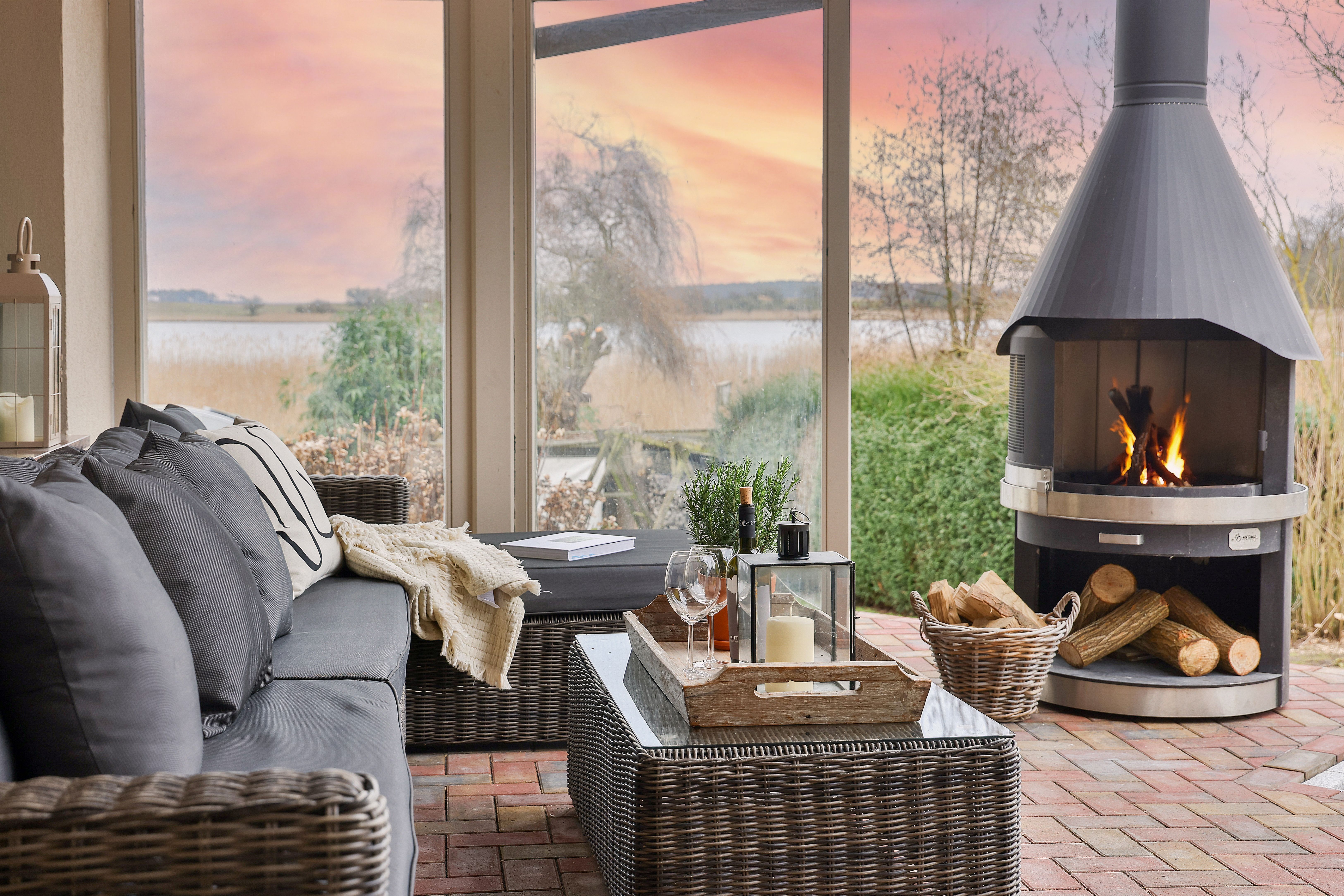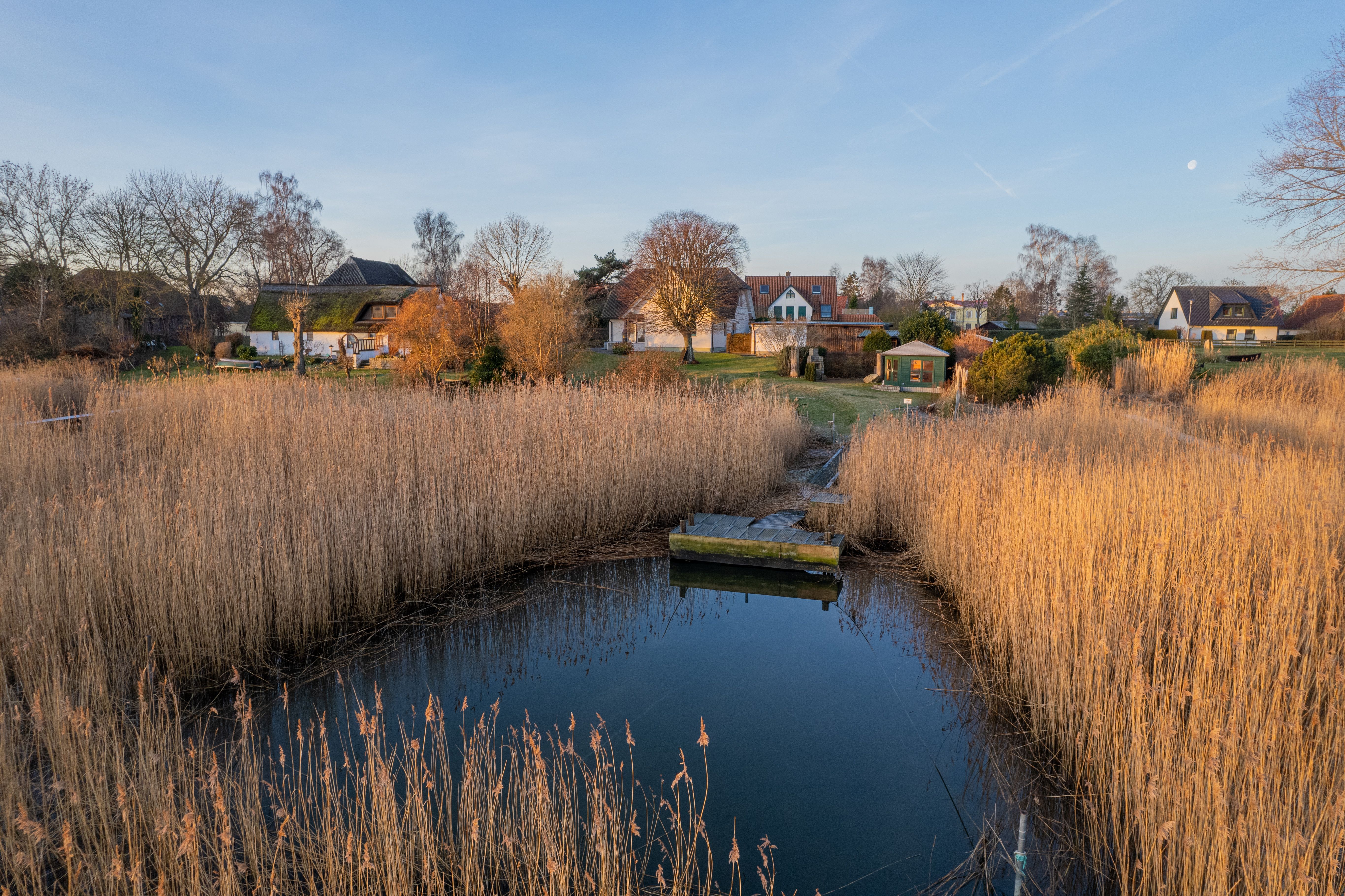 Genießt den atemberaubenden Ausblick auf die Boddenlandschaft von einer der Terrassen, springt vom eigenen Steg ins Wasser, stecht mit dem Tretboot in See oder entspannt am Kamin oder an einer der Feuerstellen.