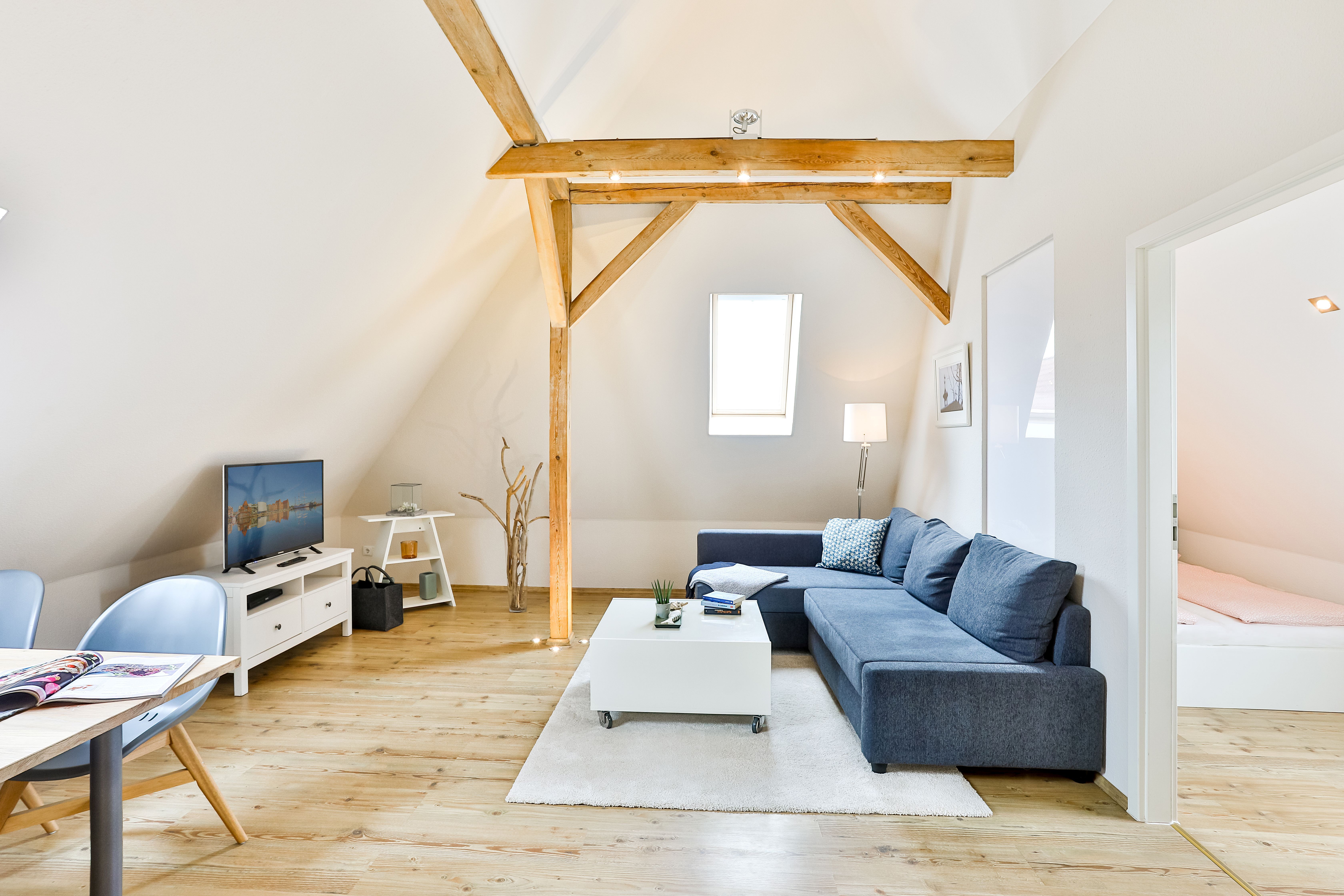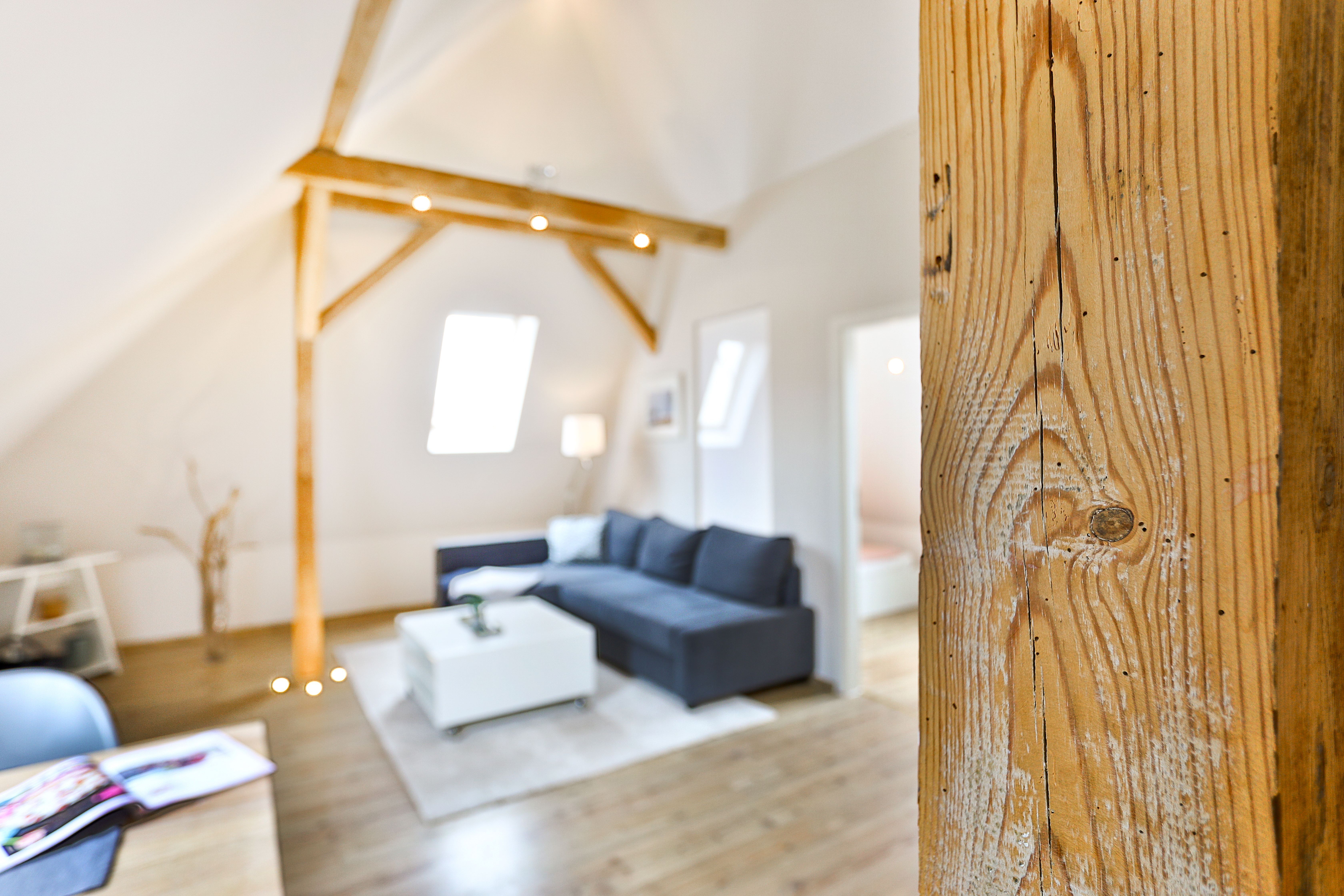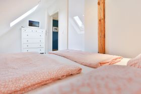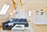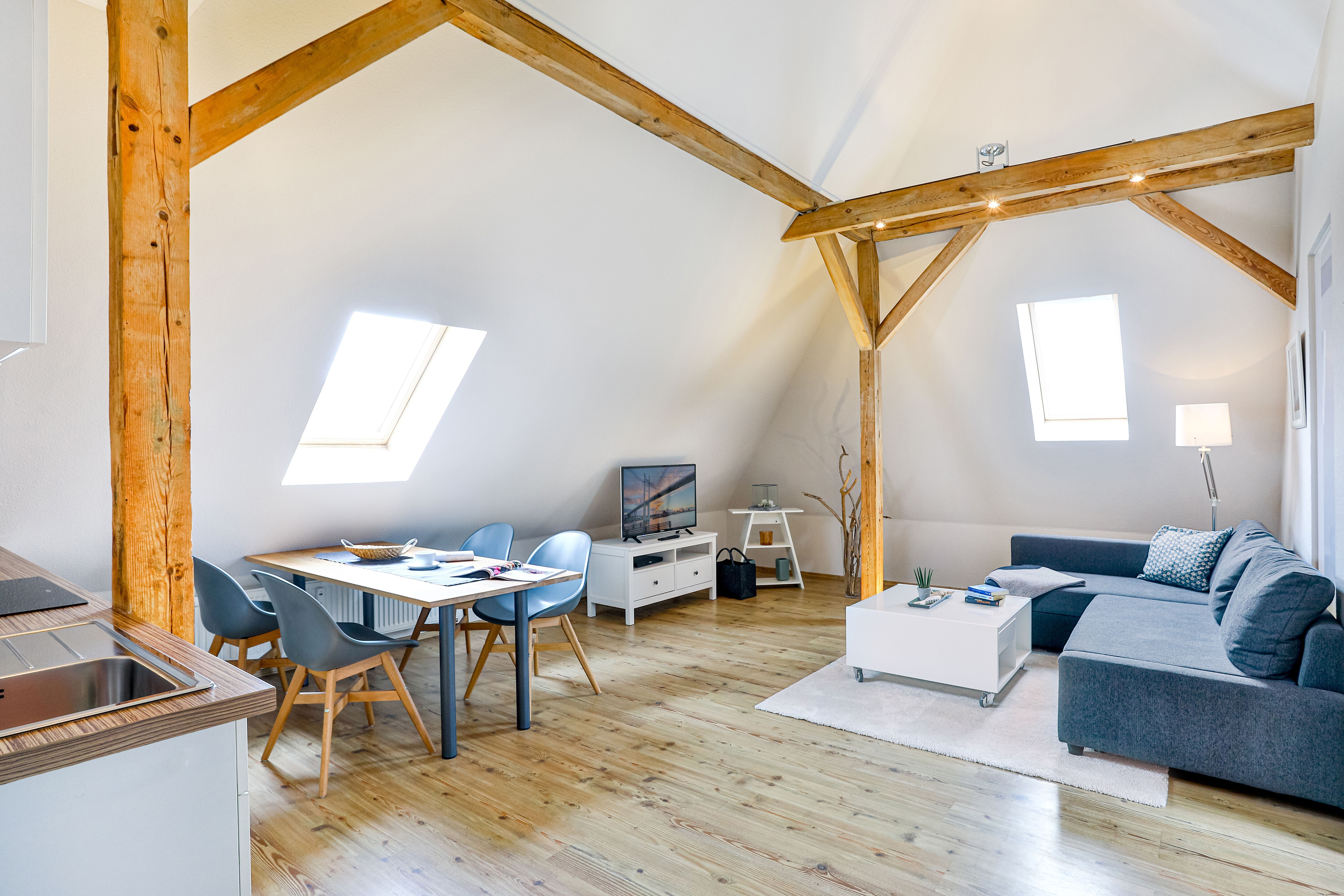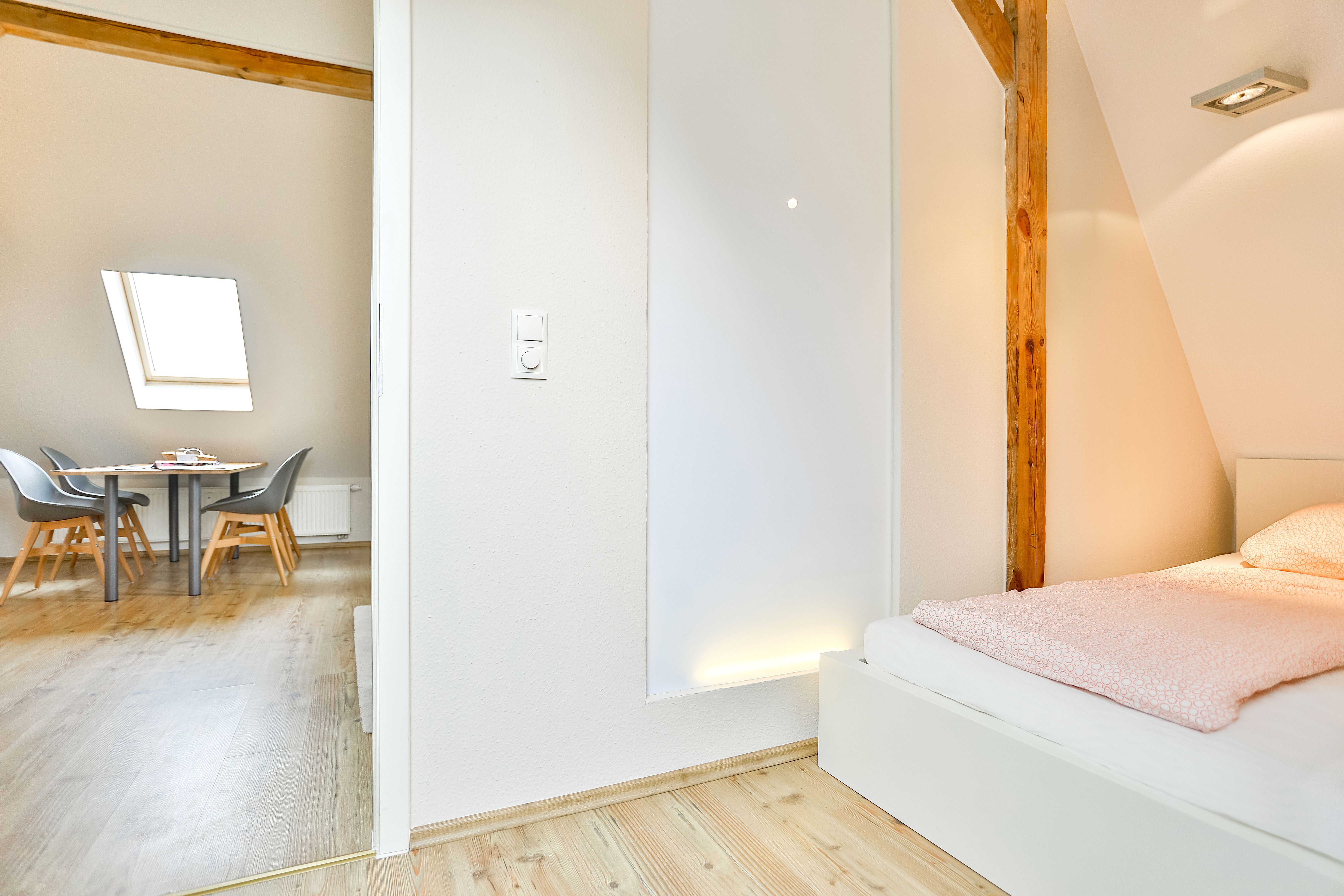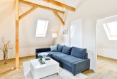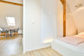 Die Wohnung liegt im Dachgeschoß eines komplett sanierten Hauses und besteht aus einem großen Wohnbereich mit offener Küche und Essbereich, einem Schlafraum mit Doppelbett und einem Bad/Dusche mit Fußbodenheizung.
