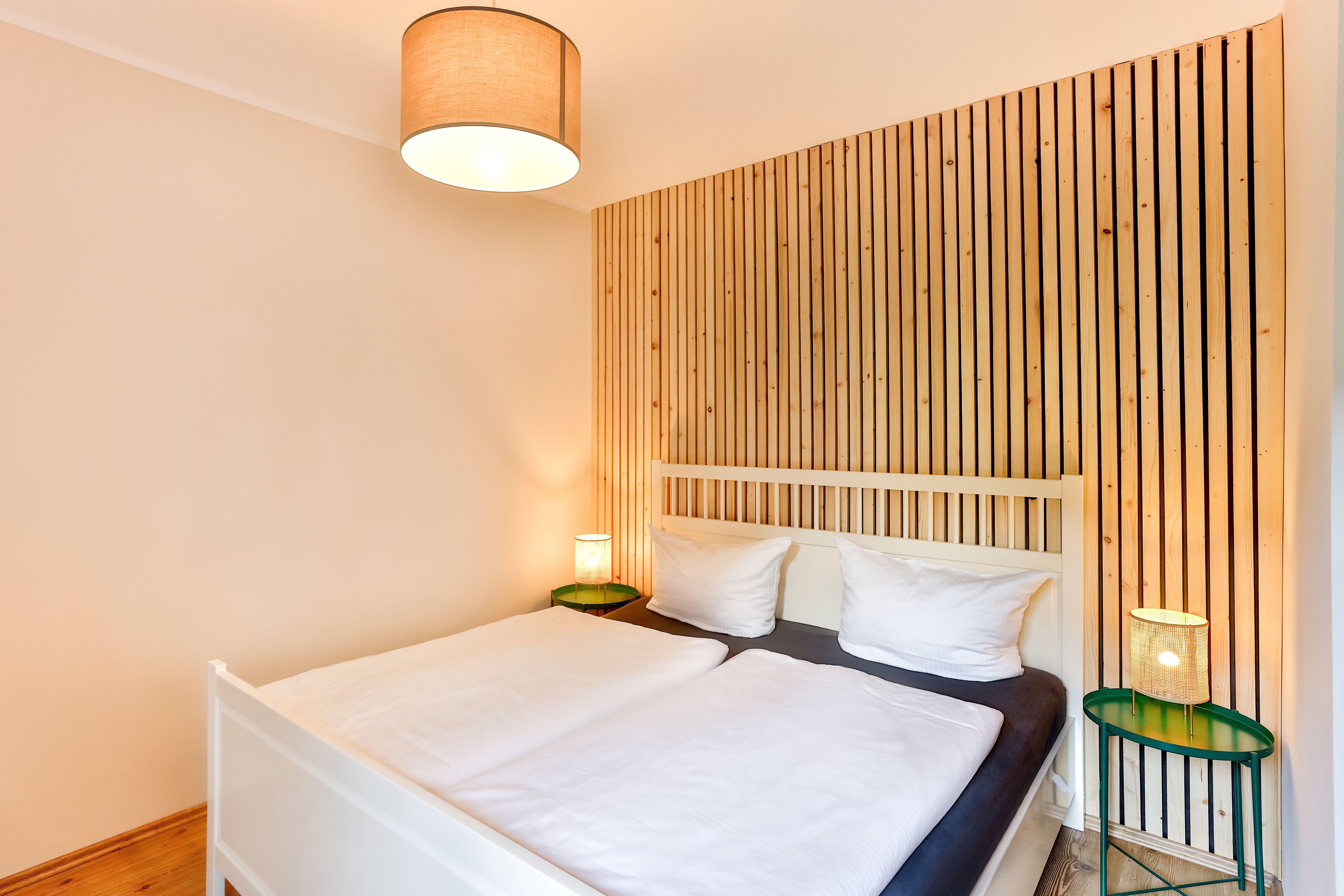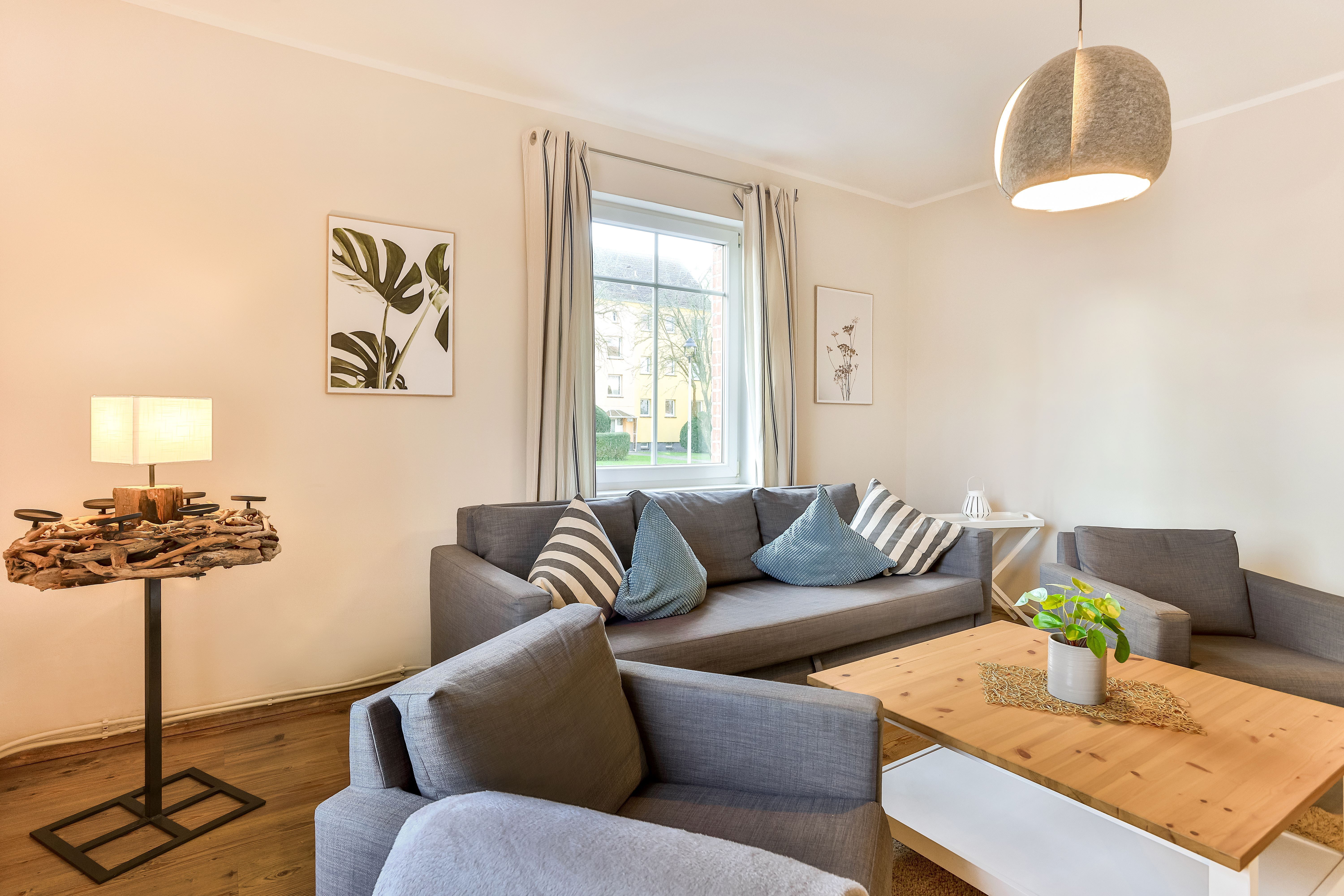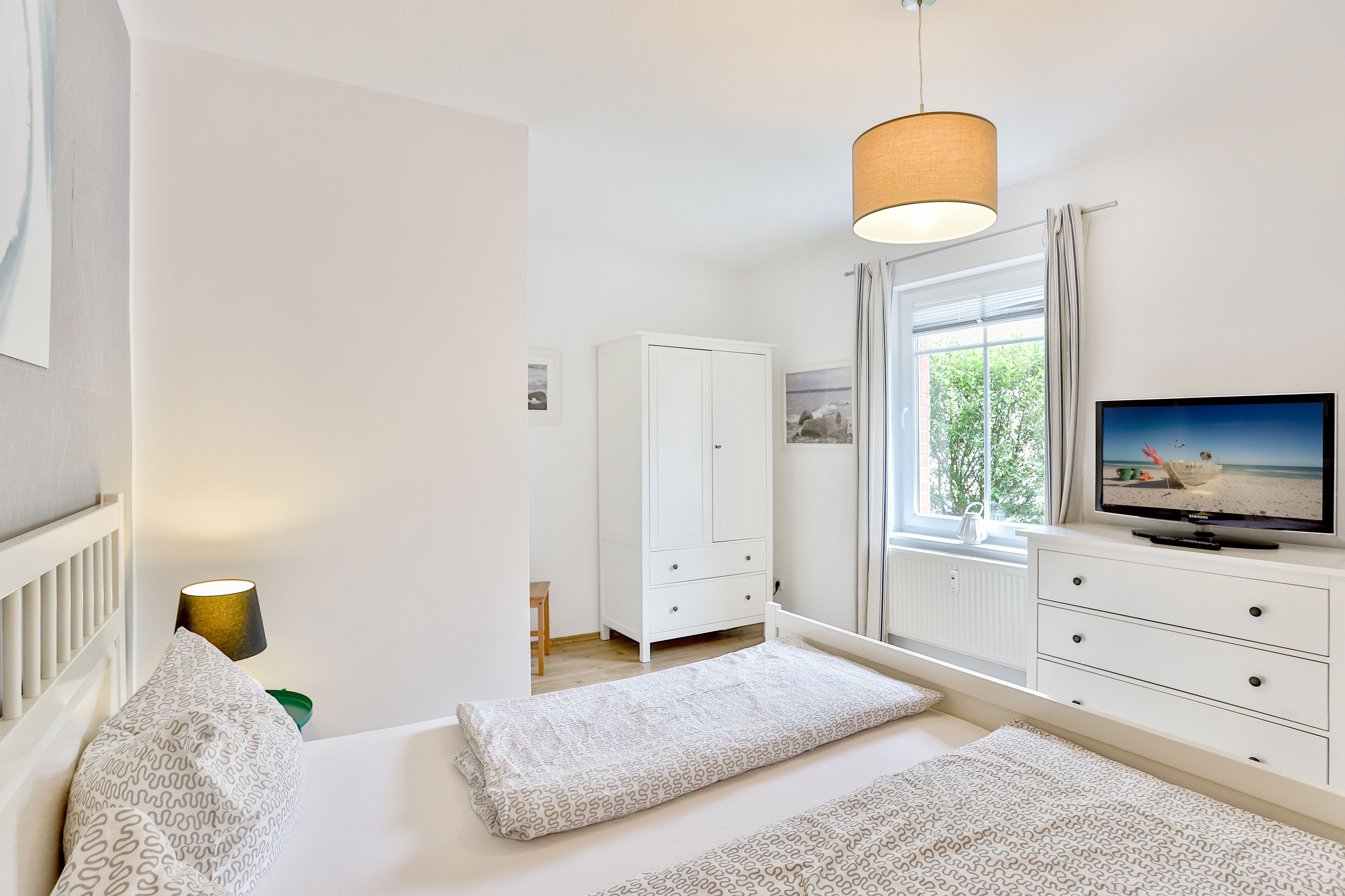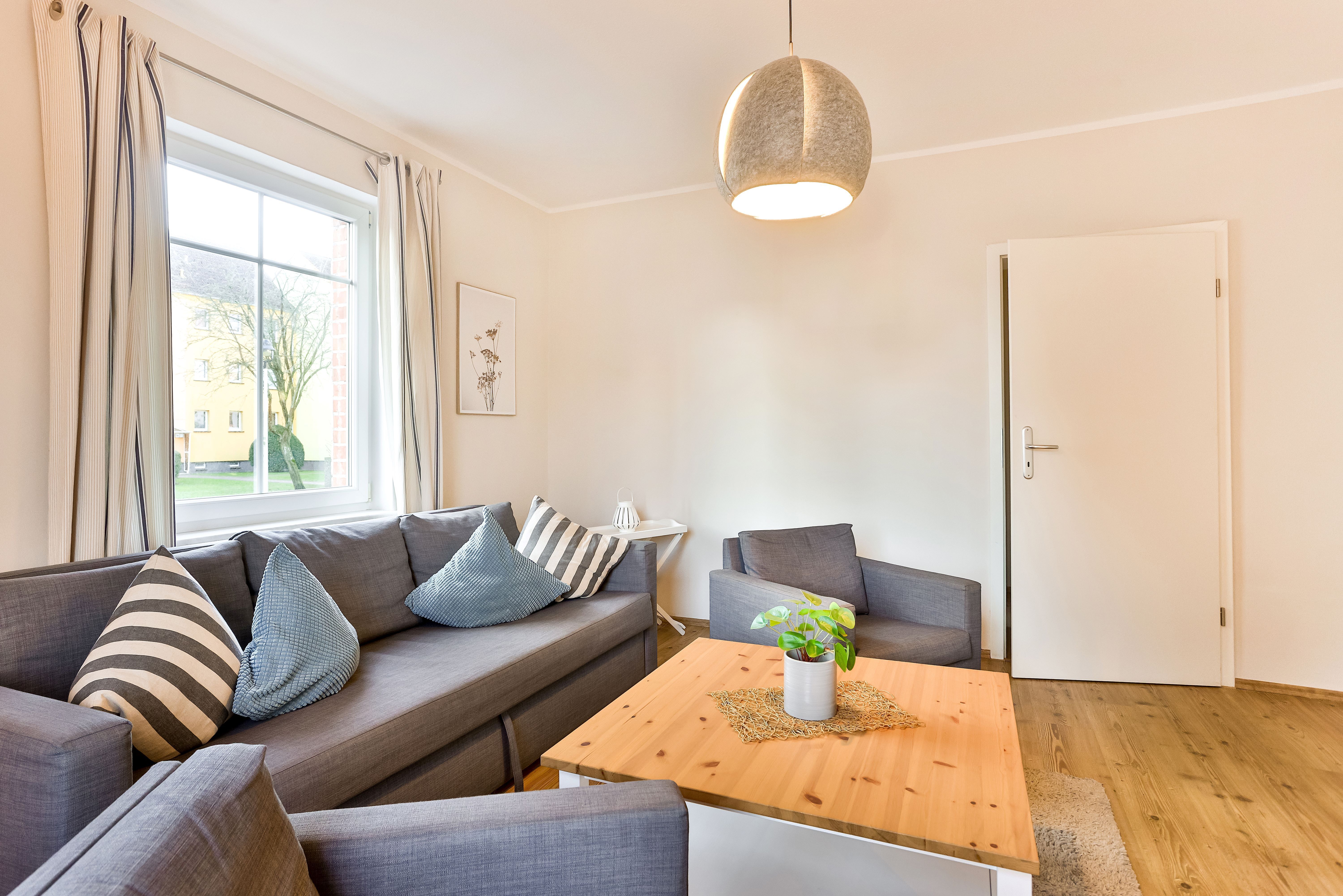 Die Wohnung liegt im Erdgeschoß (Hochparterre) und verfügt über 2 getrennte Schlafzimmer mit jeweils 1 Doppelbett. Im Wohnzimmer befindet sich eine Schlafcouch für maximal 2 Personen. Bei Bedarf können auch 2 Babyreisebetten zur Verfügung gestellt werden.