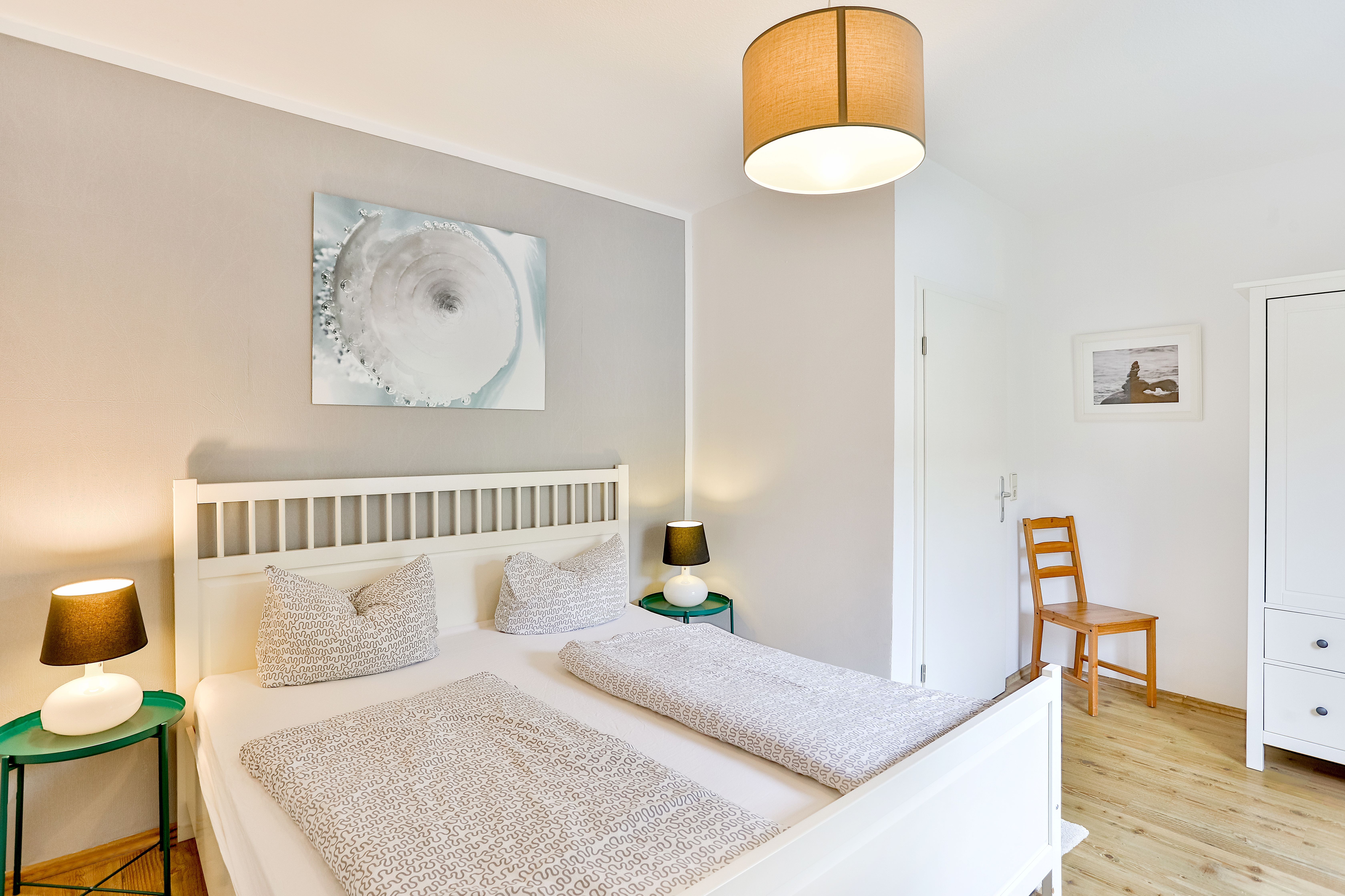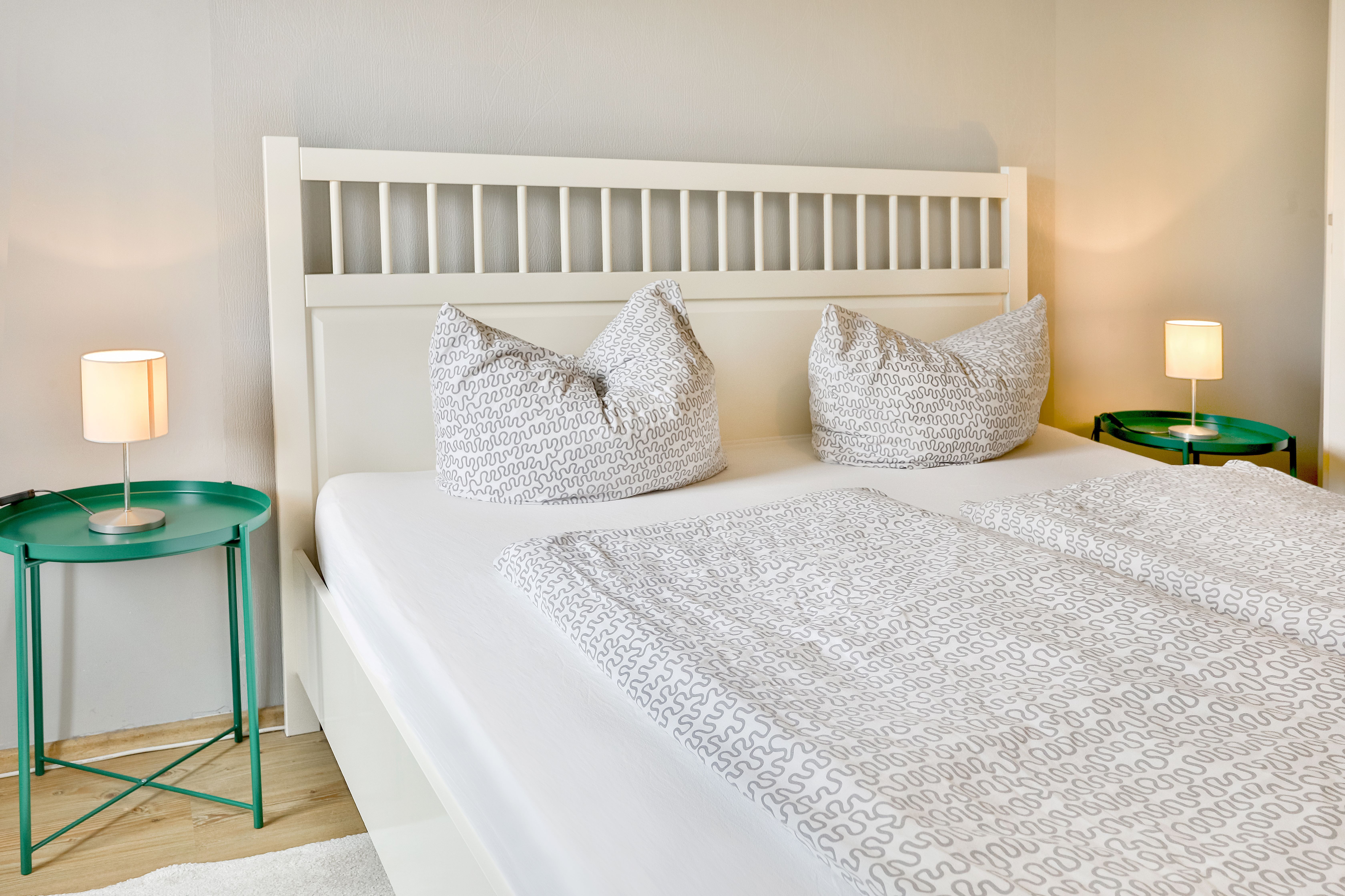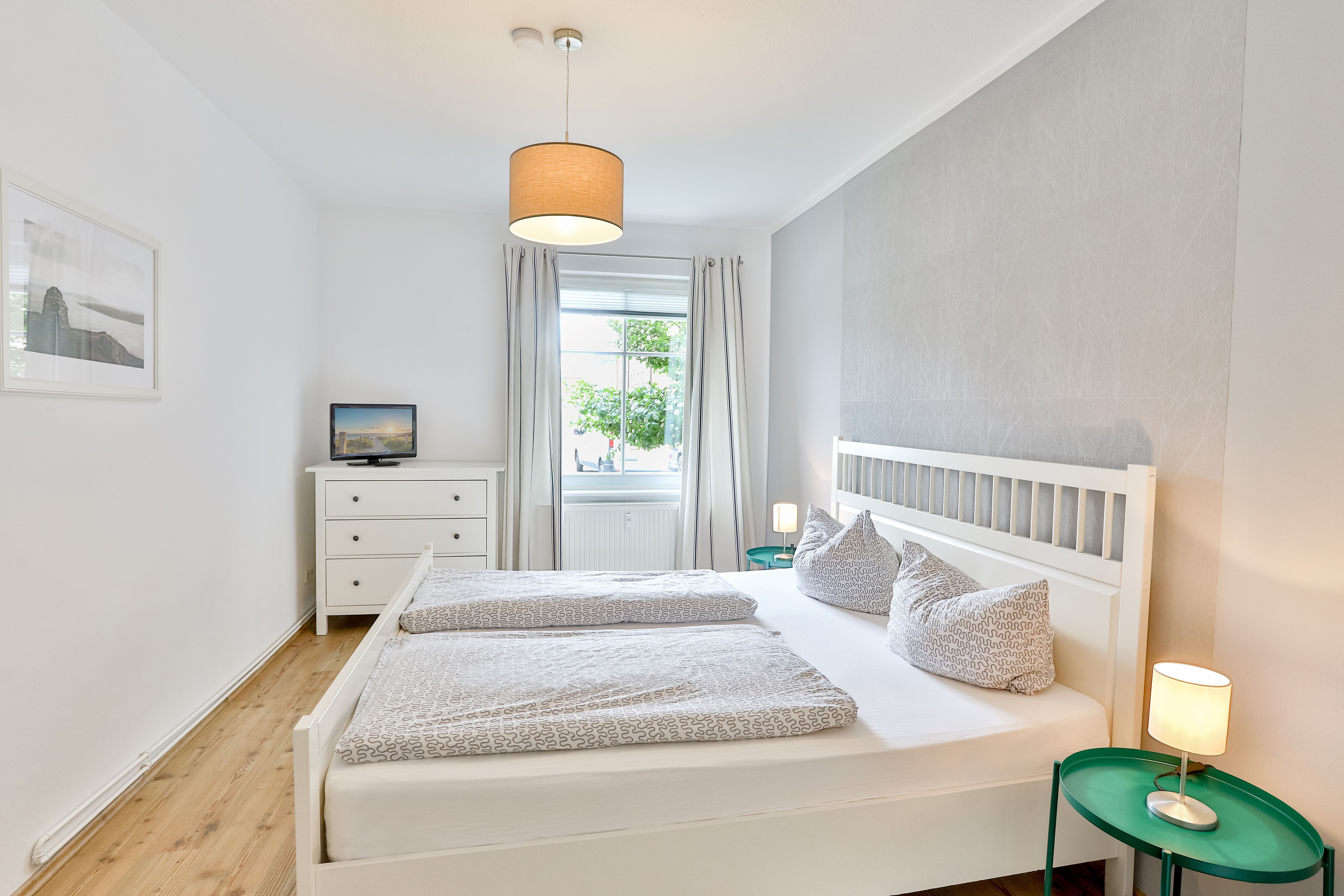 Die Wohnung liegt im Erdgeschoß (Hochparterre) und verfügt über 2 getrennte Schlafzimmer mit jeweils 1 Doppelbett. Im Wohnzimmer befindet sich eine Schlafcouch für maximal 2 Personen. Bei Bedarf können auch 2 Babyreisebetten zur Verfügung gestellt werden.