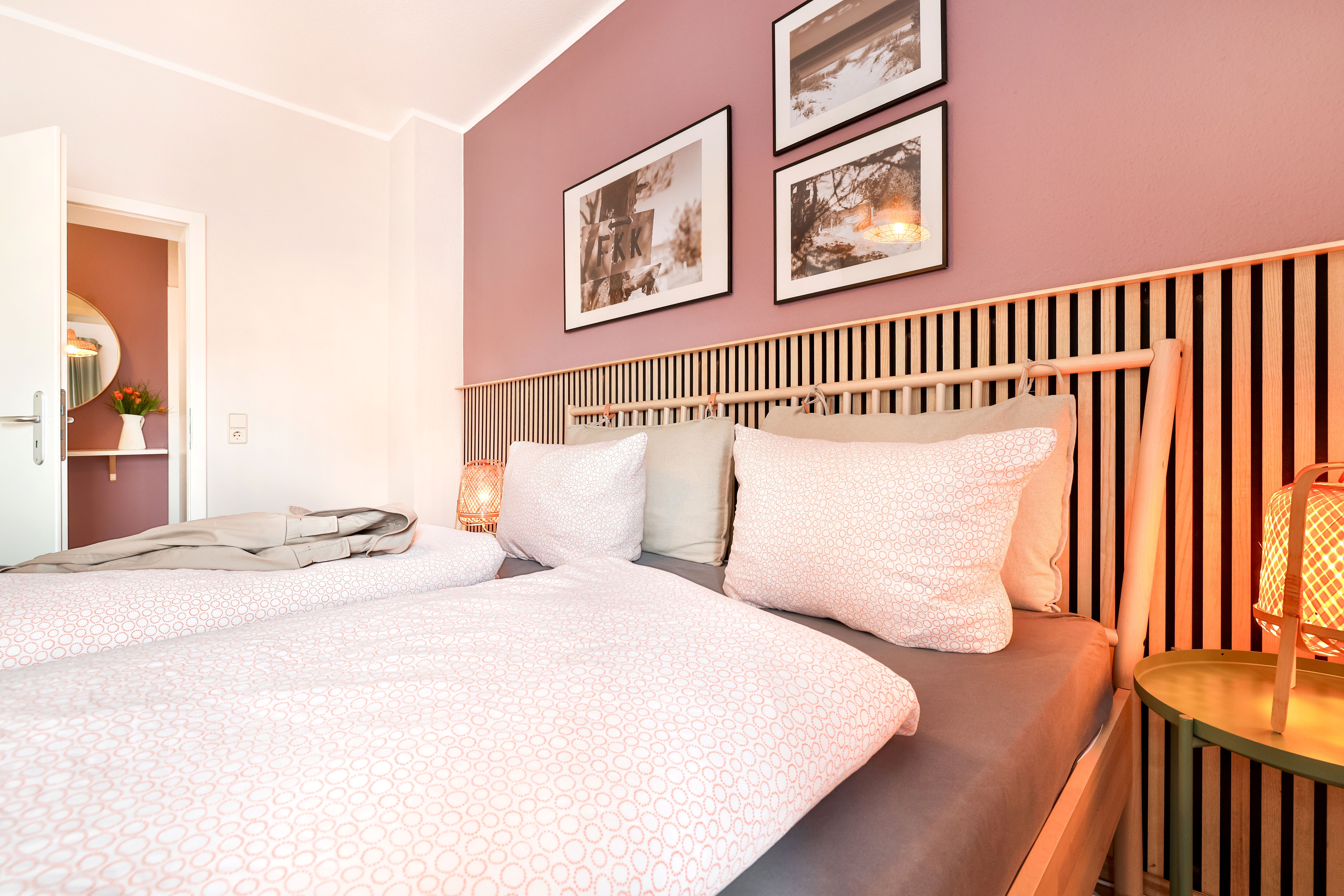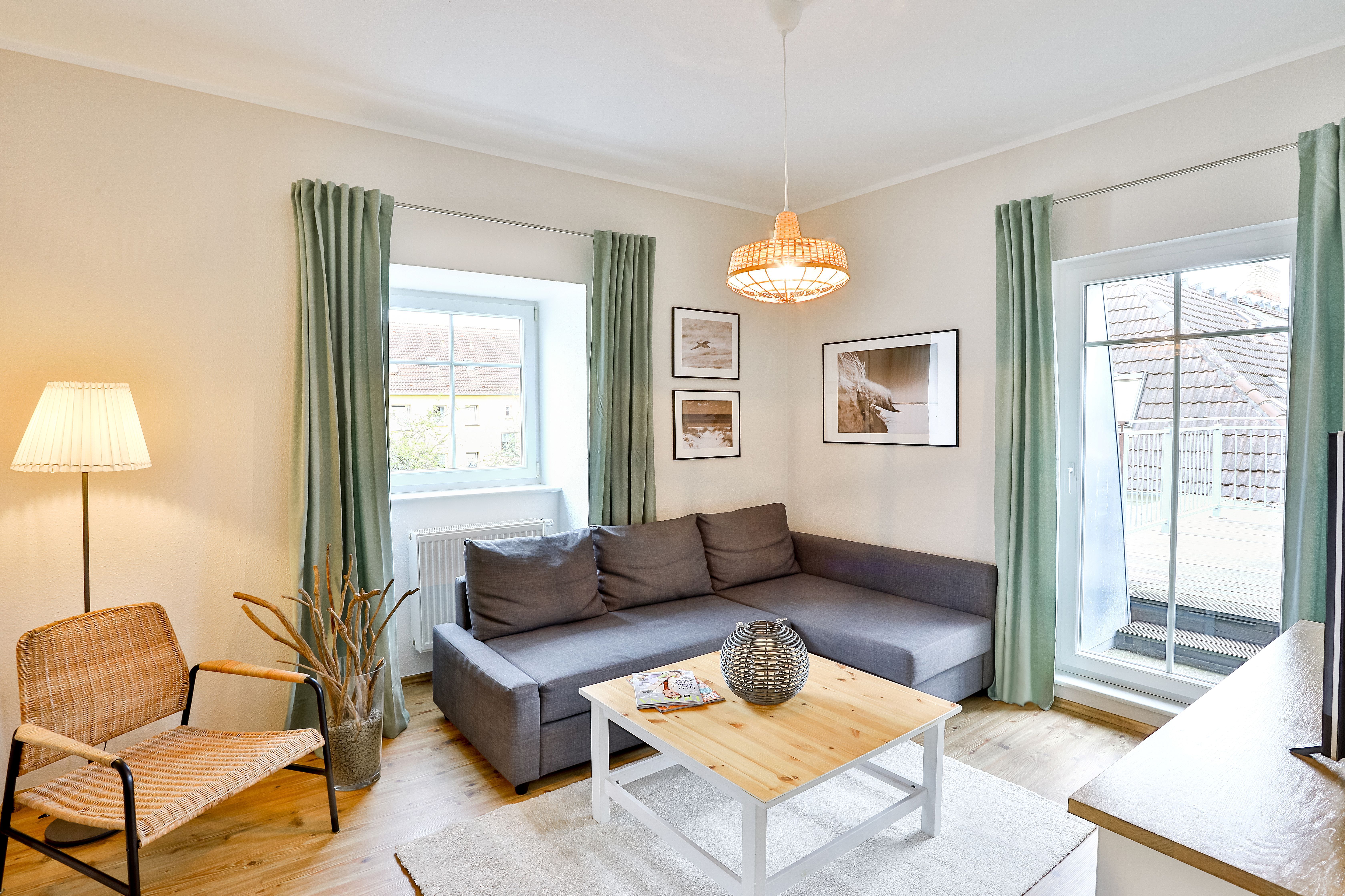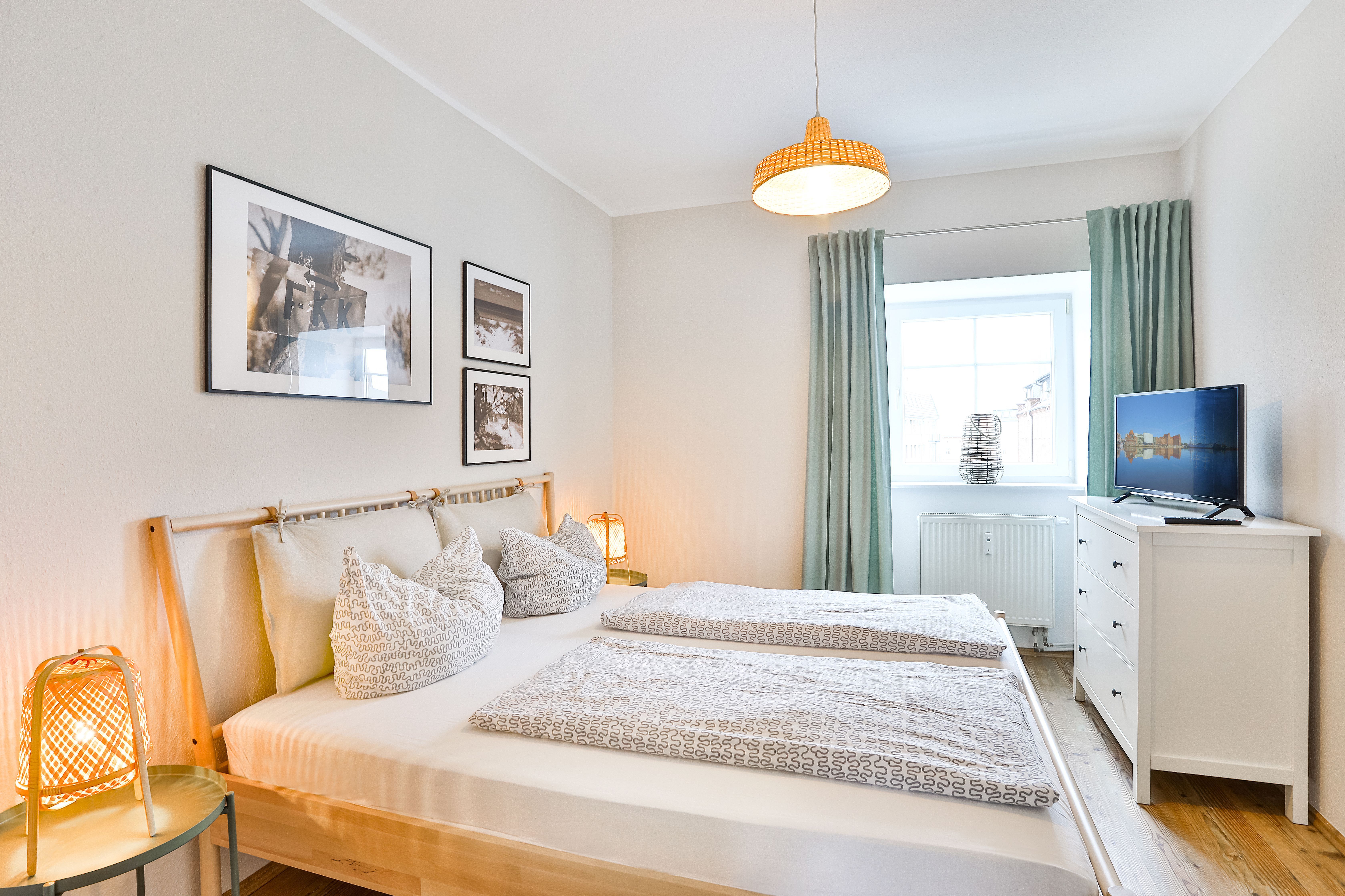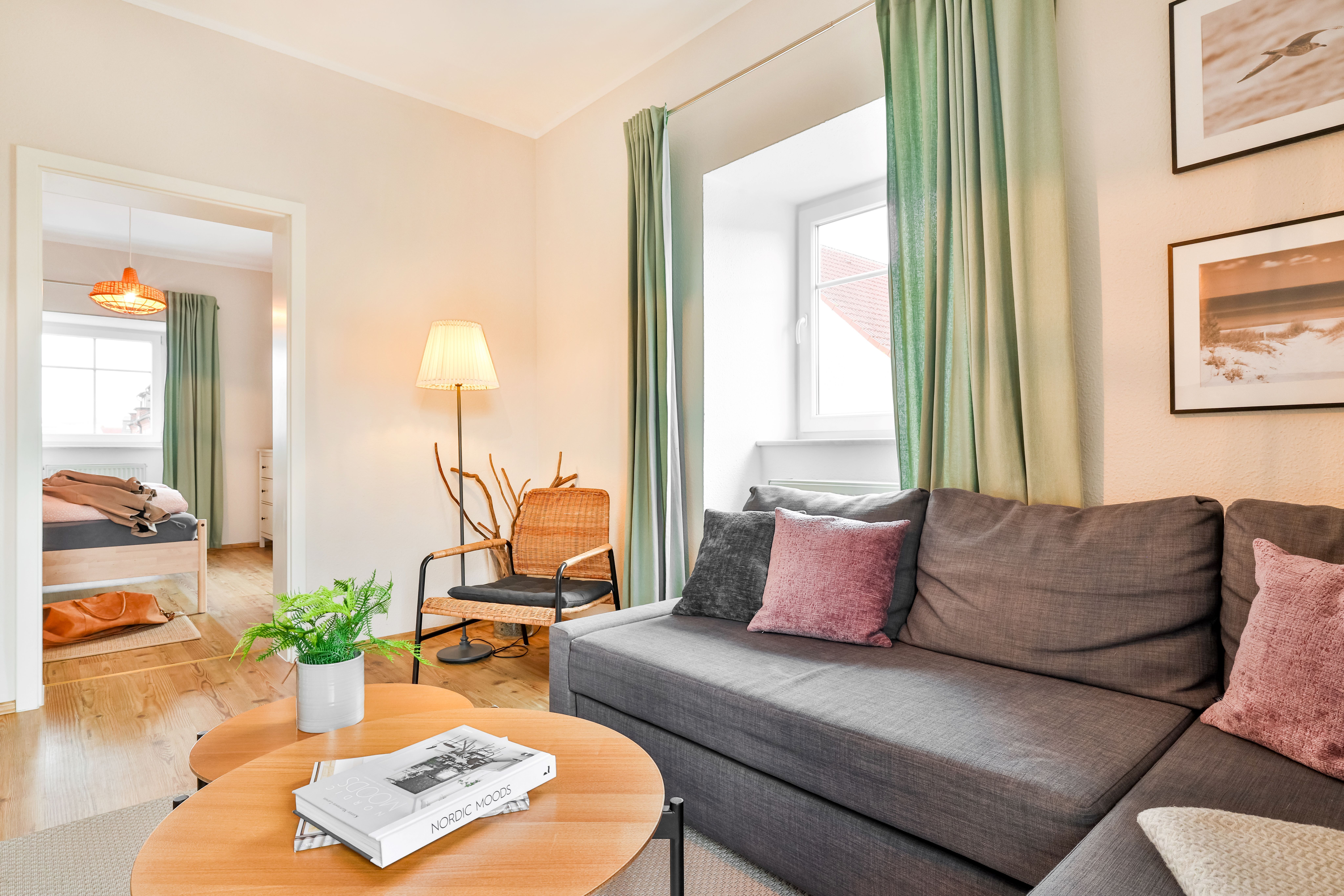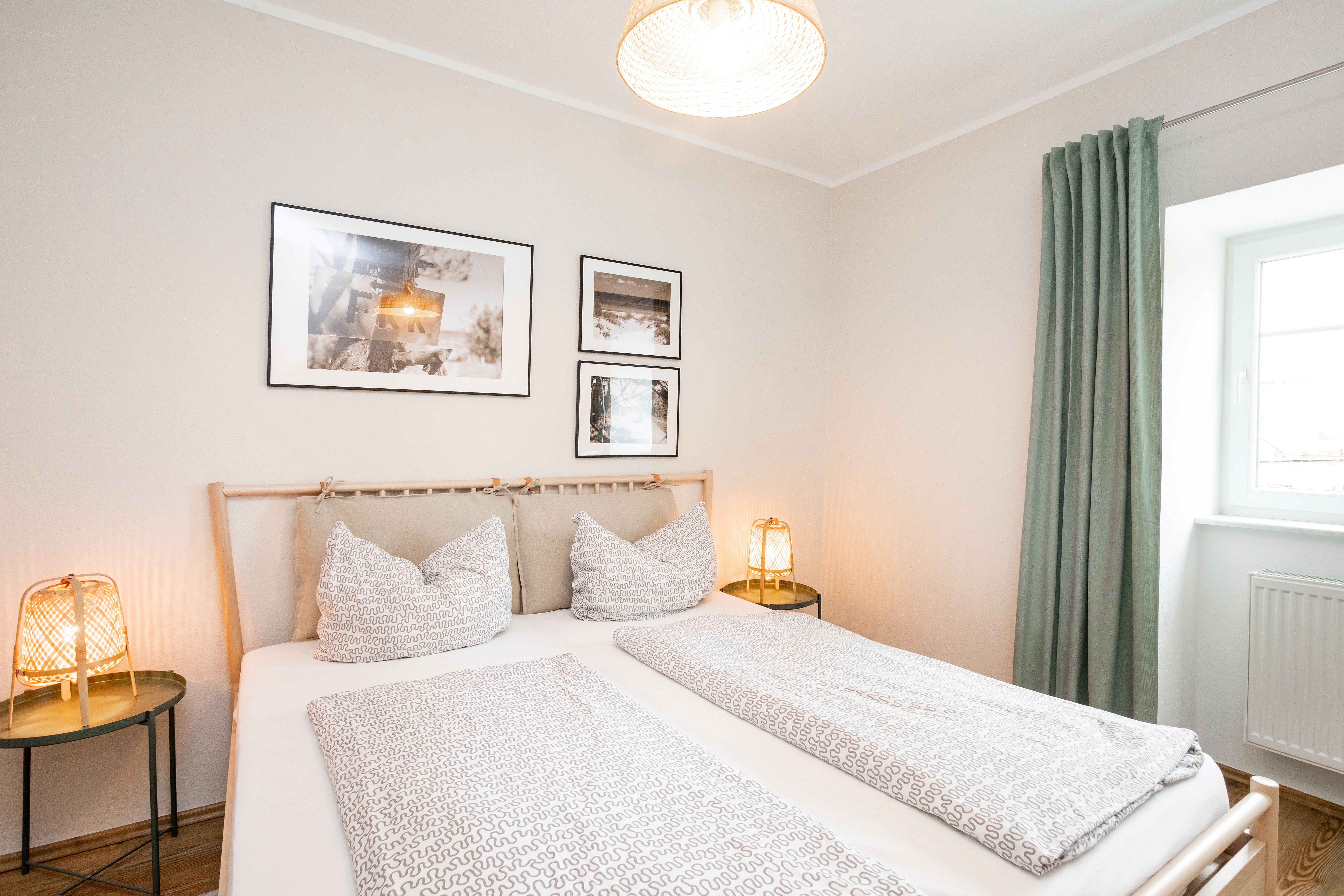 Die Wohnung liegt im 1.OG und verfügt über 2 getrennte Schlafzimmer mit jeweils 1 Doppelbett. Im Wohnzimmer befindet sich eine Schlafcouch für maximal 2 Personen. Bei Bedarf können auch 2 Babyreisebetten zur Verfügung gestellt werden.