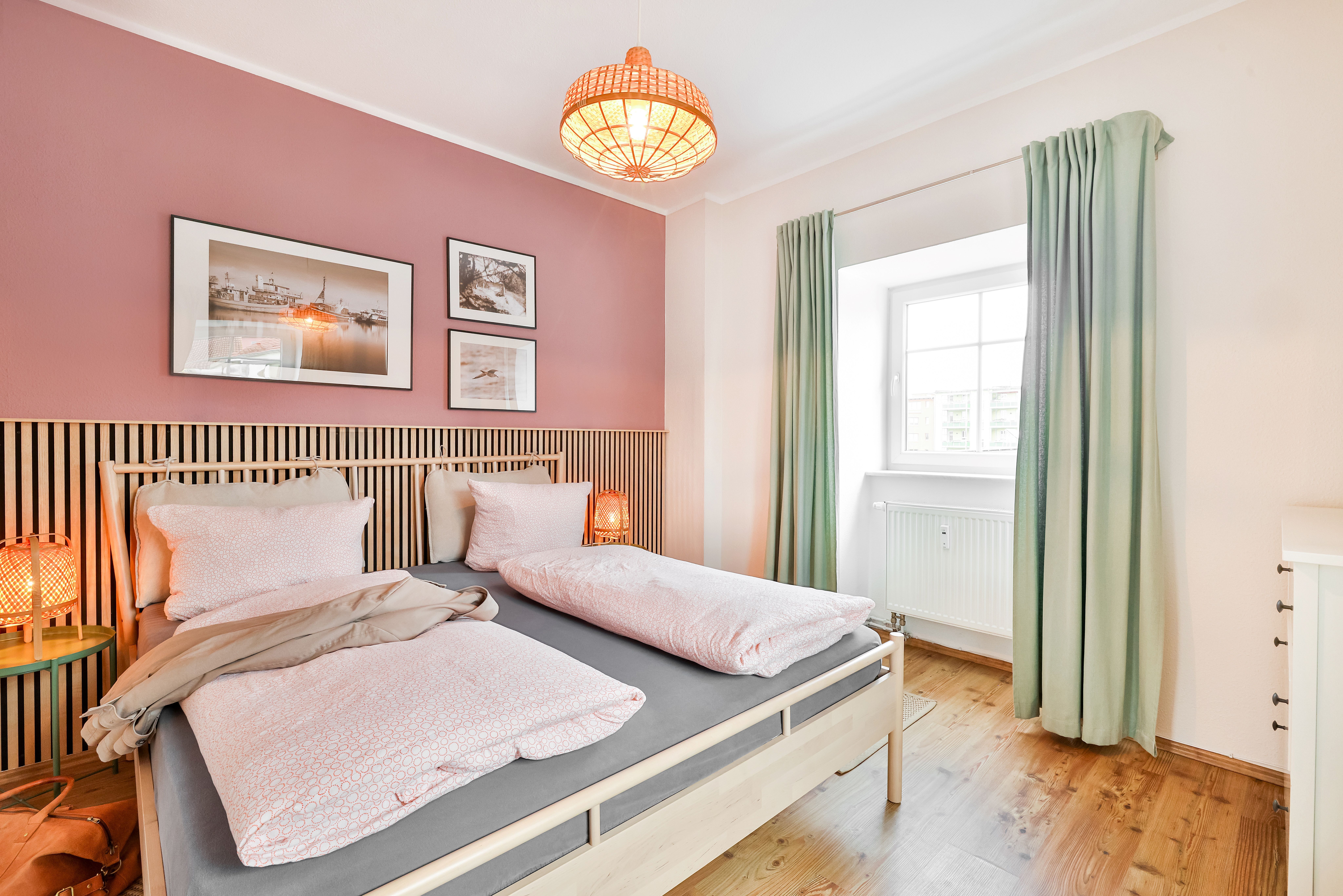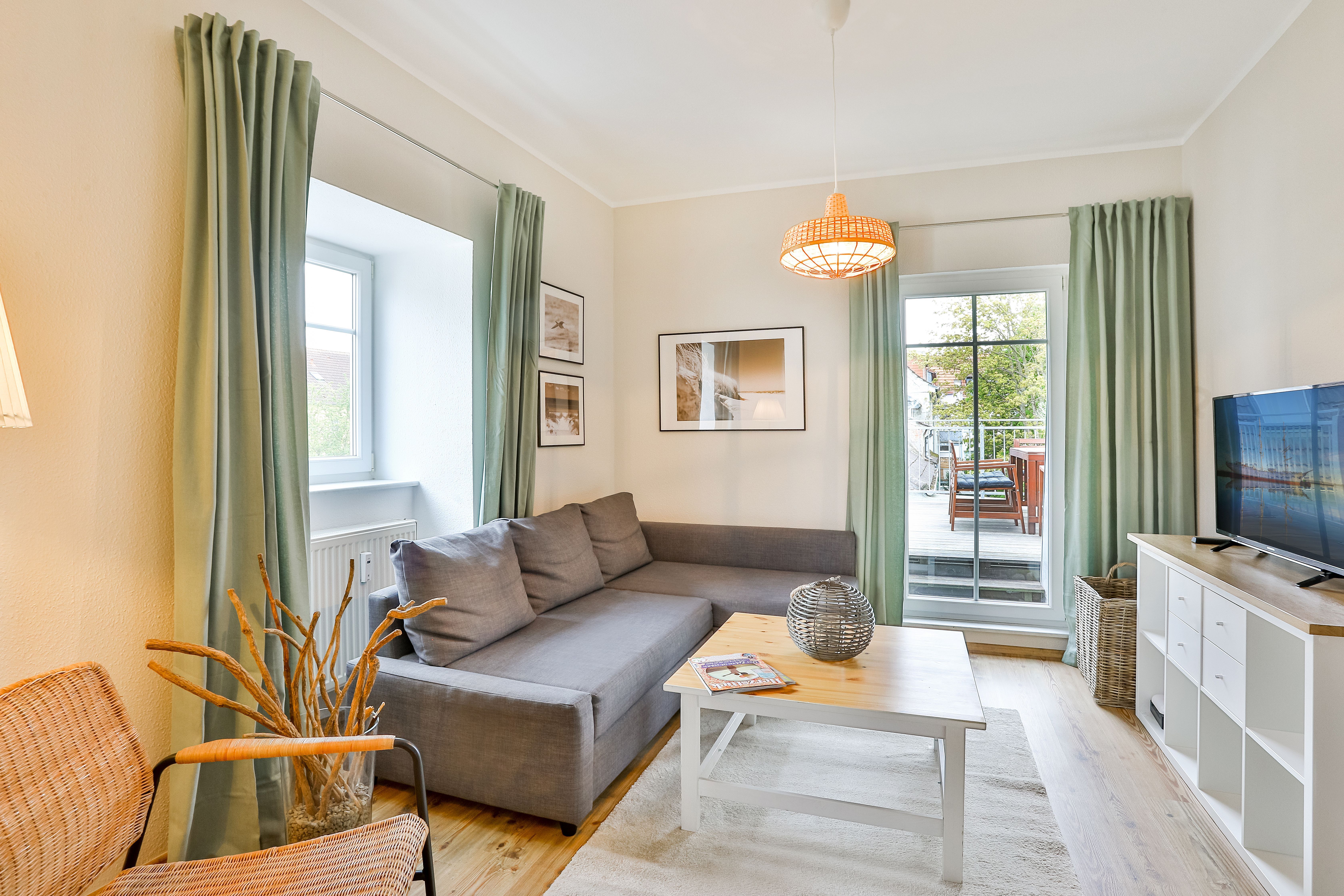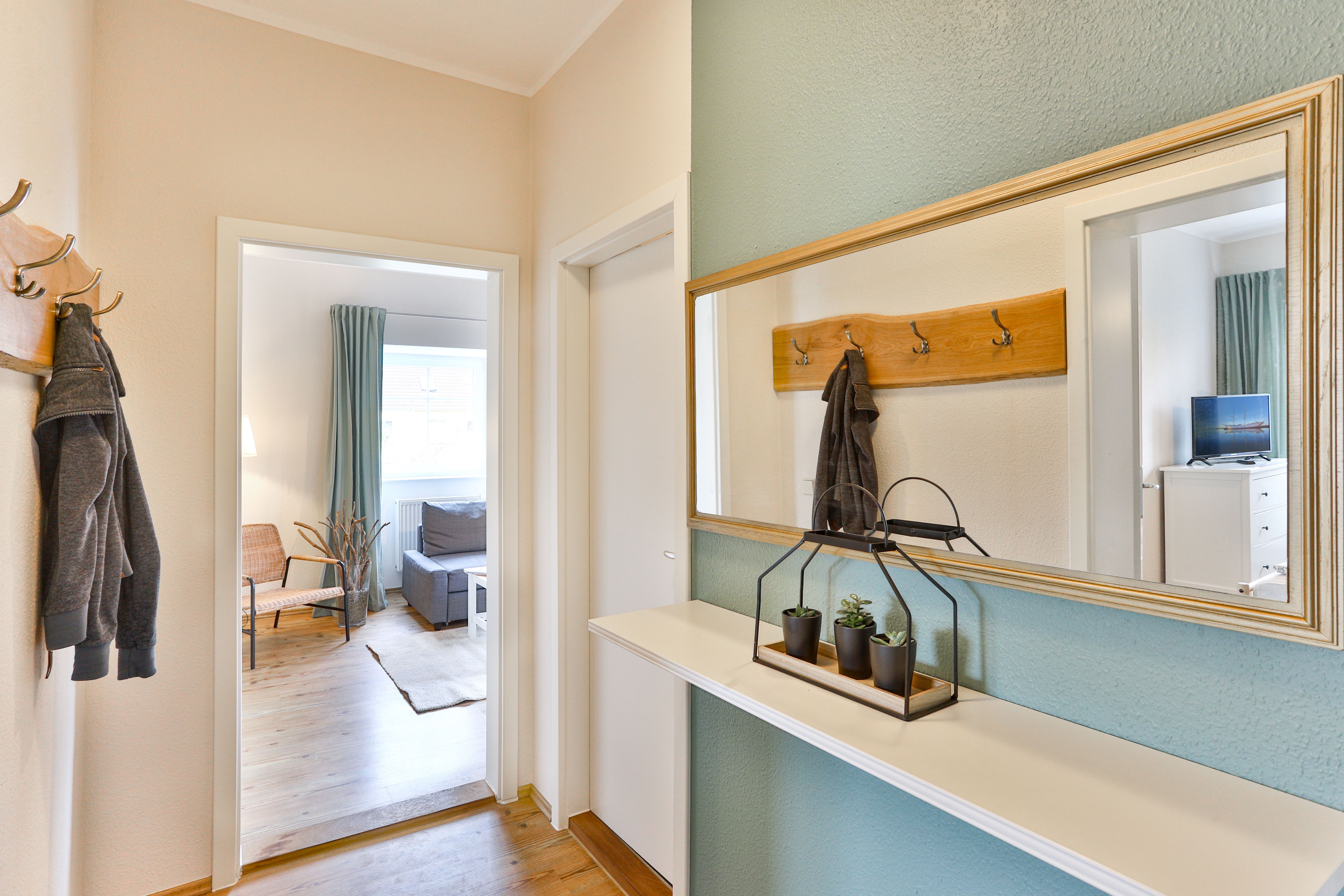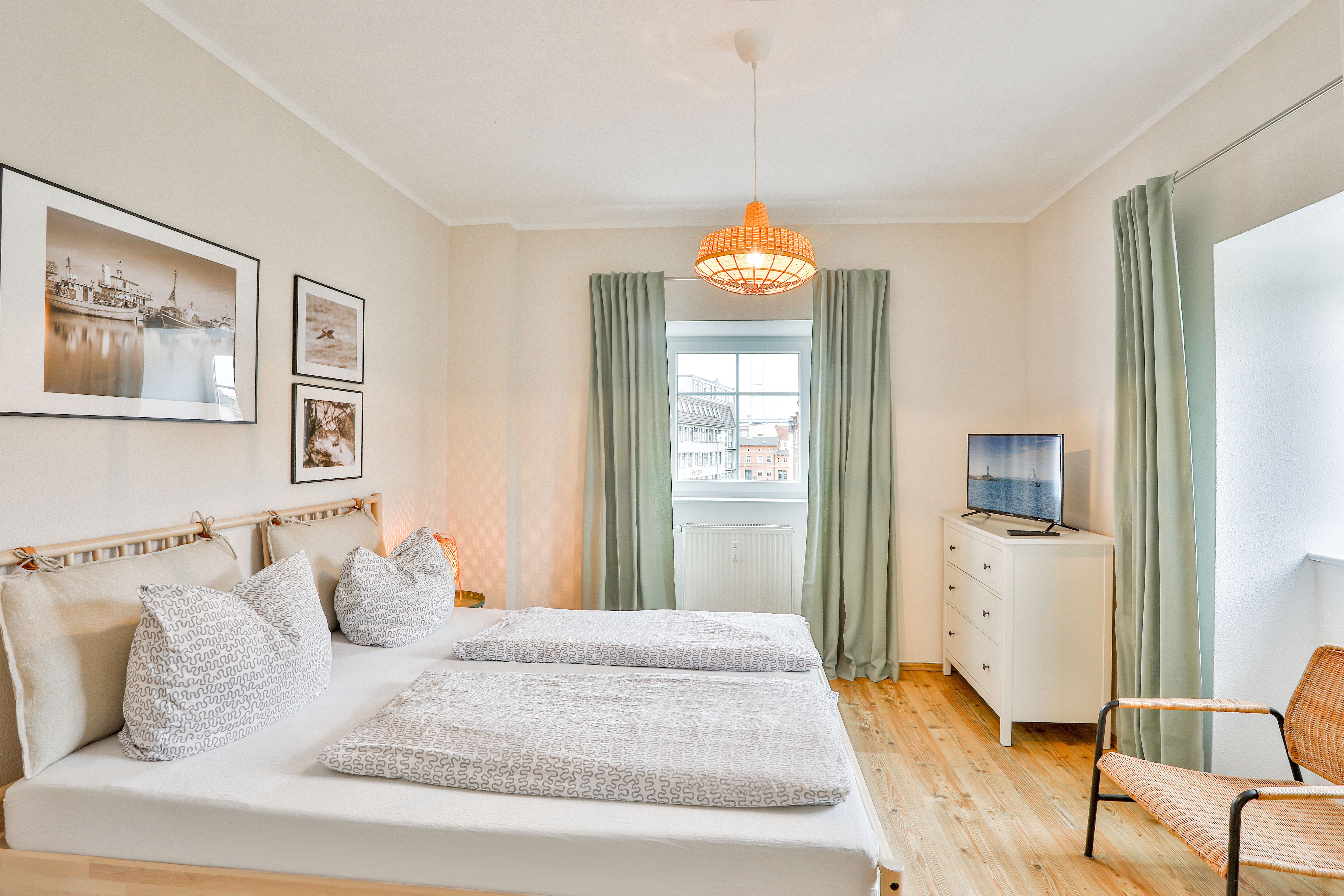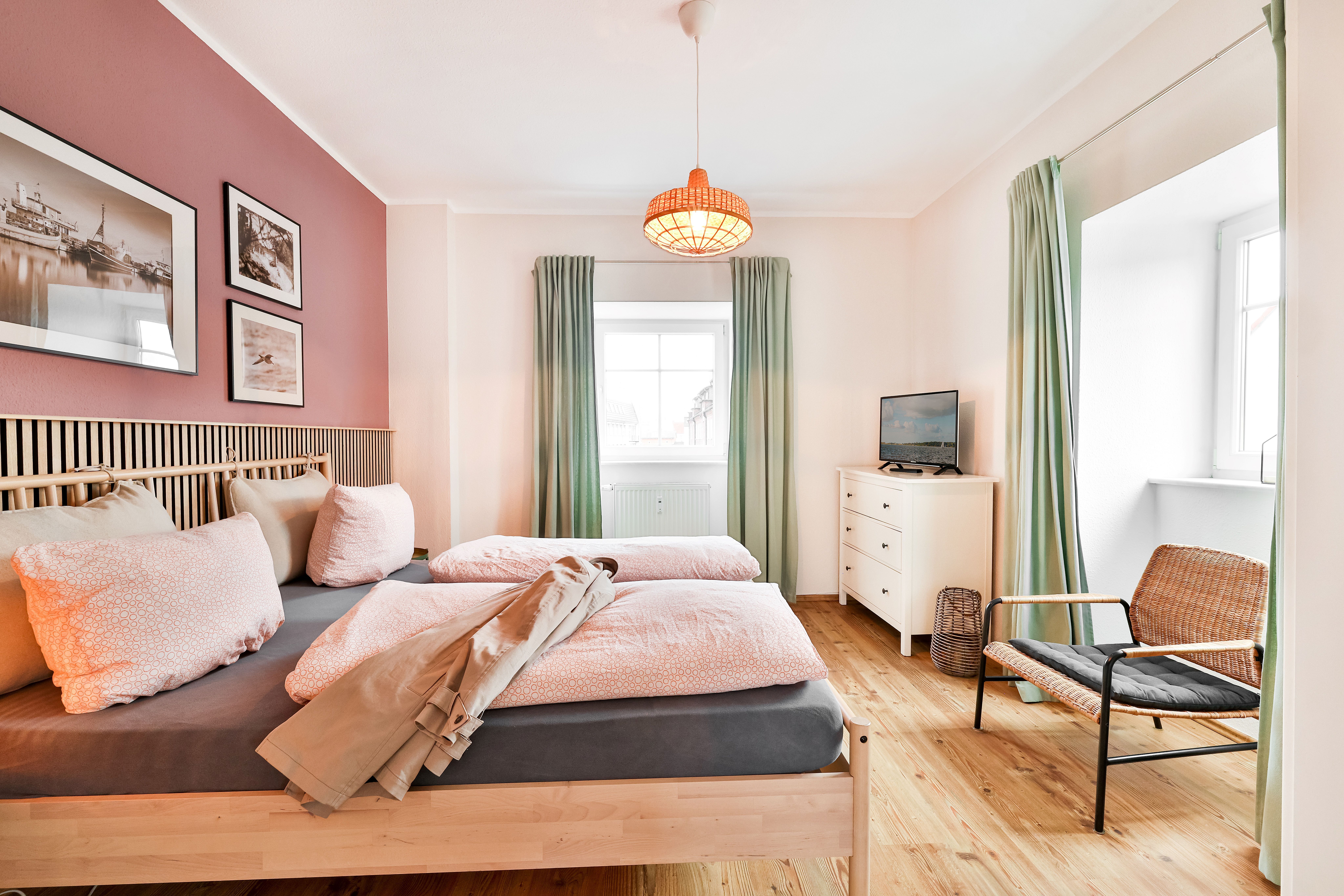 Die Wohnung liegt im 1.OG und verfügt über 2 getrennte Schlafzimmer mit jeweils 1 Doppelbett. Im Wohnzimmer befindet sich eine Schlafcouch für maximal 2 Personen. Bei Bedarf können auch 2 Babyreisebetten zur Verfügung gestellt werden.