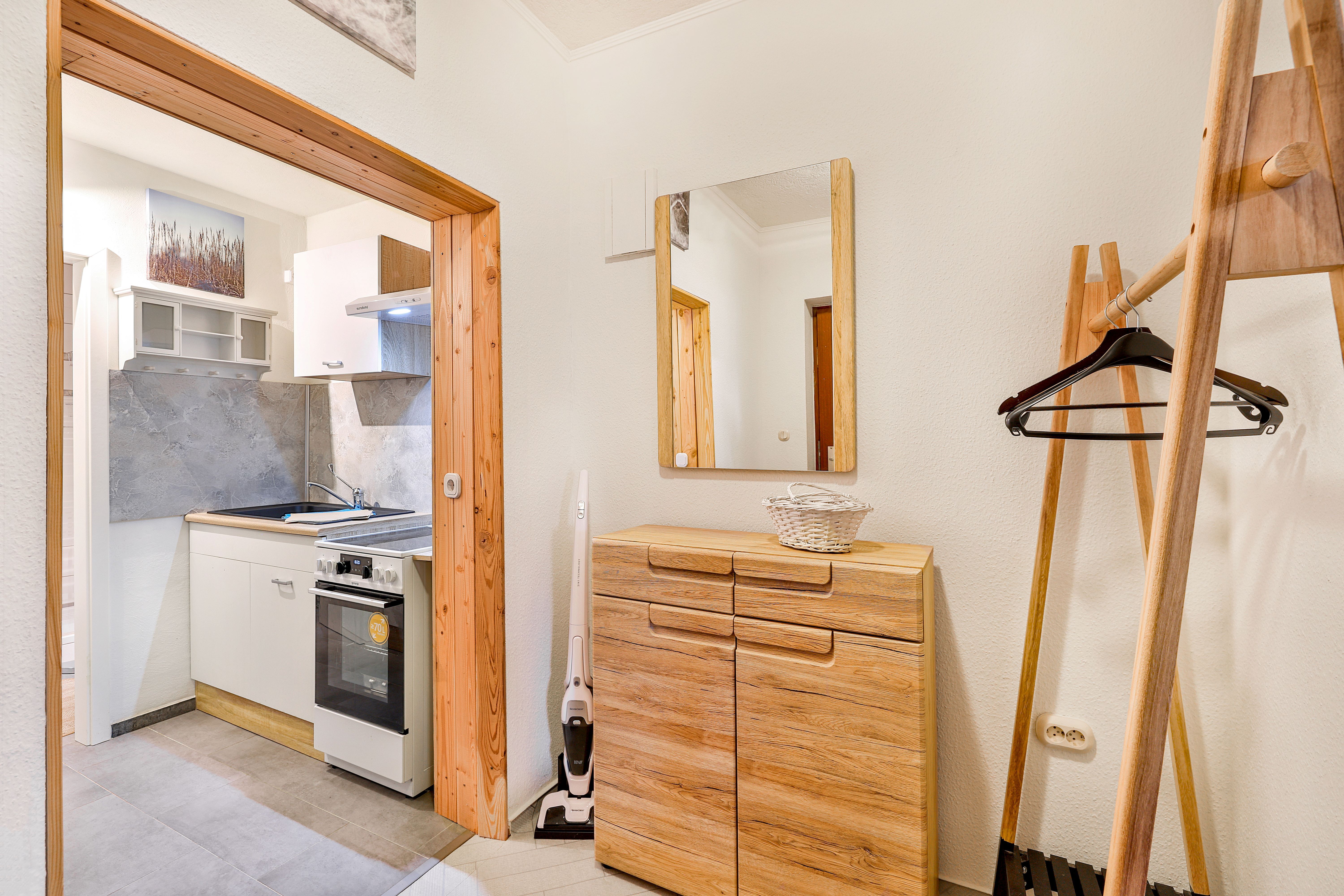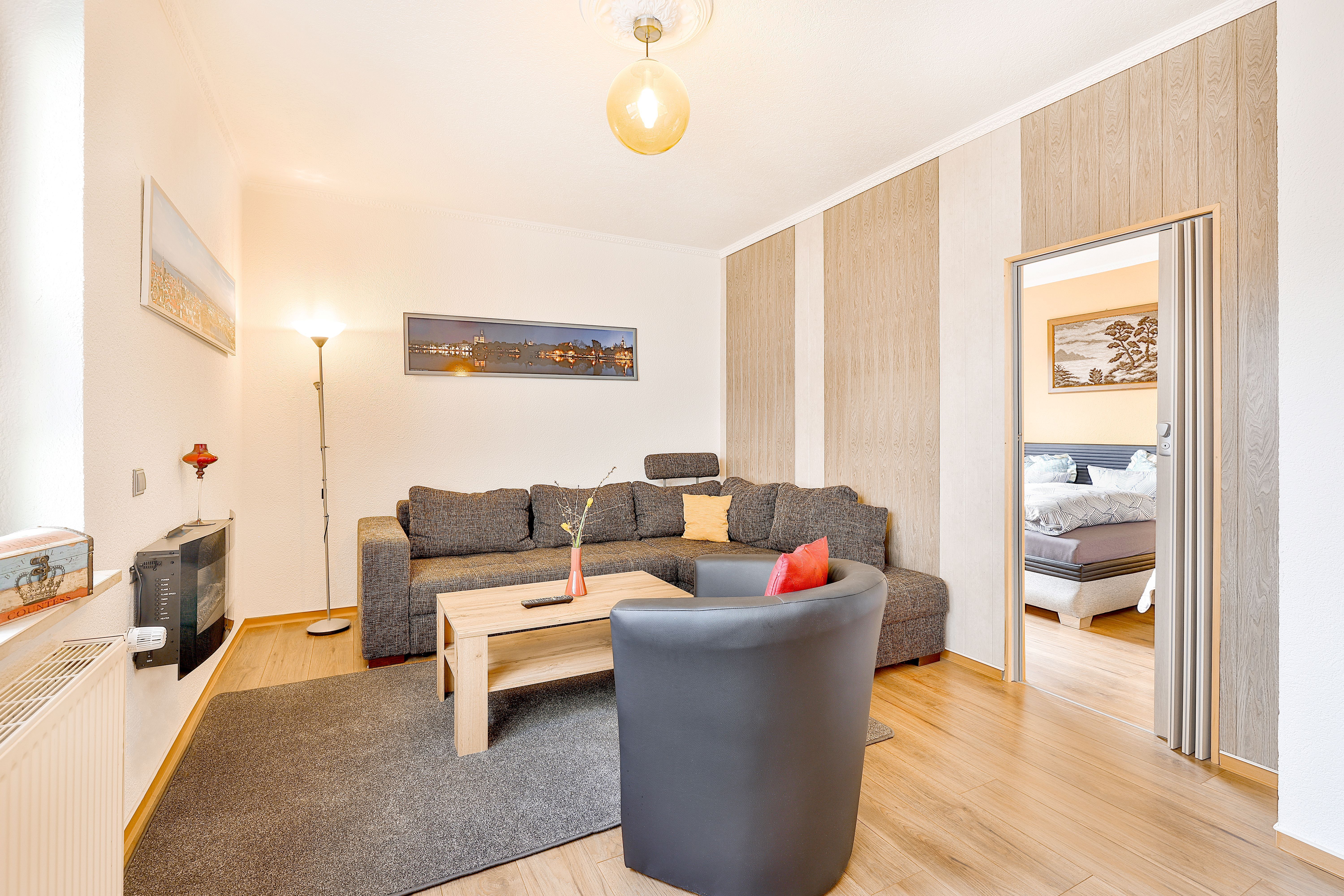 Die Ferienwohnung 2 im EG ist über einen eigenen Hauseingang im Hof zu erreichen. Die Wohnung verfügt über 1 großes Wohnzimmer mit Schlafcouch, 1 Schlafzimmer mit Doppelbett, 1 Badezimmer sowie einer Küche. Der Essbereich ist in das Wohnzimmer integriert.