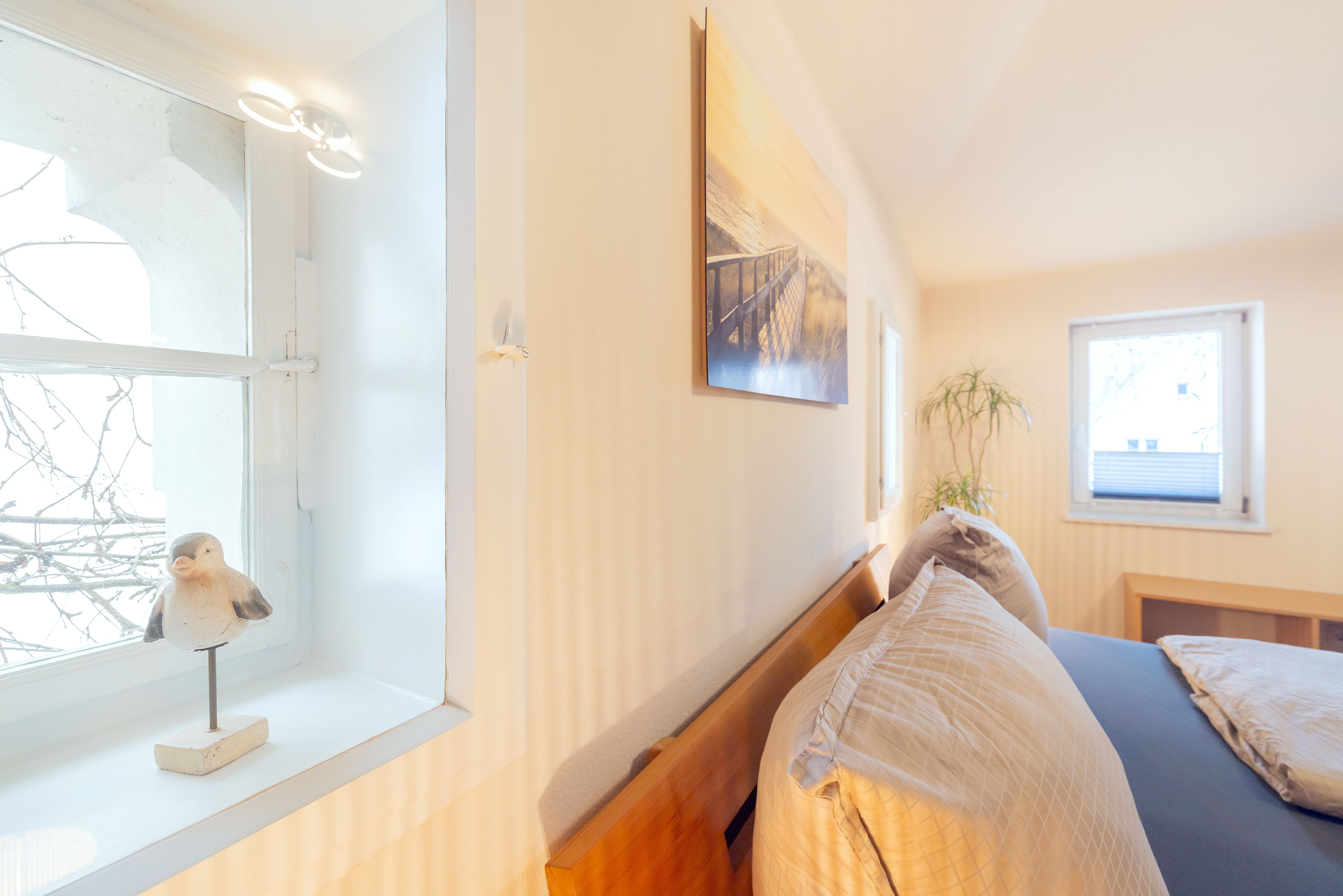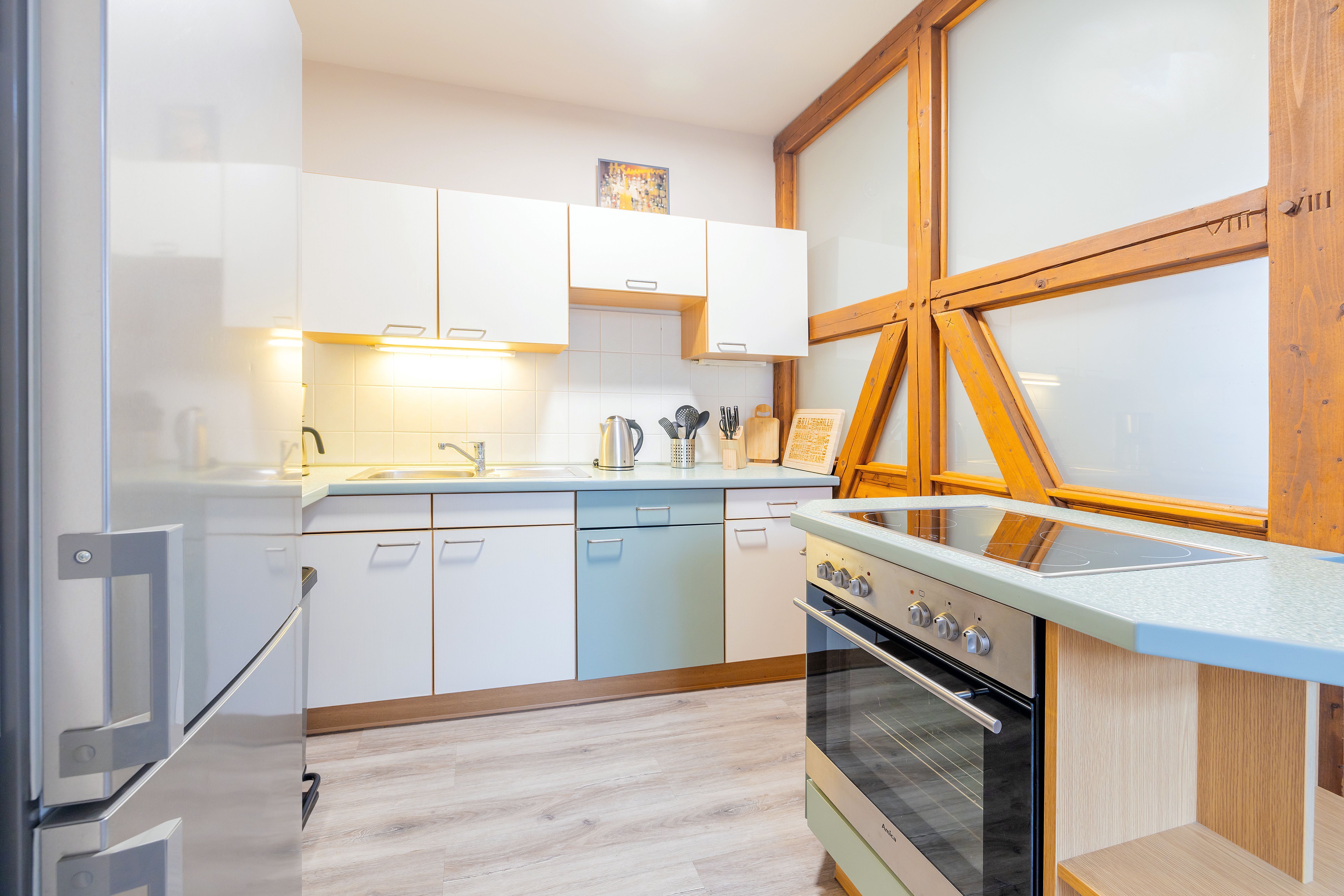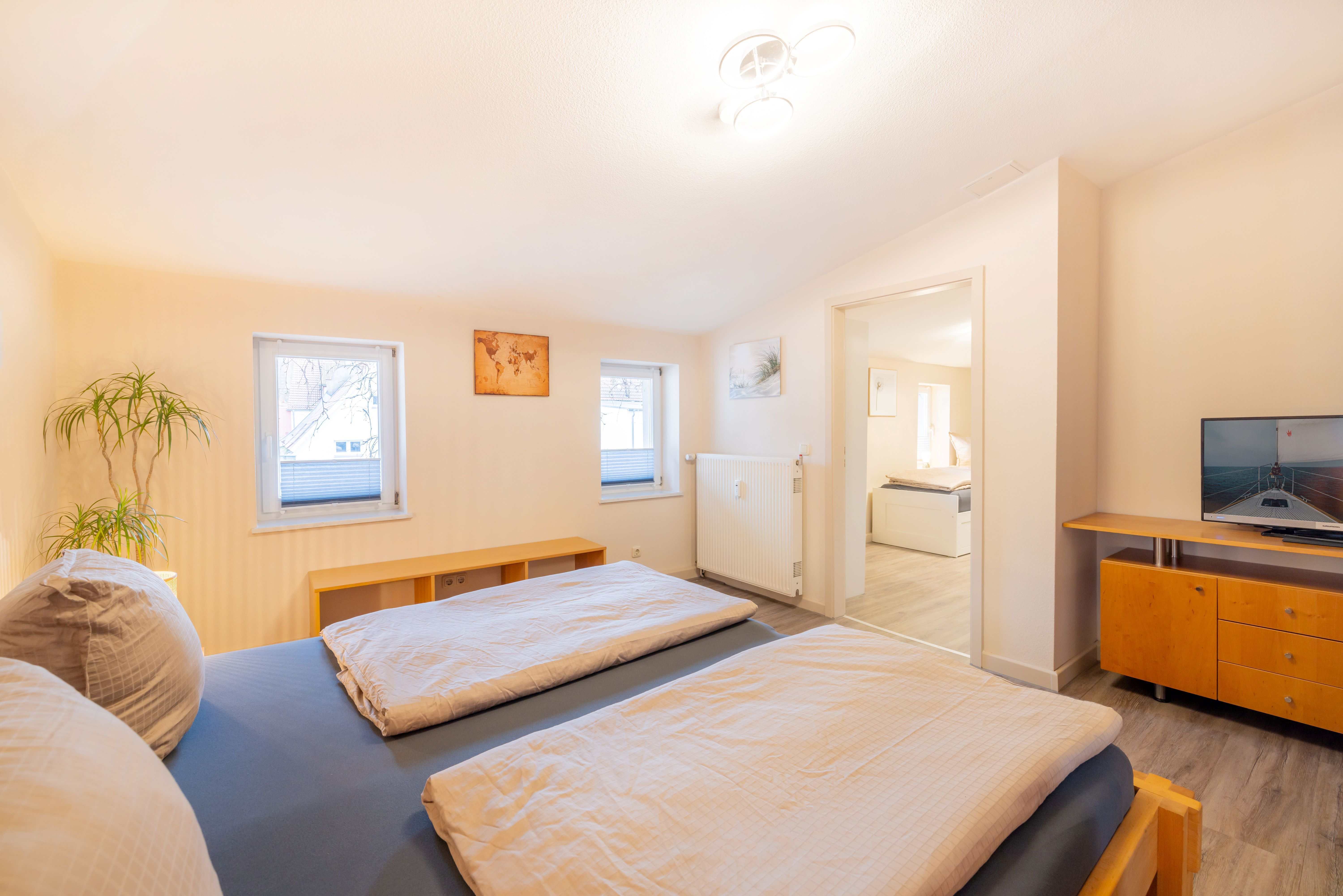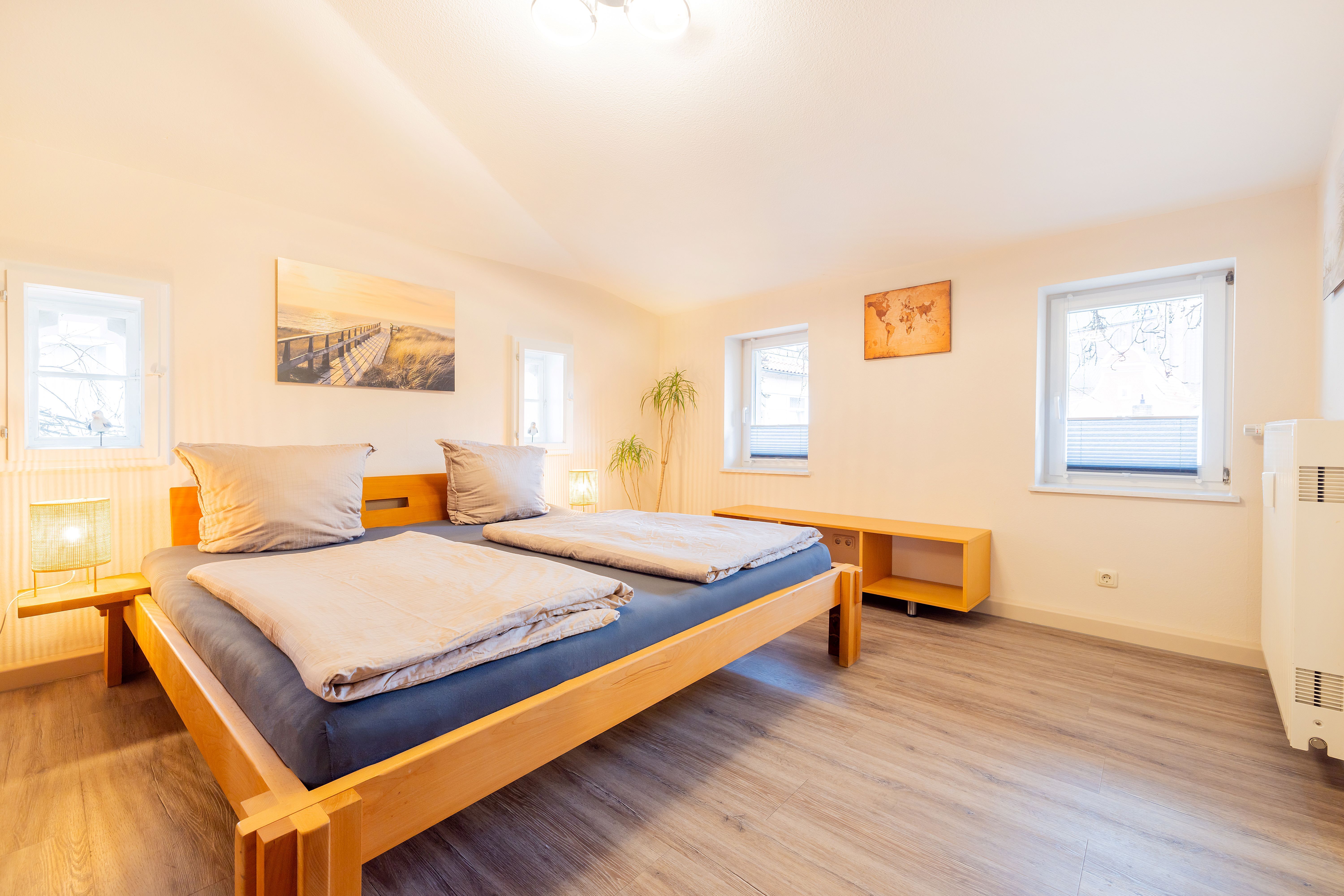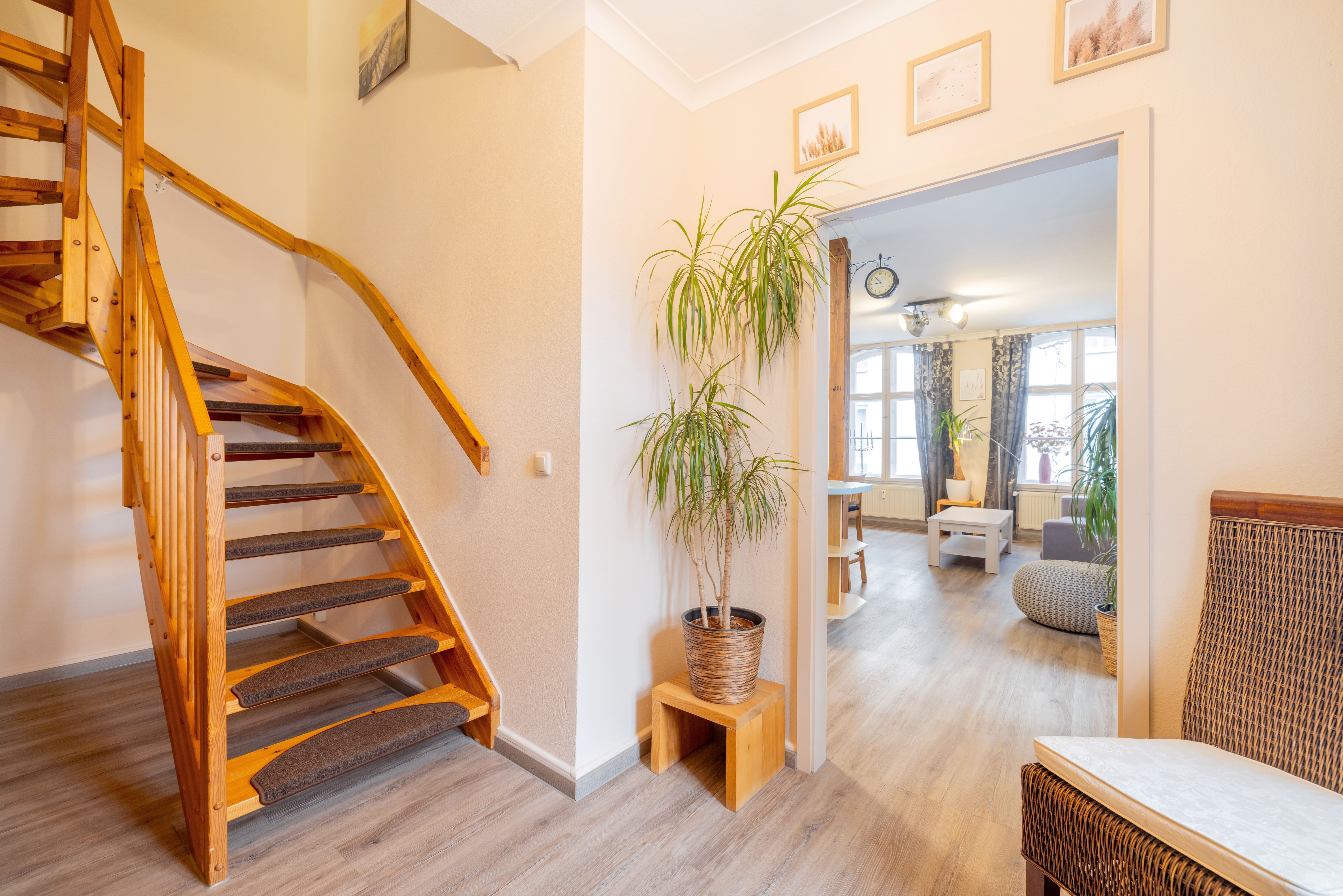 Die Ferienwohnung 2 liegt im 1.OG. Die Wohnung besteht aus einem großen Wohnraum mit offener Küche und Essbereich im 1.OG. Über eine innenliegende Holztreppe kommt man in das 2.OG, in dem sich das Badezimmer und das Schlafzimmer befinden.