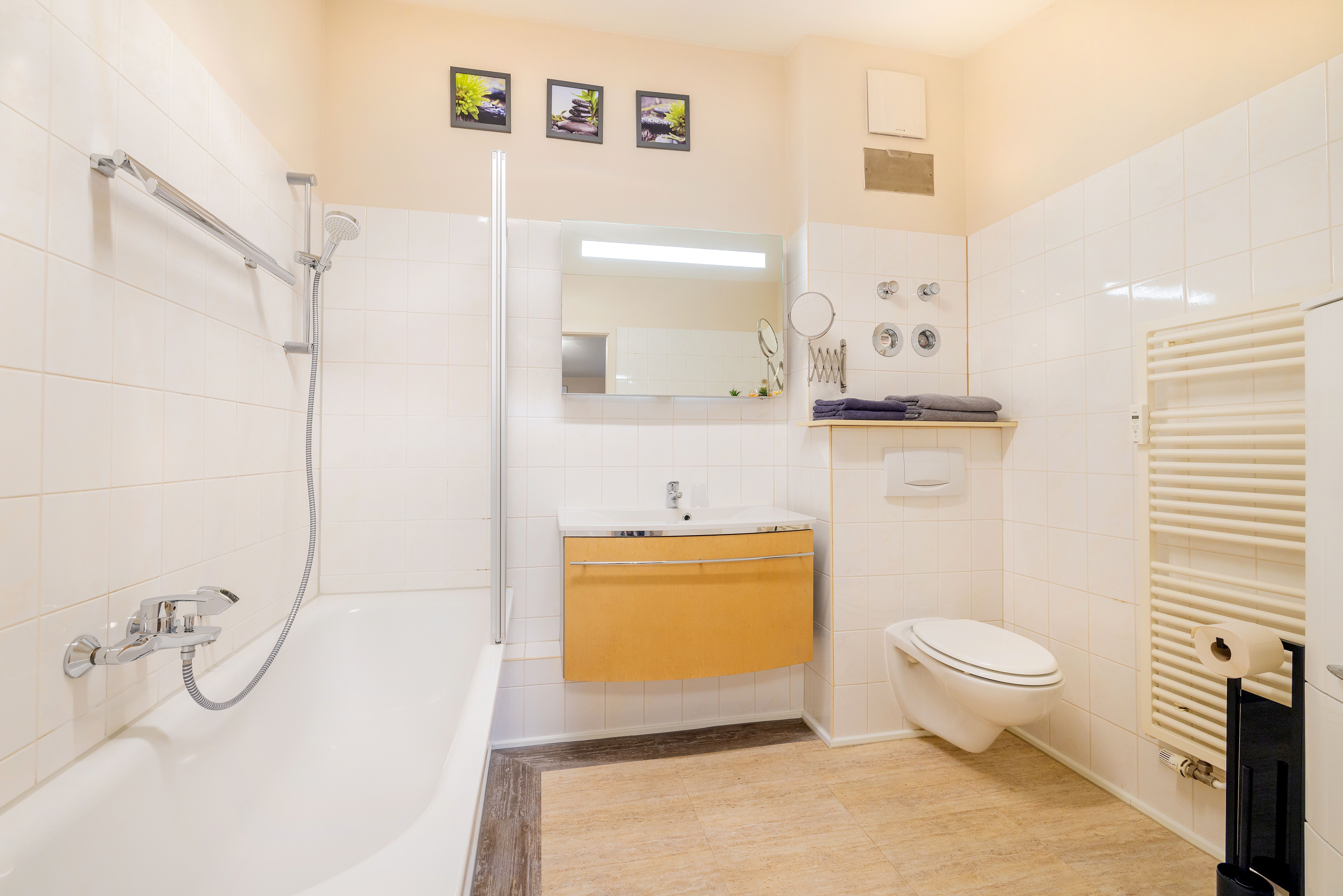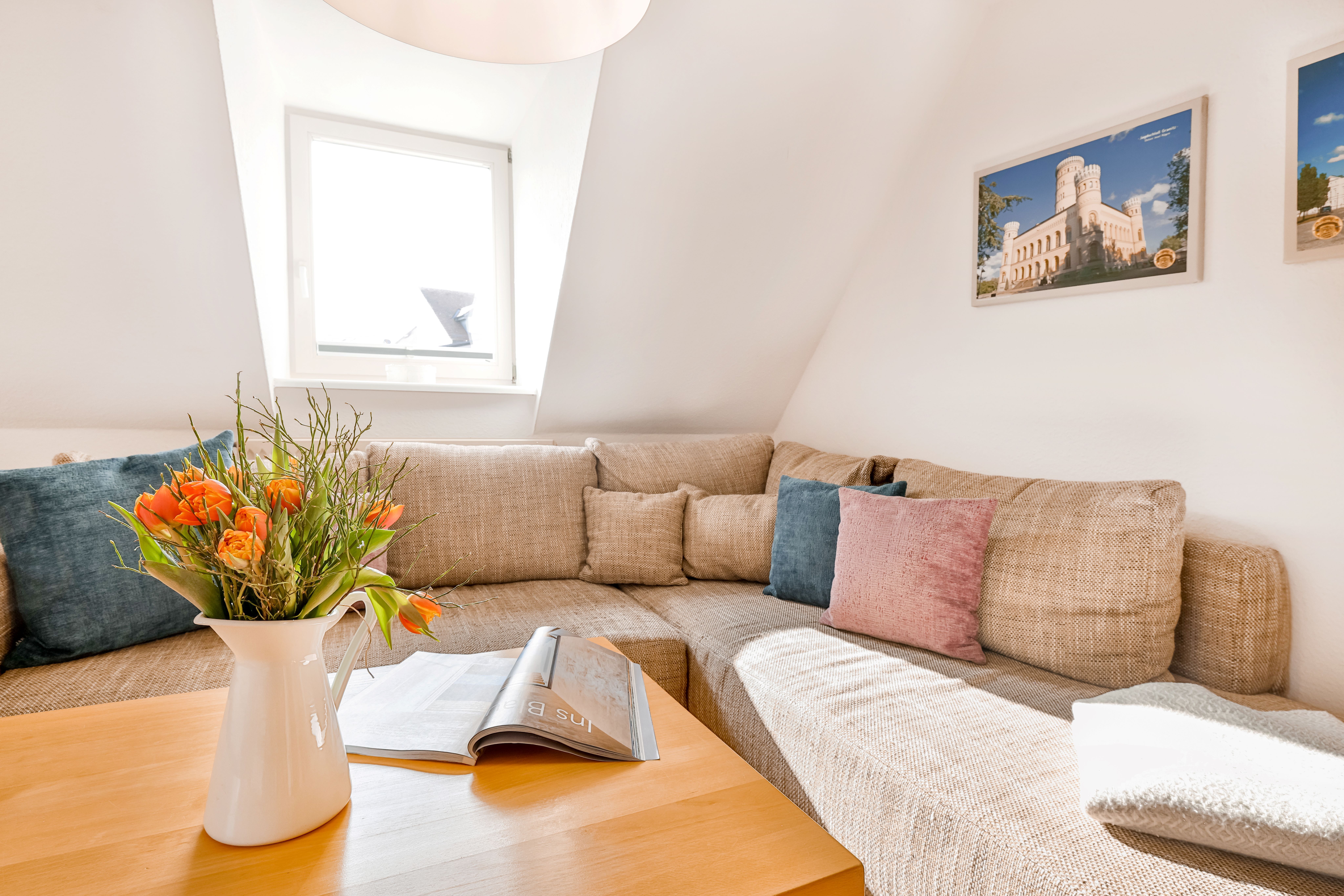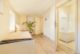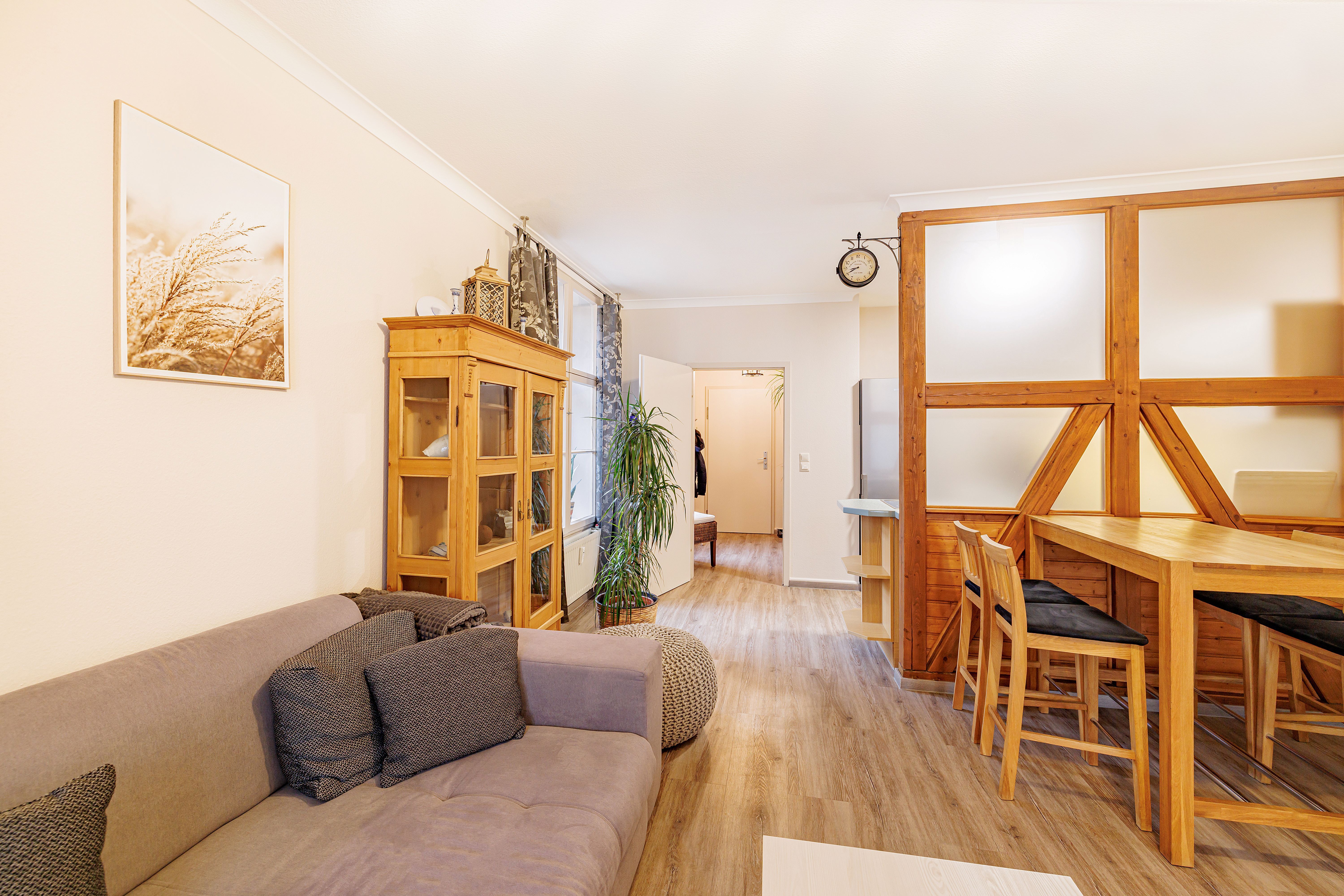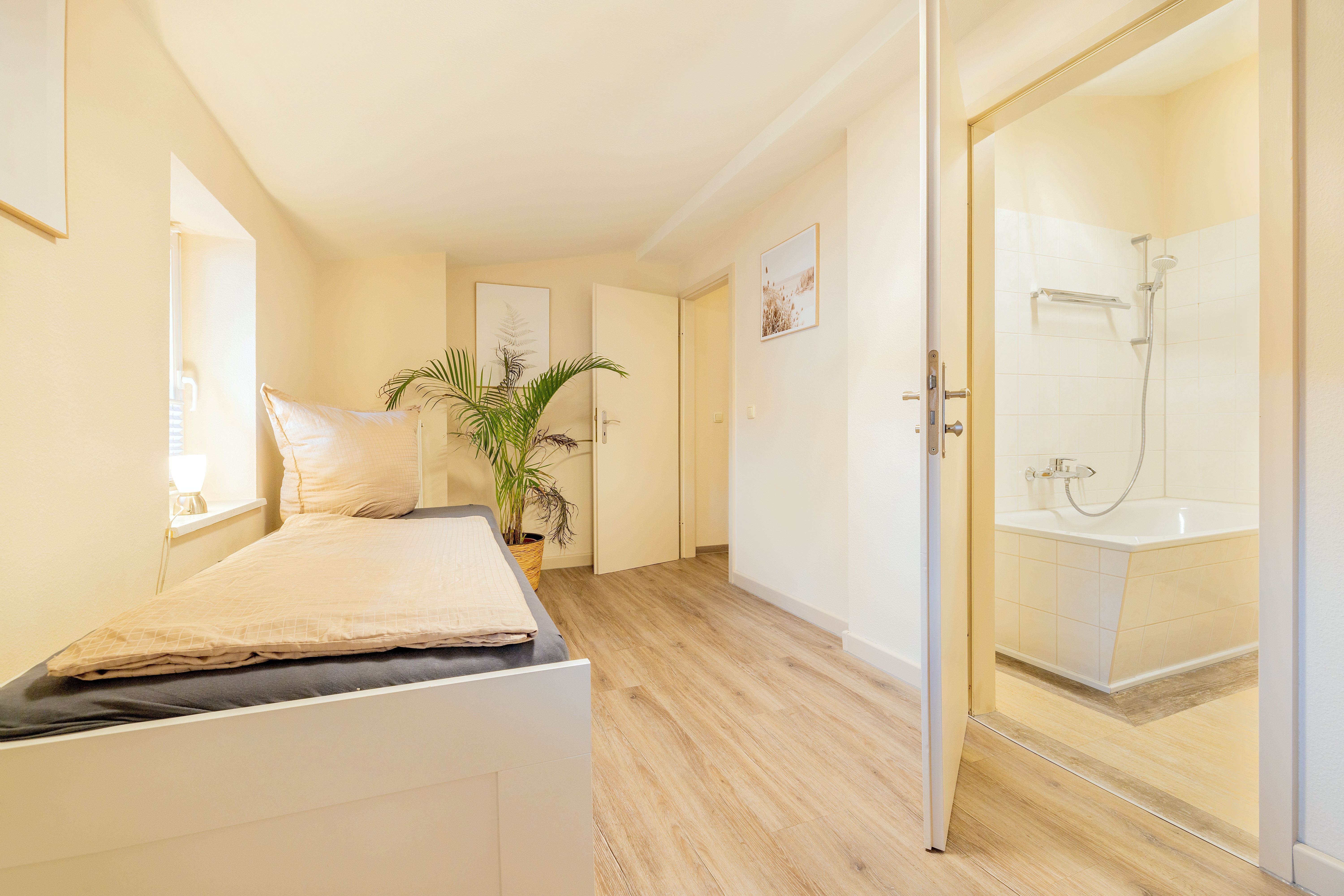 Die Ferienwohnung 2 liegt im 1.OG. Die Wohnung besteht aus einem großen Wohnraum mit offener Küche und Essbereich im 1.OG. Über eine innenliegende Holztreppe kommt man in das 2.OG, in dem sich das Badezimmer und das Schlafzimmer befinden.