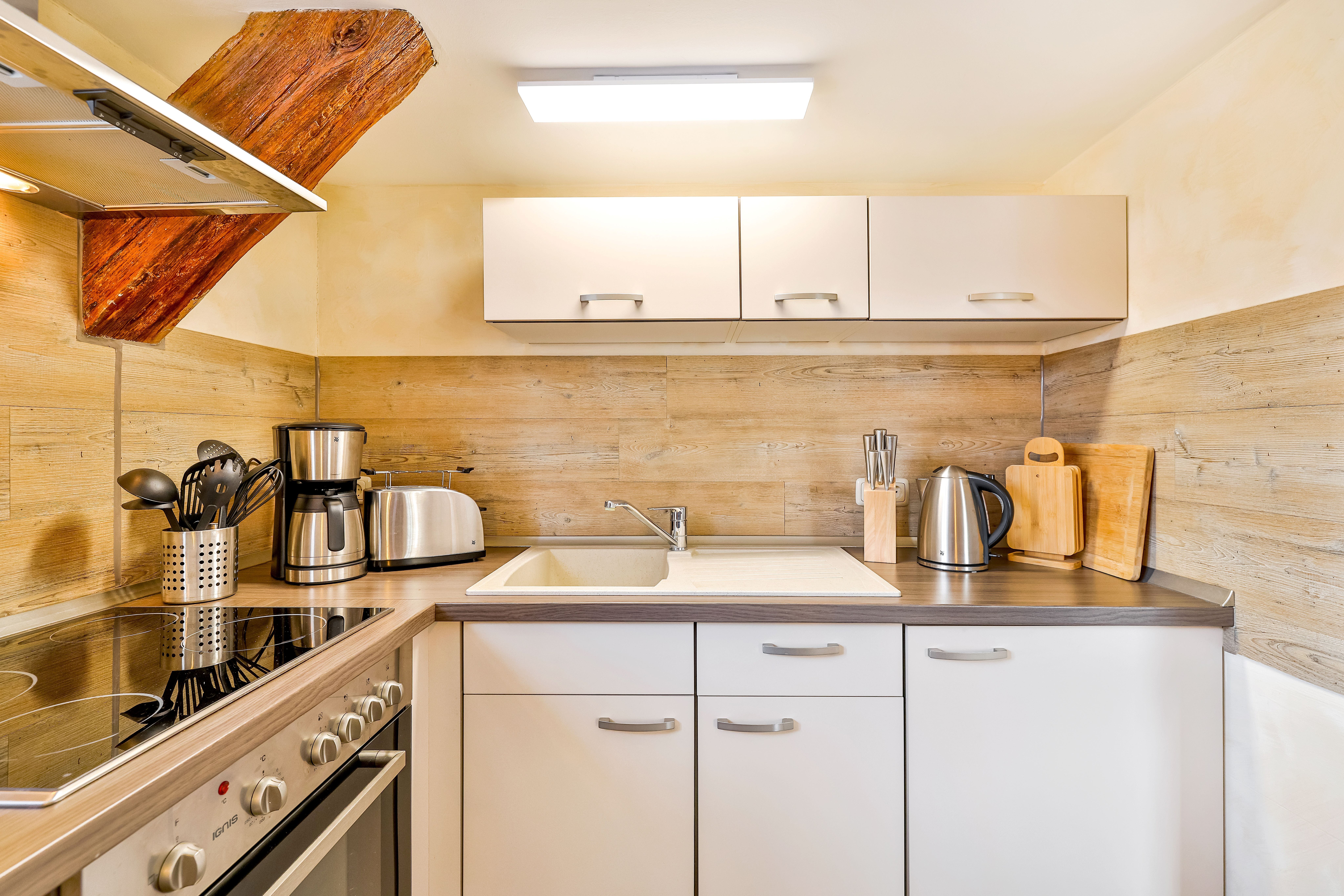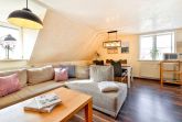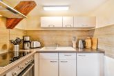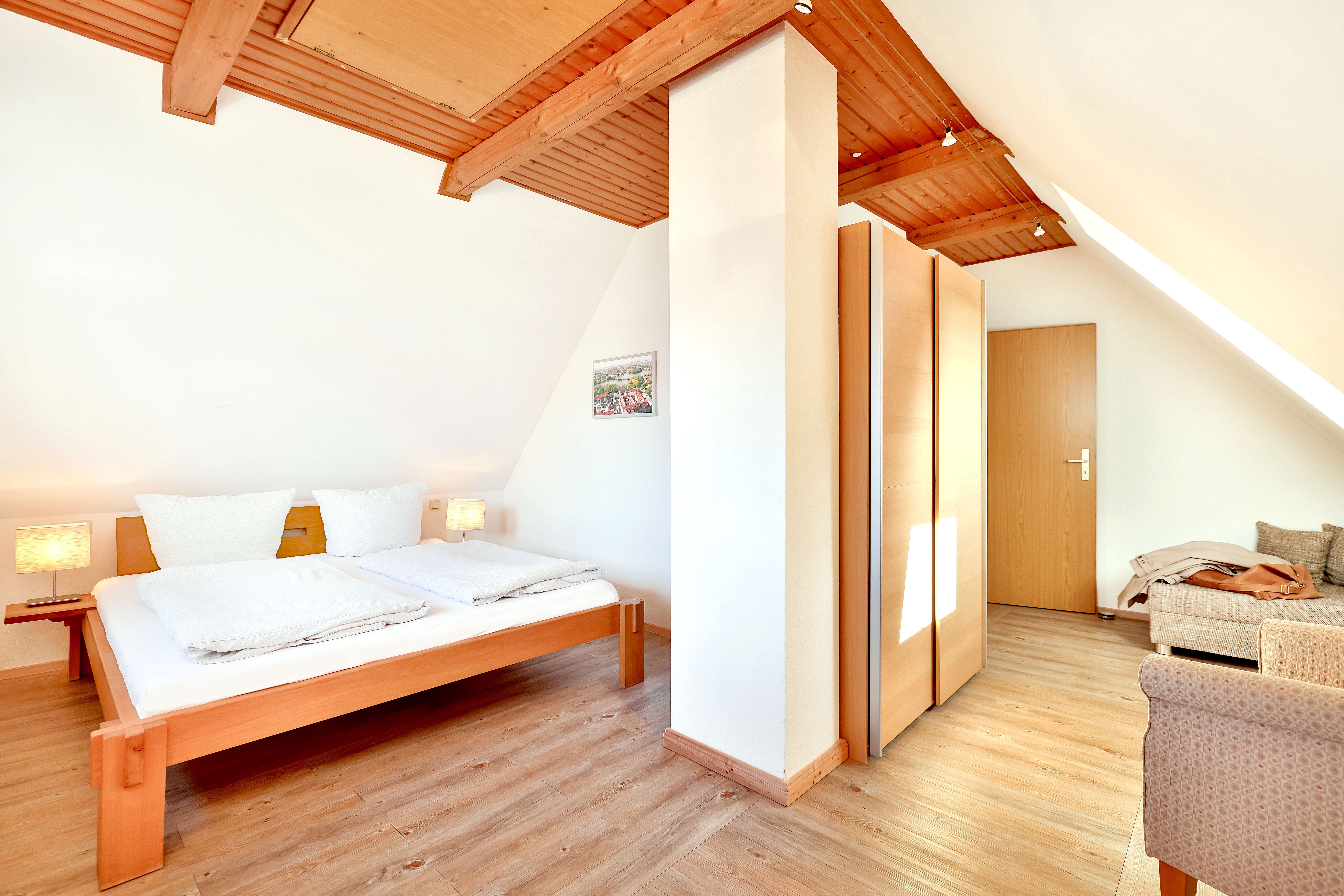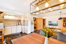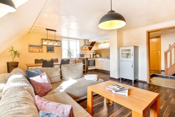Die Ferienwohnung 3 liegt im 2.OG. Die Wohnung besteht aus einem großen Wohnraum mit offener Küche und Essbereich und dem Bad. Über eine innenliegende Holztreppe kommt man in das DG, in dem sich das Badezimmer befindet.