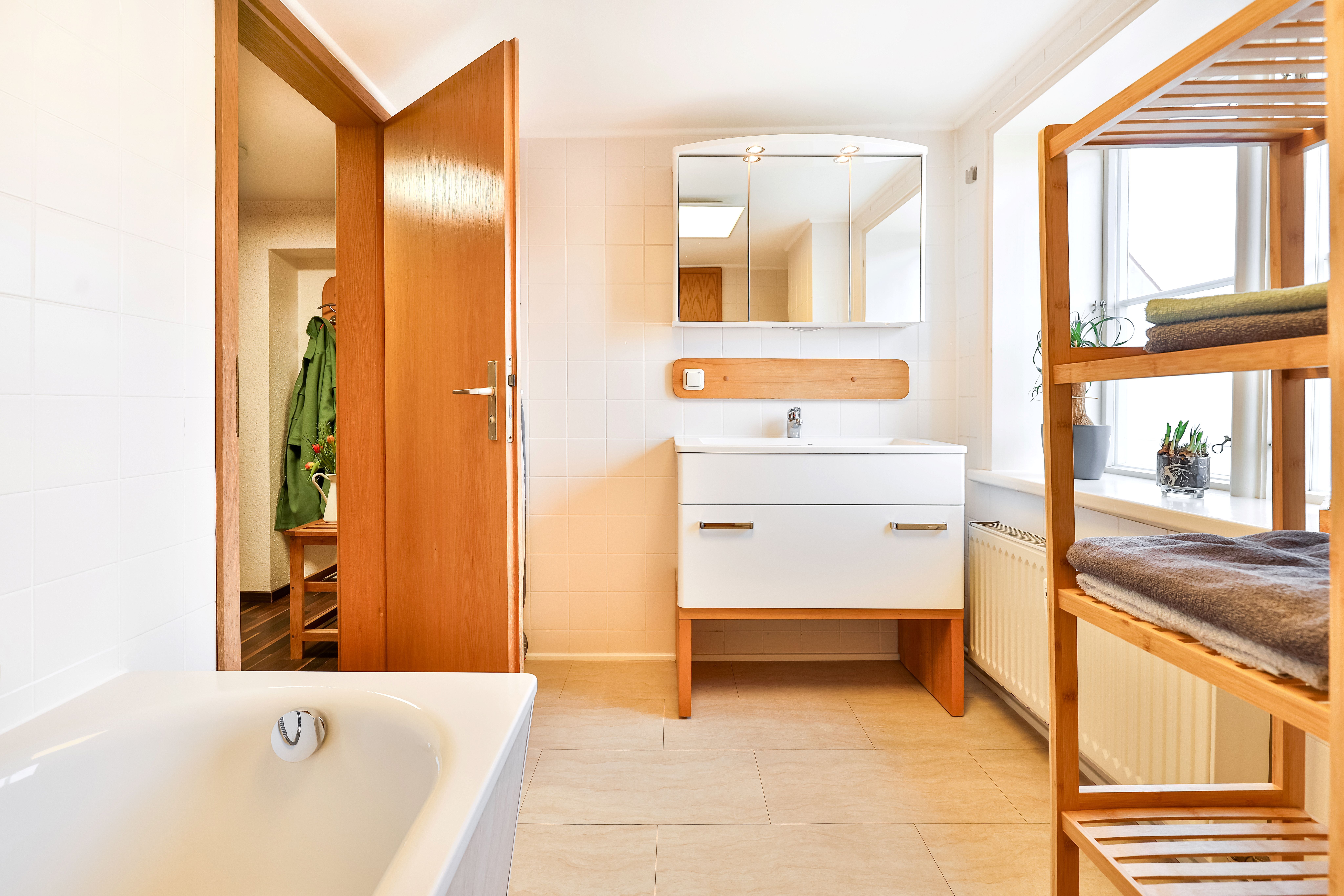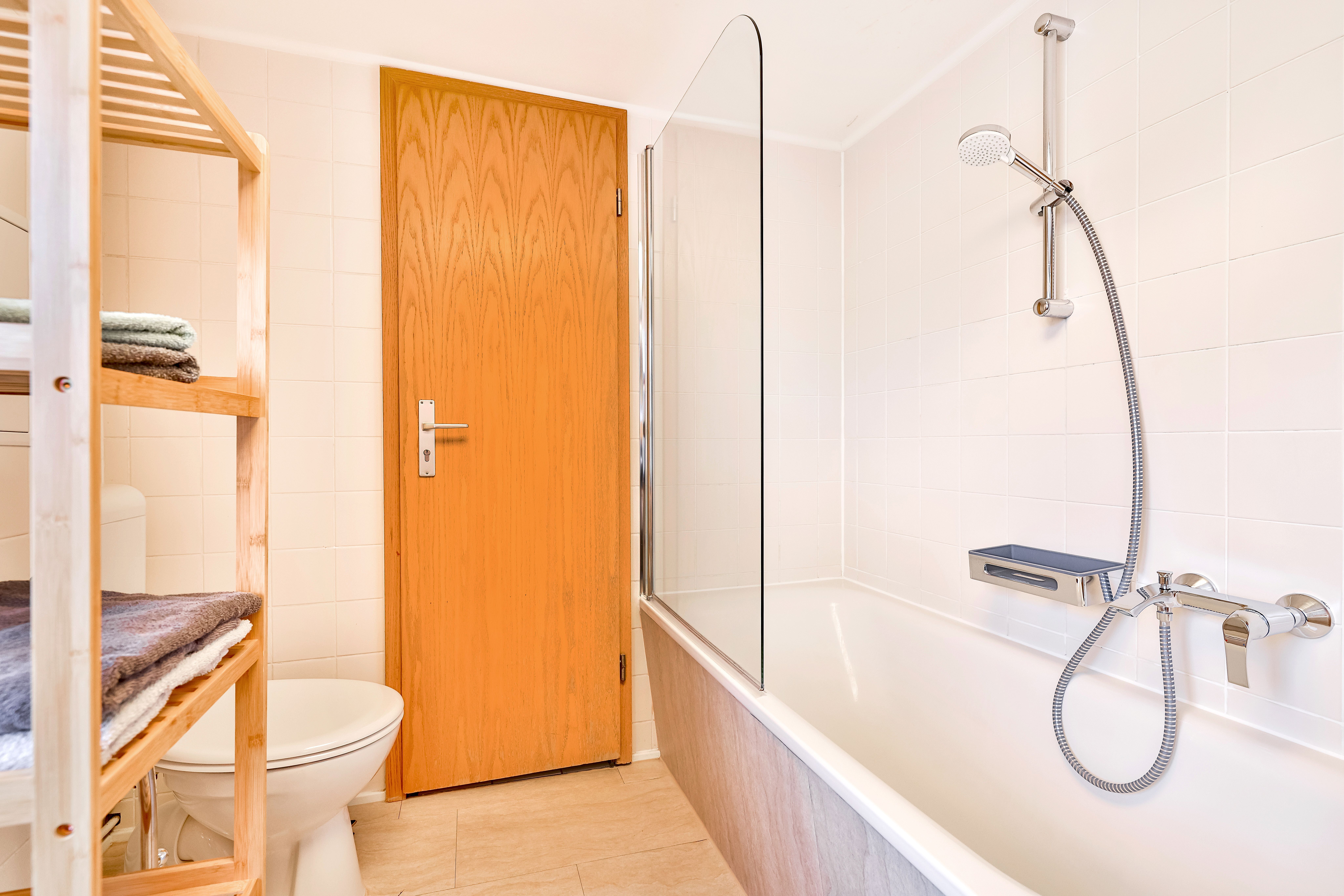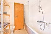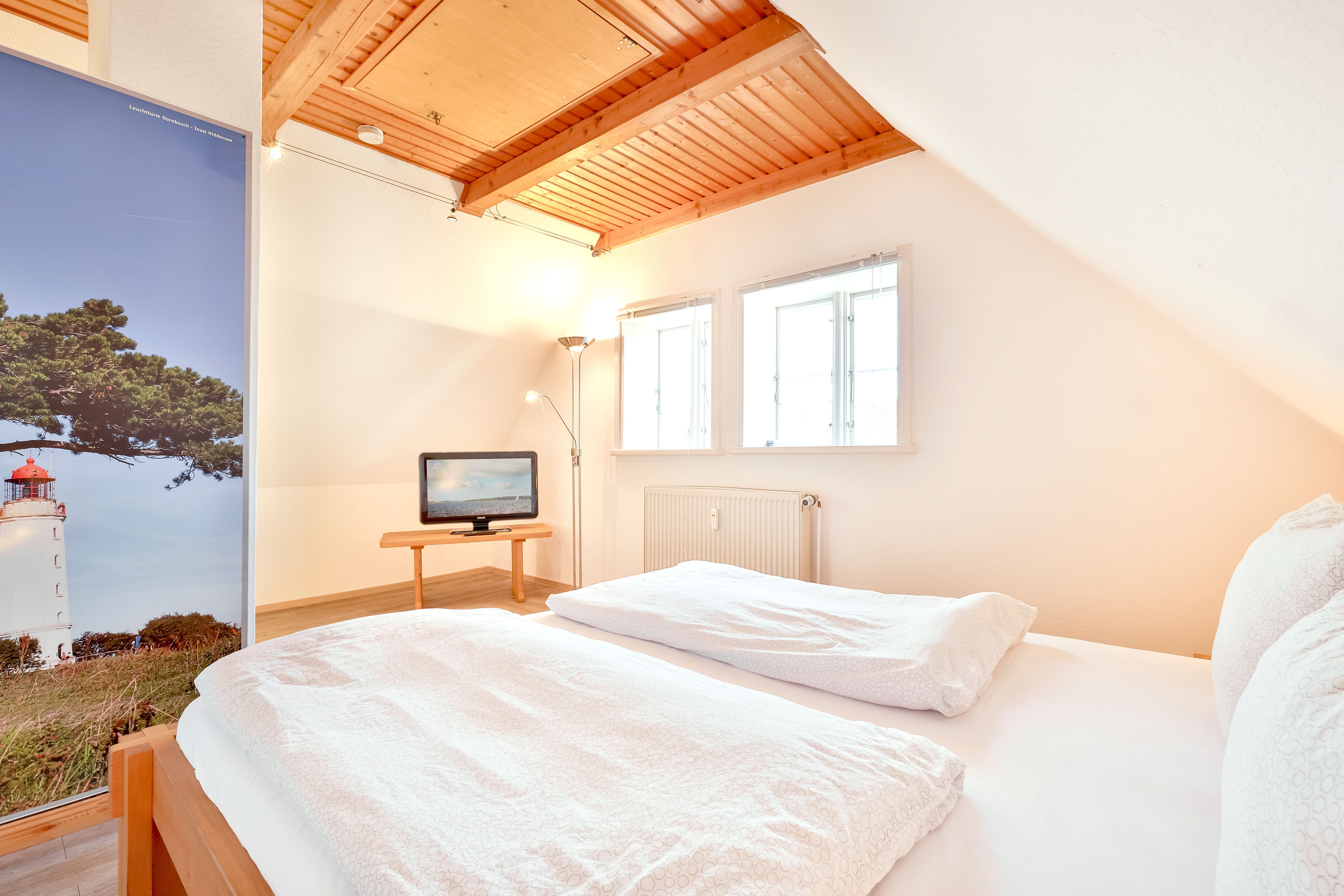 Die Ferienwohnung 3 liegt im 2.OG. Die Wohnung besteht aus einem großen Wohnraum mit offener Küche und Essbereich und dem Bad. Über eine innenliegende Holztreppe kommt man in das DG, in dem sich das Badezimmer befindet.