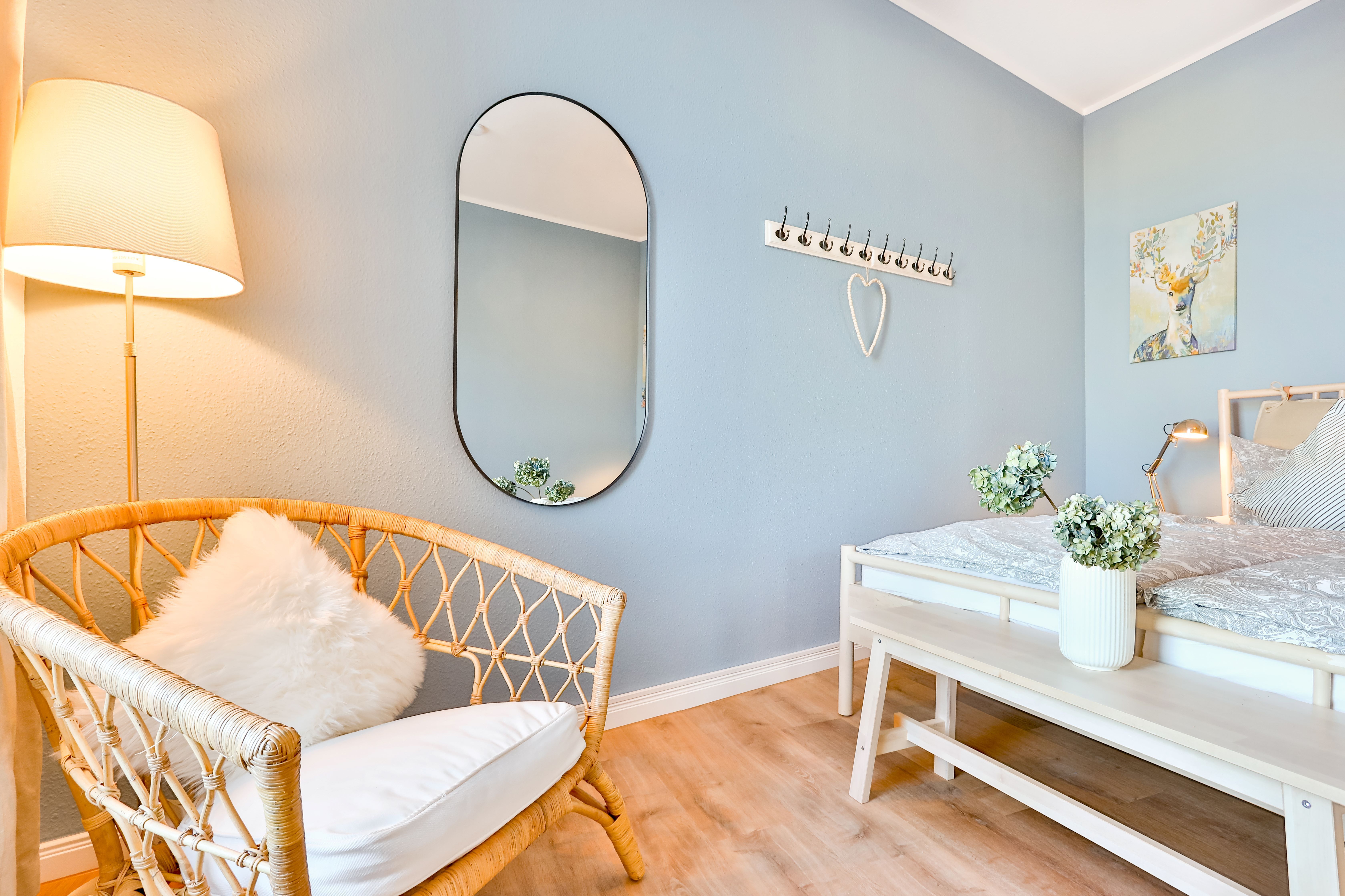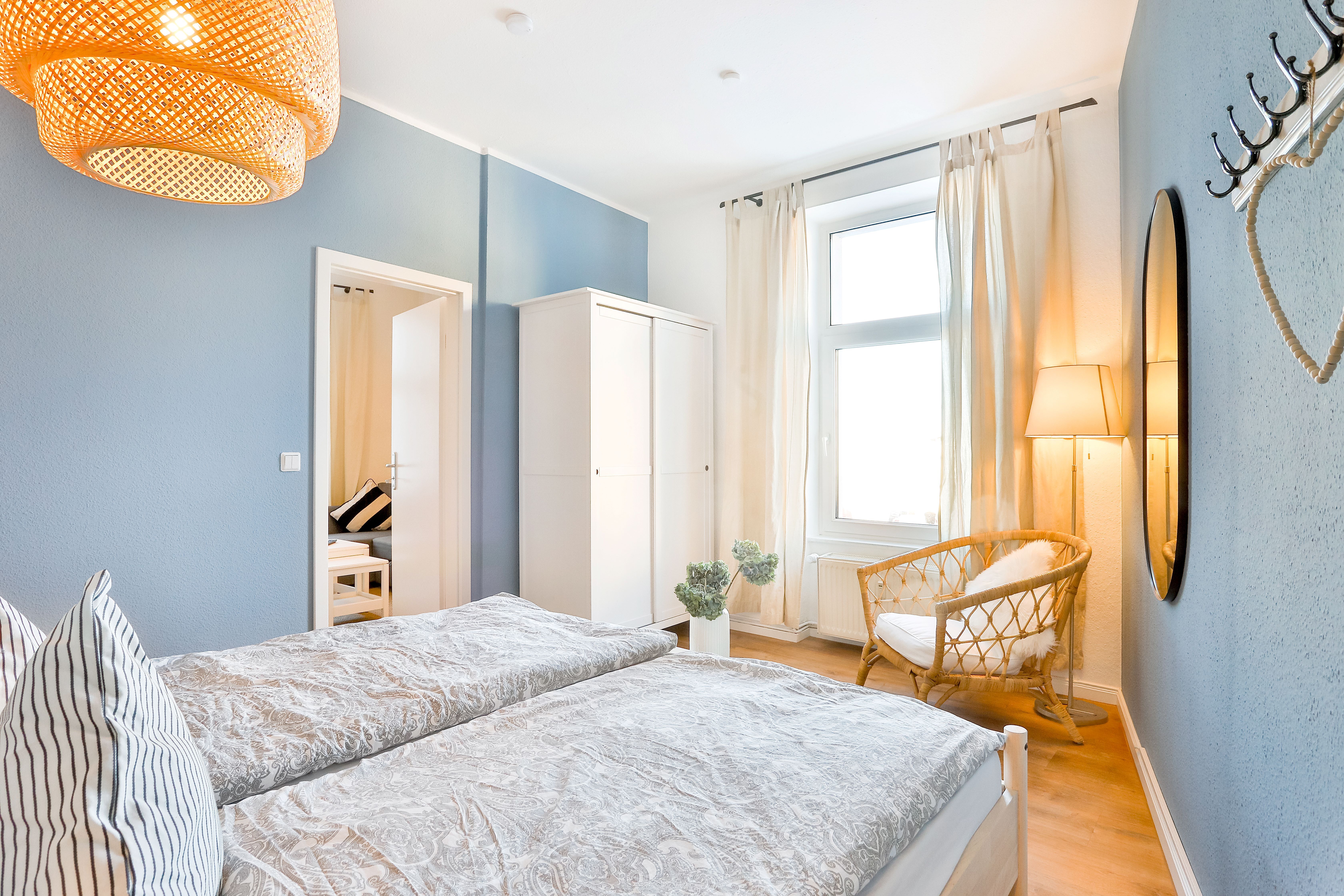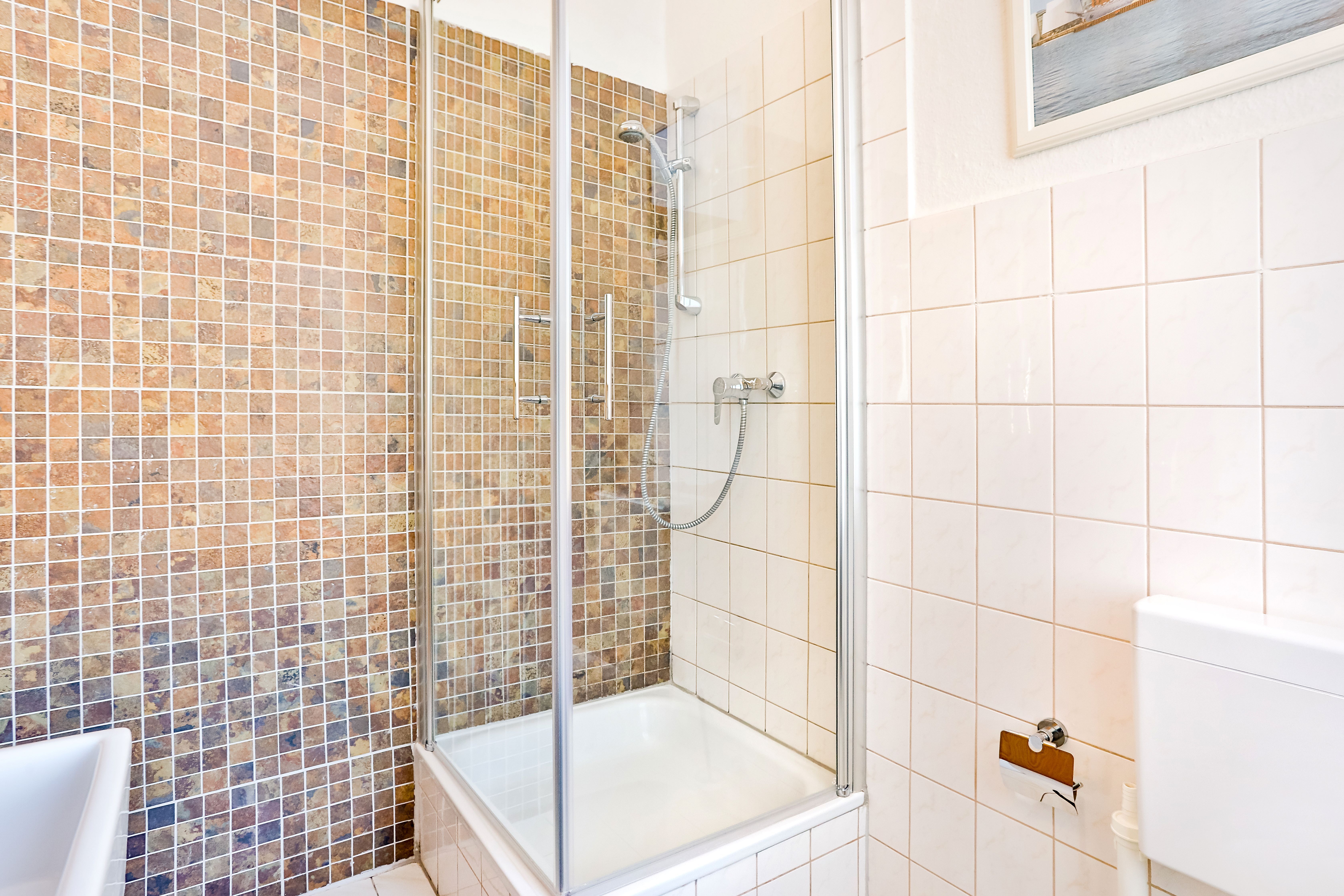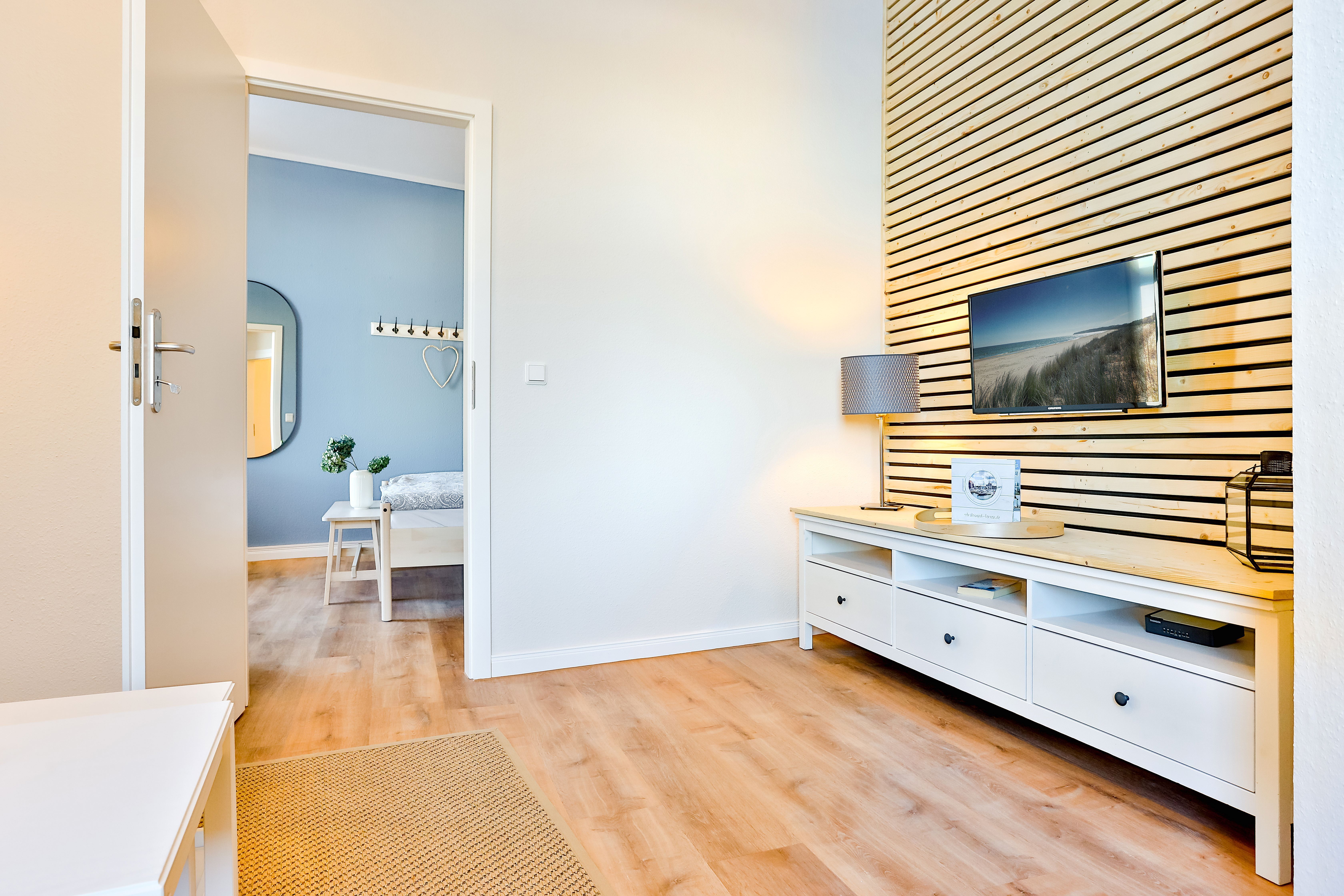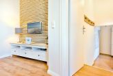 Die Wohnung liegt im 1.OG eines komplett sanierten Apartmenthauses und besteht aus einem Wohnbereich mit Schlafsofe, einer separaten Küche mit Essbereich mit offener Küche sowie einem Schlafzimmer mit einem Doppelbett. Das Bad verfügt über WC und Dusche.