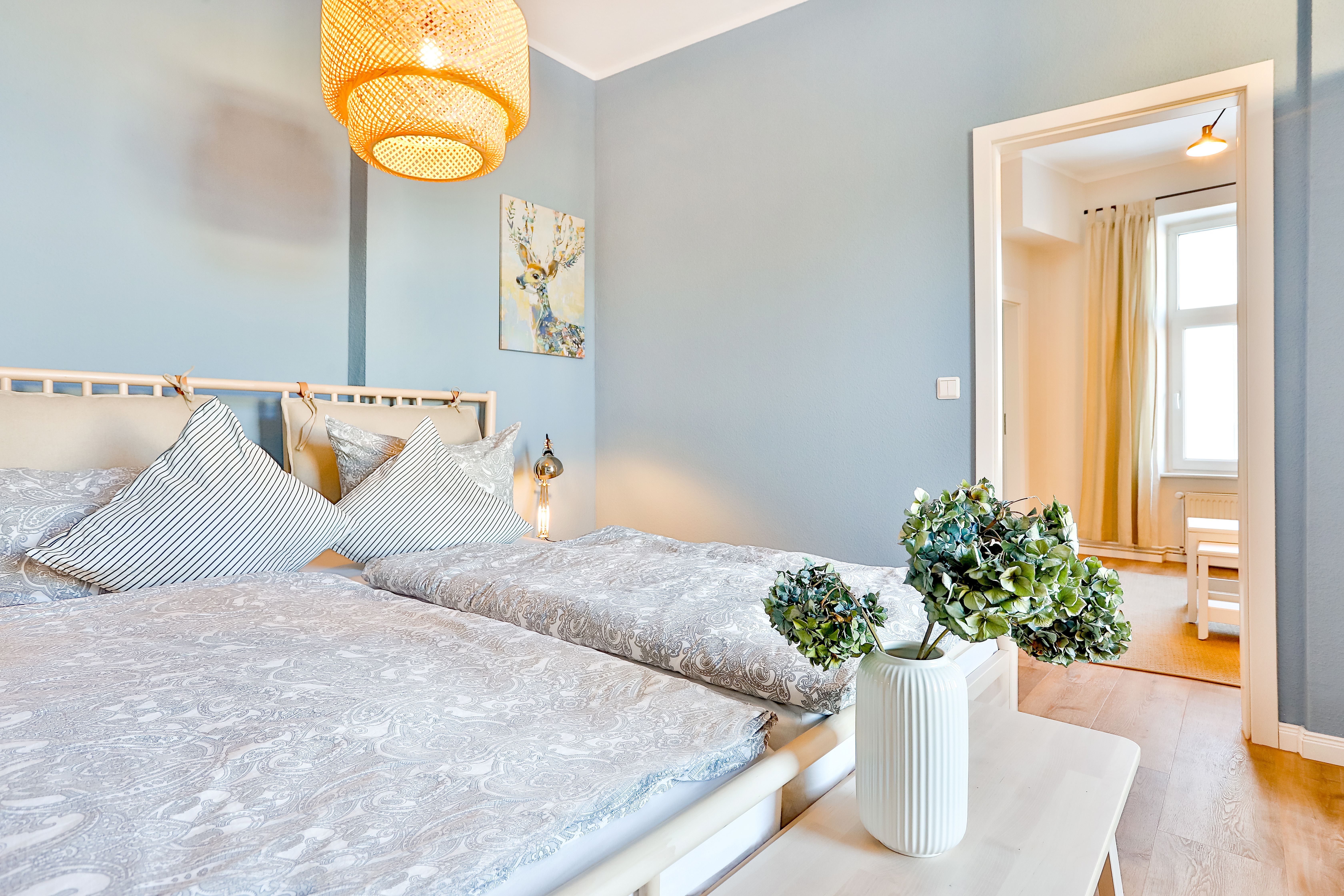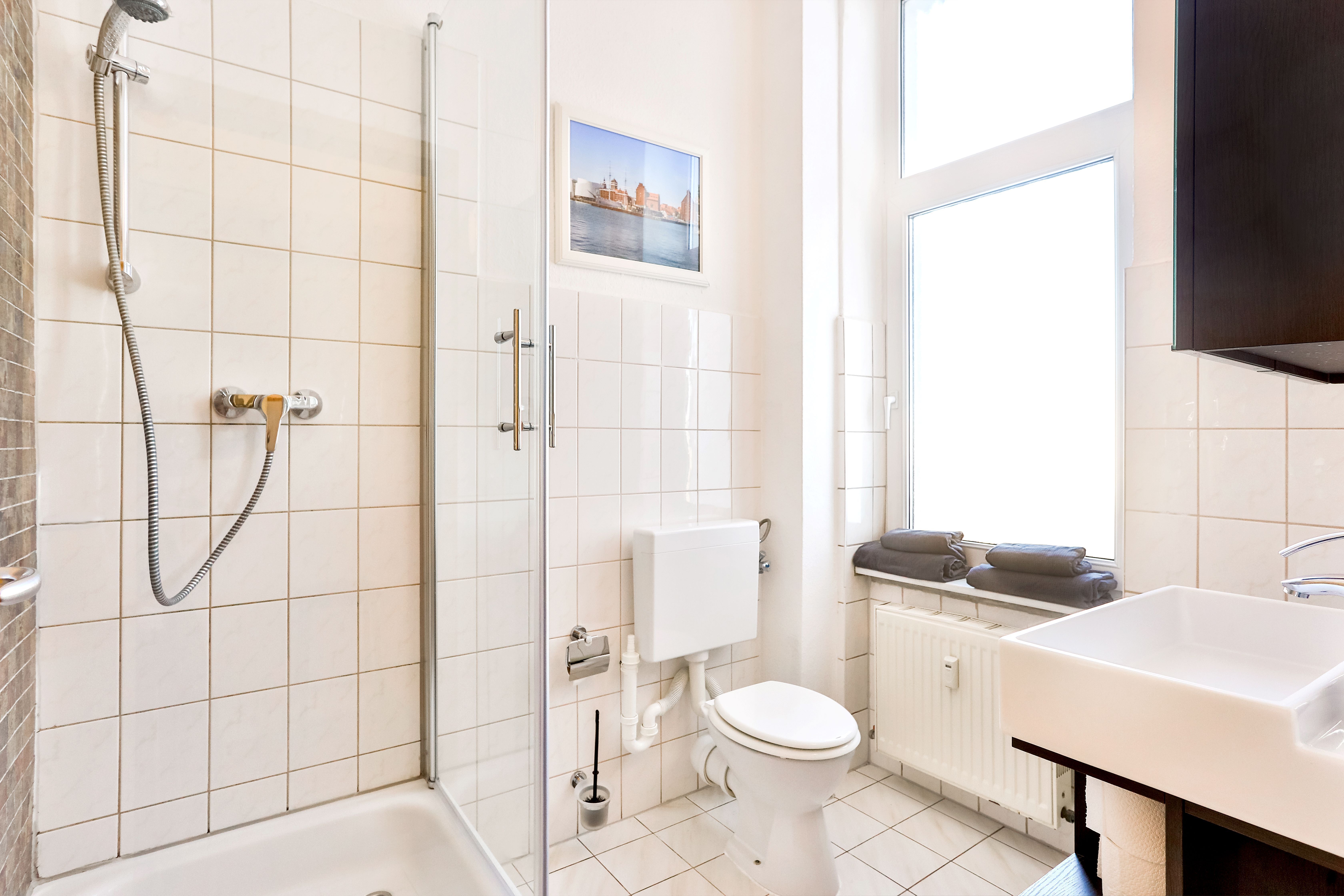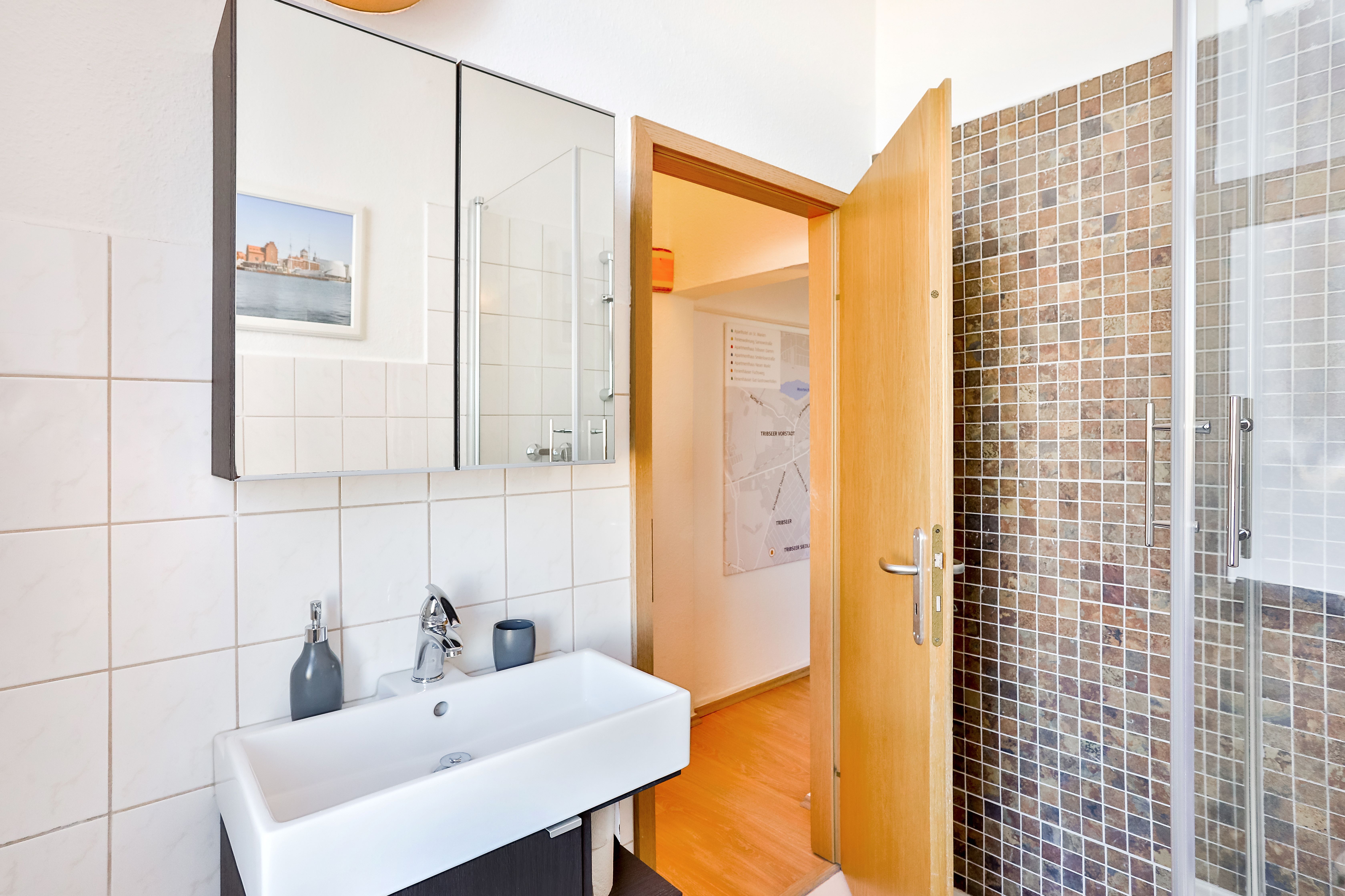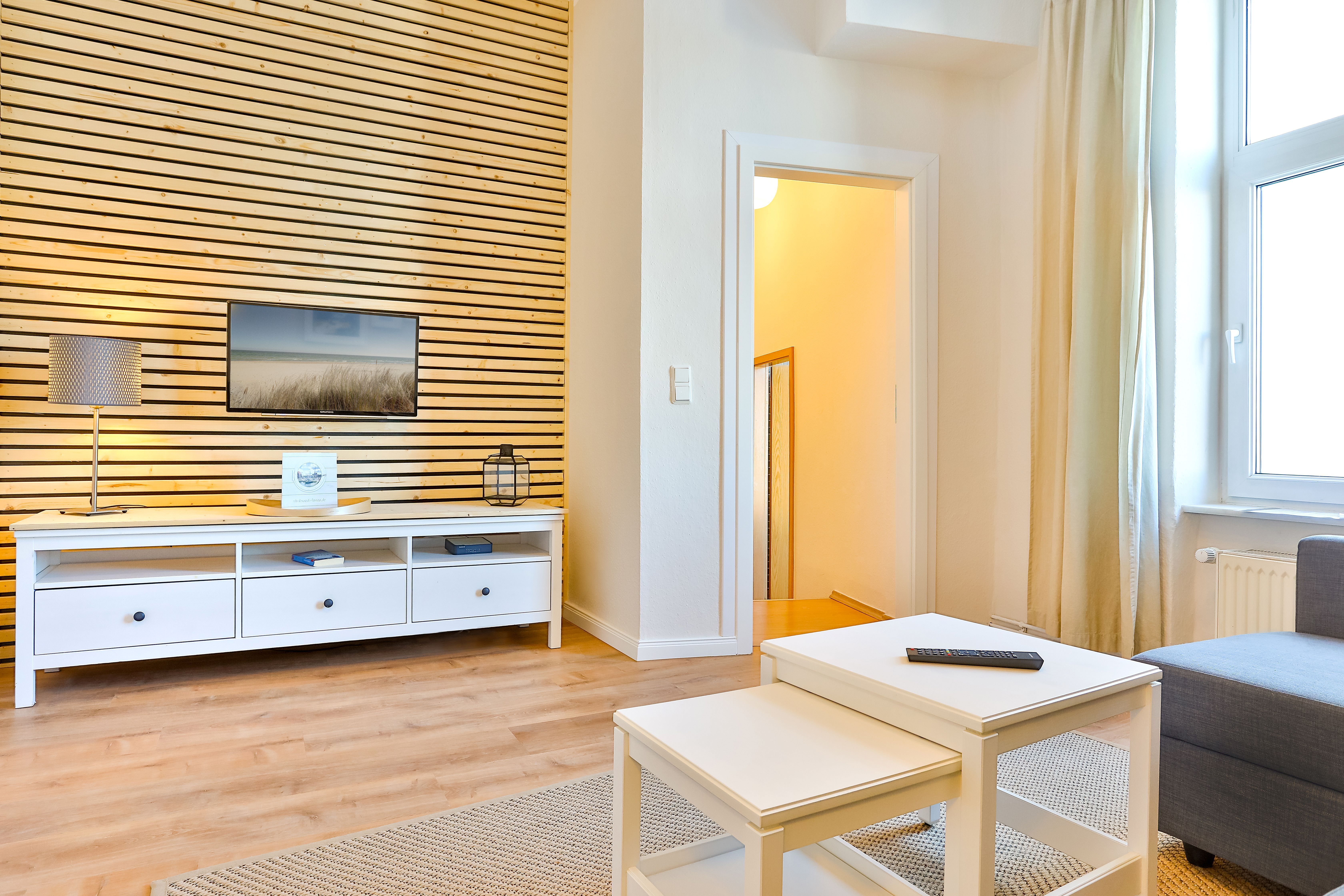 Die Wohnung liegt im 1.OG eines komplett sanierten Apartmenthauses und besteht aus einem Wohnbereich mit Schlafsofe, einer separaten Küche mit Essbereich mit offener Küche sowie einem Schlafzimmer mit einem Doppelbett. Das Bad verfügt über WC und Dusche.
