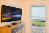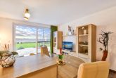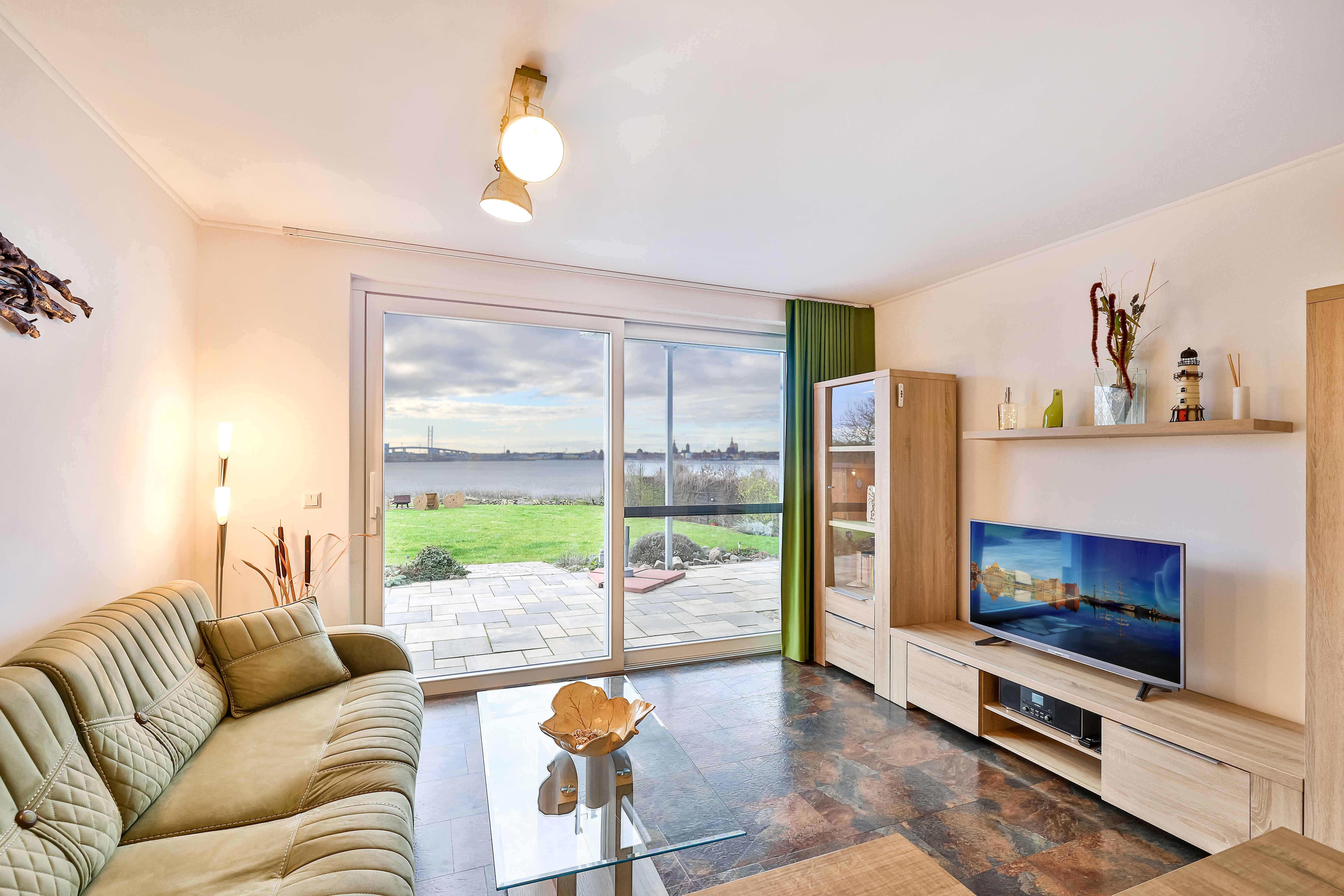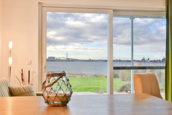 Vom Wohnzimmer aus kommt man auf die zur Wohnung gehörende Terrasse mit dem Panoramablick nach Stralsund.