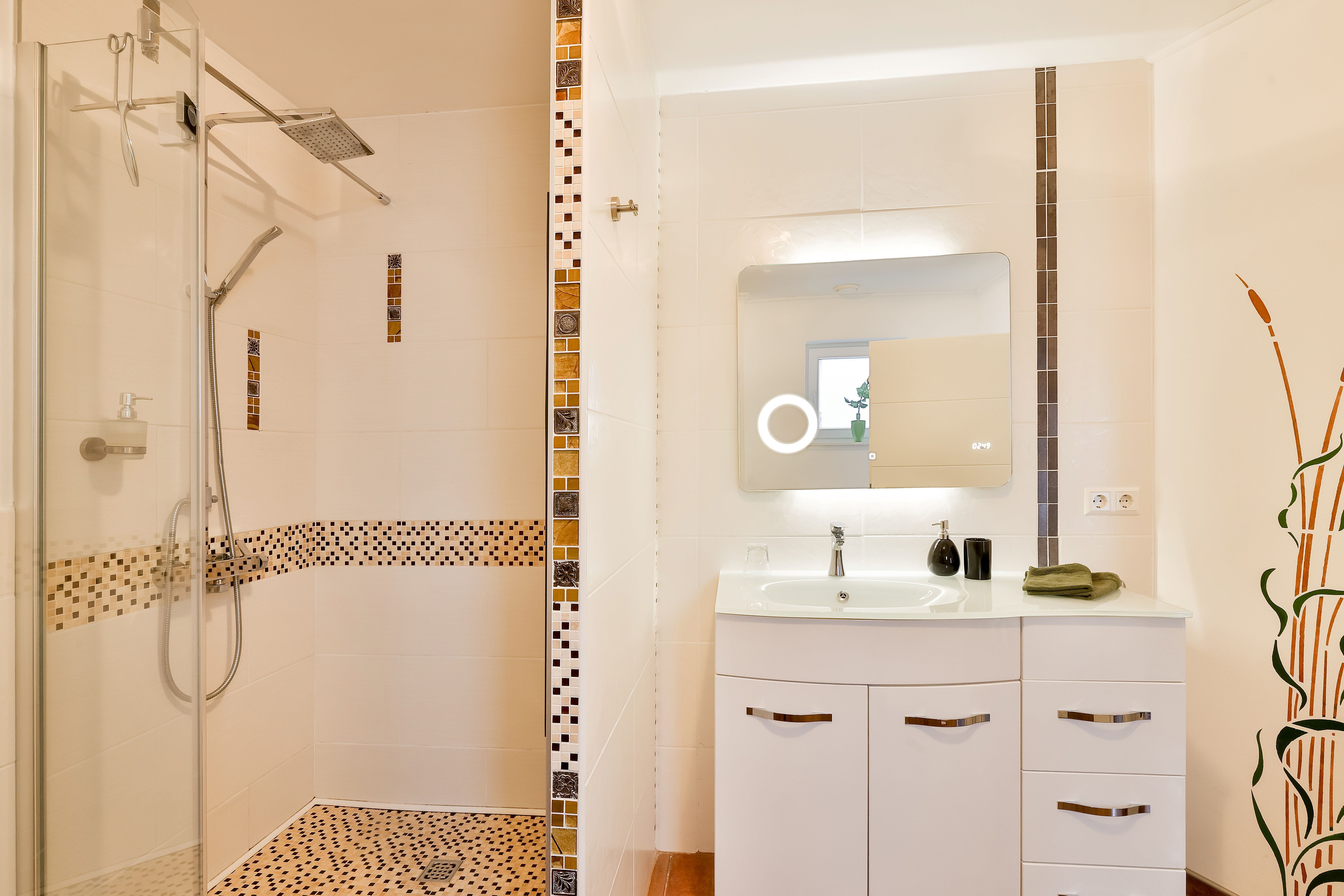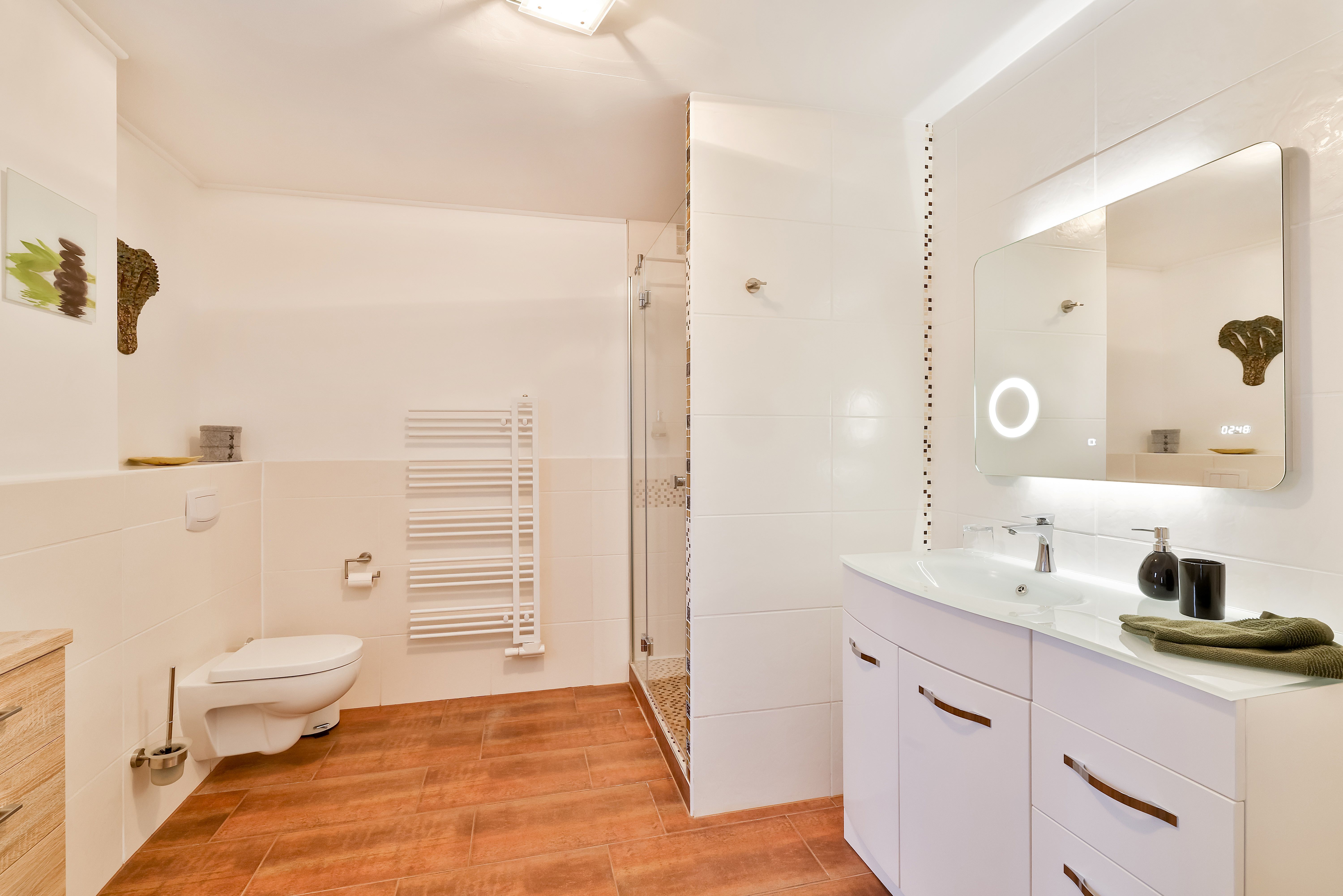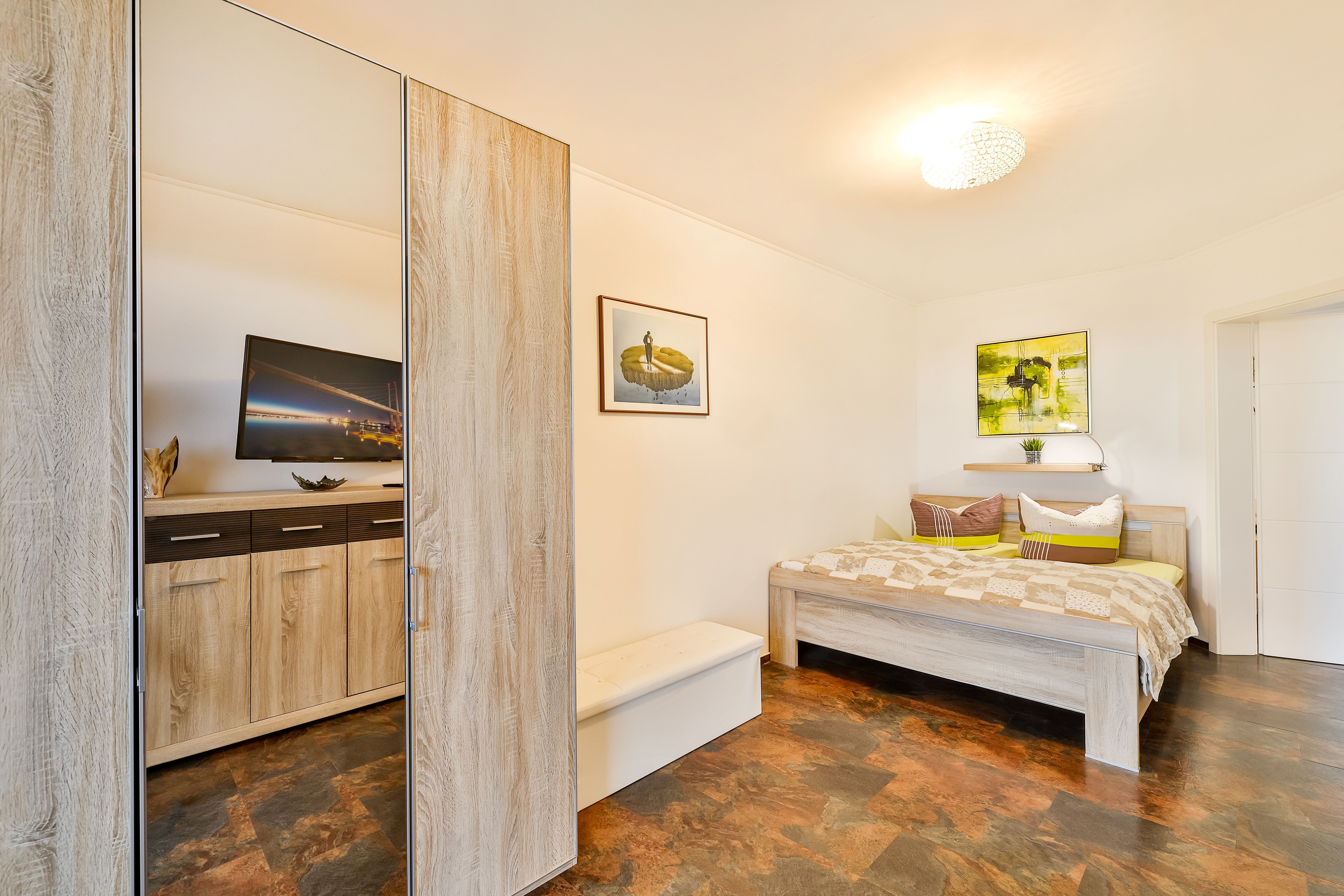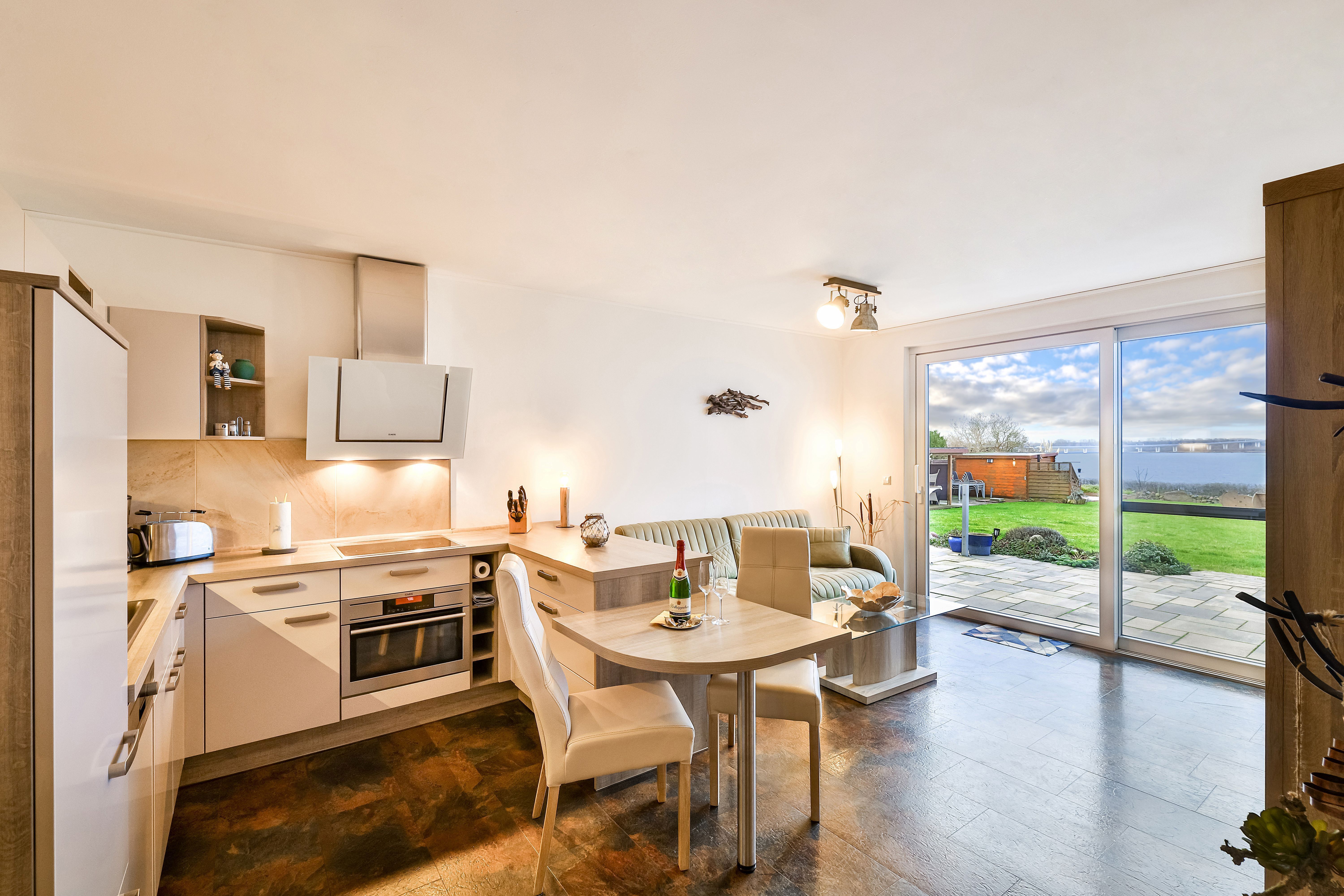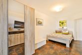Die Ferienwohnung Vineta befindet sich im Erdgeschoß und hat einen eigenen Hauseingang. In das große Wohnzimmer sind die Küche und der Essbereich eingegliedert. Das Schlafzimmer mit einem Doppelbett und das große Badezimmer sind jeweils vom Flur und vom Wohnzimmern einzeln zu betreten.