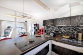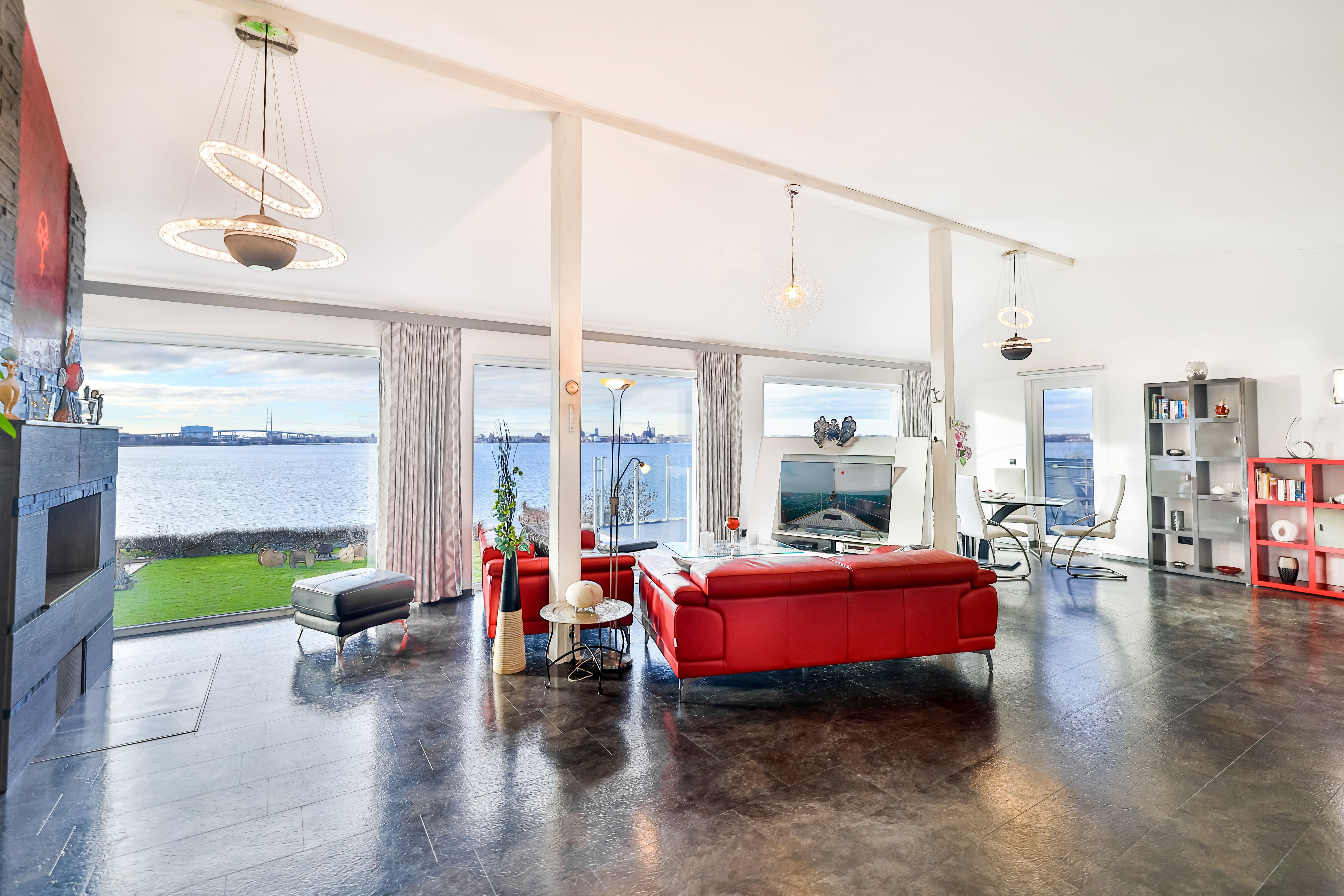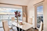 Vom Wohnzimmer aus kommt man auf die zur Wohnung gehörende Terrasse mit dem Panoramablick nach Stralsund.