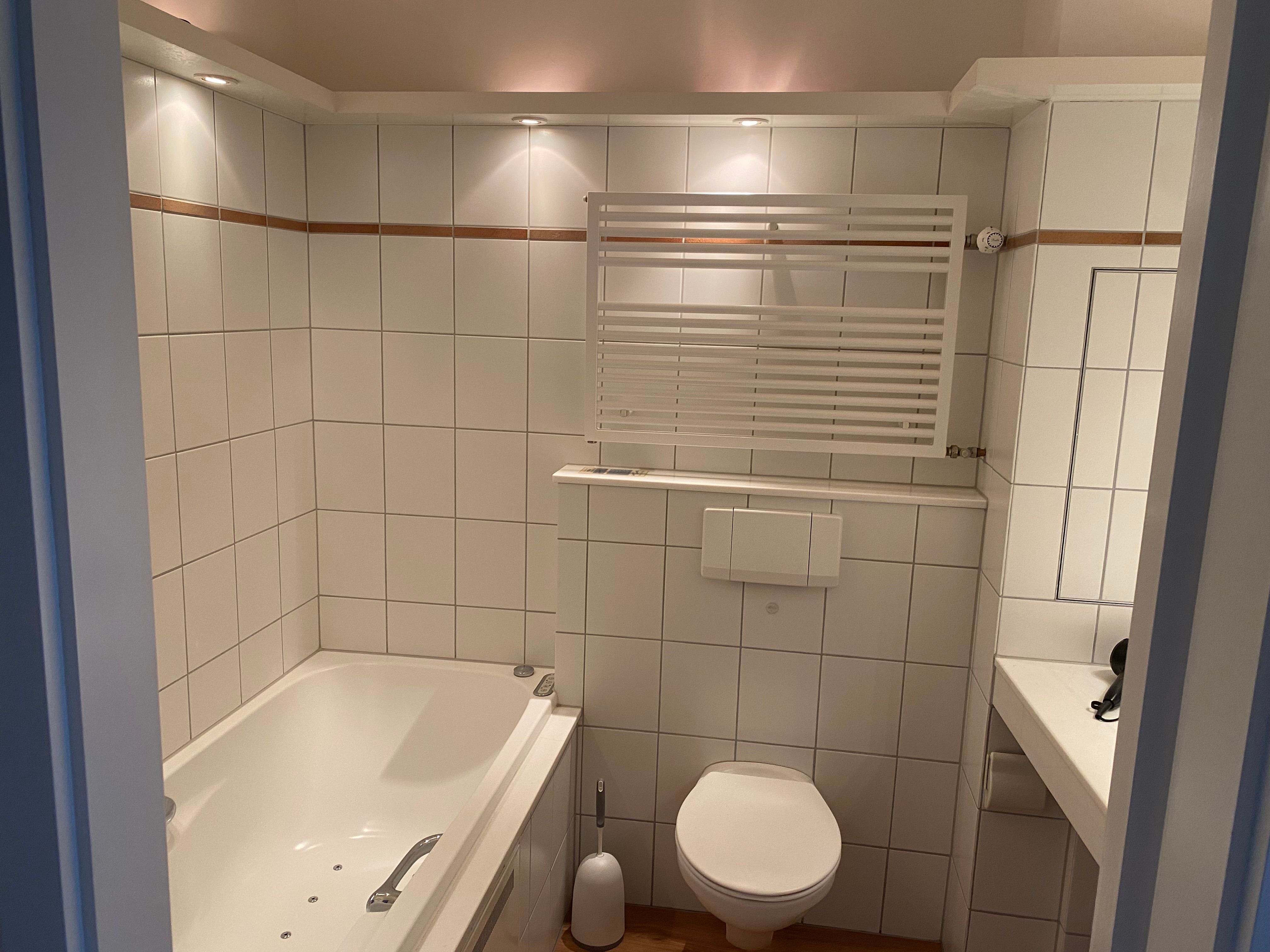 In 2024 renovietes Apartment mit Wohnzimmer mit Balkon, Badezimmer und Badewanne und Küche.