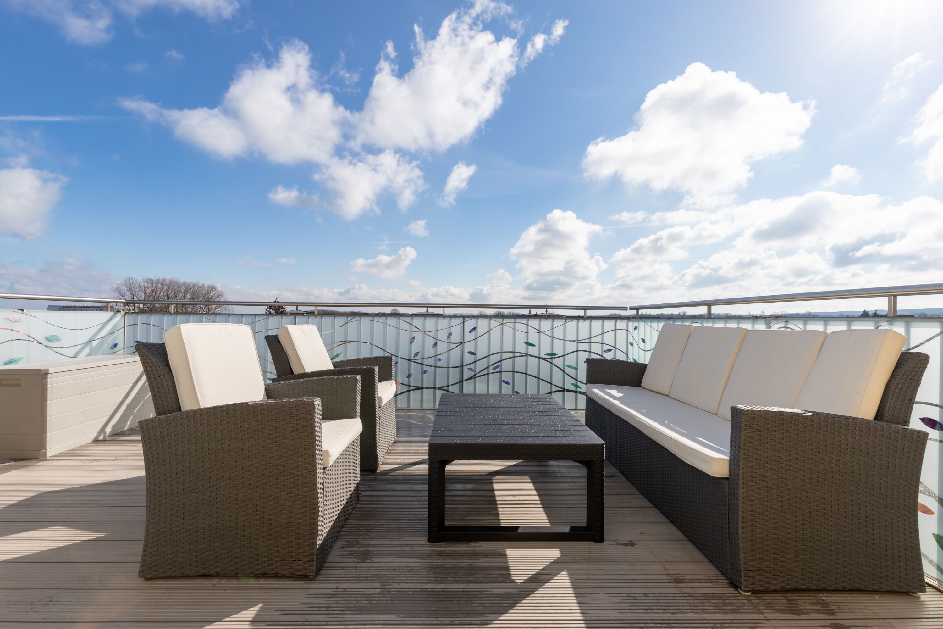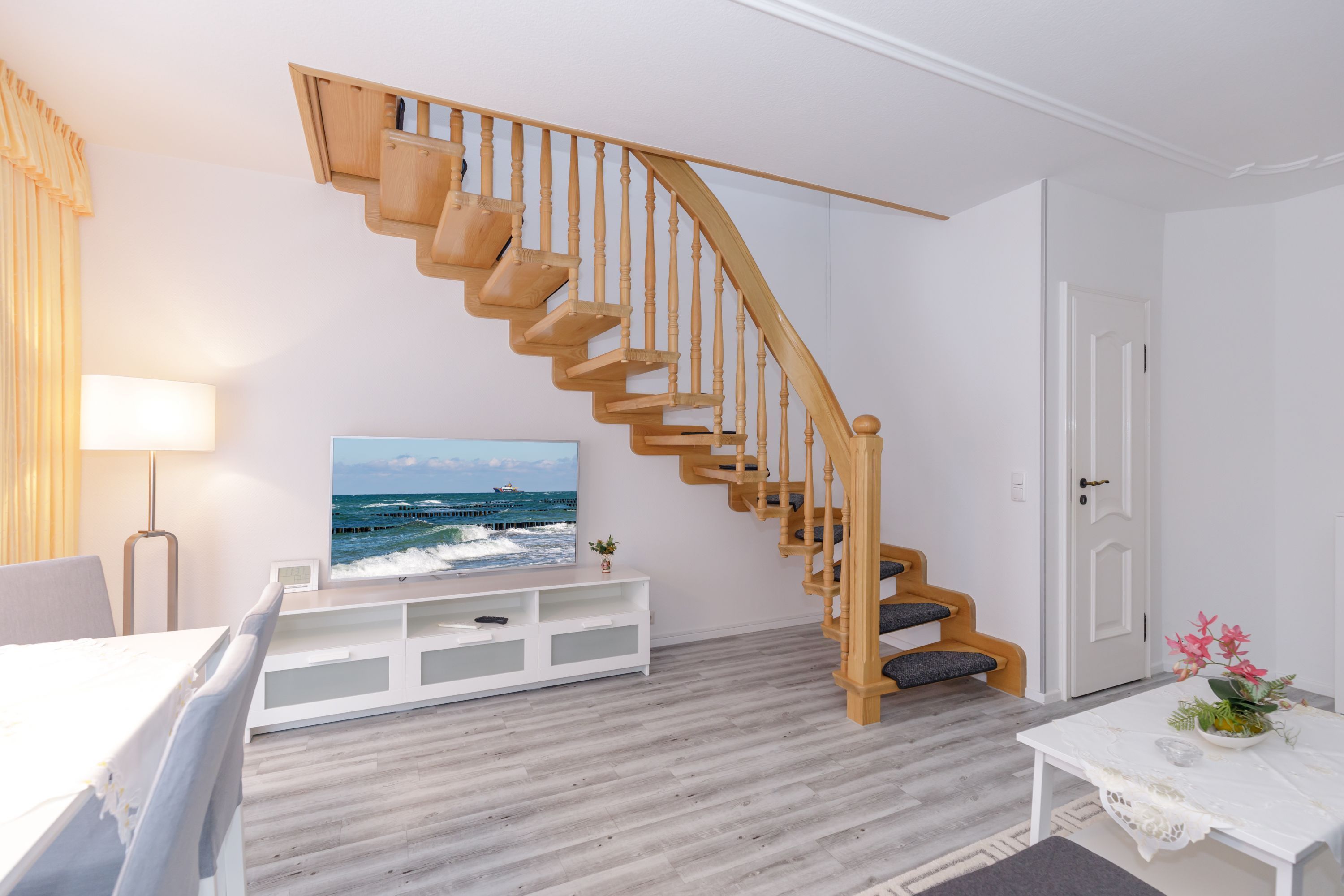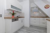 Mit dem Fahrstuhl gelangen Sie in das Appartement im 4. Obergeschoss. Über eine Treppe erreichen Sie den Schlafbereich auf der Galerie. Es verfügt über ein geräumiges Wohnzimmer mit Essbereich einem Flachbild-TV, ein Schlafzimmer mit Doppelbett sowie ein Badezimmer mit Dusche. Über die Galerie erreichen Sie die Dachterrasse, die einen exklusiven Blick auf Kühlungsborn bietet.