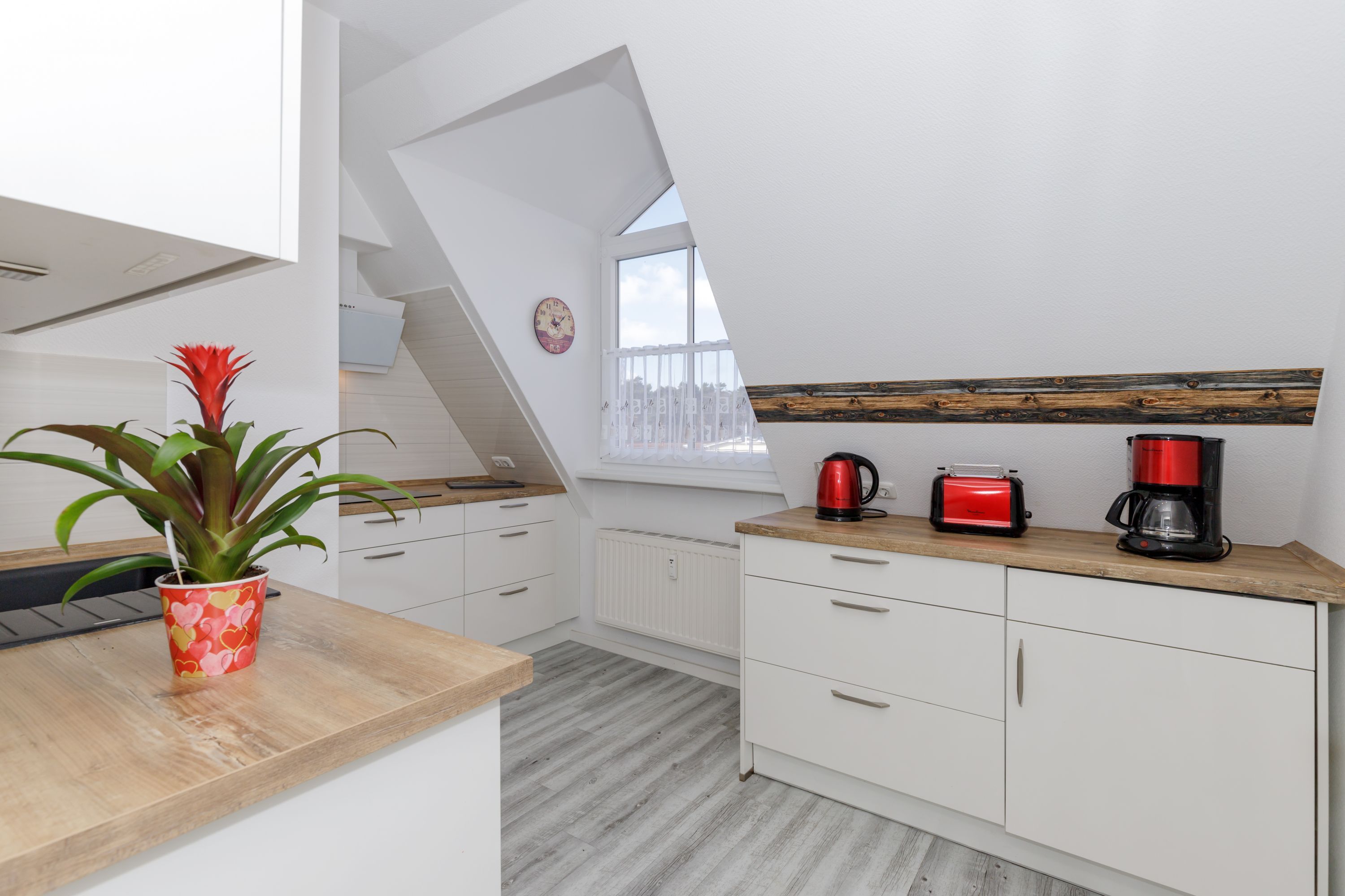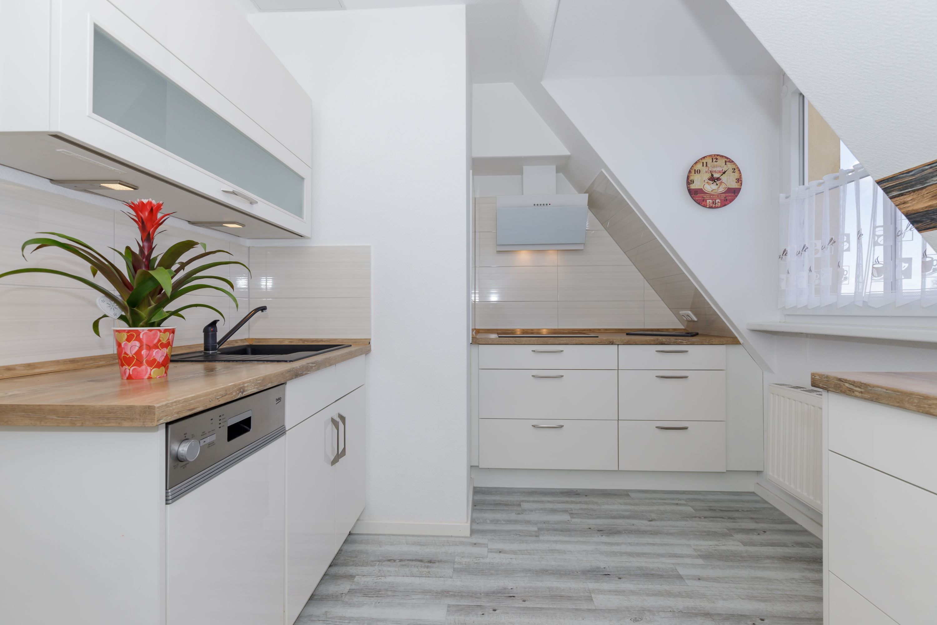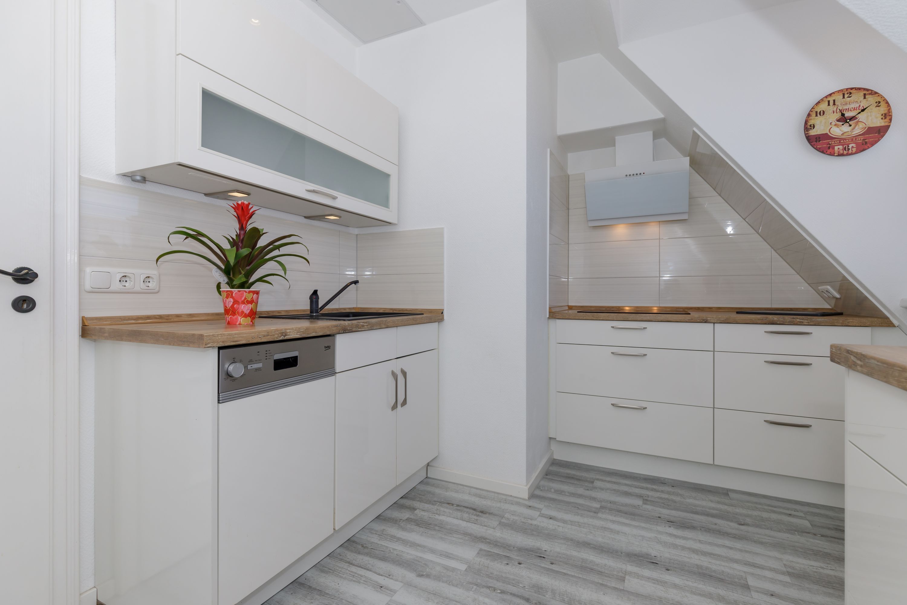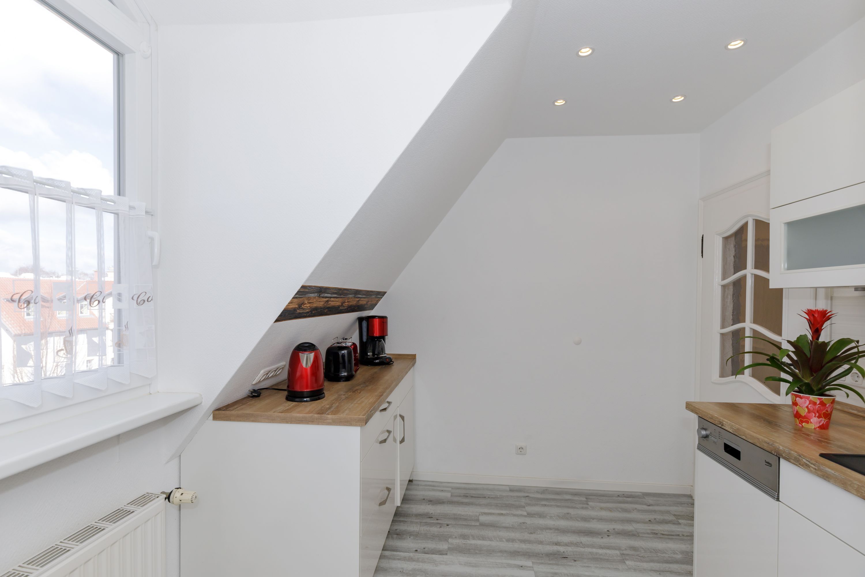 Die separate Küche ist gut ausgestattet mit einem Kühlschrank mit Gefrierfach, einer Spüle, einem Geschirrspüler, einem Cerankochfeld, einem Toaster und einer Kaffeemaschine.