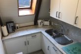 Einbauküche mit Geschirrspüler, Backofen und Kühlschrank mit Gefrierfach, Kaffeemaschine, Toaster und Wasserkocher.