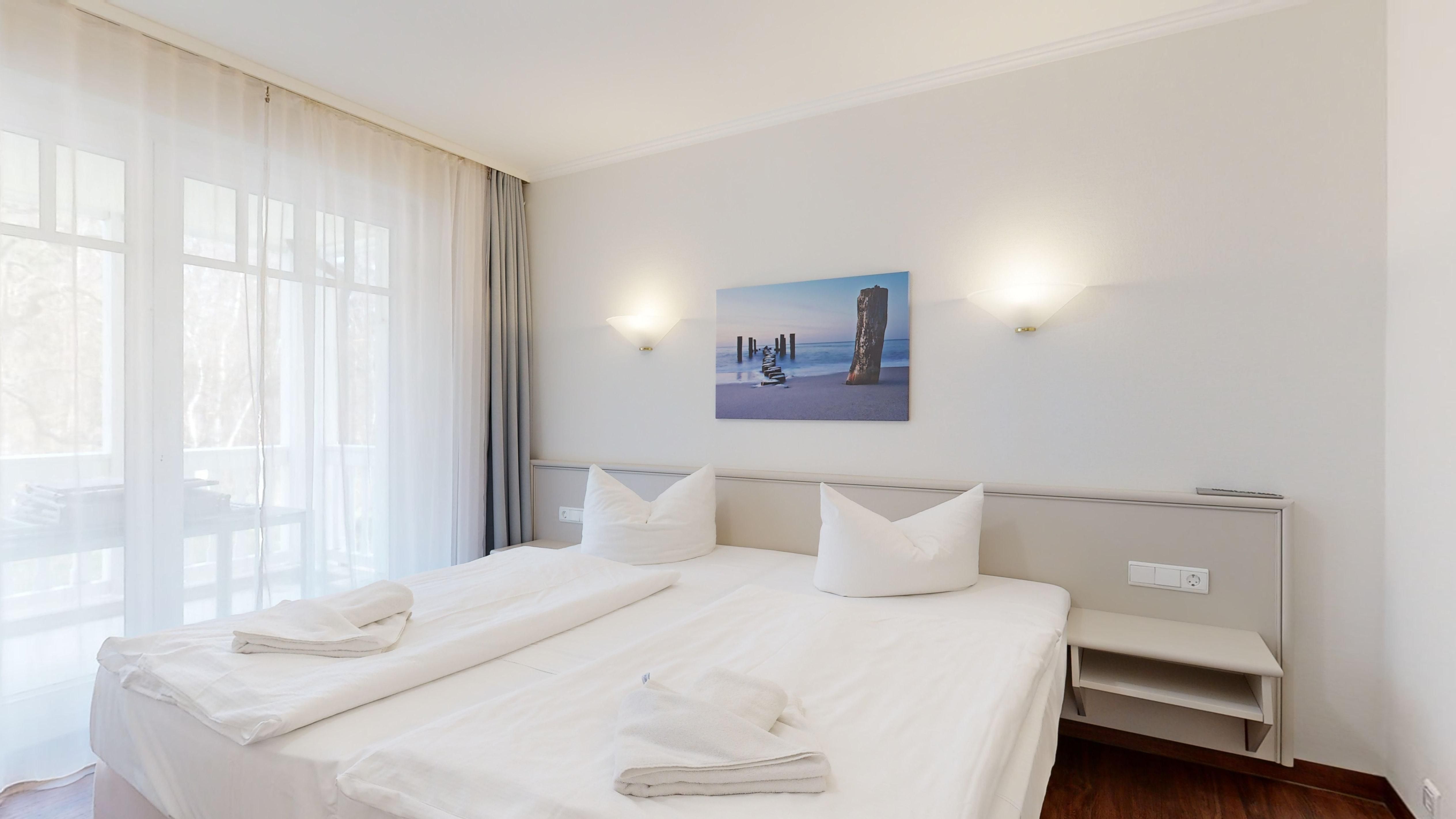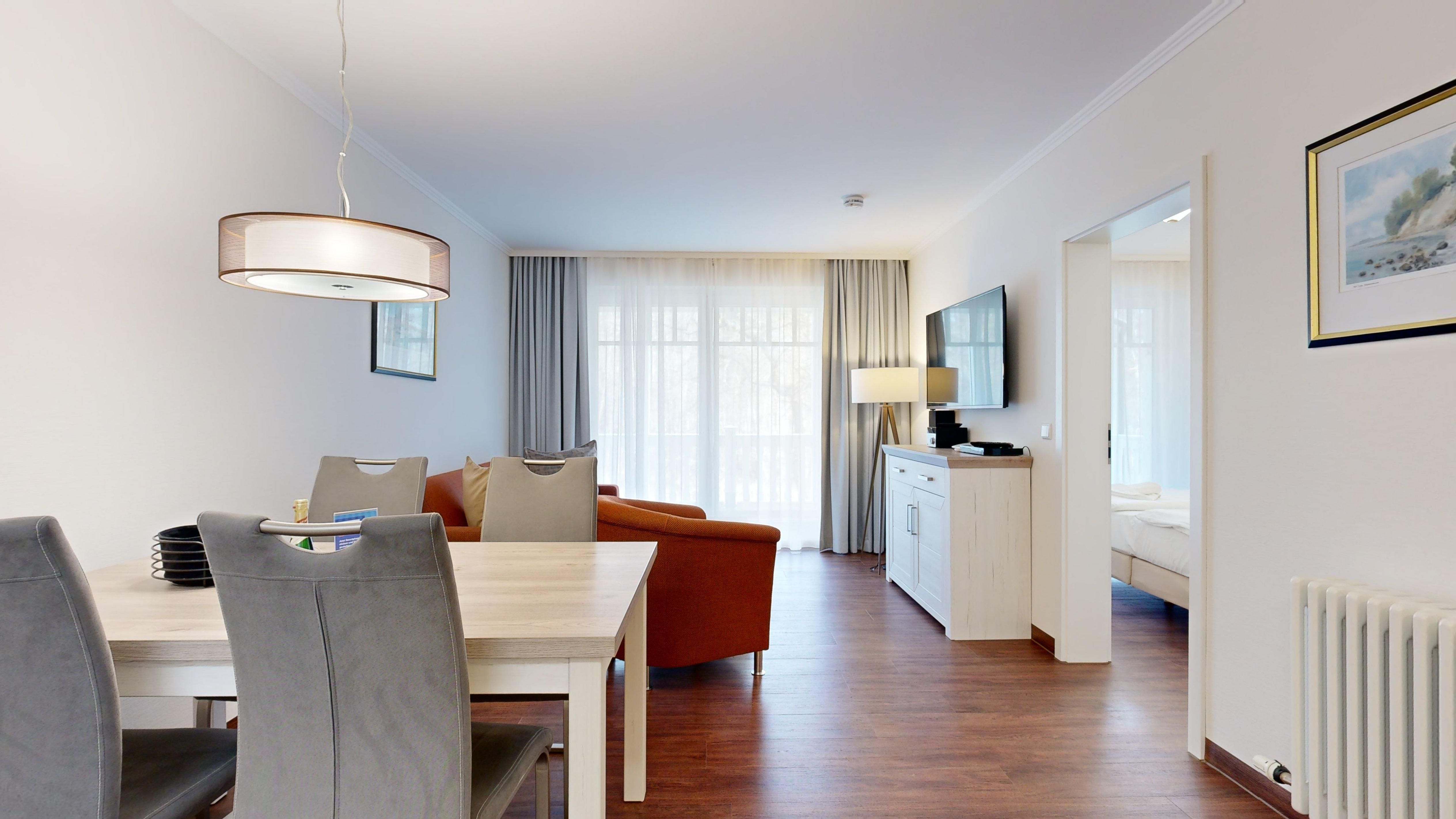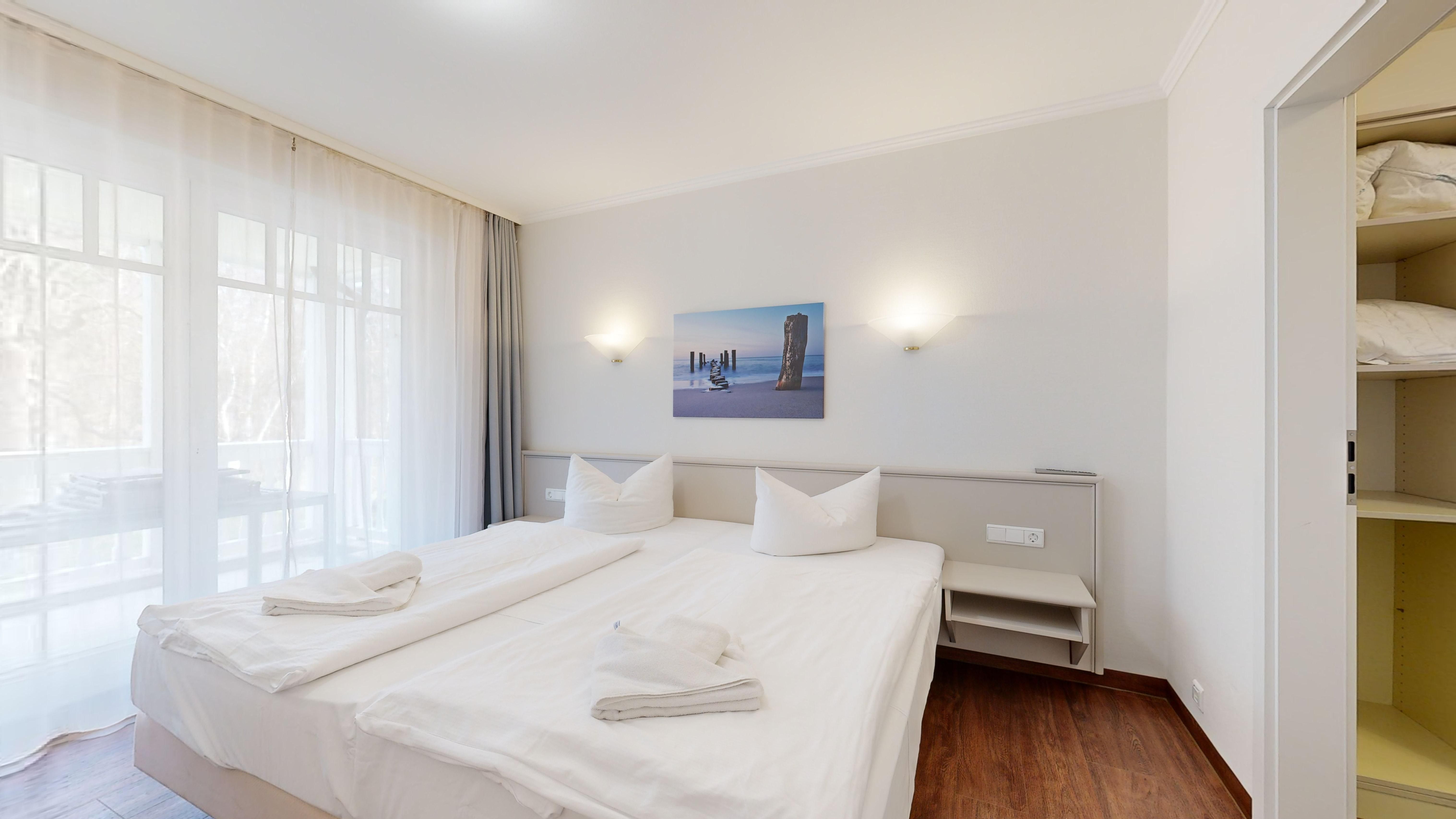 Im Dünenpark Binz befindet sich im Haus 6 die großzügige Komfort-Ferienwohnung im 1. Obergeschoss (2 Zimmer / 52 m²) mit 1 Schlafzimmer, einer Schlafcouch und mit großem Balkon