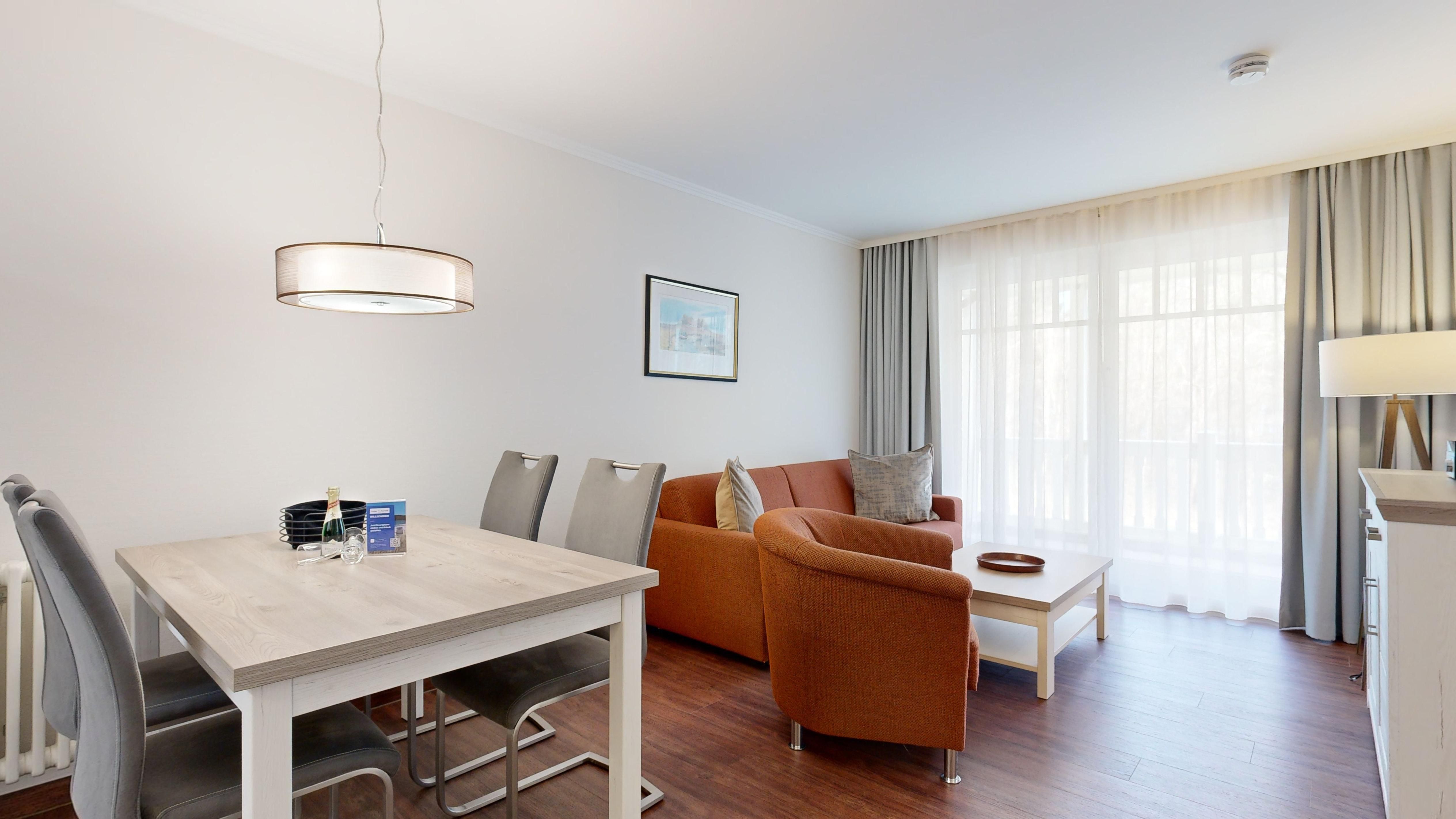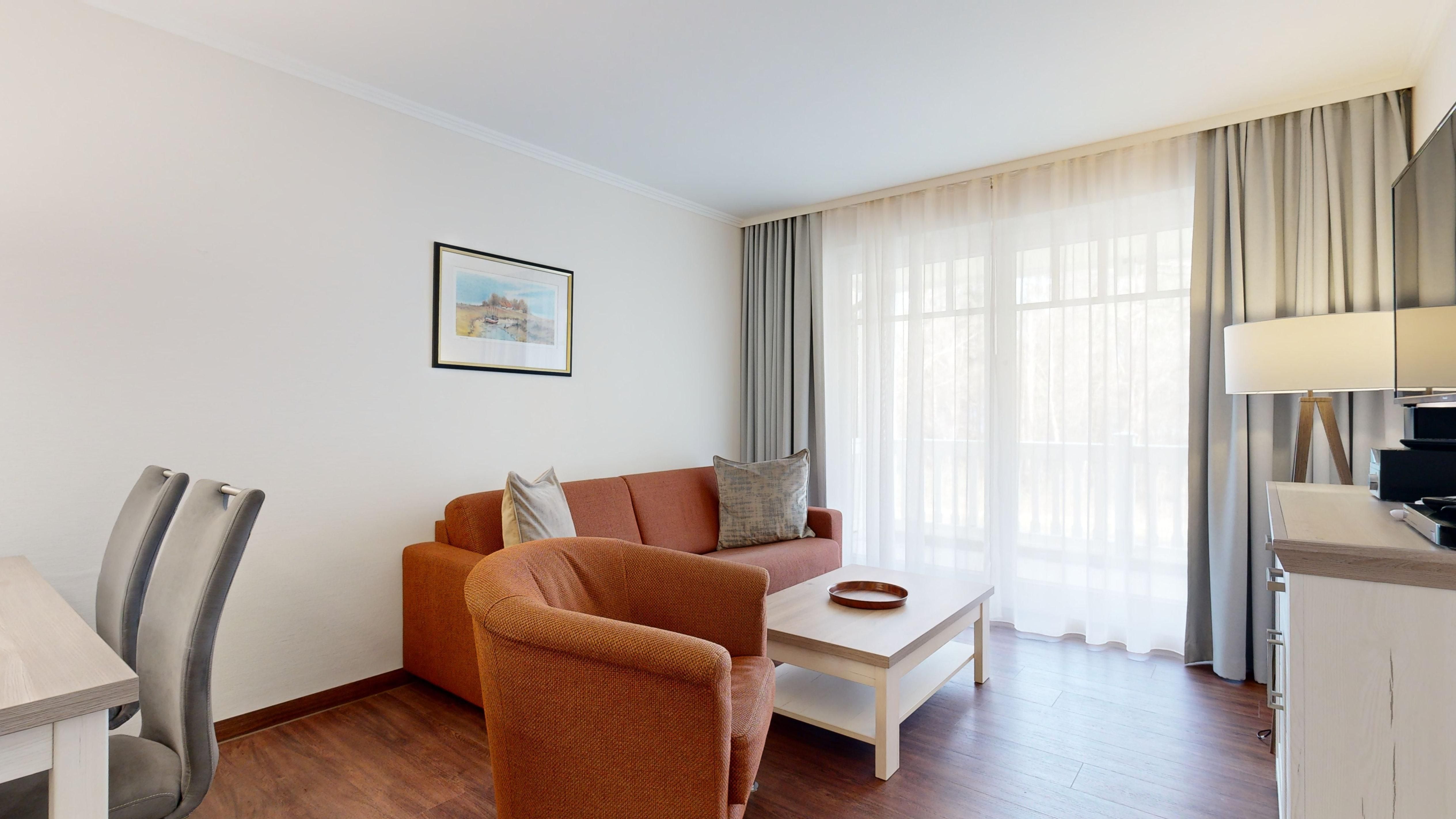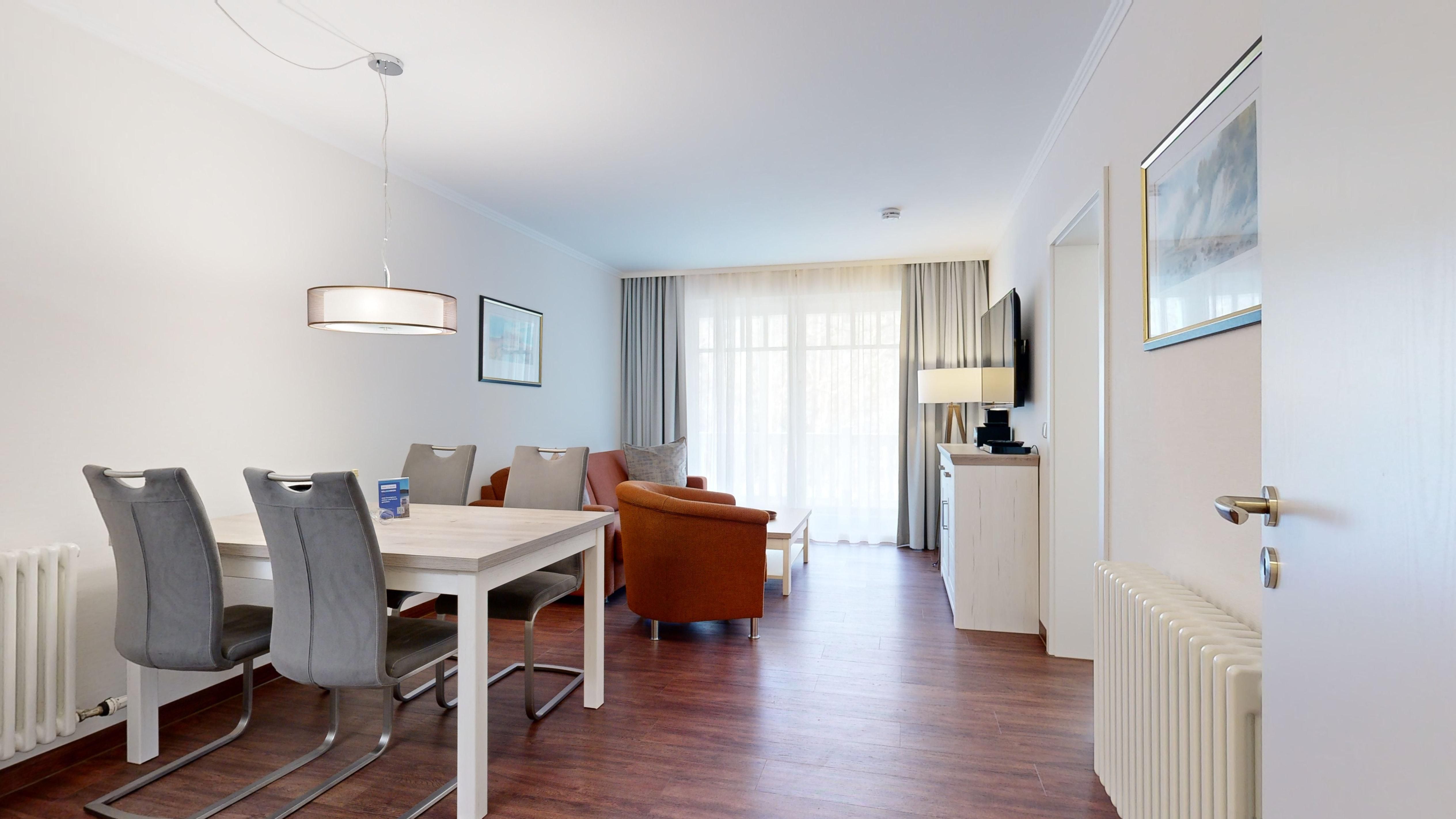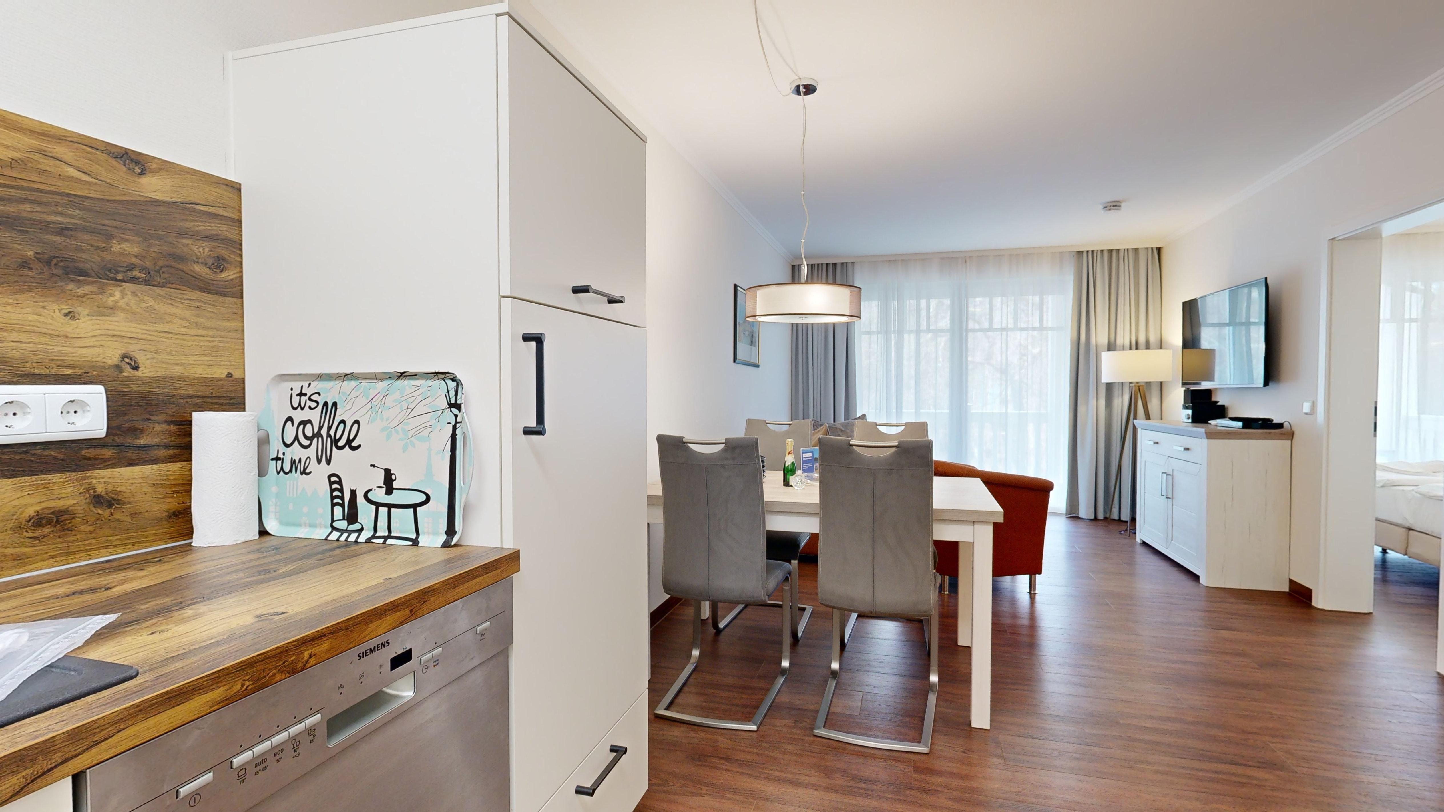 Im Dünenpark Binz befindet sich im Haus 6 die großzügige Komfort-Ferienwohnung im 1. Obergeschoss (2 Zimmer / 52 m²) mit 1 Schlafzimmer, einer Schlafcouch und mit großem Balkon