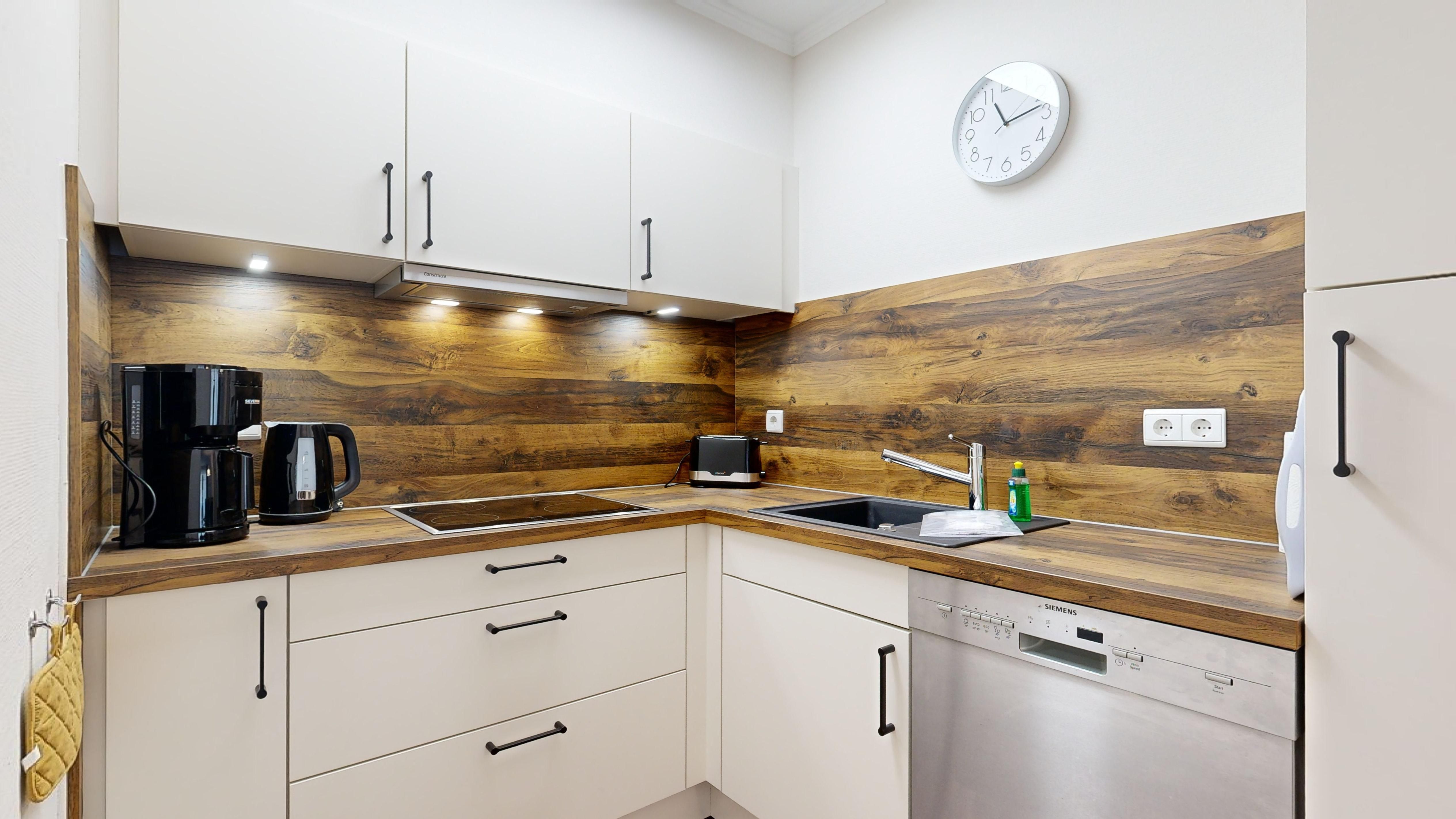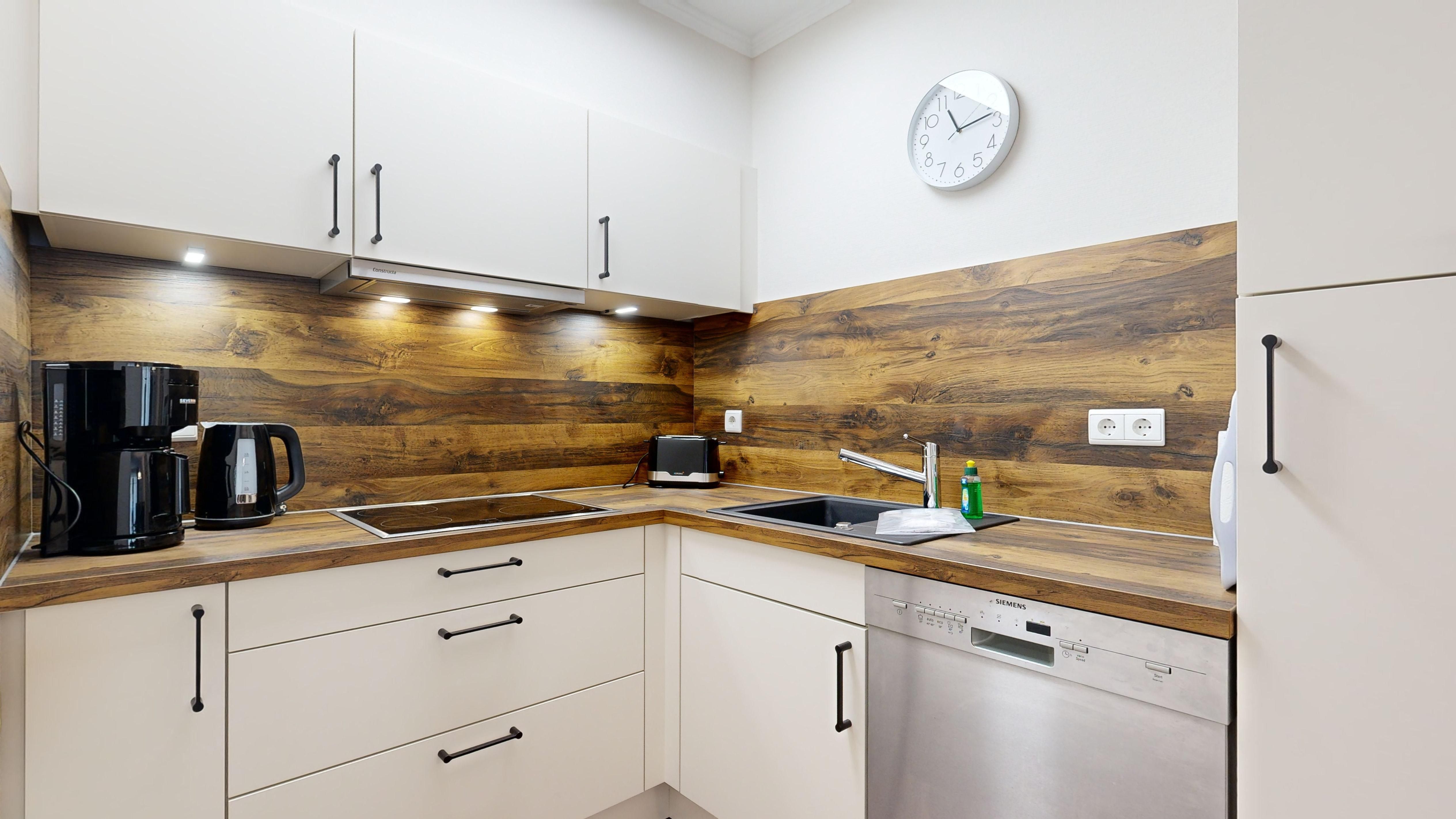 Küche: Moderne Küchenzeile, Ceran-Herd, Mikrowelle mit Back- und Grillfunktion, Spülmaschine, Kühlschrank mit Gefrierfach, Kaffeemaschine, Toaster, Wasserkocher